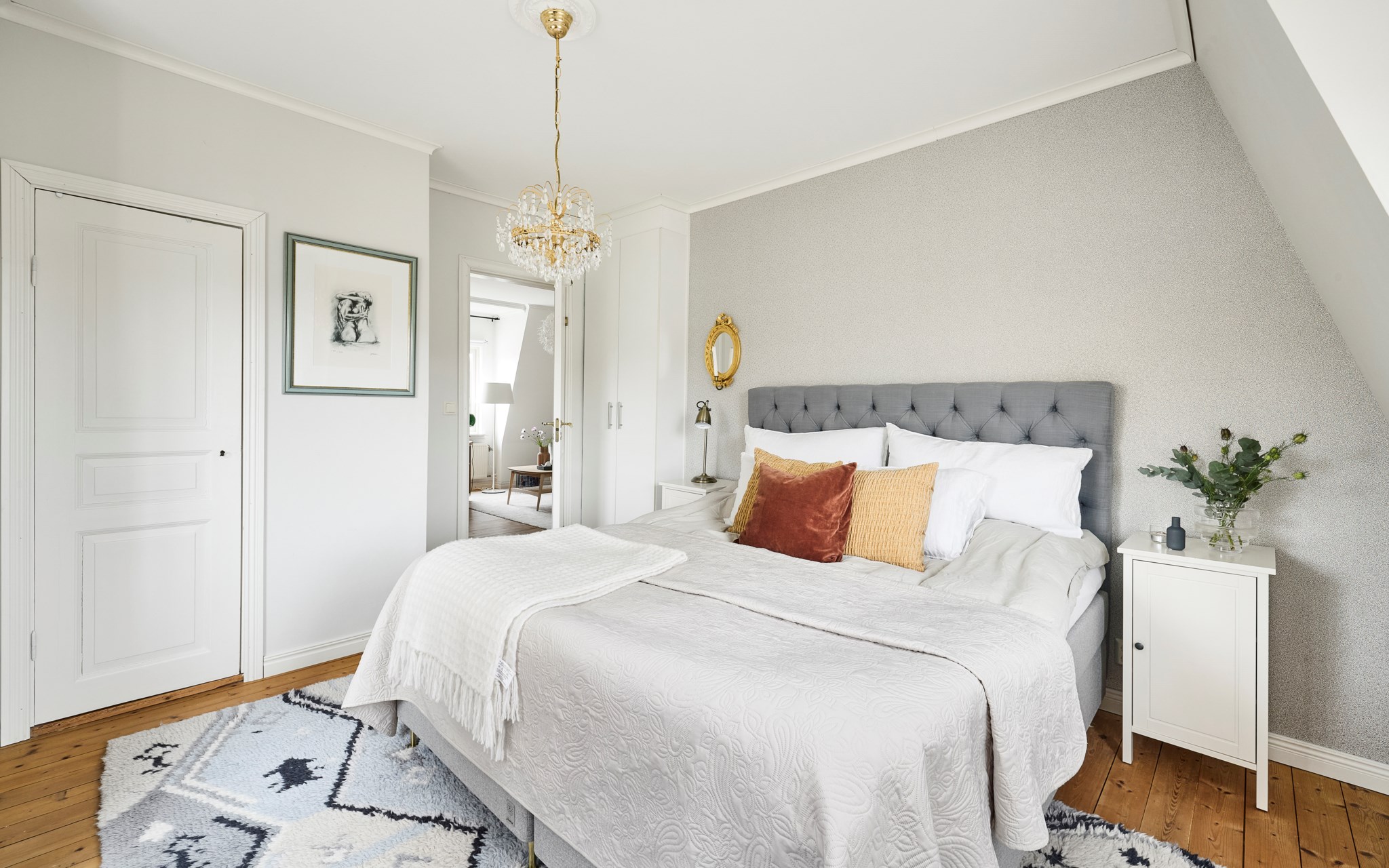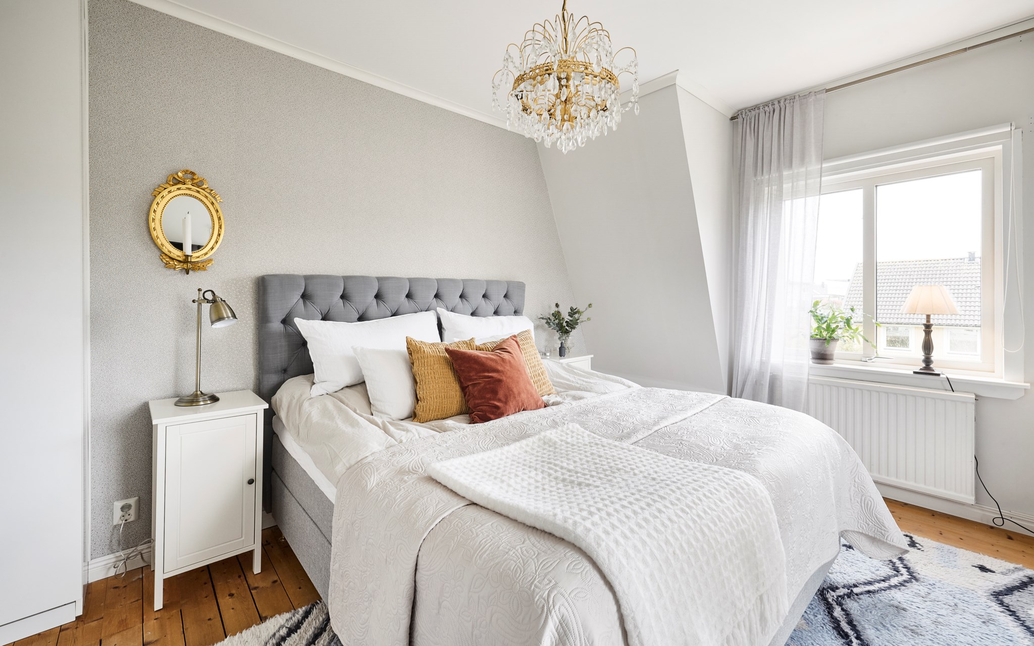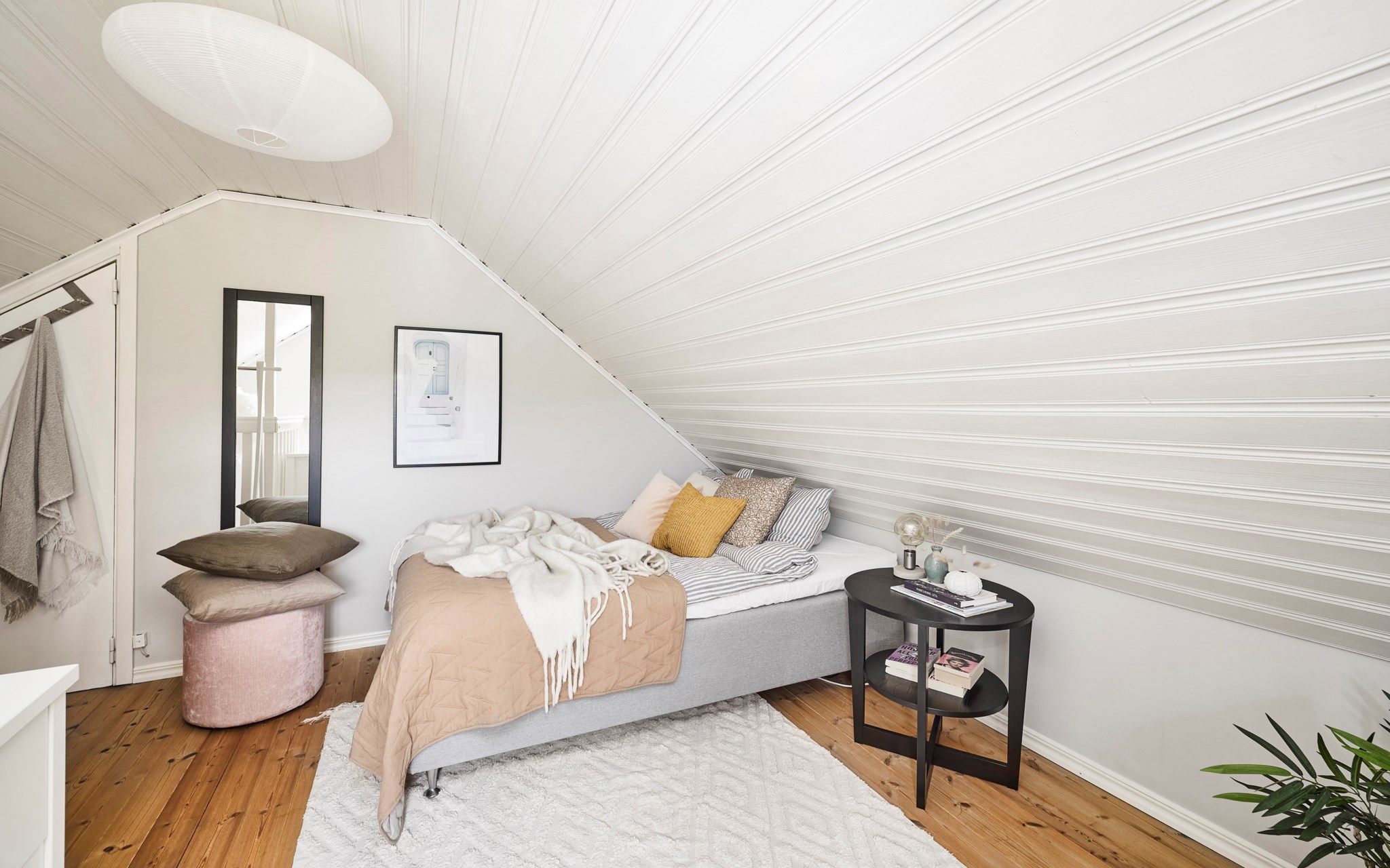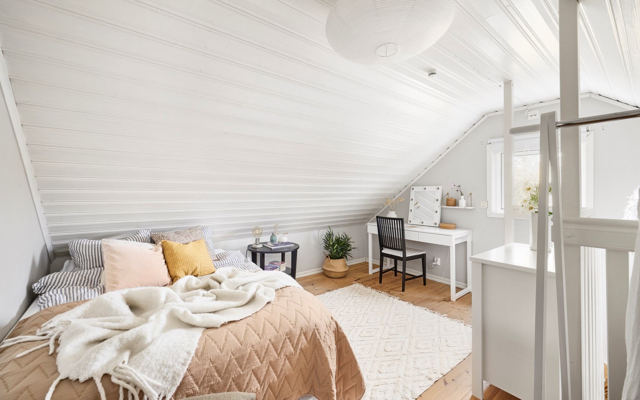 I ene hörnet av övervåningen ligger tre rofyllda rum med karaktär från husets tidiga 1900-tal: vinklar, snedtak och ljus som vandrar över dagen. Två av rummen rymmer dubbelsäng utan problem och det tredje gör sig fint som barn eller tonårsrum. Förvaring finns i garderober och smarta hyllor, och de varma trägolven ger samma mjuka känsla i alla tre rum. Lätt att anpassa efter familj och fas i livet.