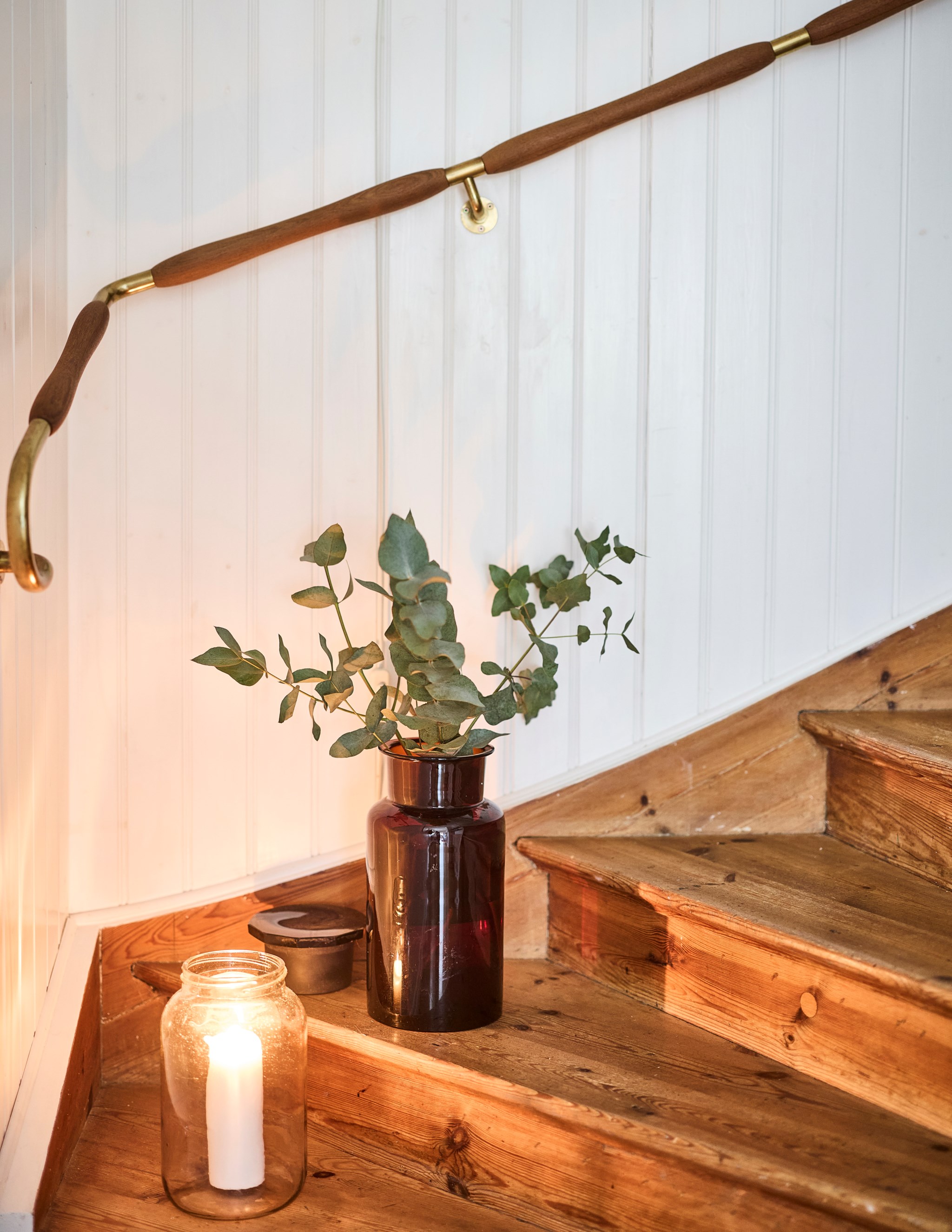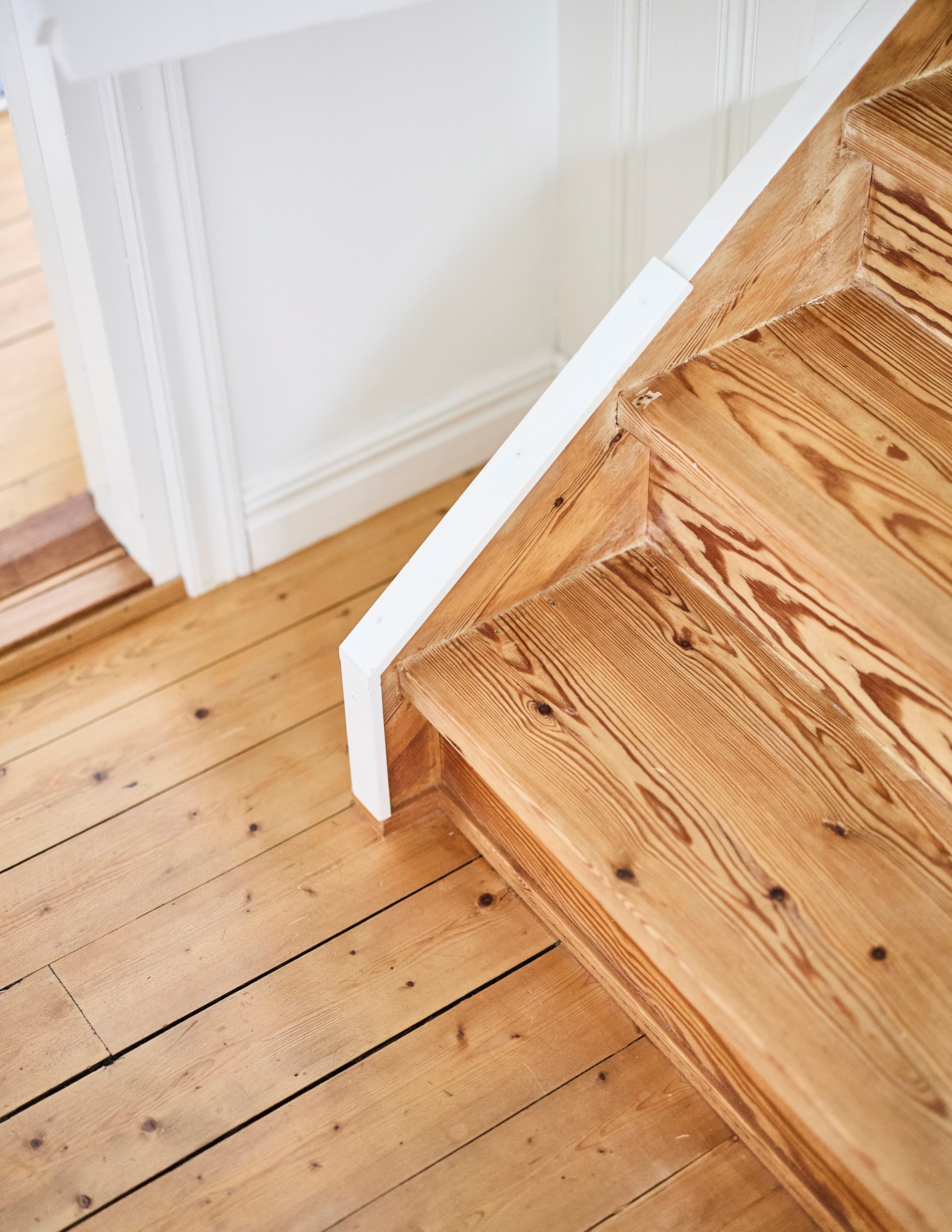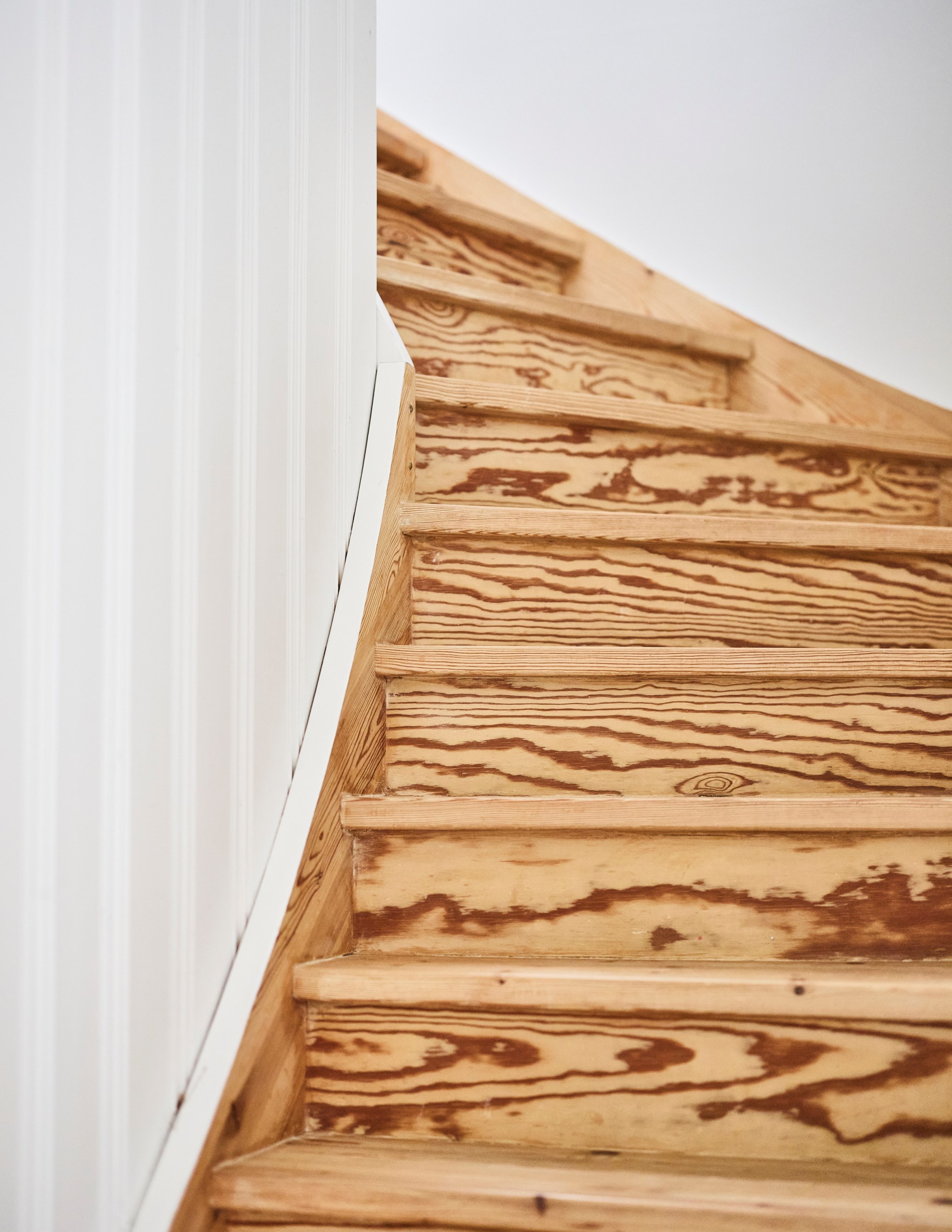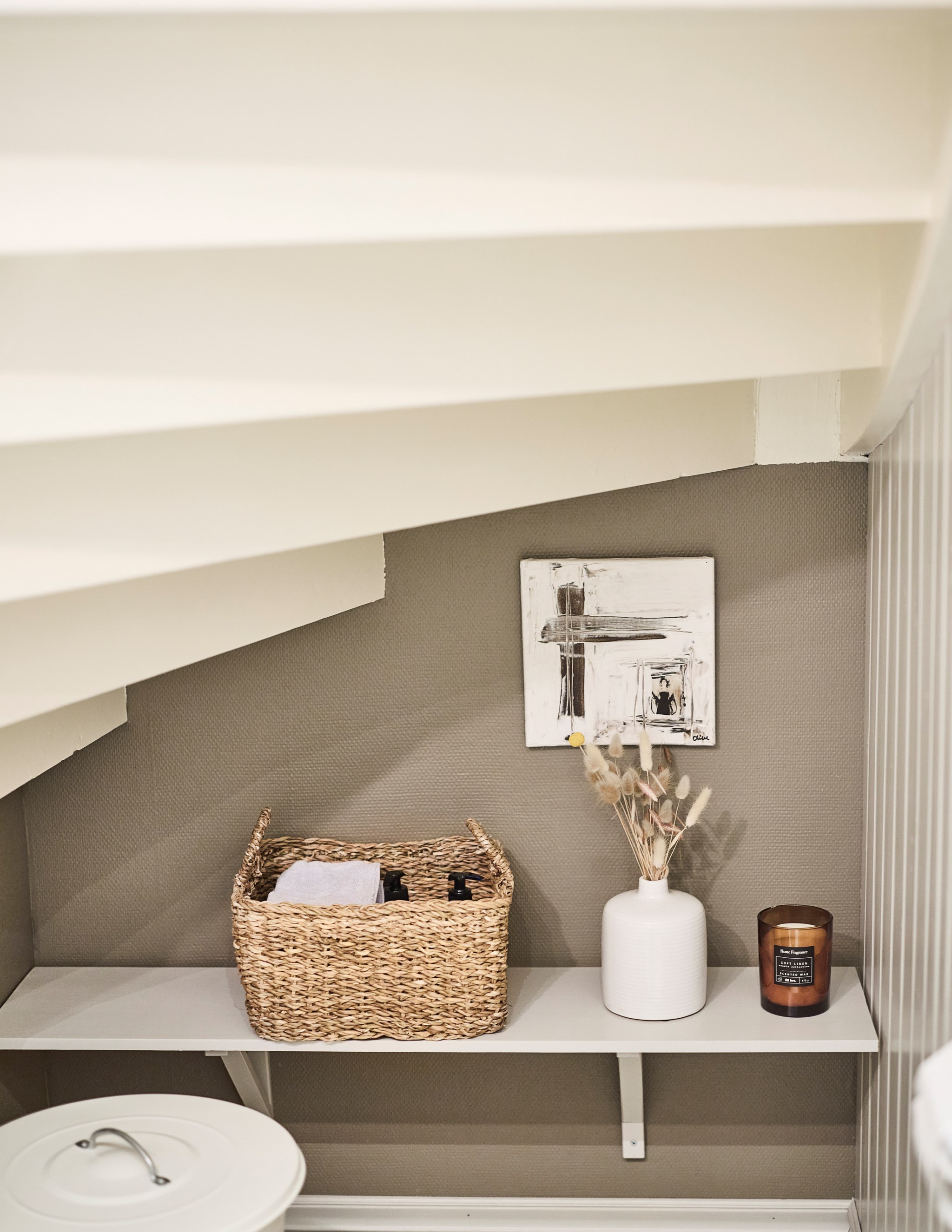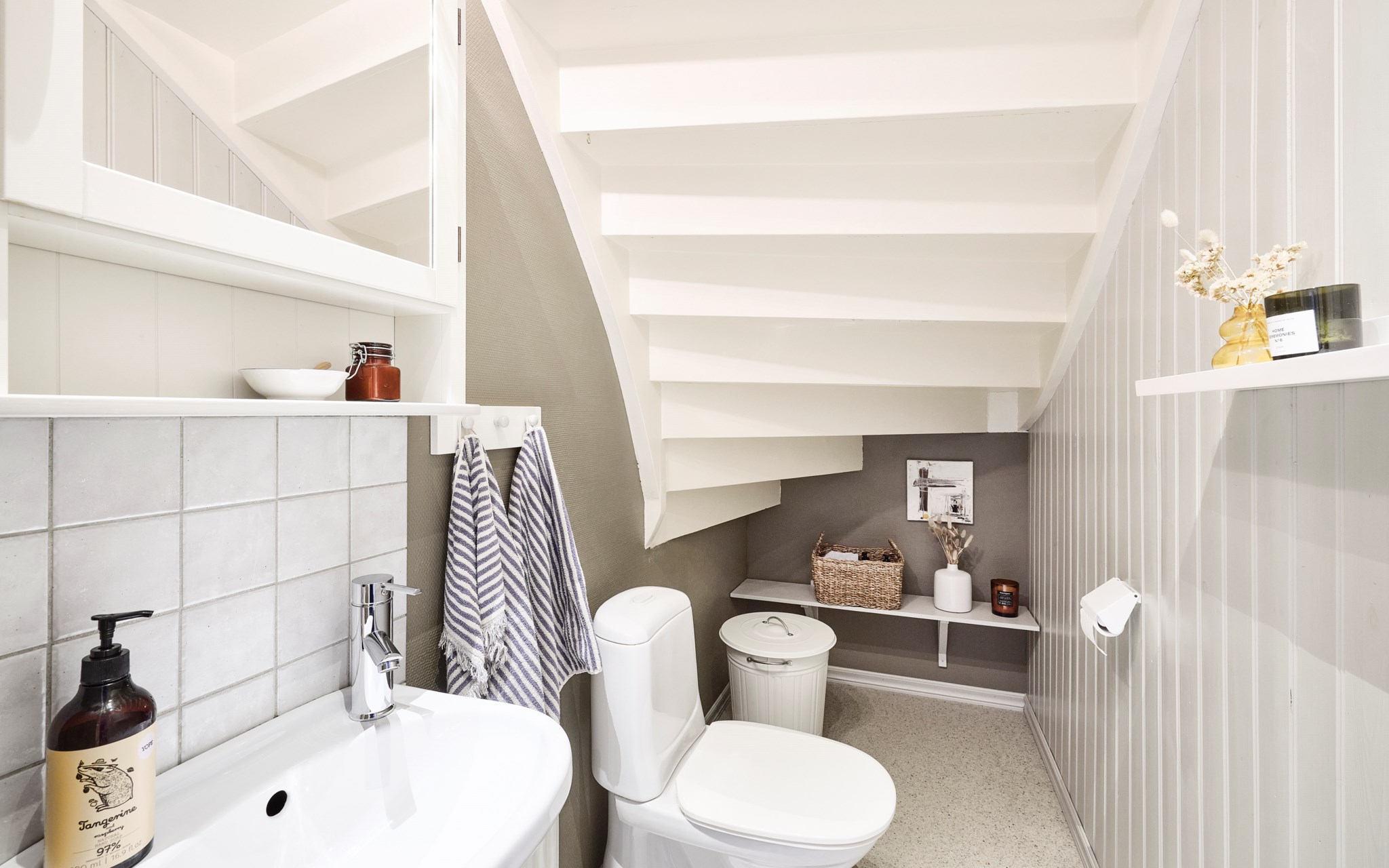 I ene hörnet av övervåningen ligger tre rofyllda rum med karaktär från husets tidiga 1900-tal: vinklar, snedtak och ljus som vandrar över dagen. Två av rummen rymmer dubbelsäng utan problem och det tredje gör sig fint som barn eller tonårsrum. Förvaring finns i garderober och smarta hyllor, och de varma trägolven ger samma mjuka känsla i alla tre rum. Lätt att anpassa efter familj och fas i livet.