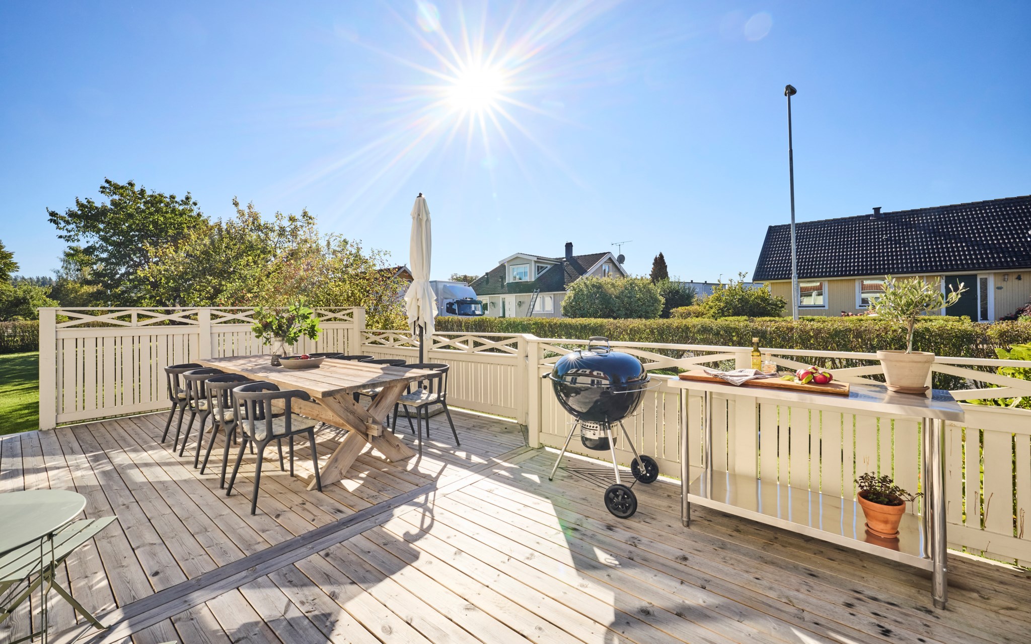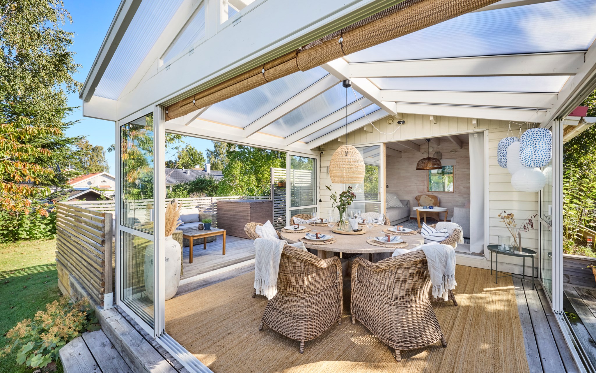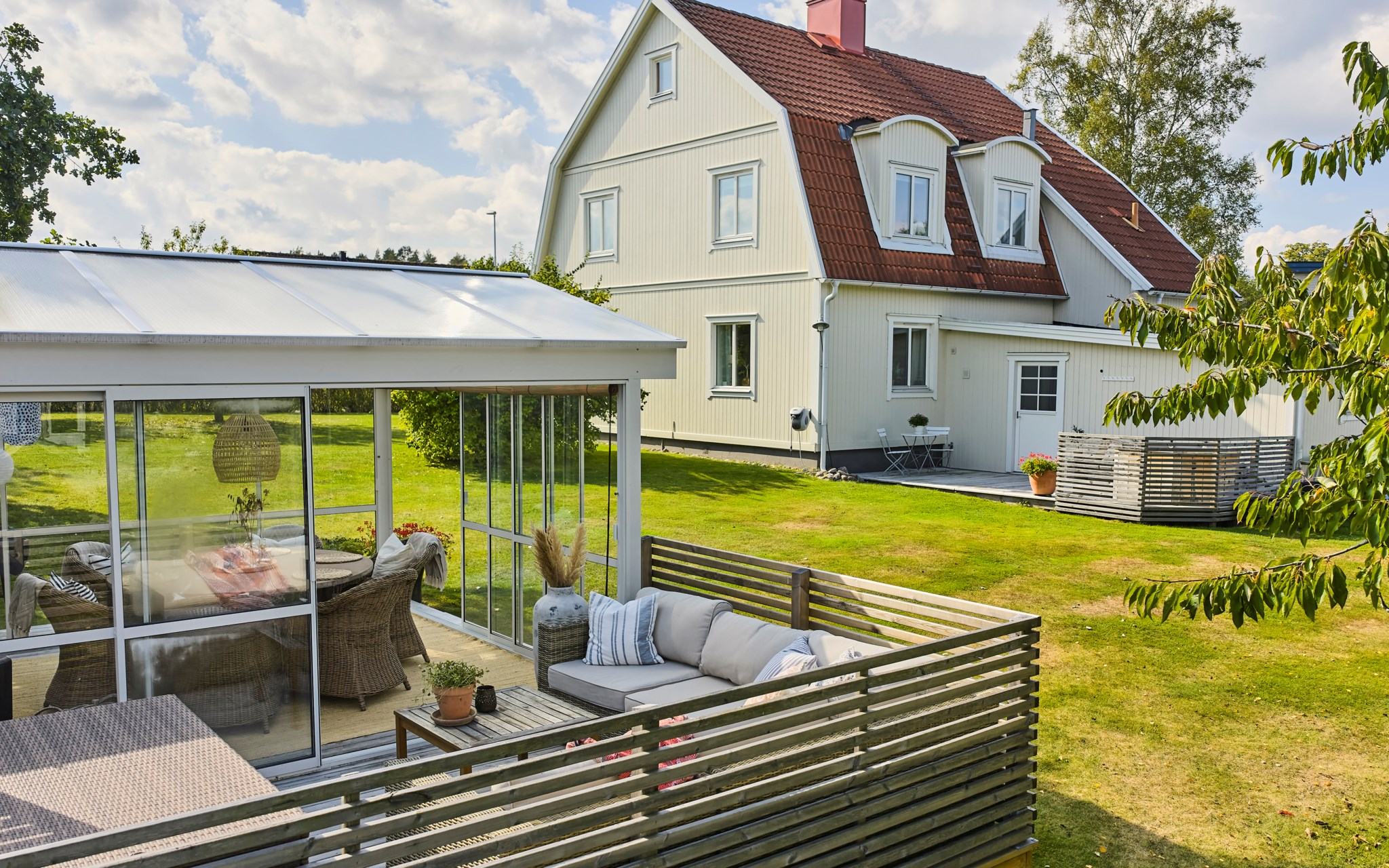 Ett riktigt härligt uthus med inglasat uterum ligger noggrant placerat i kvällssolens sista strålar och förlänger utesäsongen rejält. Skjutdörrar i glas öppnar mot ett litet trädäck på baksidan – perfekt för grill, spelkvällar och sensommarens sista ljus. Här finns en tanke om att bygga ett utekök, ta den idén vidare om du vill! Inne i huset finns plats för film och häng, och övernattningsgäster när många är på besök. Här blir man gärna kvar när dag övergår i kväll.
