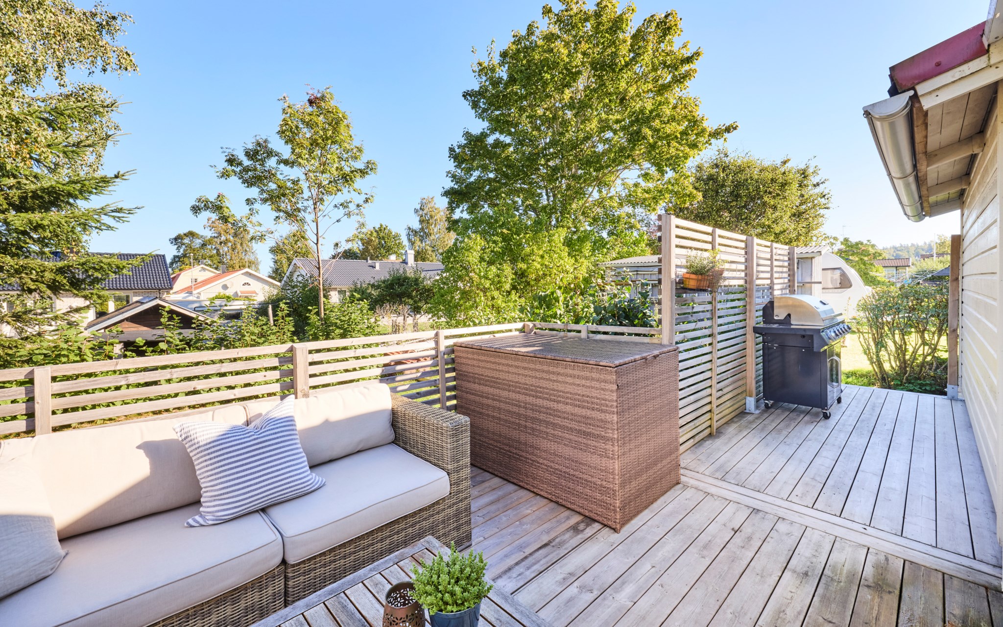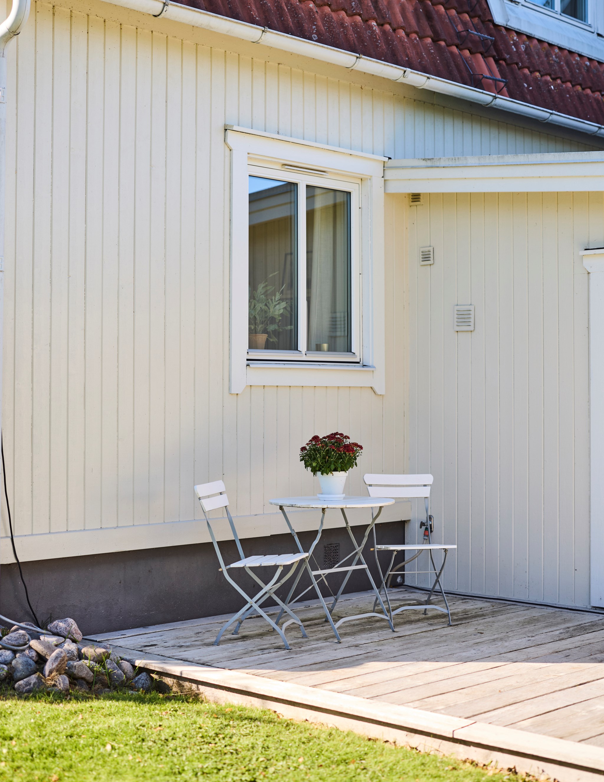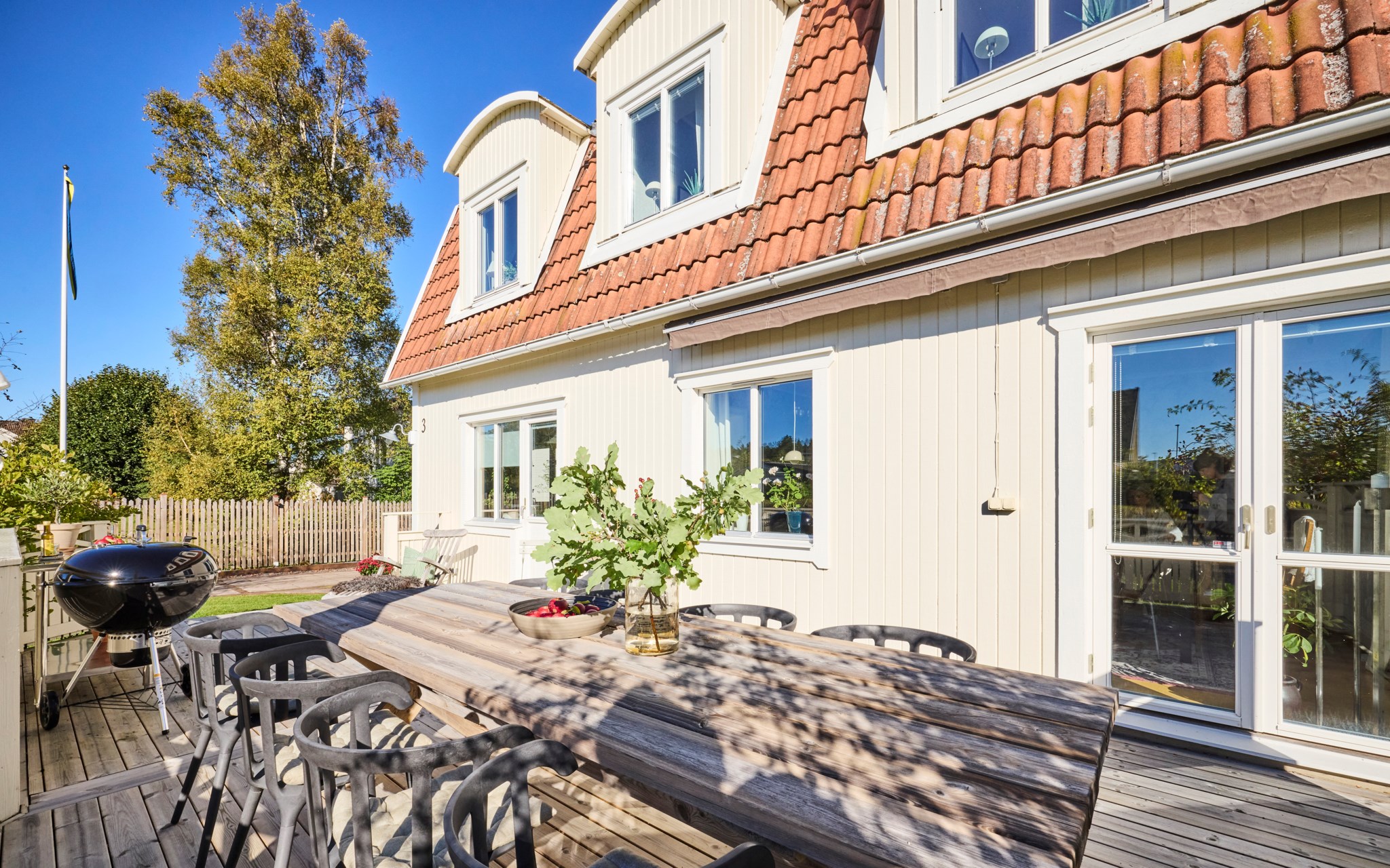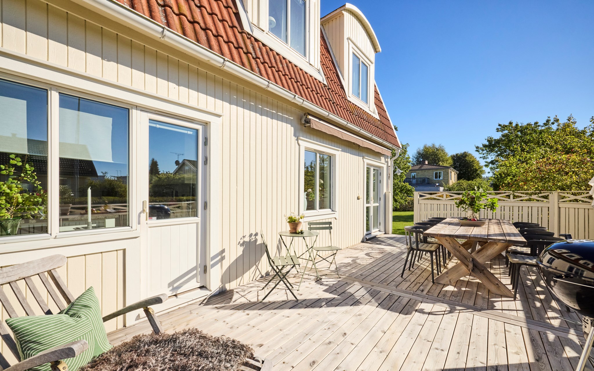 Ett riktigt härligt uthus med inglasat uterum ligger noggrant placerat i kvällssolens sista strålar och förlänger utesäsongen rejält. Skjutdörrar i glas öppnar mot ett litet trädäck på baksidan – perfekt för grill, spelkvällar och sensommarens sista ljus. Här finns en tanke om att bygga ett utekök, ta den idén vidare om du vill! Inne i huset finns plats för film och häng, och övernattningsgäster när många är på besök. Här blir man gärna kvar när dag övergår i kväll.