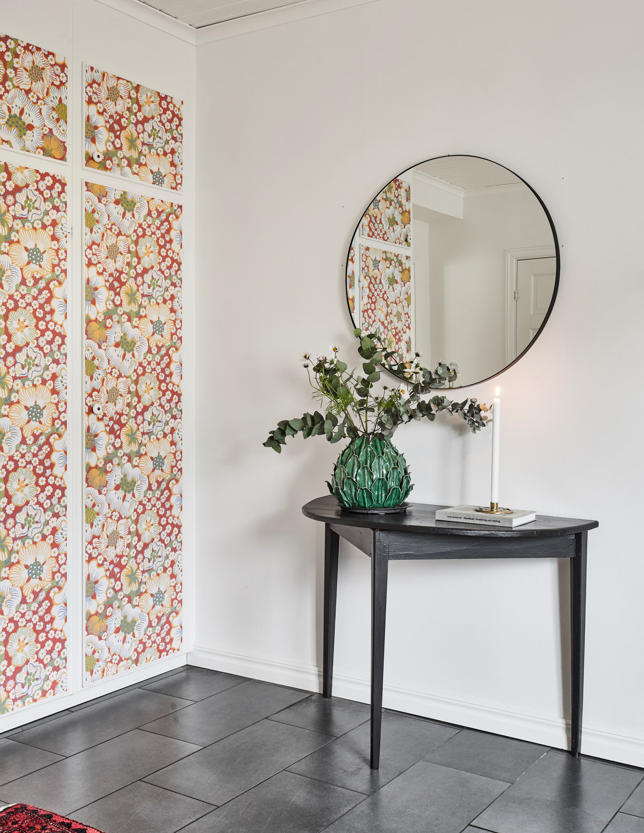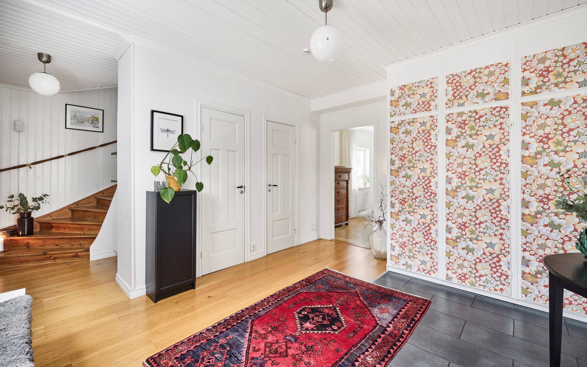 Välkommen in i en välkomnande entré där klinker möter trägolv och skapar en naturlig avdelning för vardagens in- och utpassager. Längs väggen står platsbyggda garderober redo att svälja ytterkläder, skor och allt det där som annars saknar plats. Ljuset från fönstret gör att hallen känns mer som ett rum än bara passage och härifrån når du både trappan upp, köket åt höger och vardagsrummet rakt fram. En funktionell start och en skön hemkomst – varje dag.