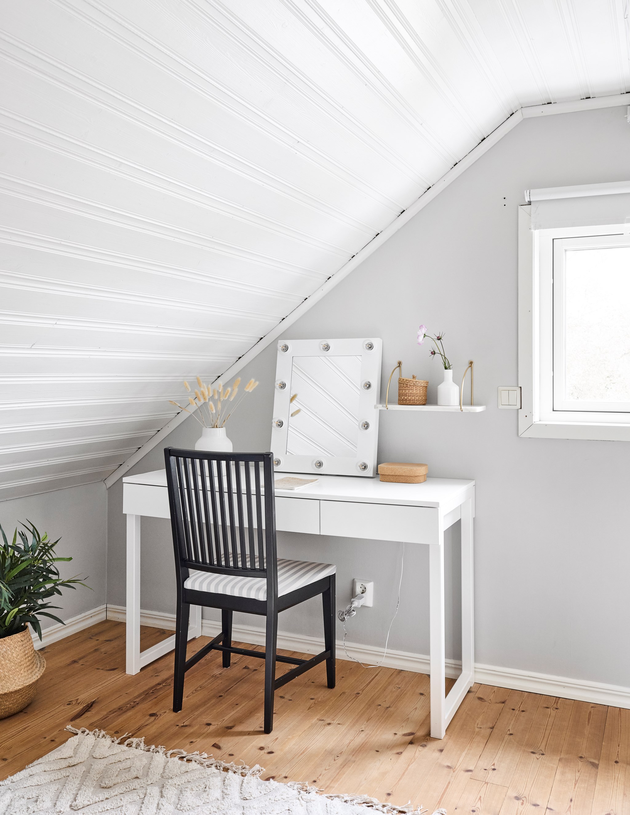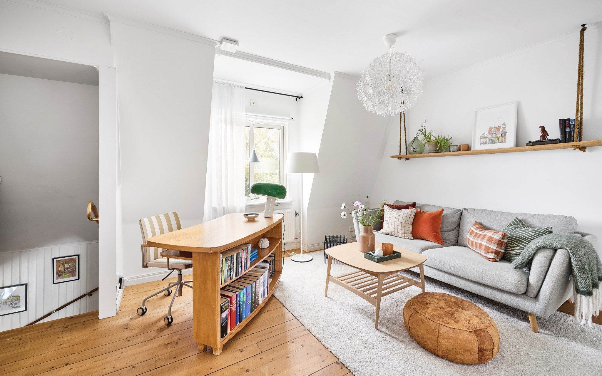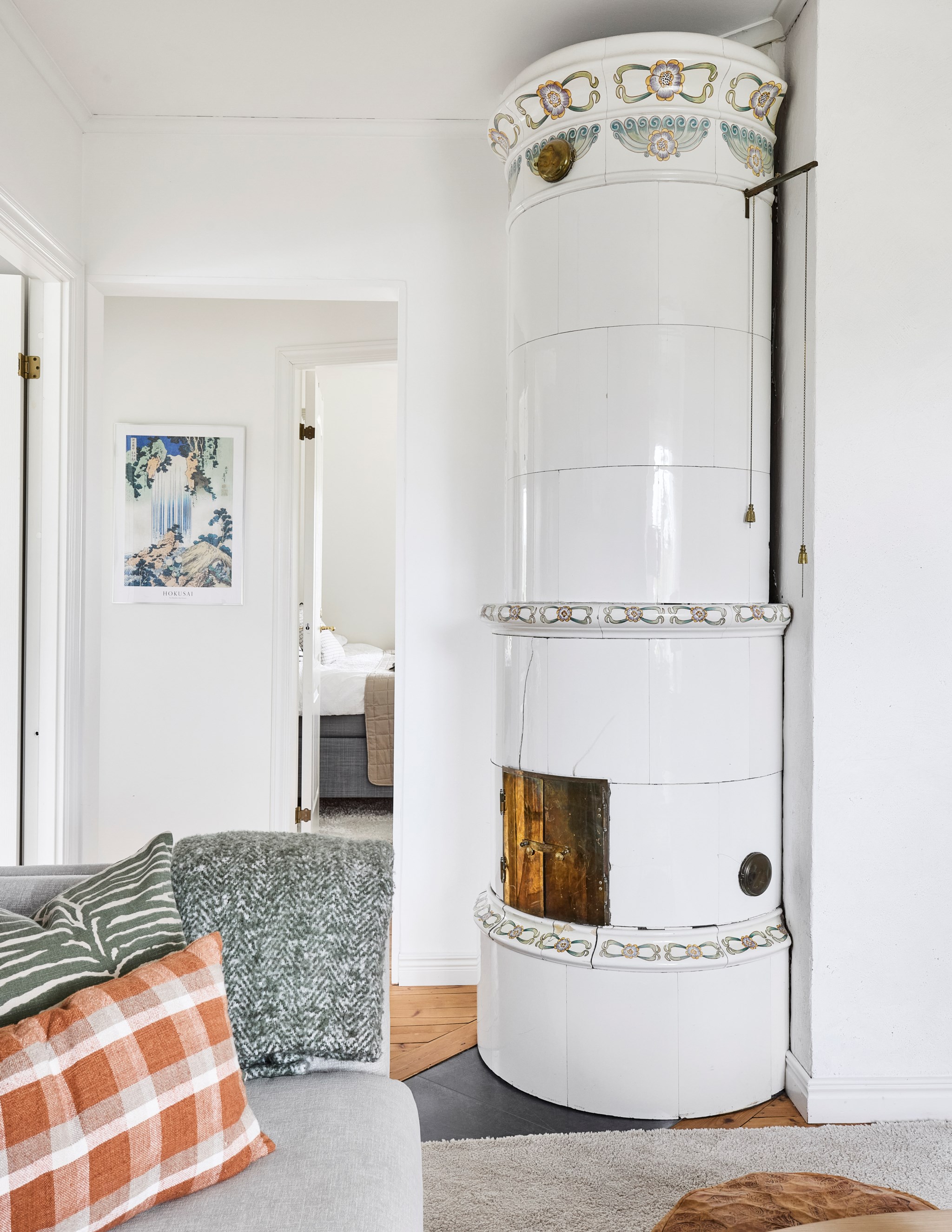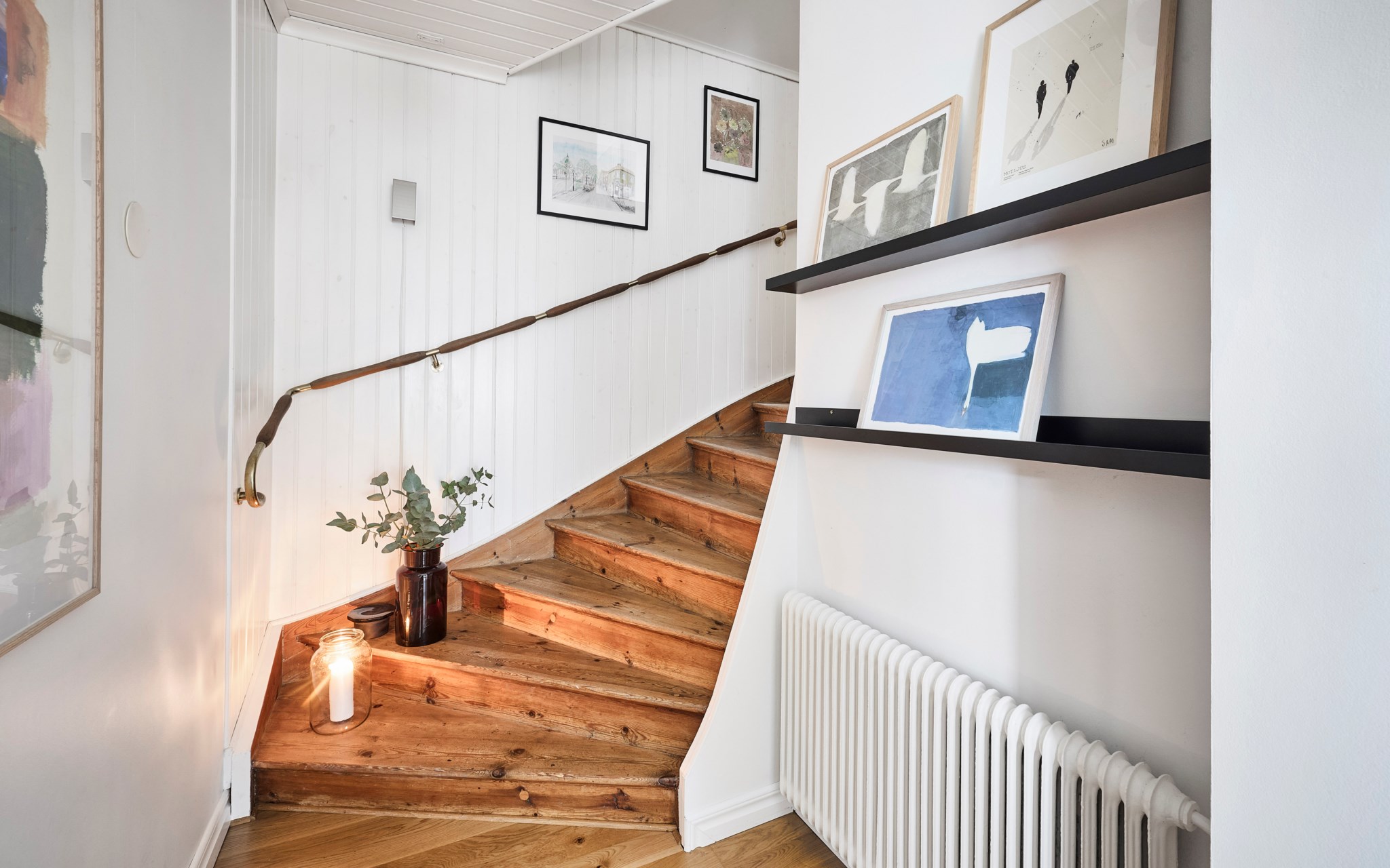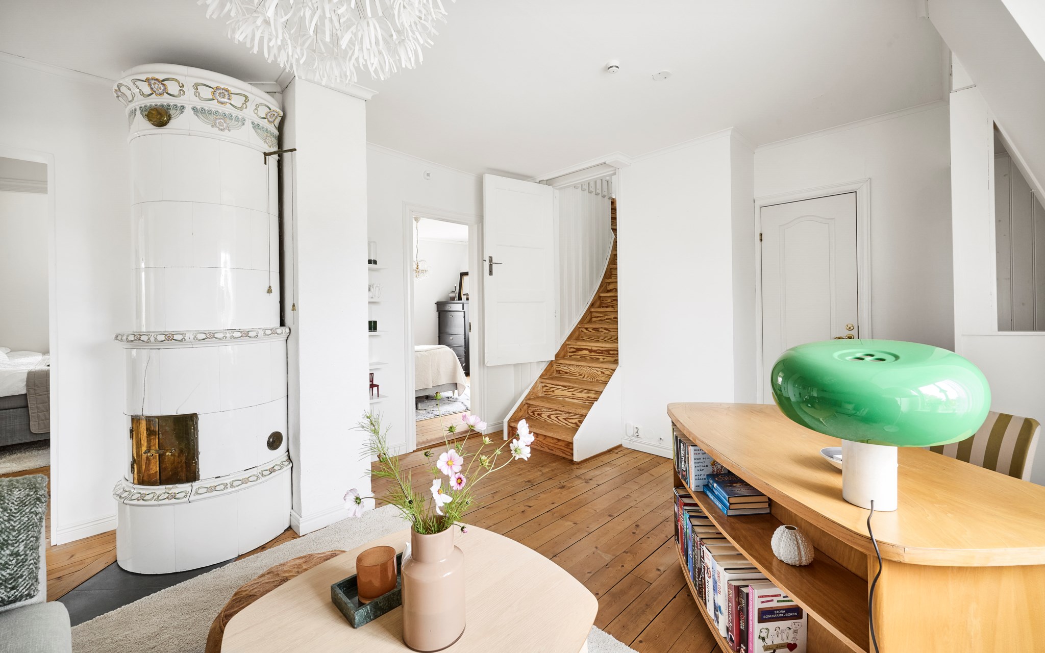 På övre plan väntar ett av husets mest omtyckta rum – ett allrum med vinklar och vrår, fönster mot trädgården och plats för både soffa och skrivbord. Här mellan sovrummen uppstår det där vardagslugnet: läxläsning, filmkvällar, legobyggen och sena samtal. Kakelugnen står kvar som ett vackert smycke i rummet, en påminnelse om svunna tider och hantverkets charm. Tillsammans med det gamla trägolvet skapar den en känsla av hemtrevnad i hela rummet. En naturlig samlingsplats när kvällen landar.