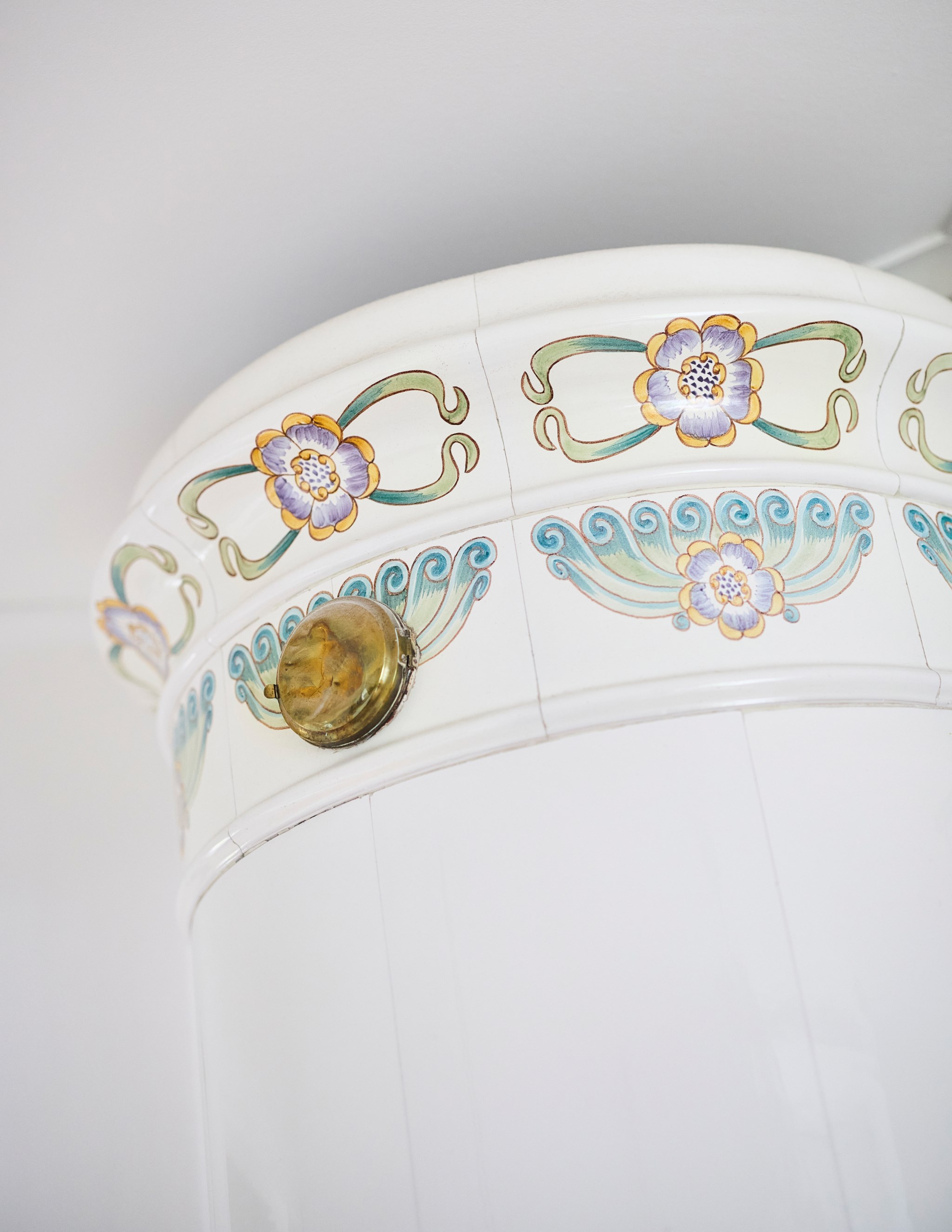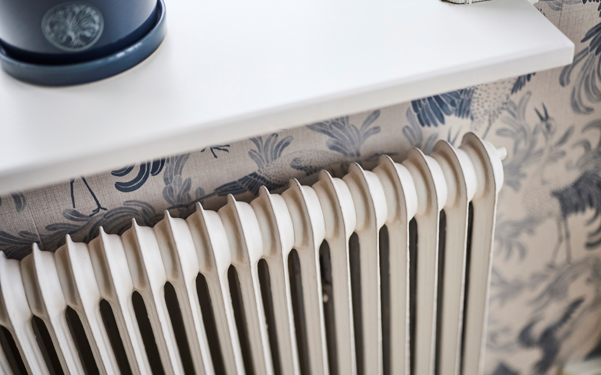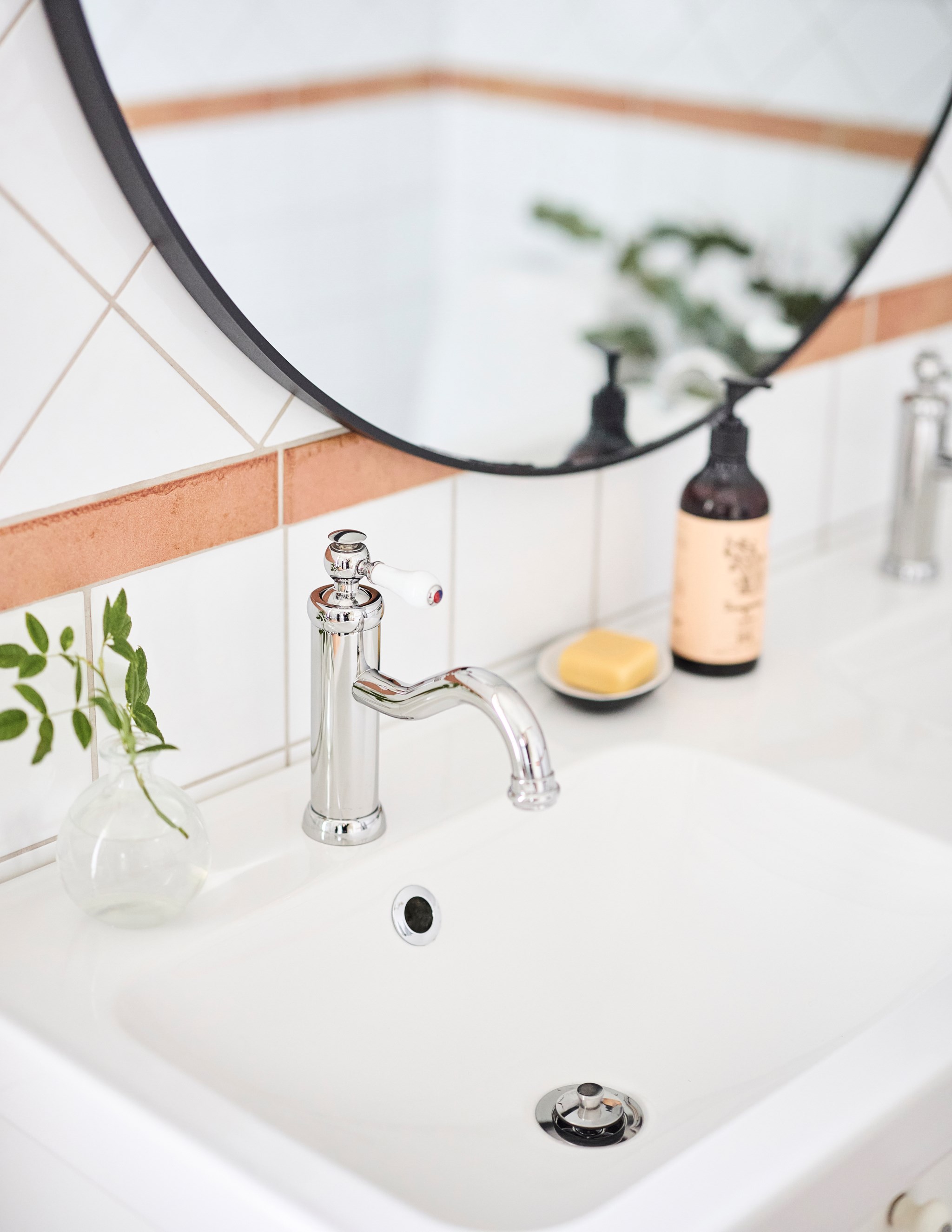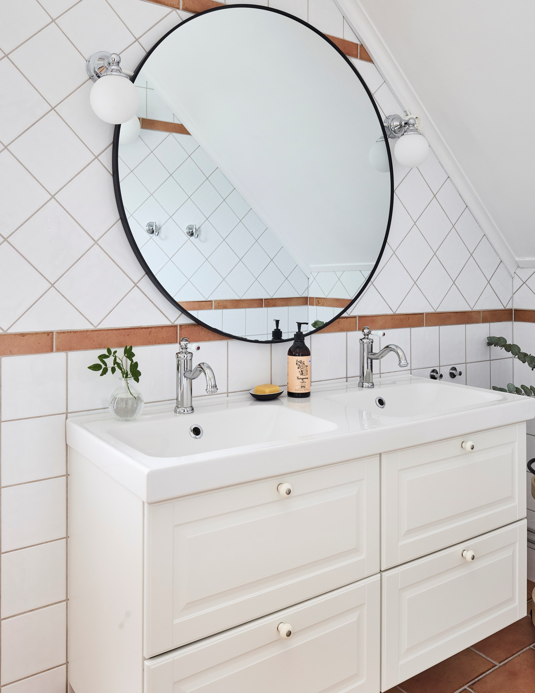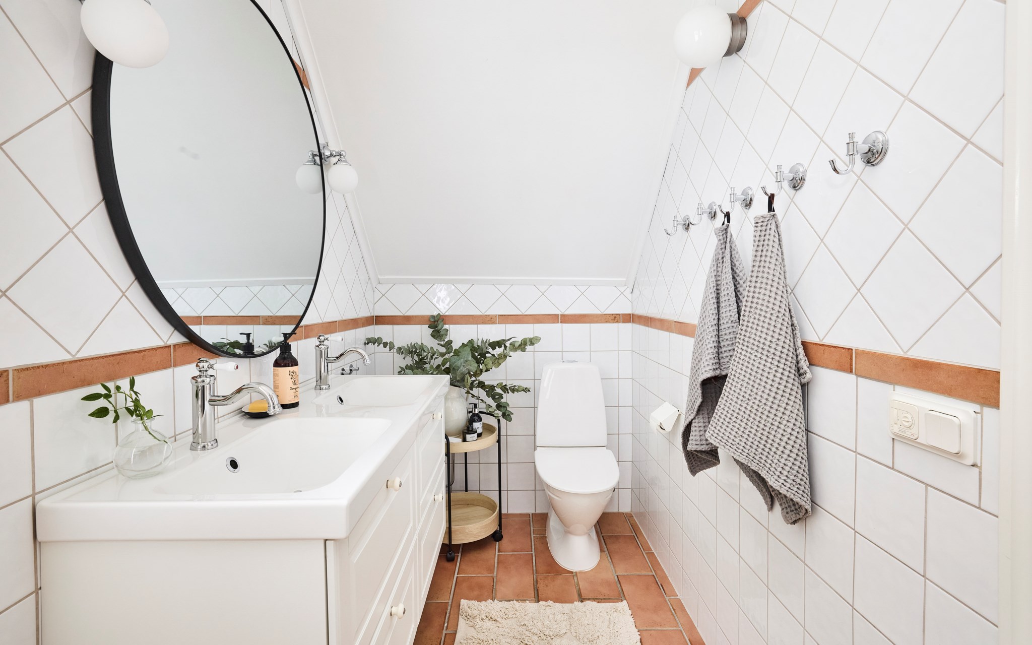 På övre plan väntar ett av husets mest omtyckta rum – ett allrum med vinklar och vrår, fönster mot trädgården och plats för både soffa och skrivbord. Här mellan sovrummen uppstår det där vardagslugnet: läxläsning, filmkvällar, legobyggen och sena samtal. Kakelugnen står kvar som ett vackert smycke i rummet, en påminnelse om svunna tider och hantverkets charm. Tillsammans med det gamla trägolvet skapar den en känsla av hemtrevnad i hela rummet. En naturlig samlingsplats när kvällen landar.