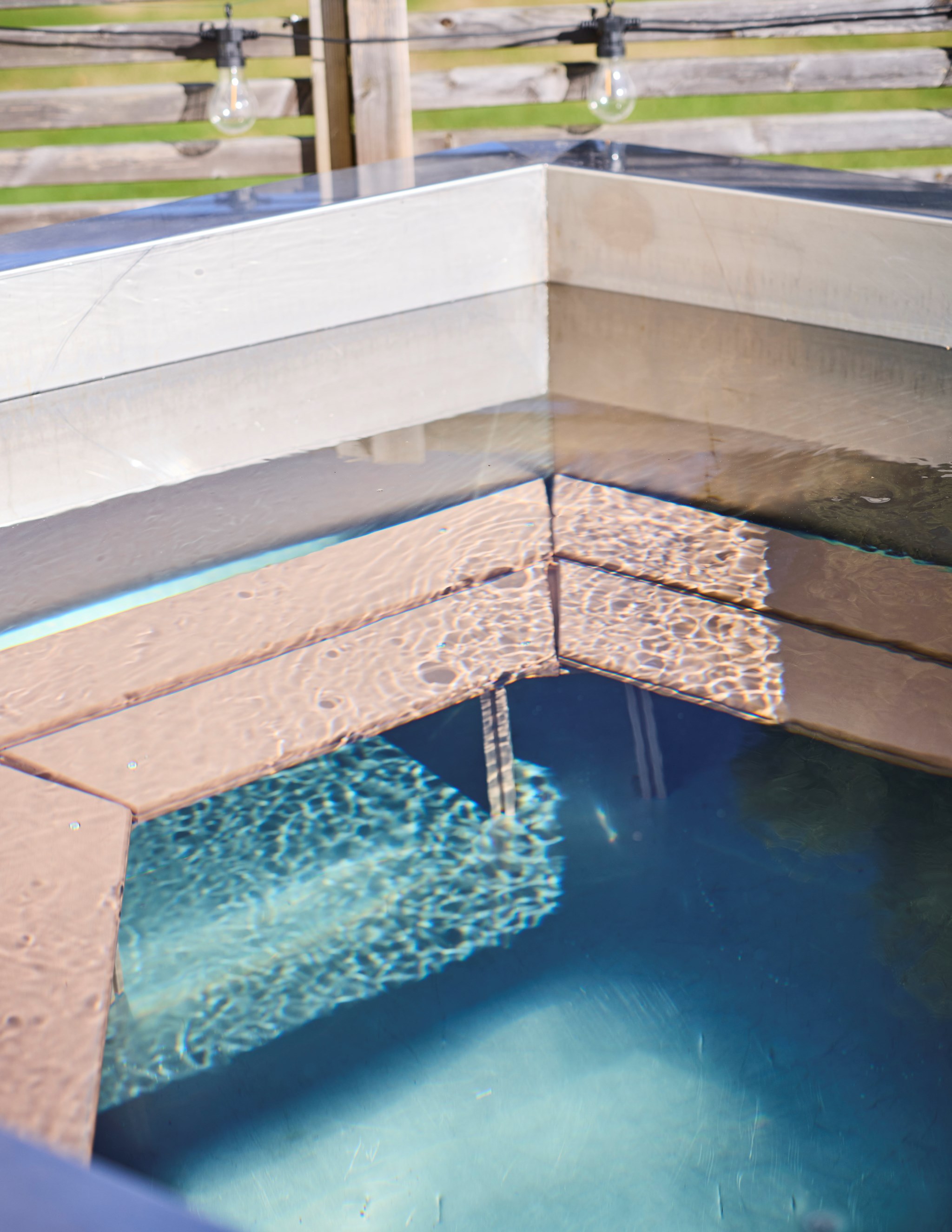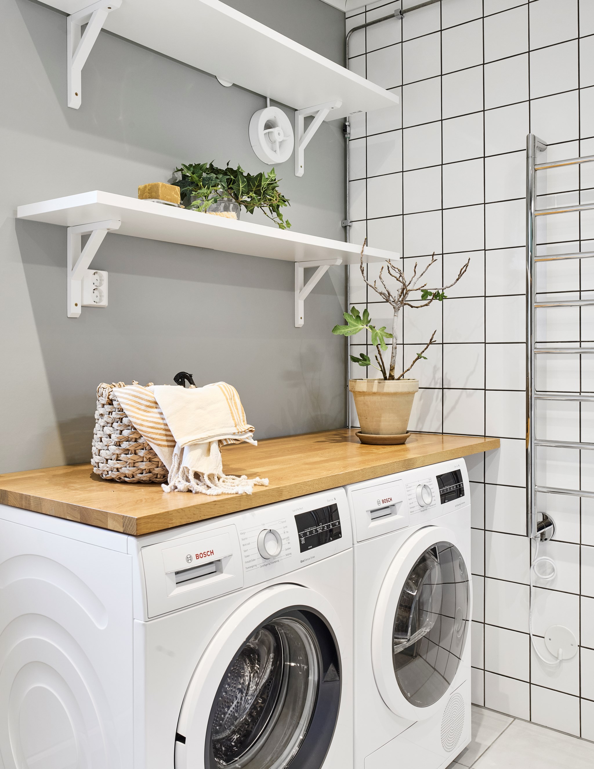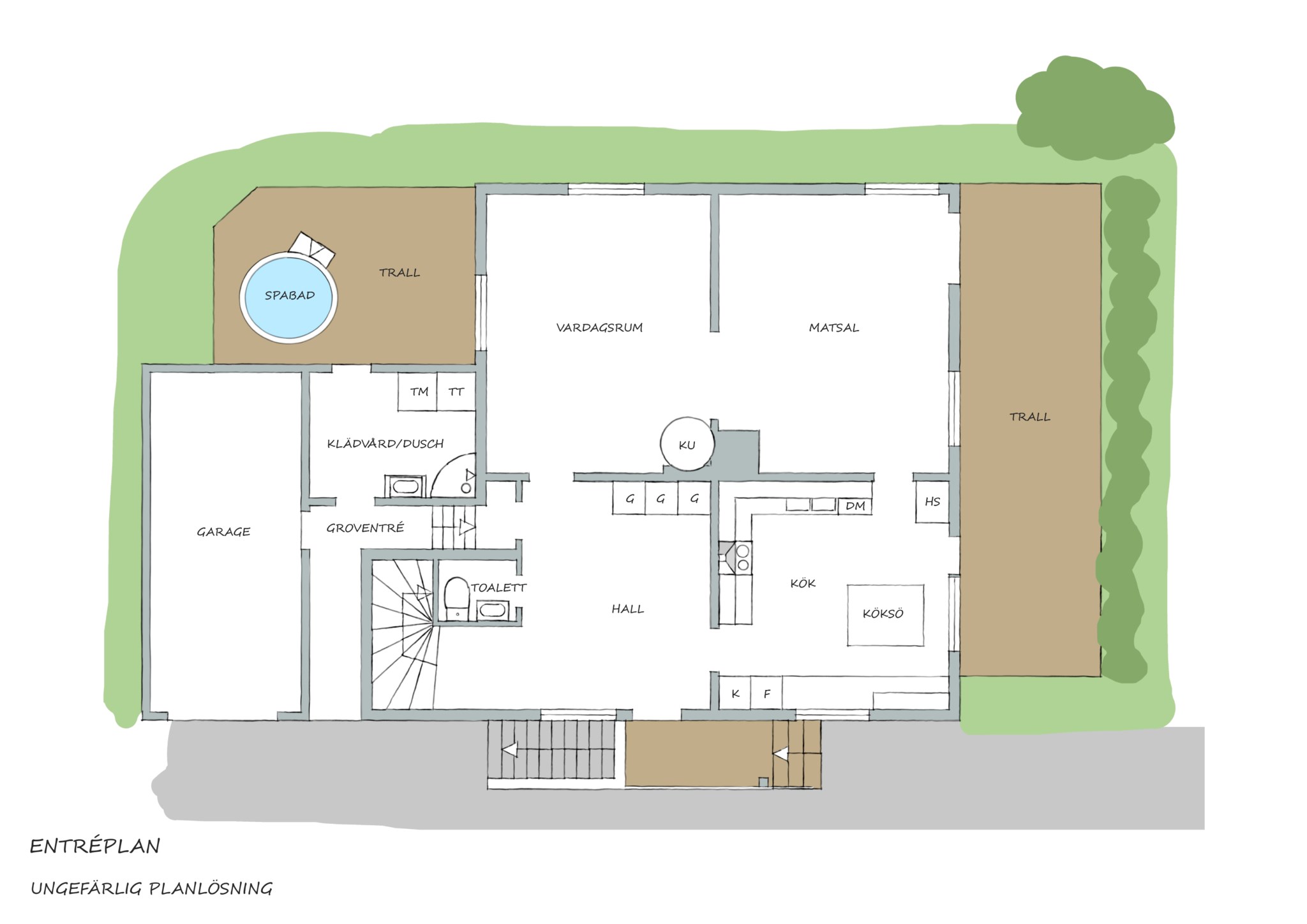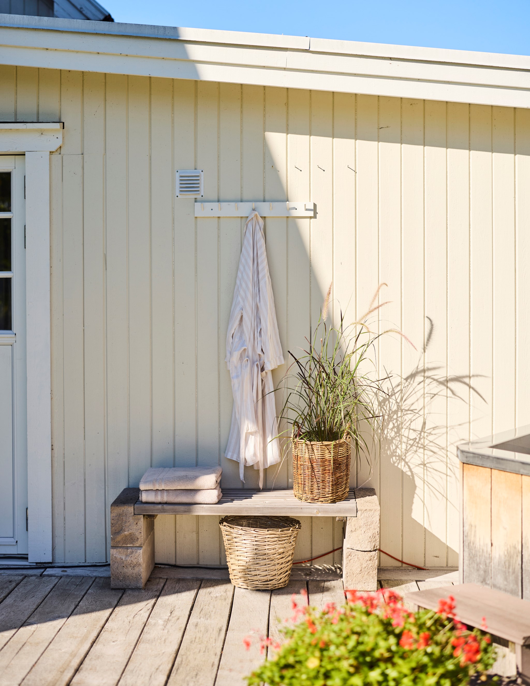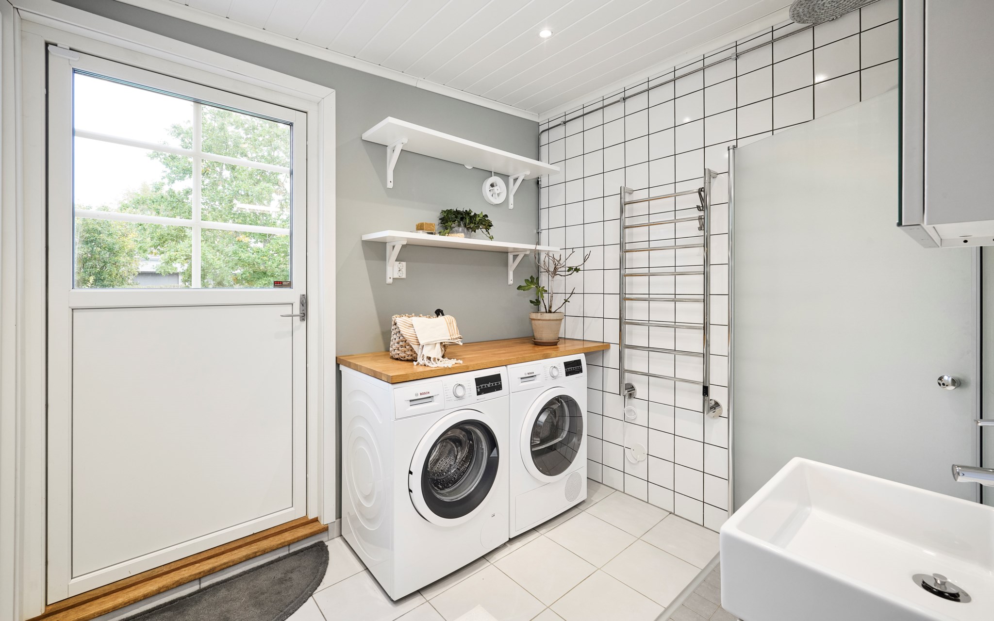 I en utbyggnad mellan huset och garaget ligger groventré och tvättstuga. Generöst och ordningsamt med gott om förvaring för ytterkläder, sport och vardagslogistik. Tvättstugan är ljus och praktisk med extra dusch som gör vardagen smidig efter träning eller trädgård. Härifrån går en egen dörr ut till den östra uteplatsen. Och bara några steg bort står spabadet, perfekt för sena kvällar, stjärnhimlar och varma samtal året om.