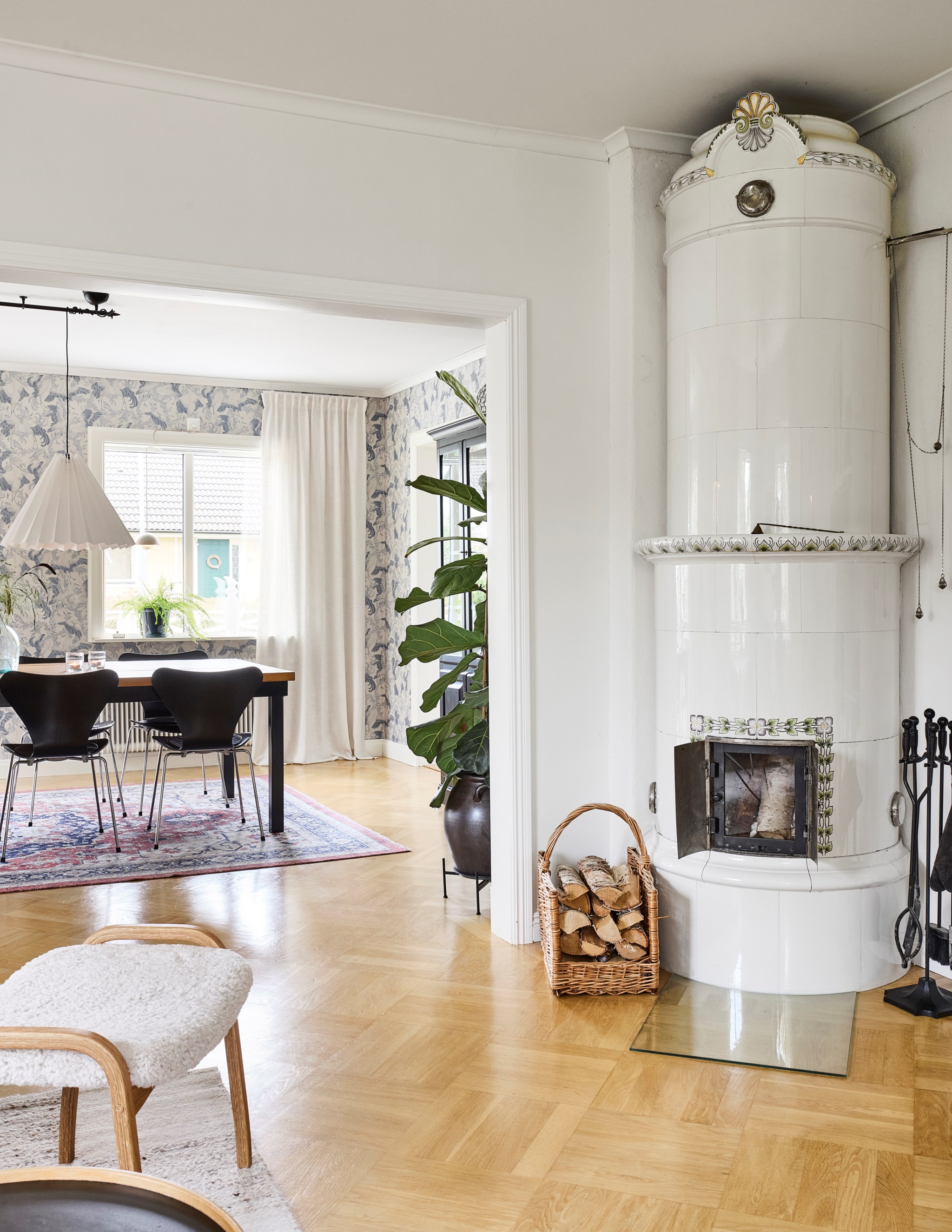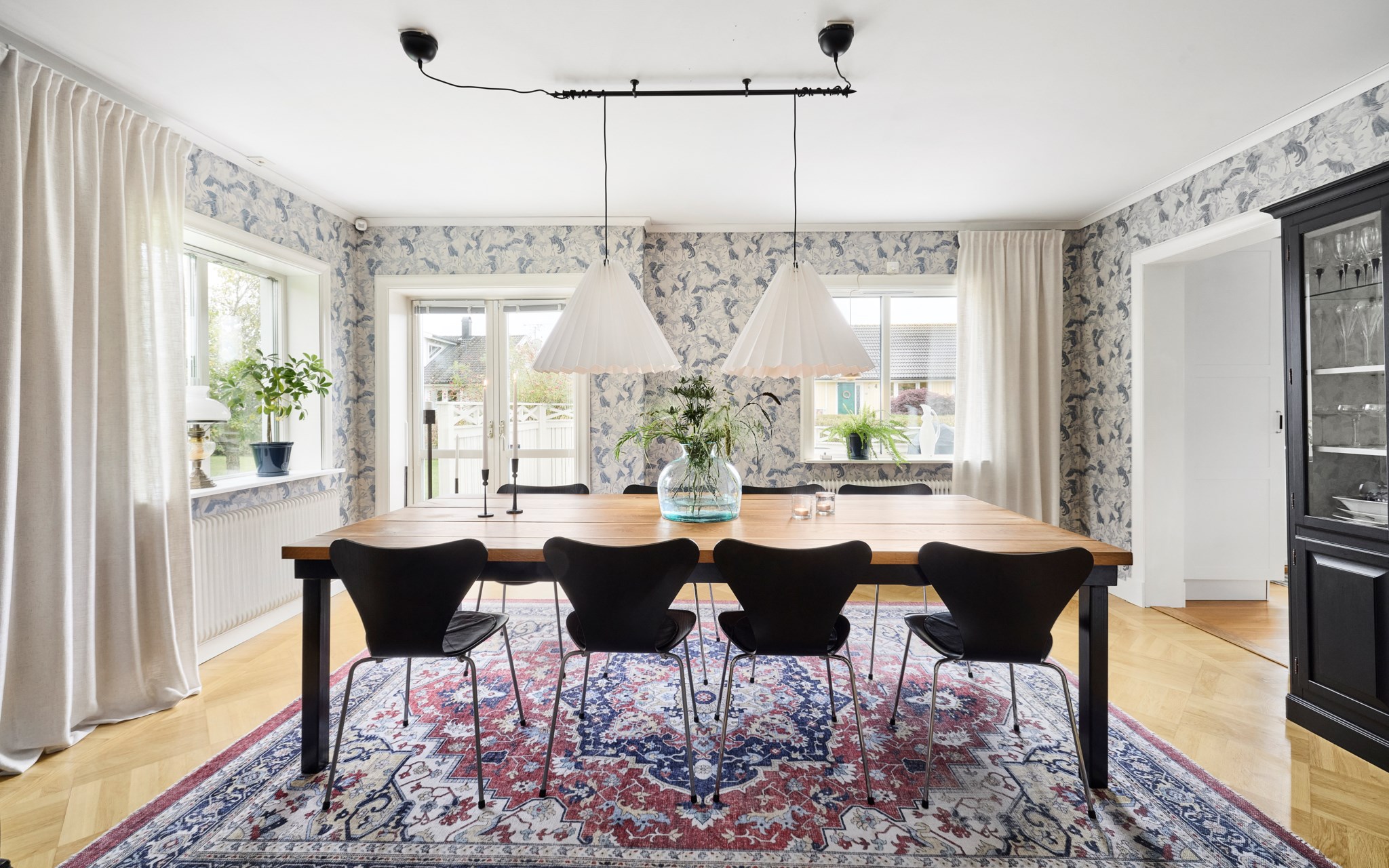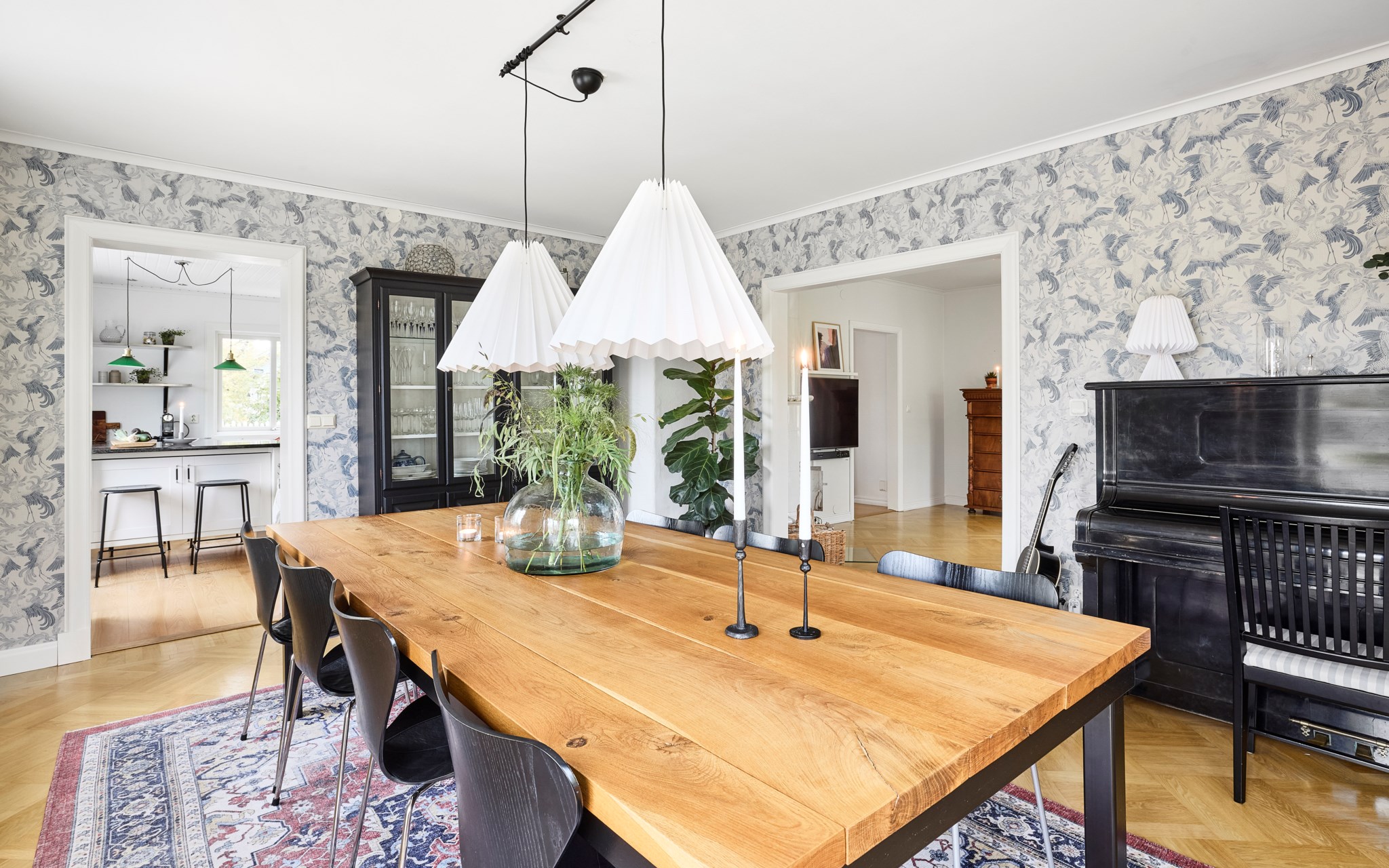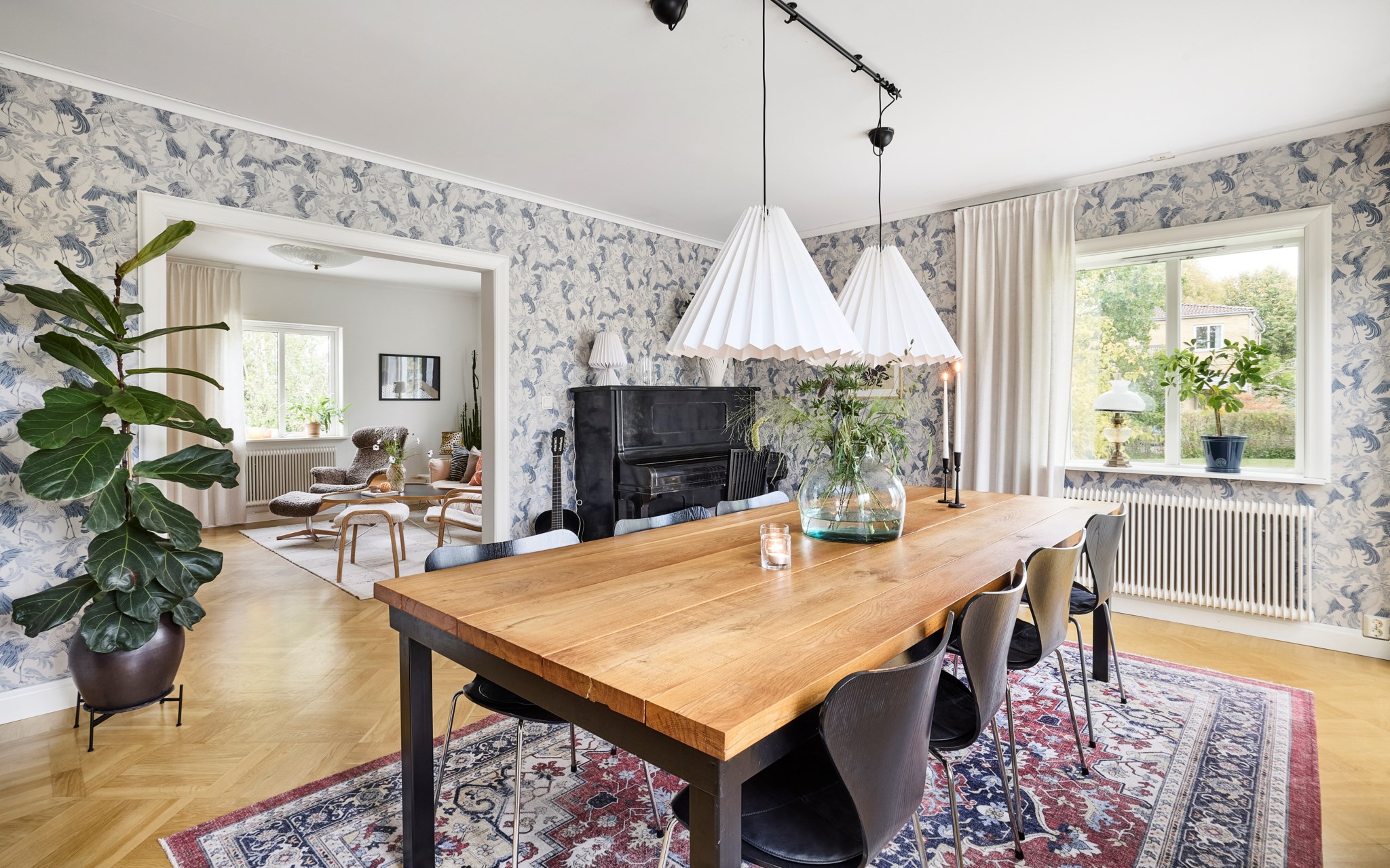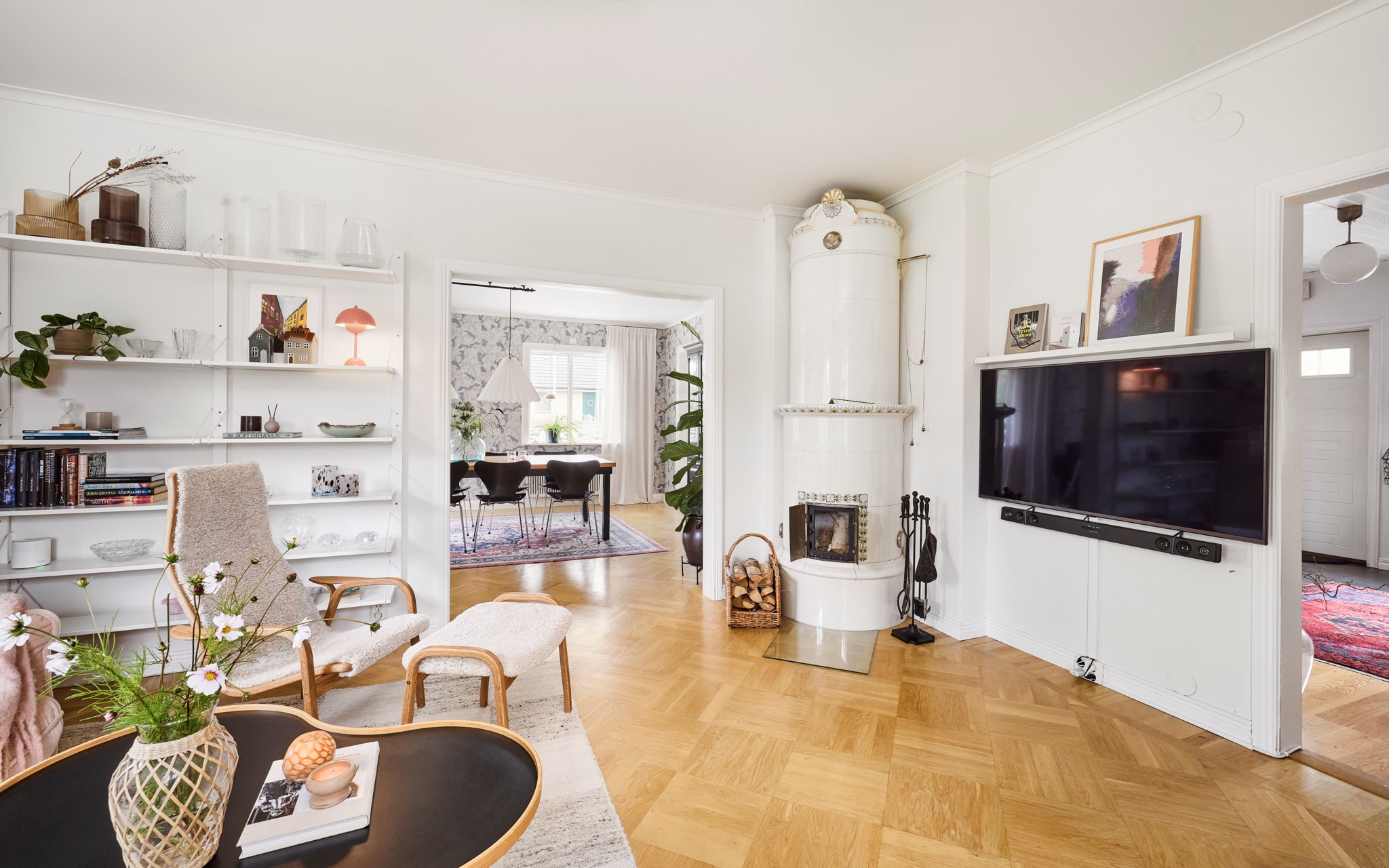 Vardagsrummet har den fina kakelugnen som en varm punkt och sprakar under årets mörka månader. En snyggt mönstrad ekparkett och en generös öppning binder ihop rummet med matsalen. Tillsammans har rummen fönster i flera väderstreck, vilket ger fint ljus från morgon till sen eftermiddag. I matsalen ryms ett rejält matbord, piano (om du vill) och det är högt i tak för samtal. Här, liksom i köket, är det nära ut till terrassen – vilket gör det enkelt att börja middagen ute och sedan flytta in när kvällen blir sval.