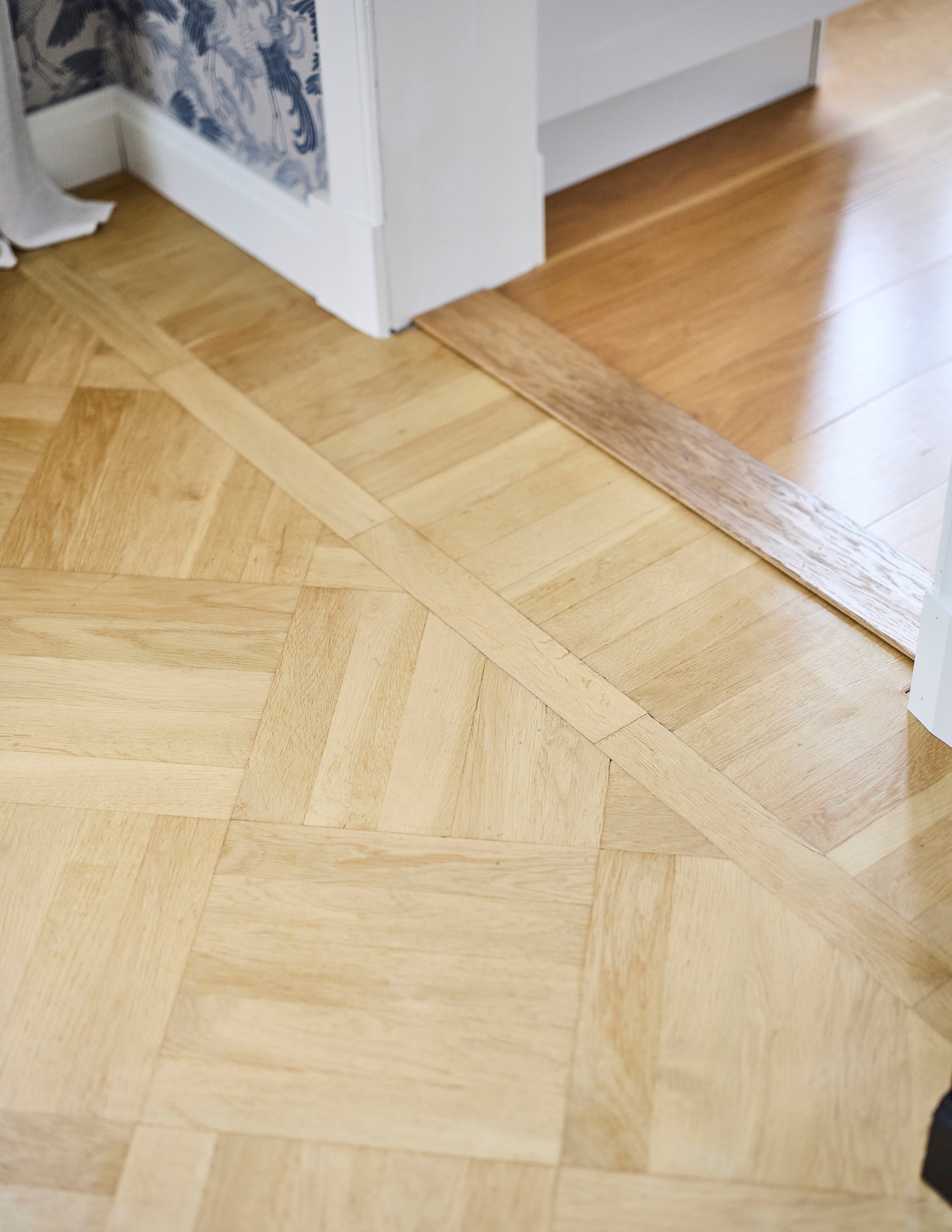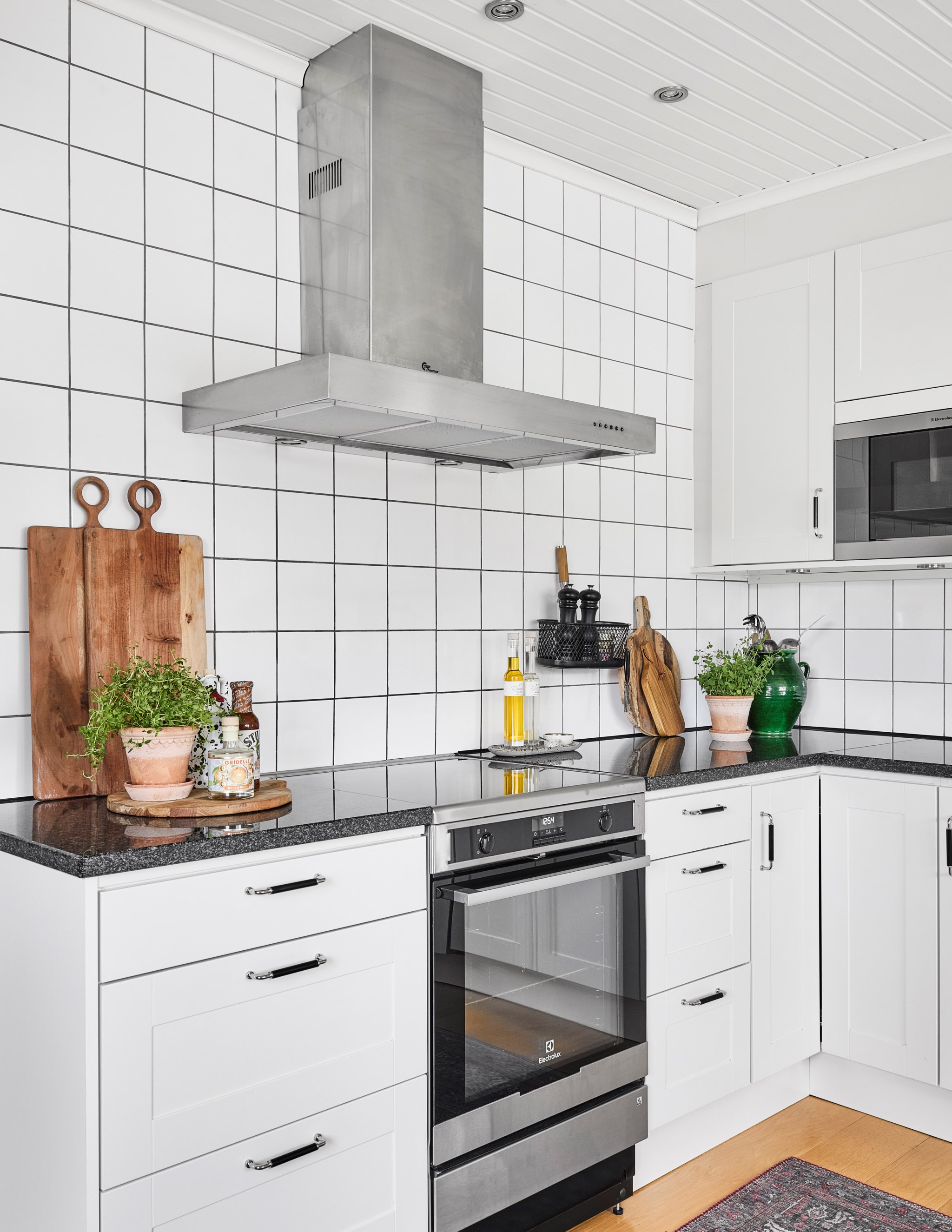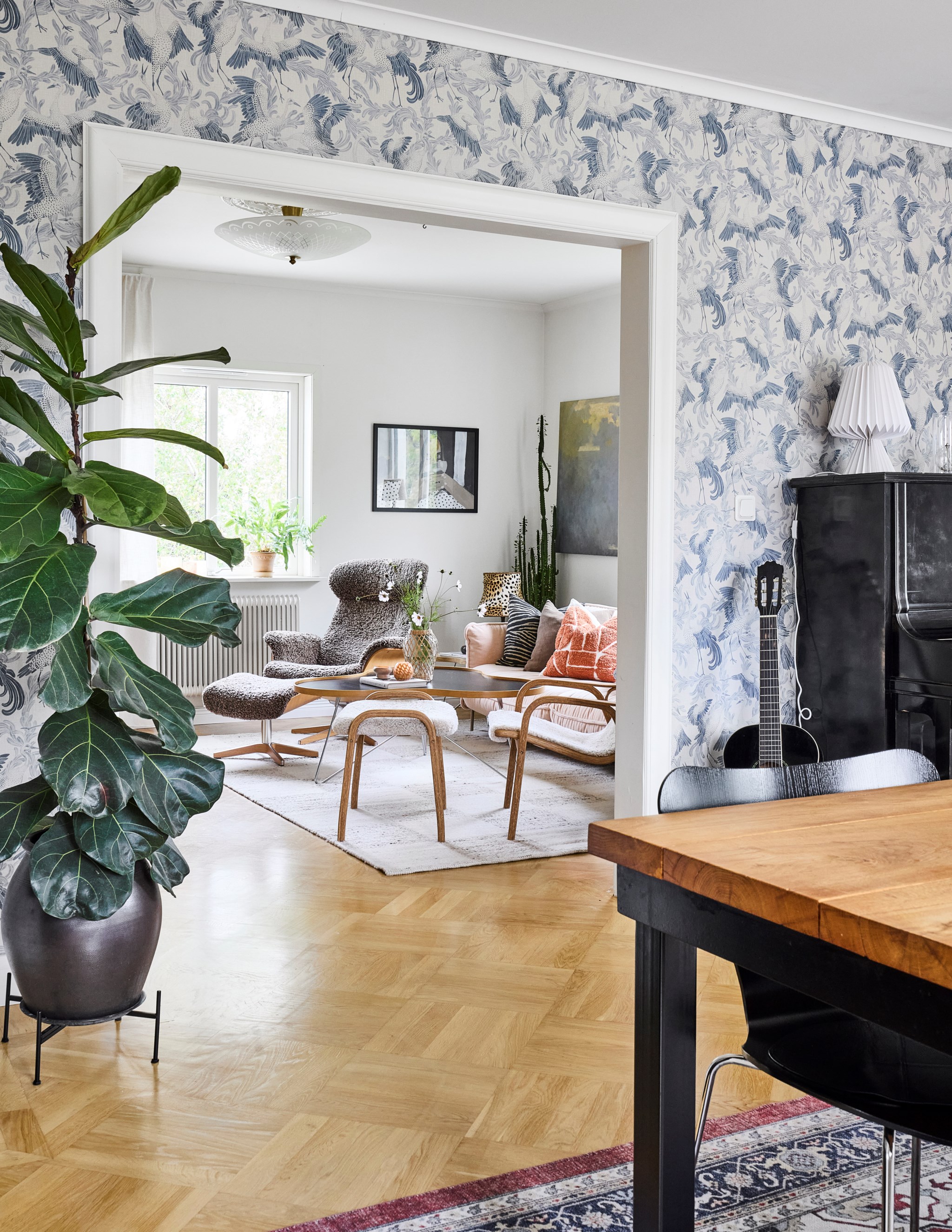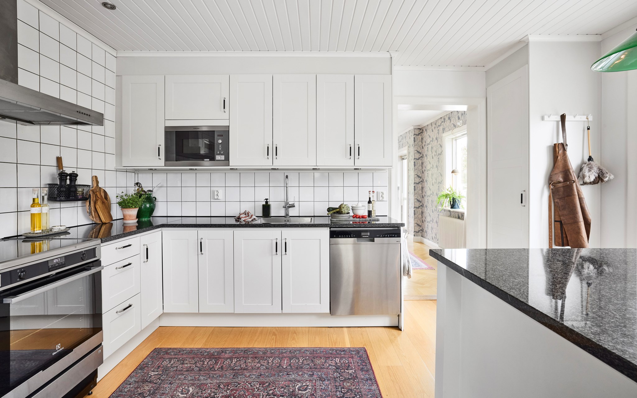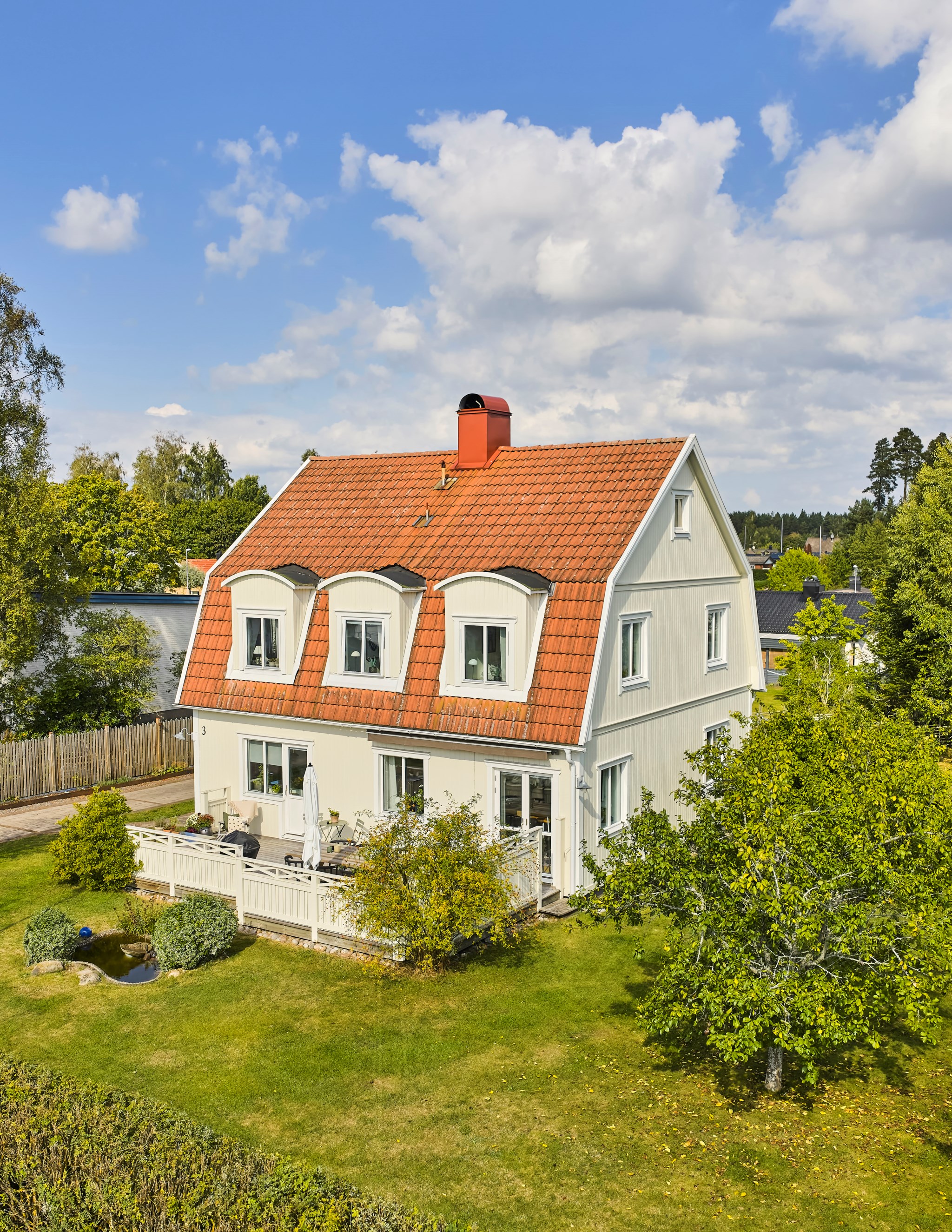 Vardagsrummet har den fina kakelugnen som en varm punkt och sprakar under årets mörka månader. En snyggt mönstrad ekparkett och en generös öppning binder ihop rummet med matsalen. Tillsammans har rummen fönster i flera väderstreck, vilket ger fint ljus från morgon till sen eftermiddag. I matsalen ryms ett rejält matbord, piano (om du vill) och det är högt i tak för samtal. Här, liksom i köket, är det nära ut till terrassen – vilket gör det enkelt att börja middagen ute och sedan flytta in när kvällen blir sval.