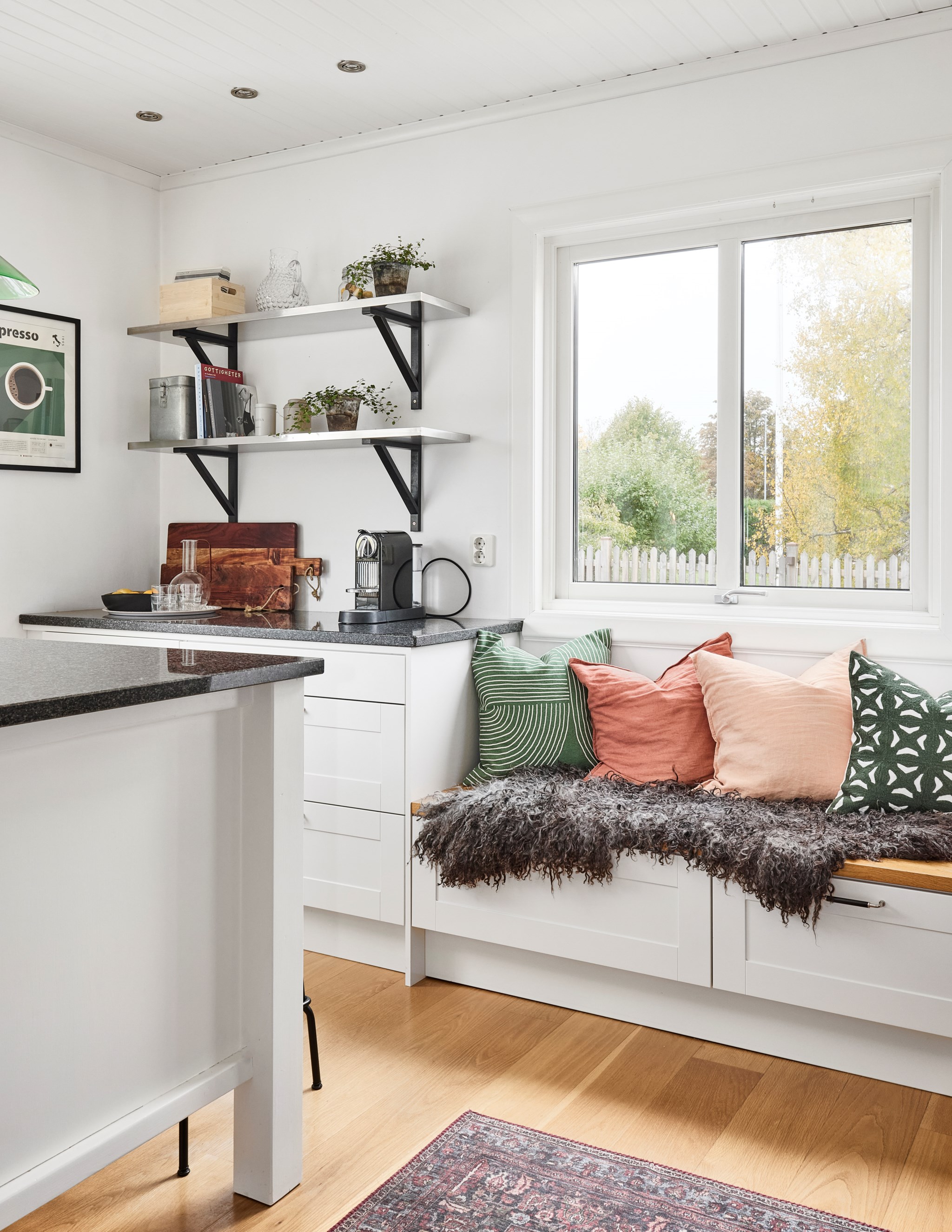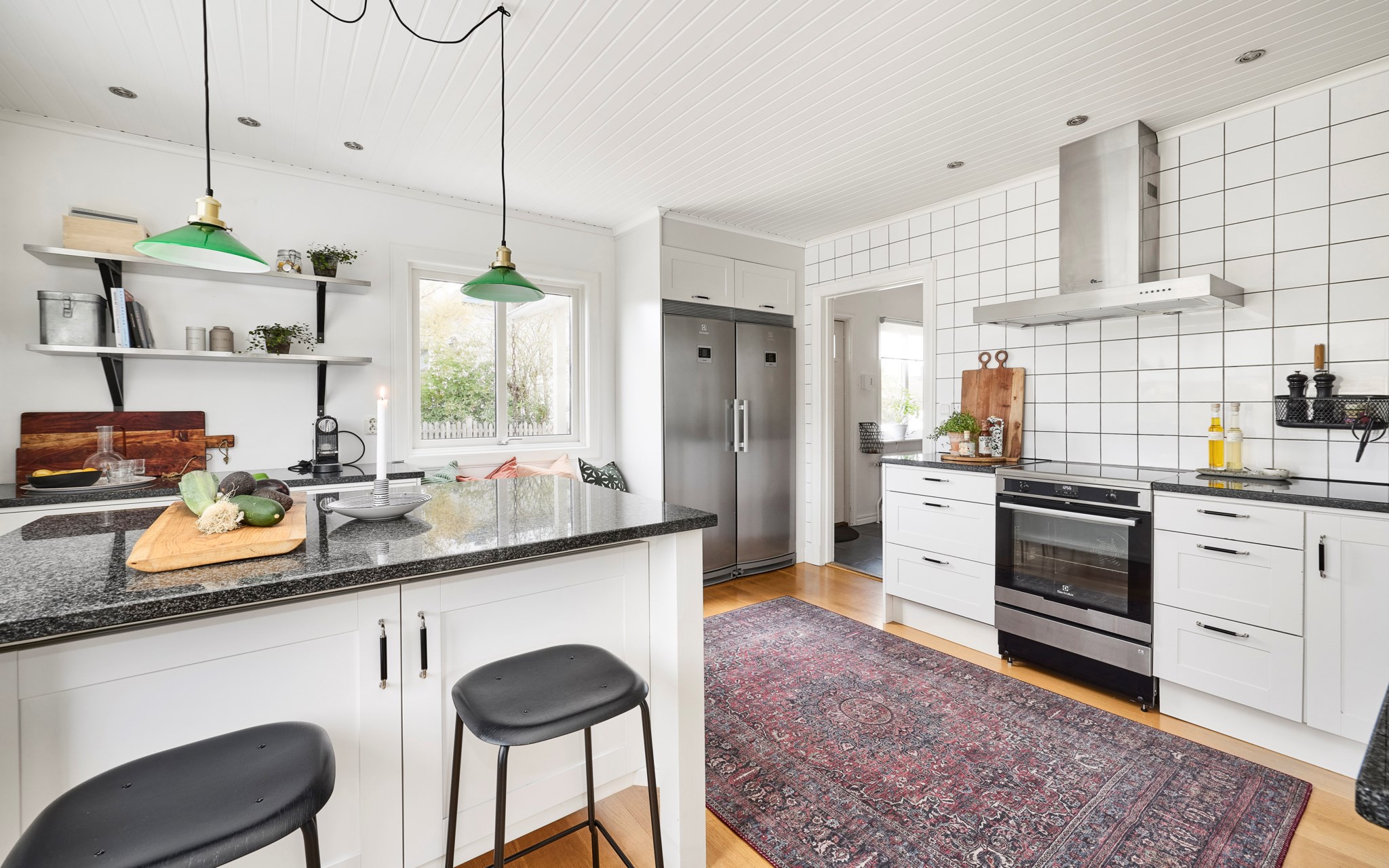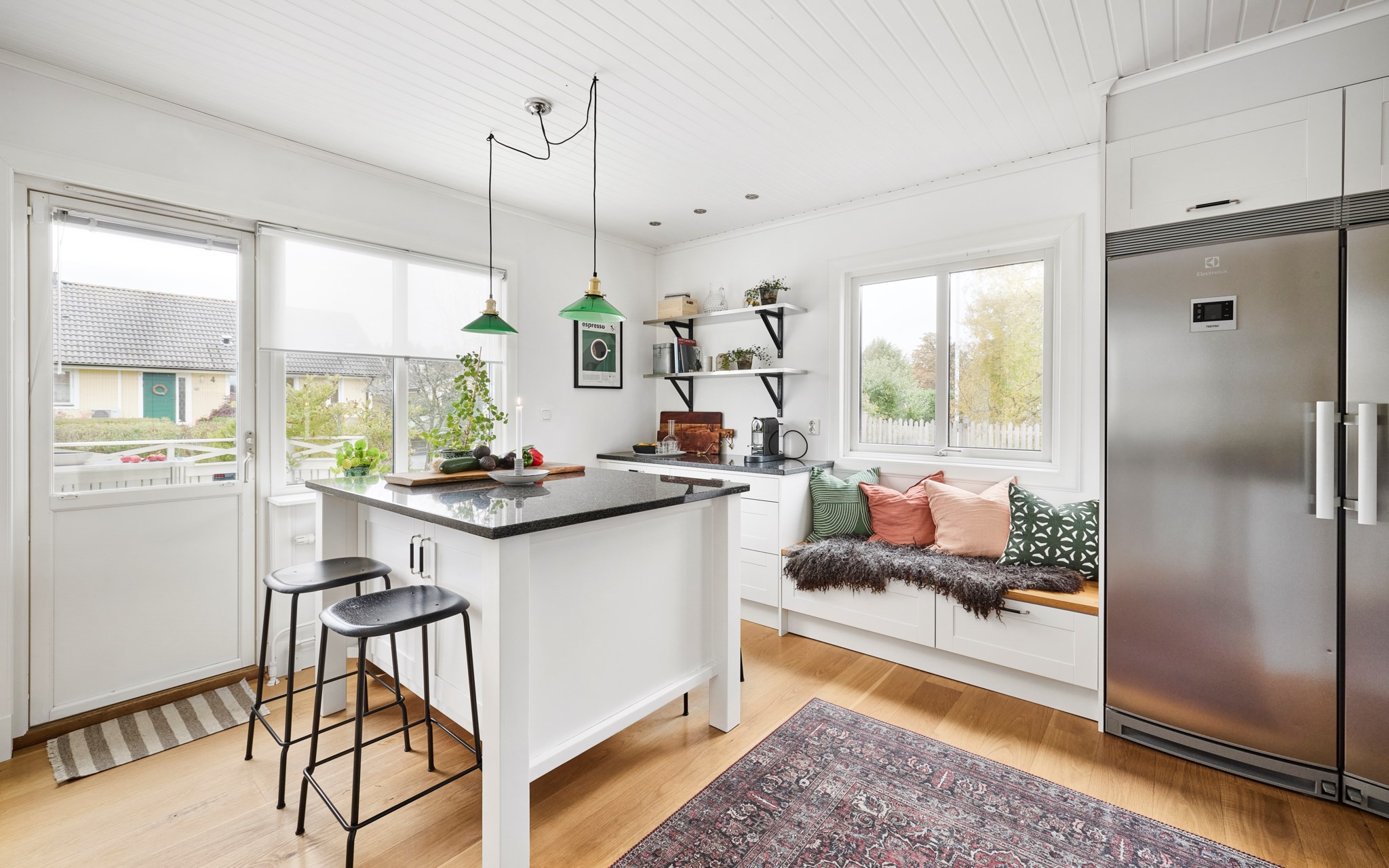 Kök för vardag och kalas. Mörka stenbänkar, ljusa luckor och en generös köksö där mycket i familjelivet landar: läxor, frukost, kvällsdrink. Vid fönstret löper en populär och mysig sittbänk och stora kyl- och frysskåp rymmer hela veckohandlingen. Från köket kliver du rakt ut på den stora söderterrassen – perfekt för såväl långbords-kalas och sommarens spontana glas.