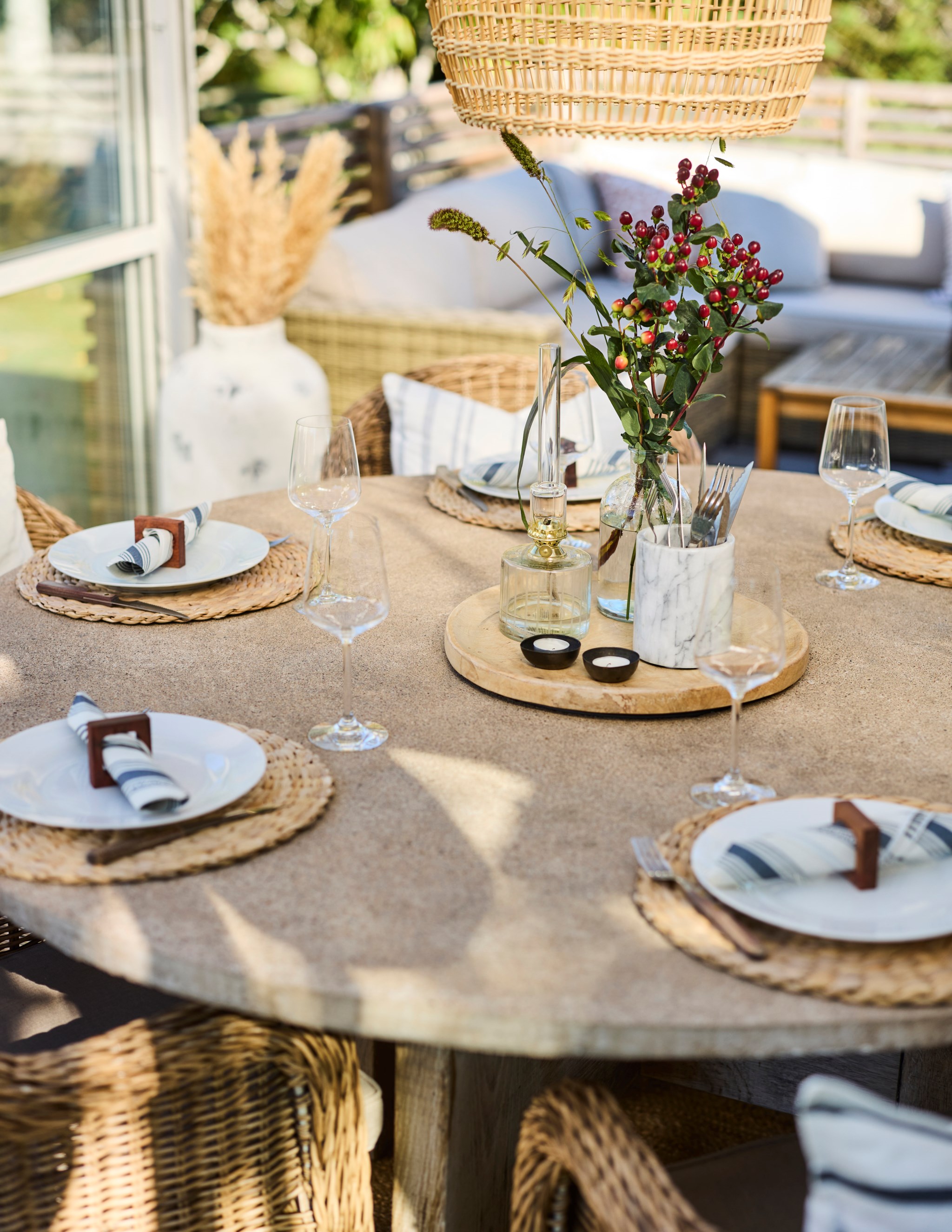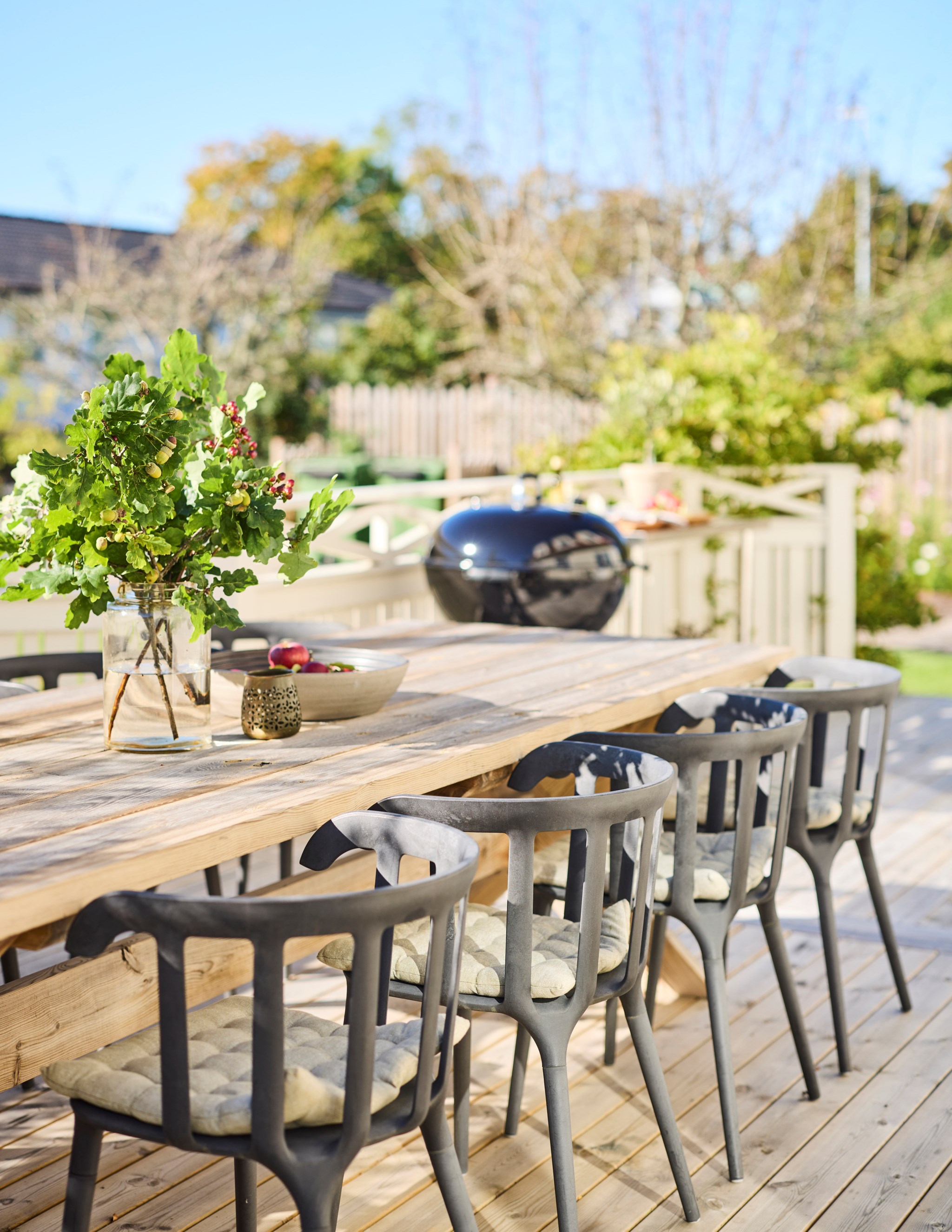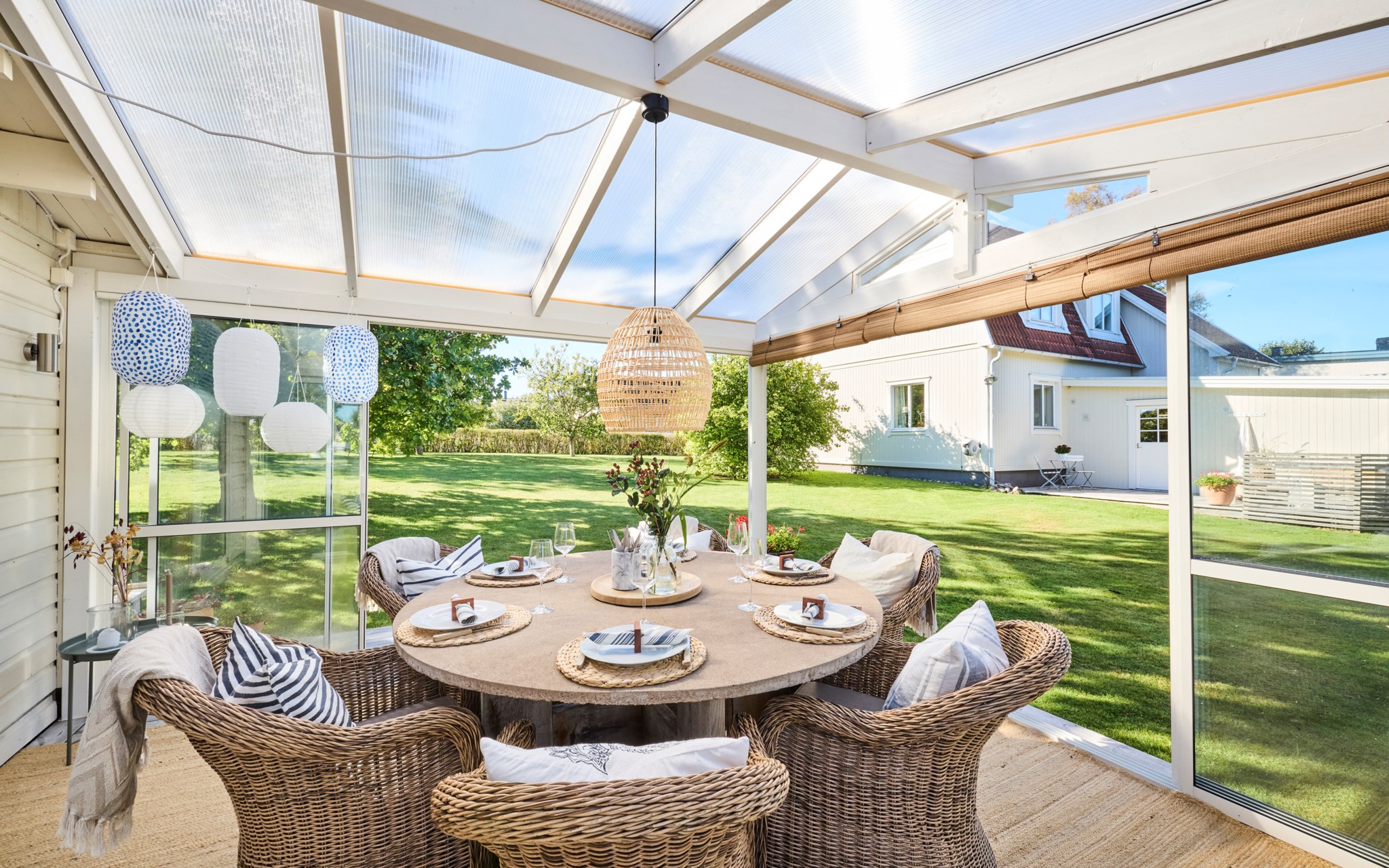 Över uteplatsen från köket och matsalen rör sig solen från morgon till sen eftermiddag, och uterummet på tomten får kvällens sista strålar in på matgruppen.