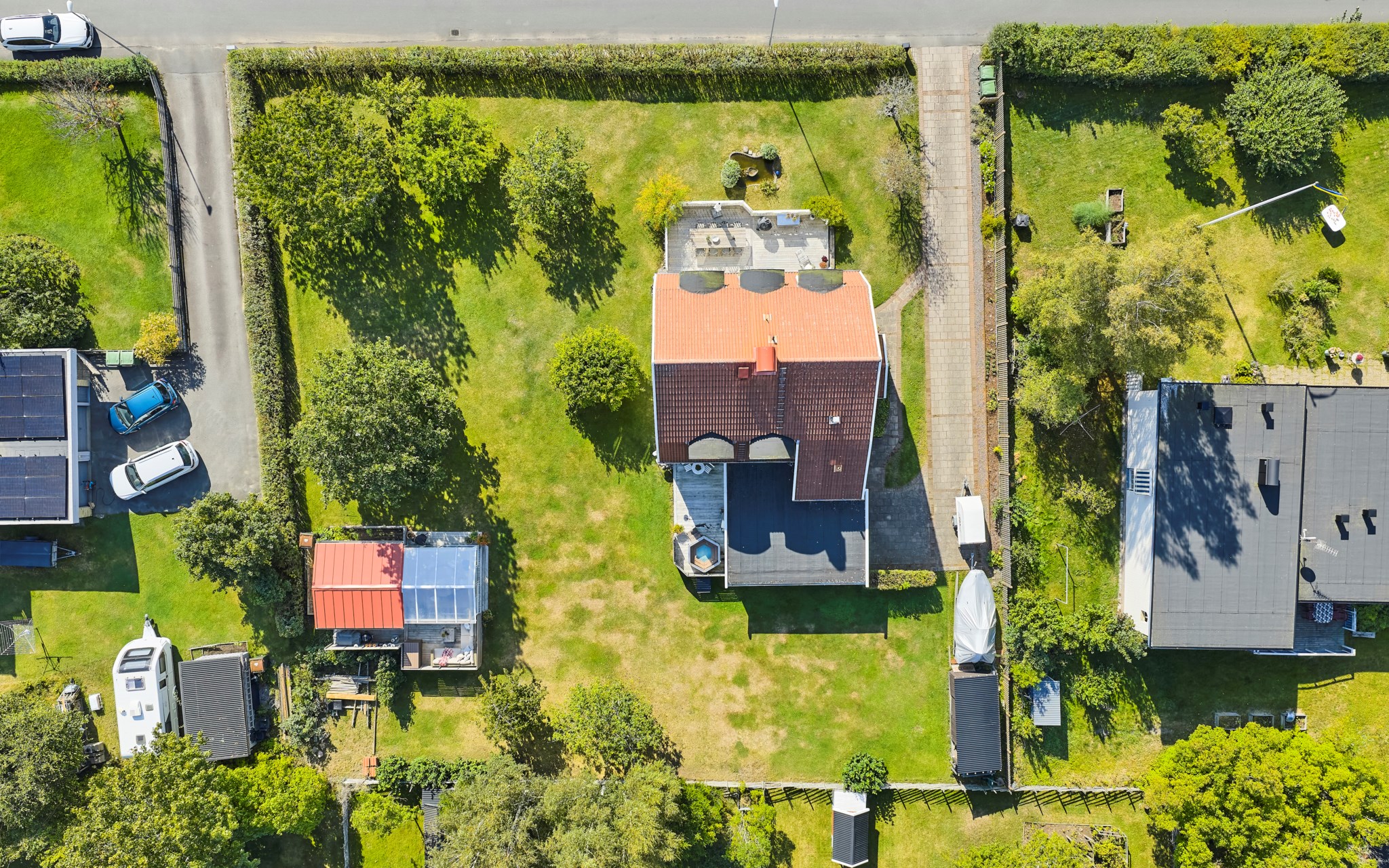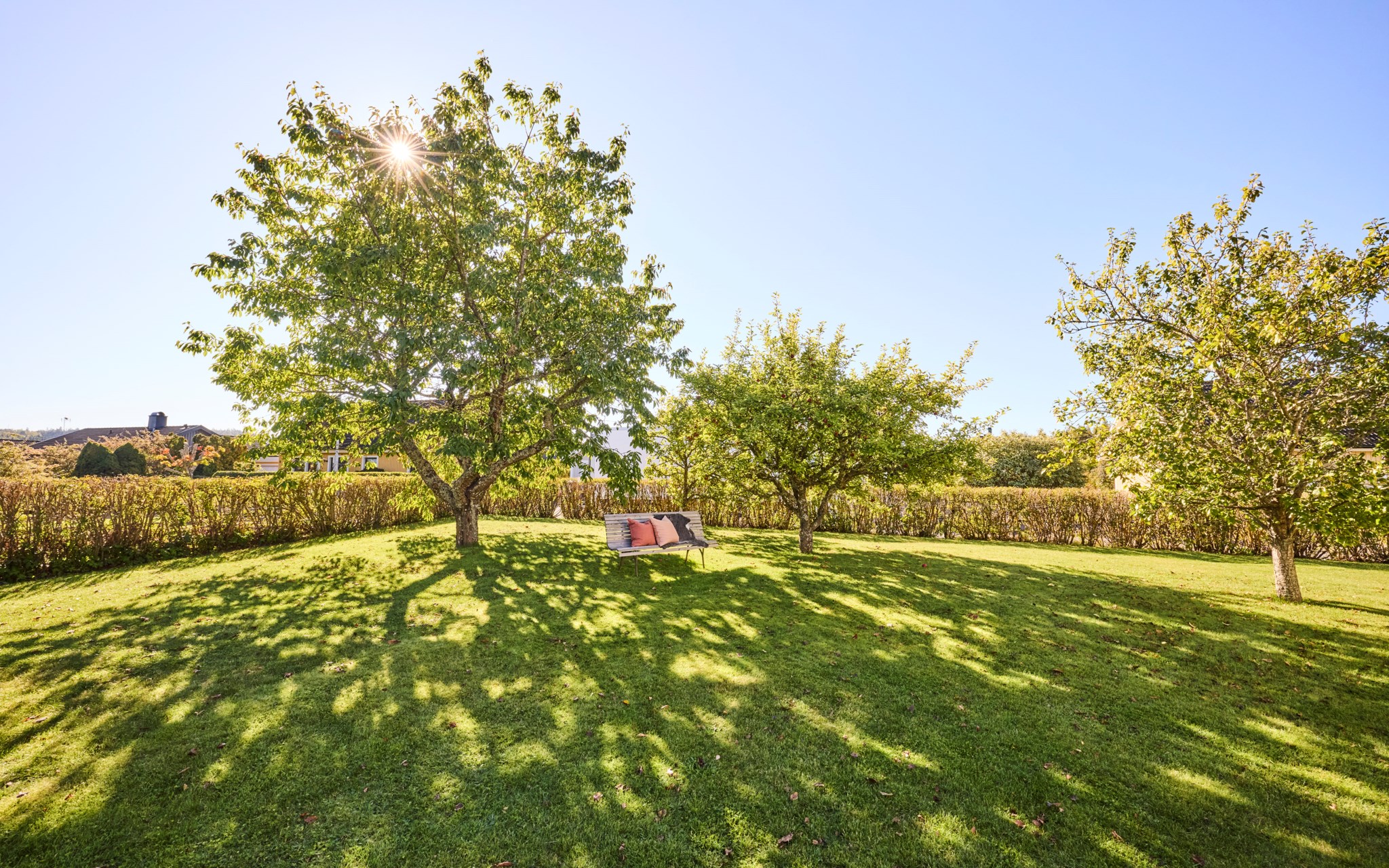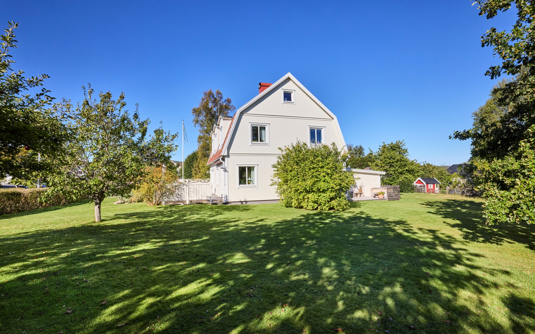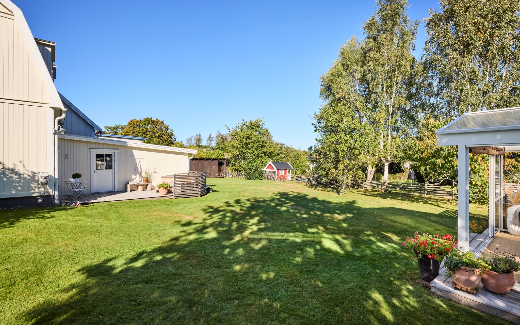 Tomten är stor, grön och lättskött – en mjuk gräsmatta med plats för fotboll, odlingslådor och picknick under träden. Här finns ett helt gäng fruktträd, en liten damm och gott om yta för sommarens lekar. Den långa uppfarten rymmer flera bilar och leder vidare till garaget med extra förvaring. Häckar och träd ger avskildhet mot gatan och kvällarna på söderterrassen blir gärna långa.