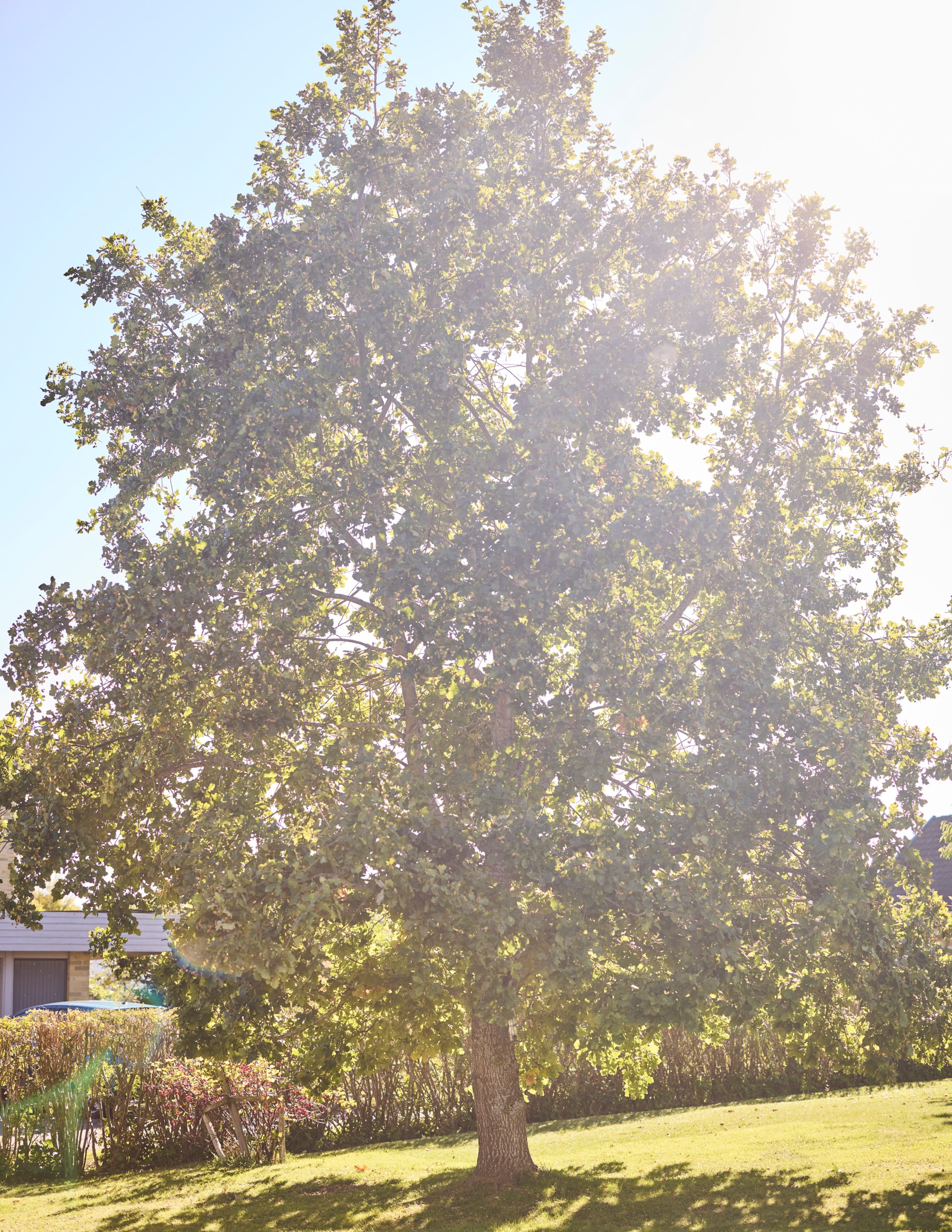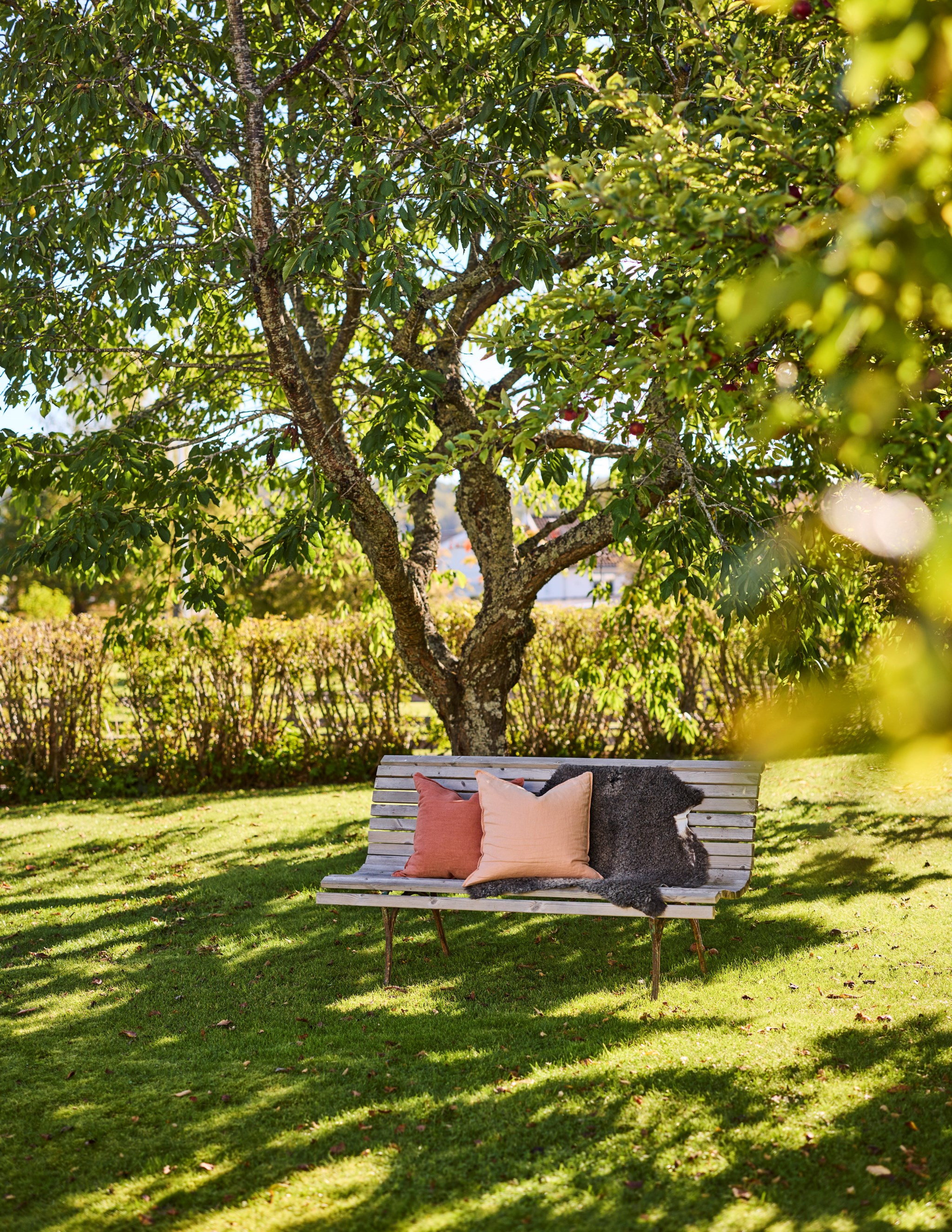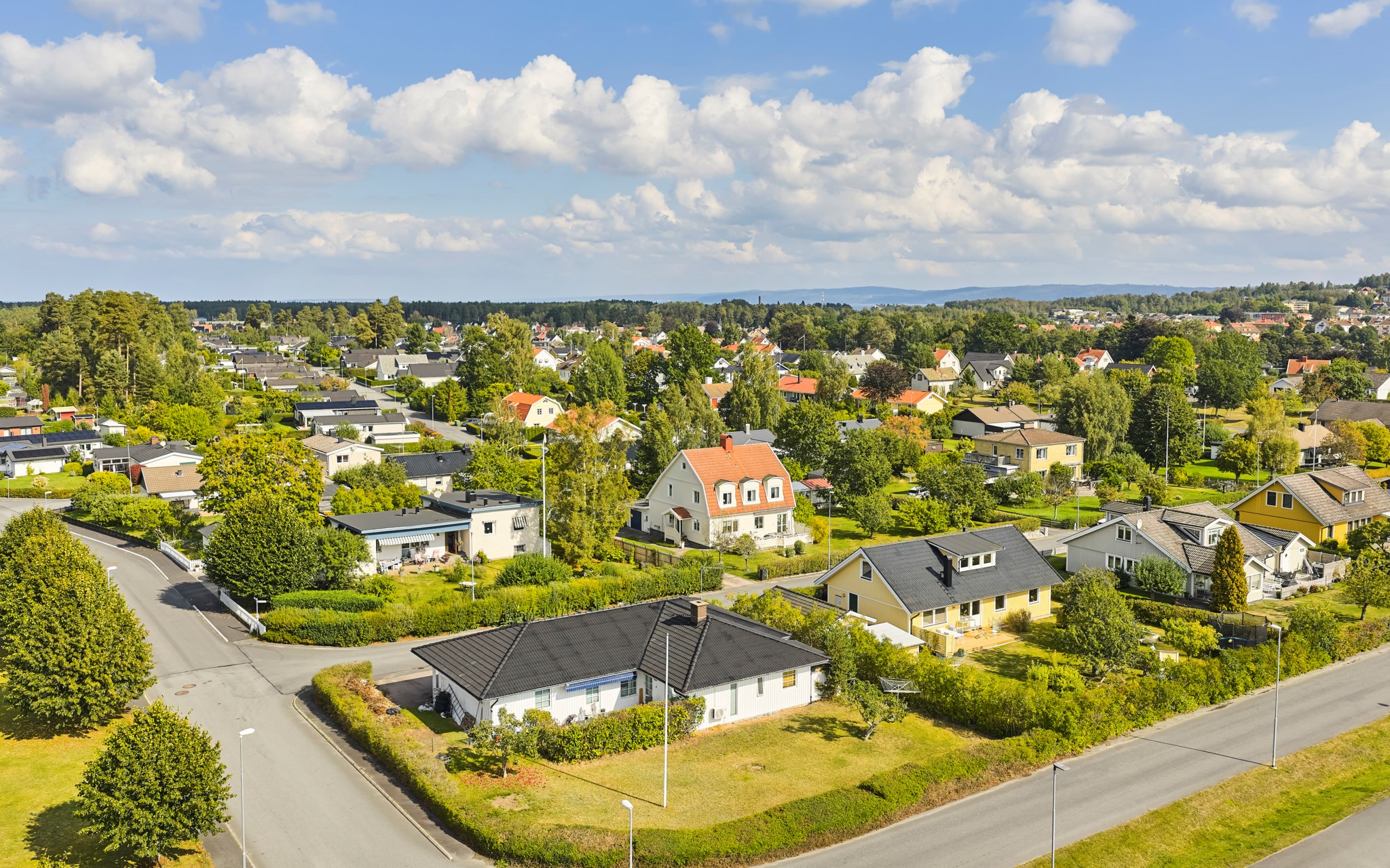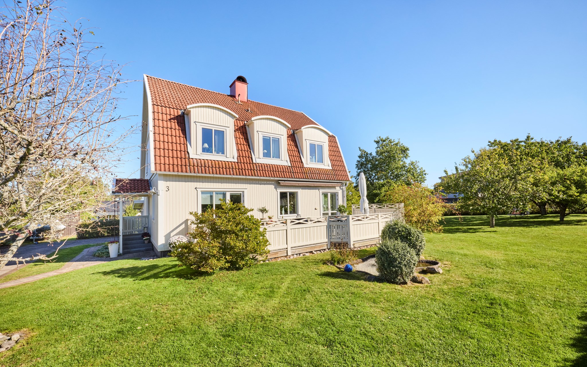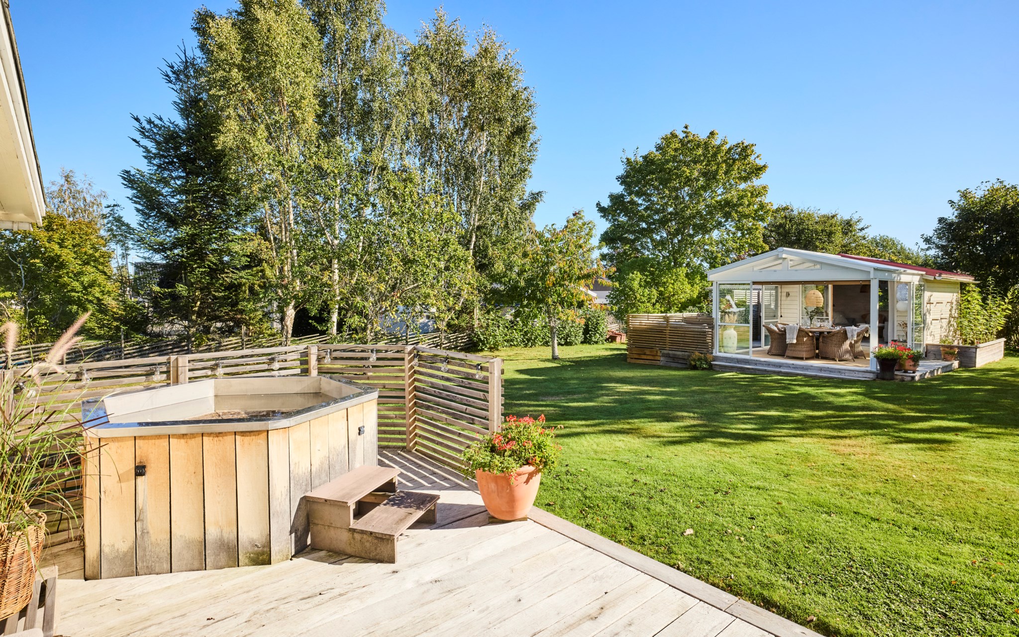 Tomten är stor, grön och lättskött – en mjuk gräsmatta med plats för fotboll, odlingslådor och picknick under träden. Här finns ett helt gäng fruktträd, en liten damm och gott om yta för sommarens lekar. Den långa uppfarten rymmer flera bilar och leder vidare till garaget med extra förvaring. Häckar och träd ger avskildhet mot gatan och kvällarna på söderterrassen blir gärna långa.