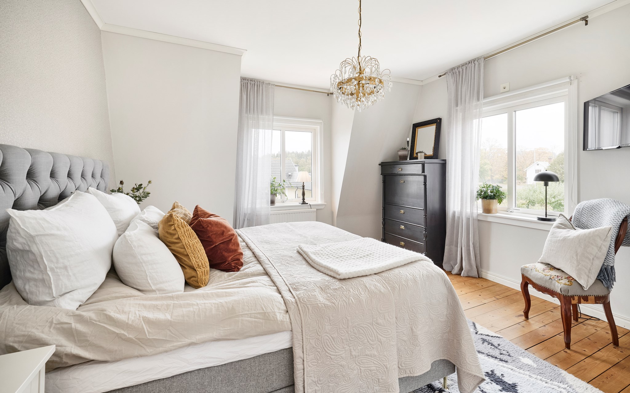 Master bedroom är ett rum att längta till. Två fönster i olika riktningar ger ett mjukt dagsljus och under kvällen ett stilla sken. Här ryms en rejäl säng, byråer och fåtölj – och intill finns en liten klädkammare som samlar det mesta. Trägolvet fortsätter även här och gör rummet varmt och inbjudande. En plats för återhämtning där dörren gott kan få vara stängd när huset är fullt av liv.