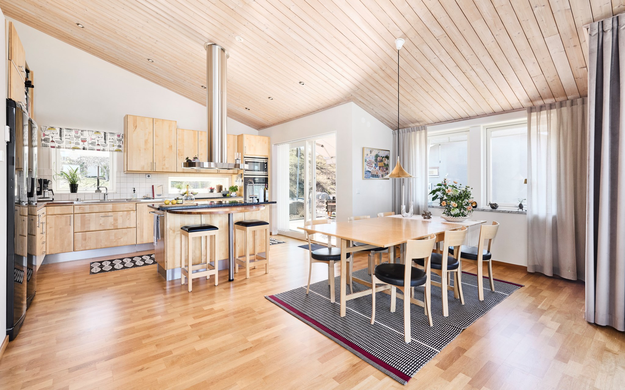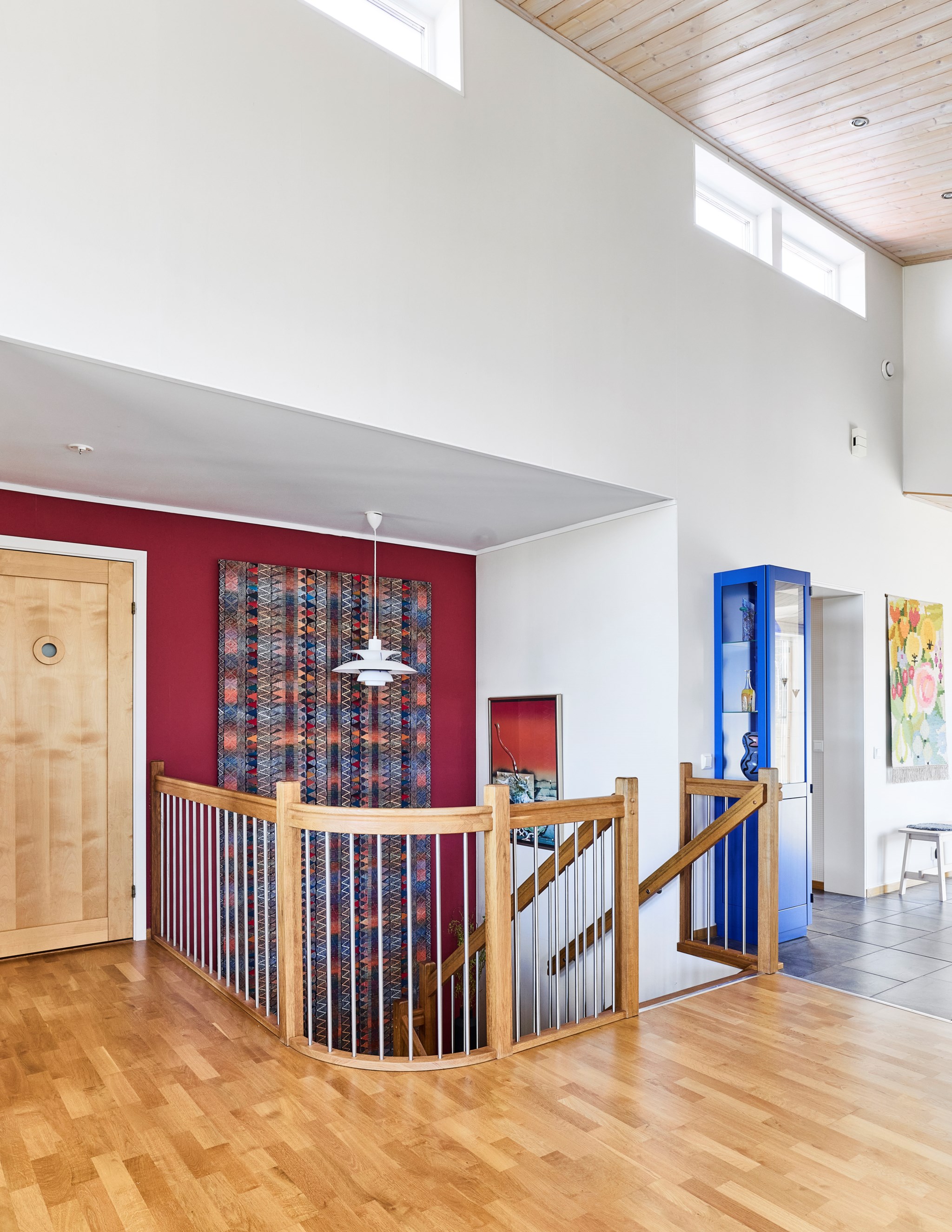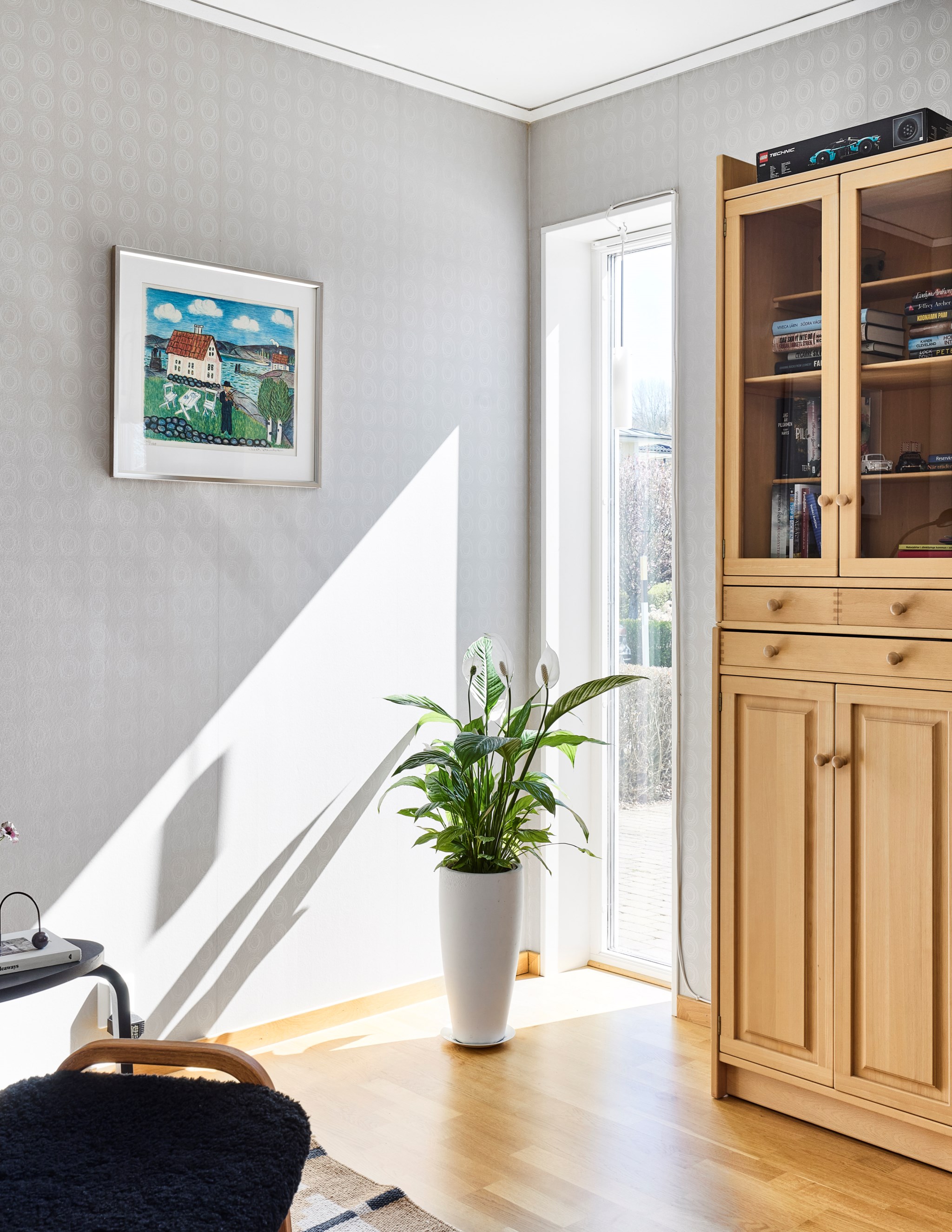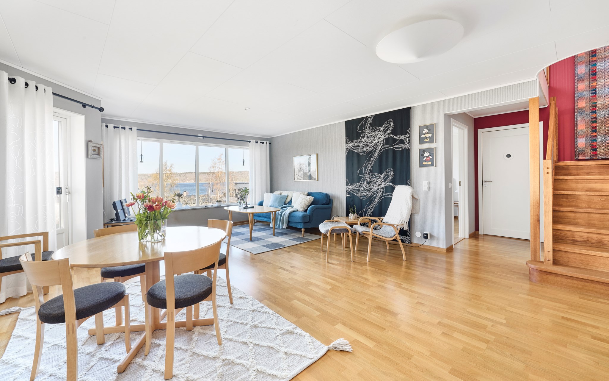 Himmelskt vackert själva rummet i sig. Lägg till den raklånga utsikten över Landsjön så skapas magi alla dagar hela året. Nuvarande ägare var väldigt bestämda med att de ville ha trä i taket, och tack vare det skapas den varma ombonade känslan trots avståndet upp. Rummet får en varm och naturlig inramning, som ett gipstak aldrig hade skapat. Golvet också i trä men lite mer förväntad ekparkett som är i perfekt skick över hela ytan. En tänkbar förfining vore trots det att slipa golvet innan inflyttning, för lite solblekt har det såklart blivit av alla fönster.