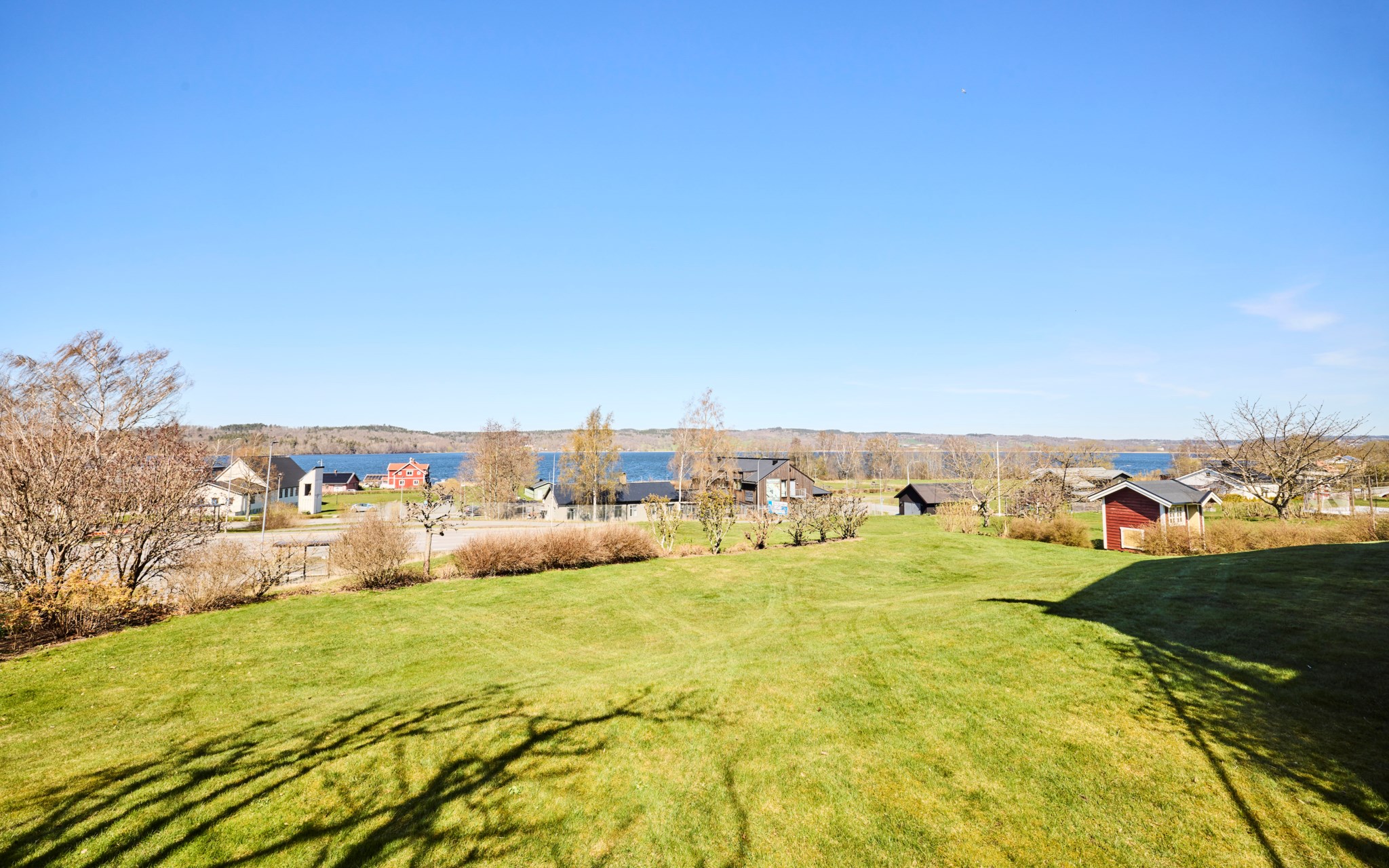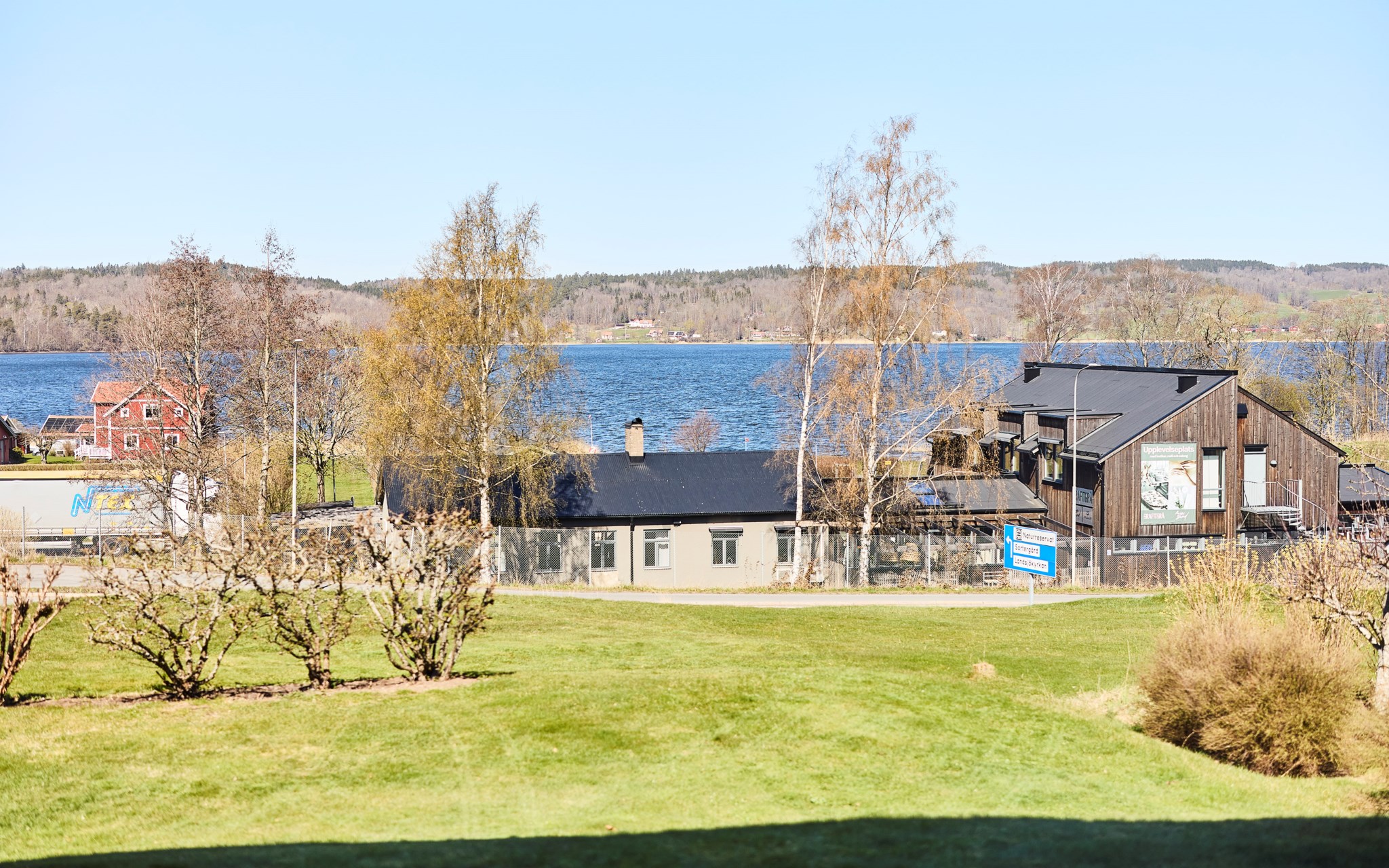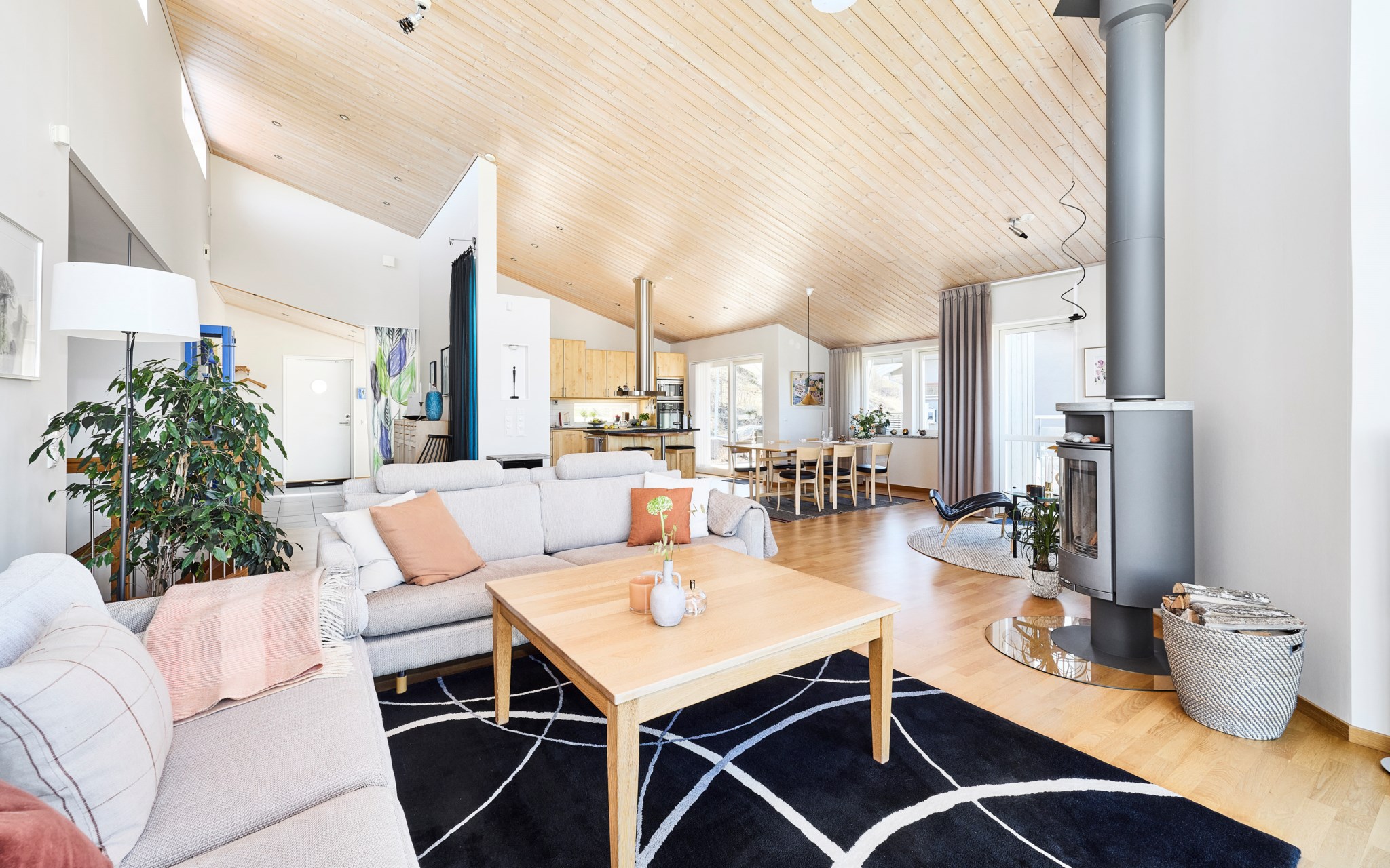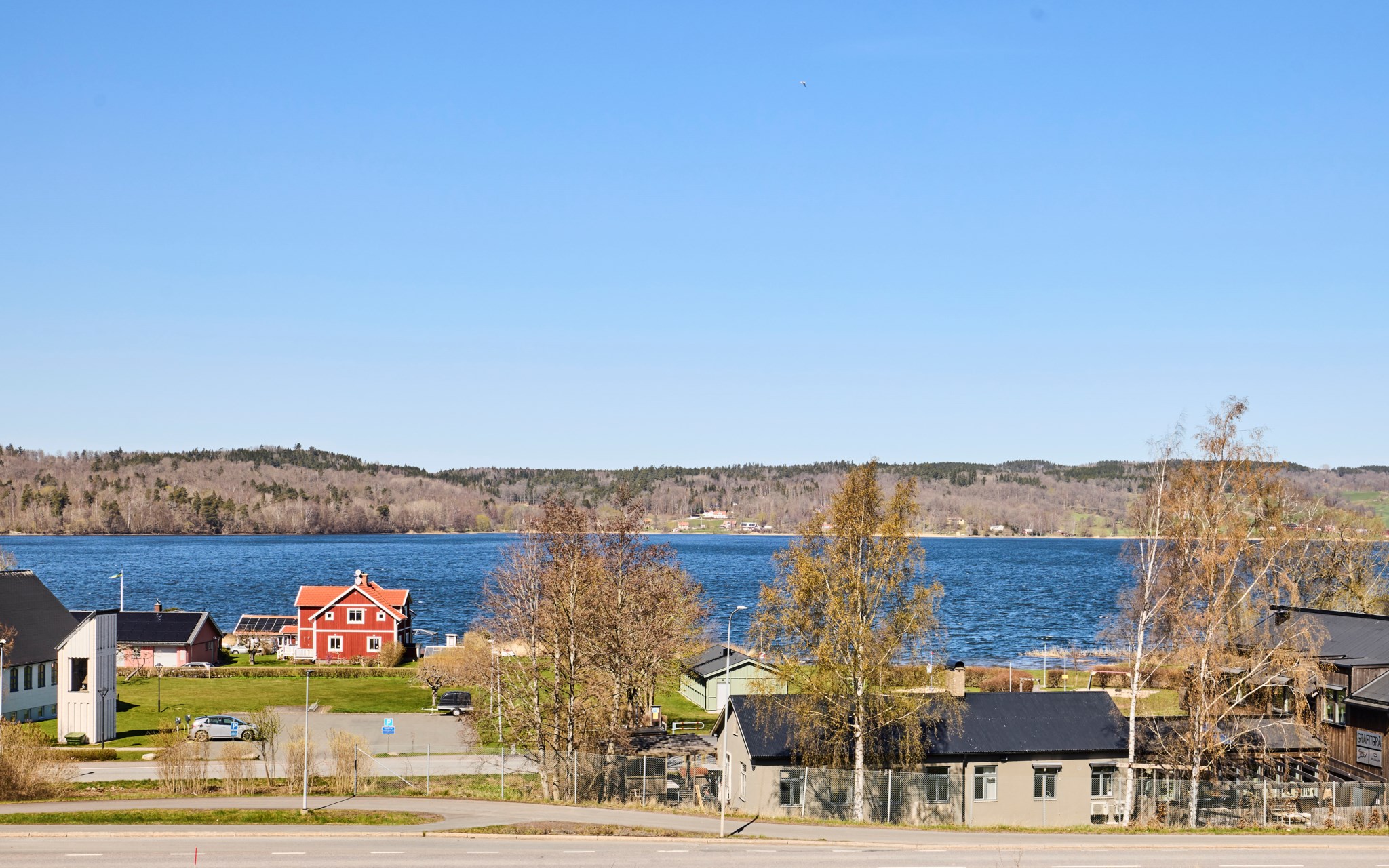Himmelskt vackert själva rummet i sig. Lägg till den raklånga utsikten över Landsjön så skapas magi alla dagar hela året. Nuvarande ägare var väldigt bestämda med att de ville ha trä i taket, och tack vare det skapas den varma ombonade känslan trots avståndet upp. Rummet får en varm och naturlig inramning, som ett gipstak aldrig hade skapat. Golvet också i trä men lite mer förväntad ekparkett som är i perfekt skick över hela ytan. En tänkbar förfining vore trots det att slipa golvet innan inflyttning, för lite solblekt har det såklart blivit av alla fönster.