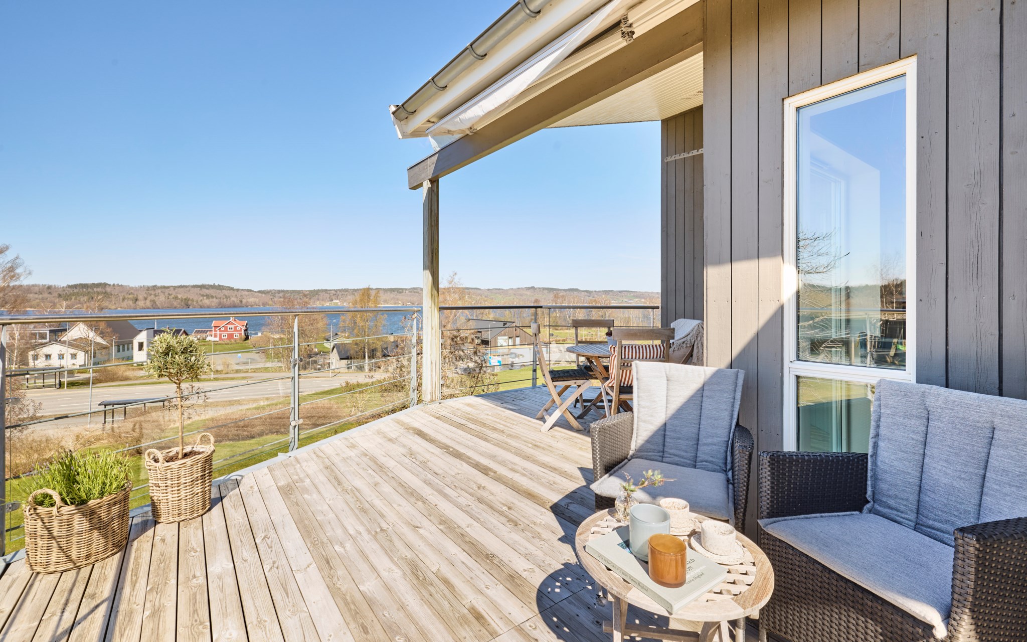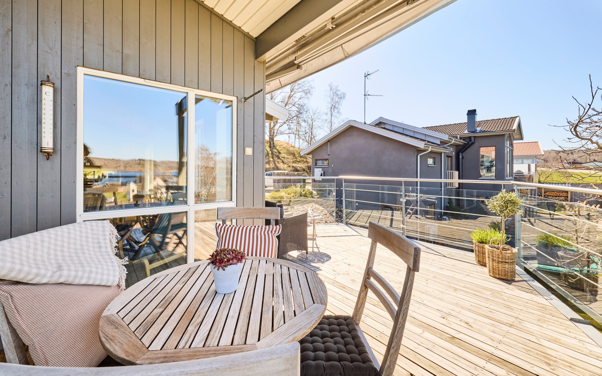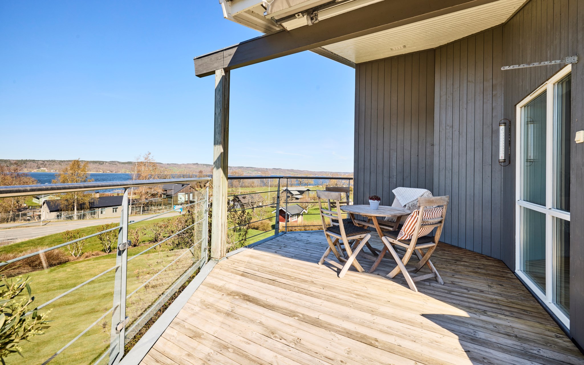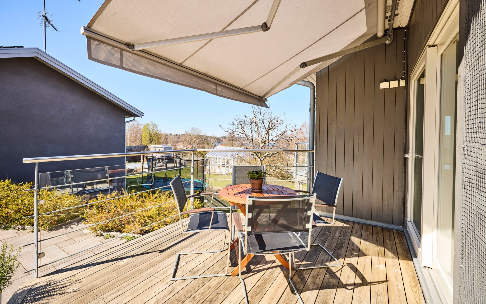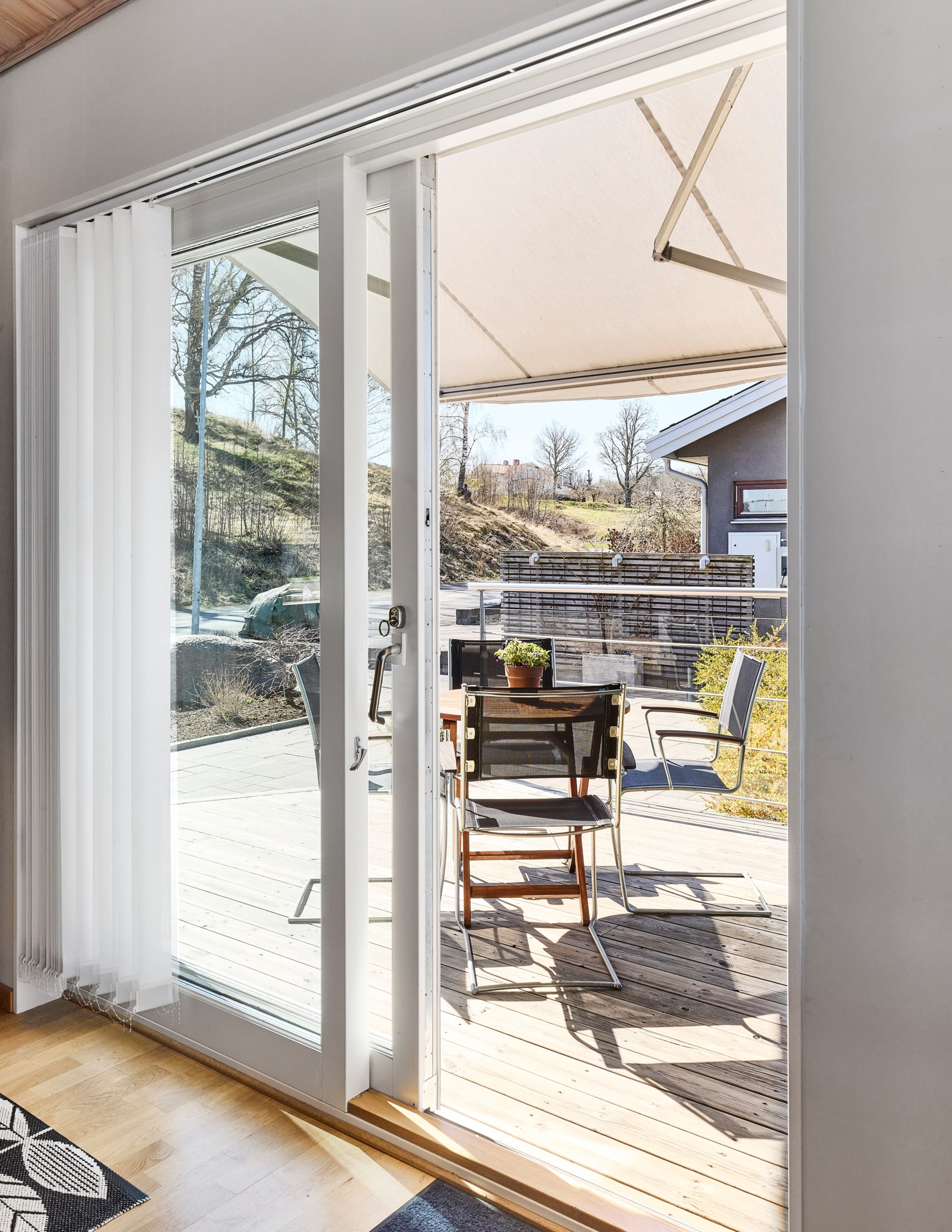 Här kan solen följa dig runt huset, eller om det möjligen är tvärt om. Från köket kommer du ut på terrassen på sidan av huset och kommer åt den tidigaste morgonsolen om du är arla uppe, men solen är kvar här en stor del av eftermiddagen. Därefter är det bara att flytta över till balkongen som har kvällssolen i sikte till hon släntrar ner långt borta i Västergötland. Nuvarande ägare har förberett för en inglasning på uteplatsen under balkongen, men har inte kommit till skott, och kanske är det inte helt nödvändigt när hela vardagsrummet är som en inglasning. Du får se hur dina tankar går.