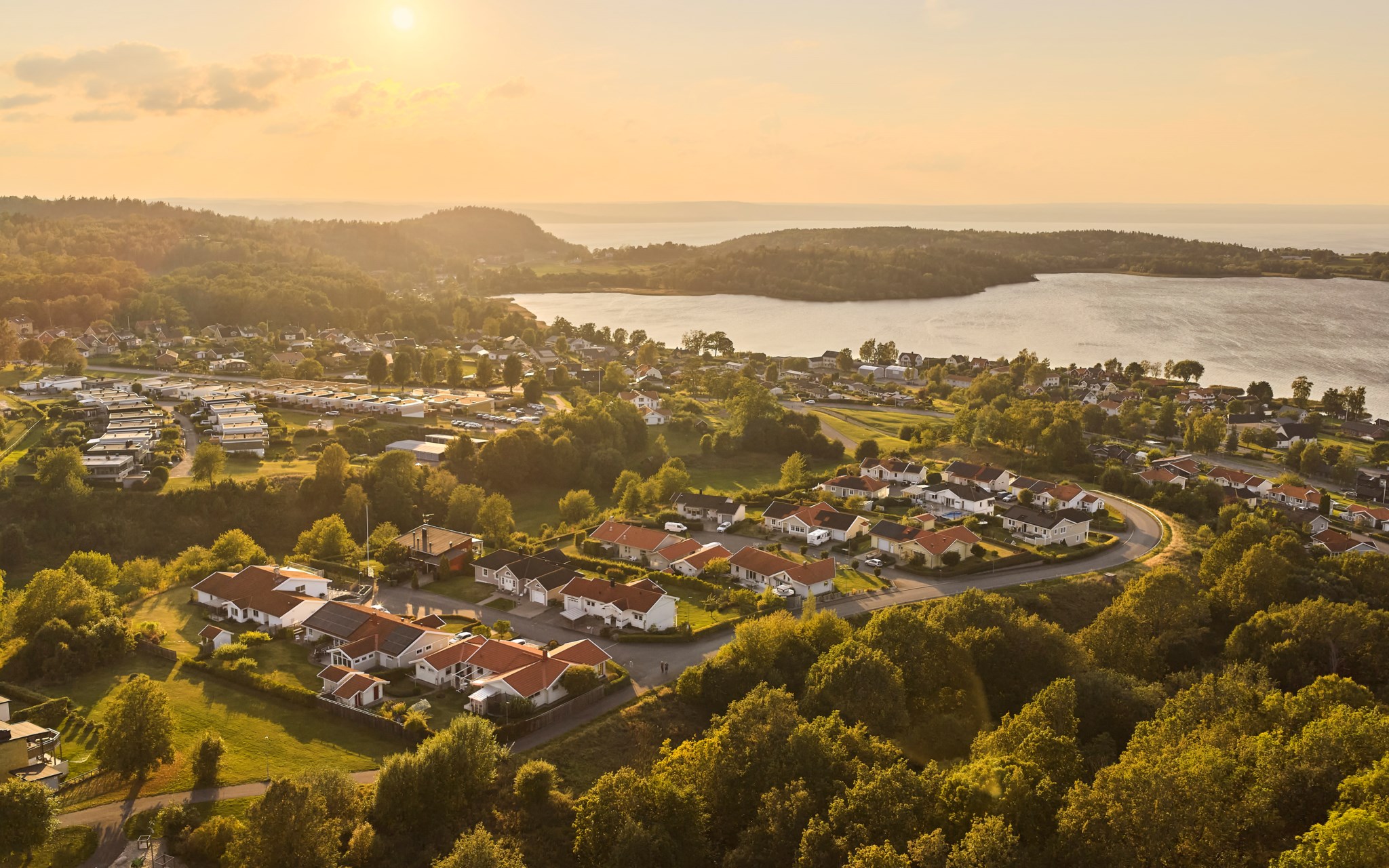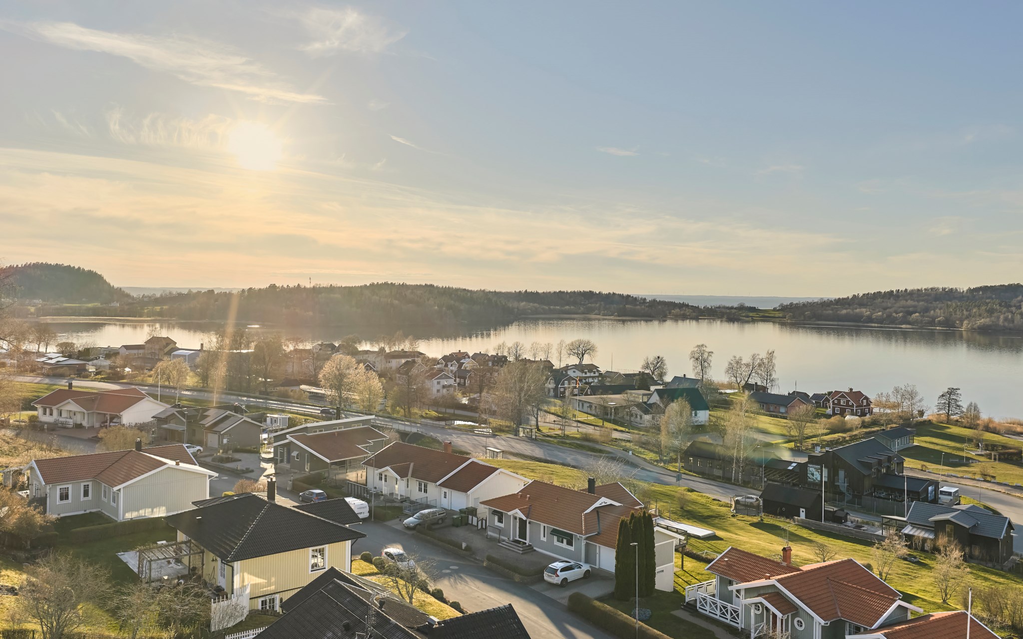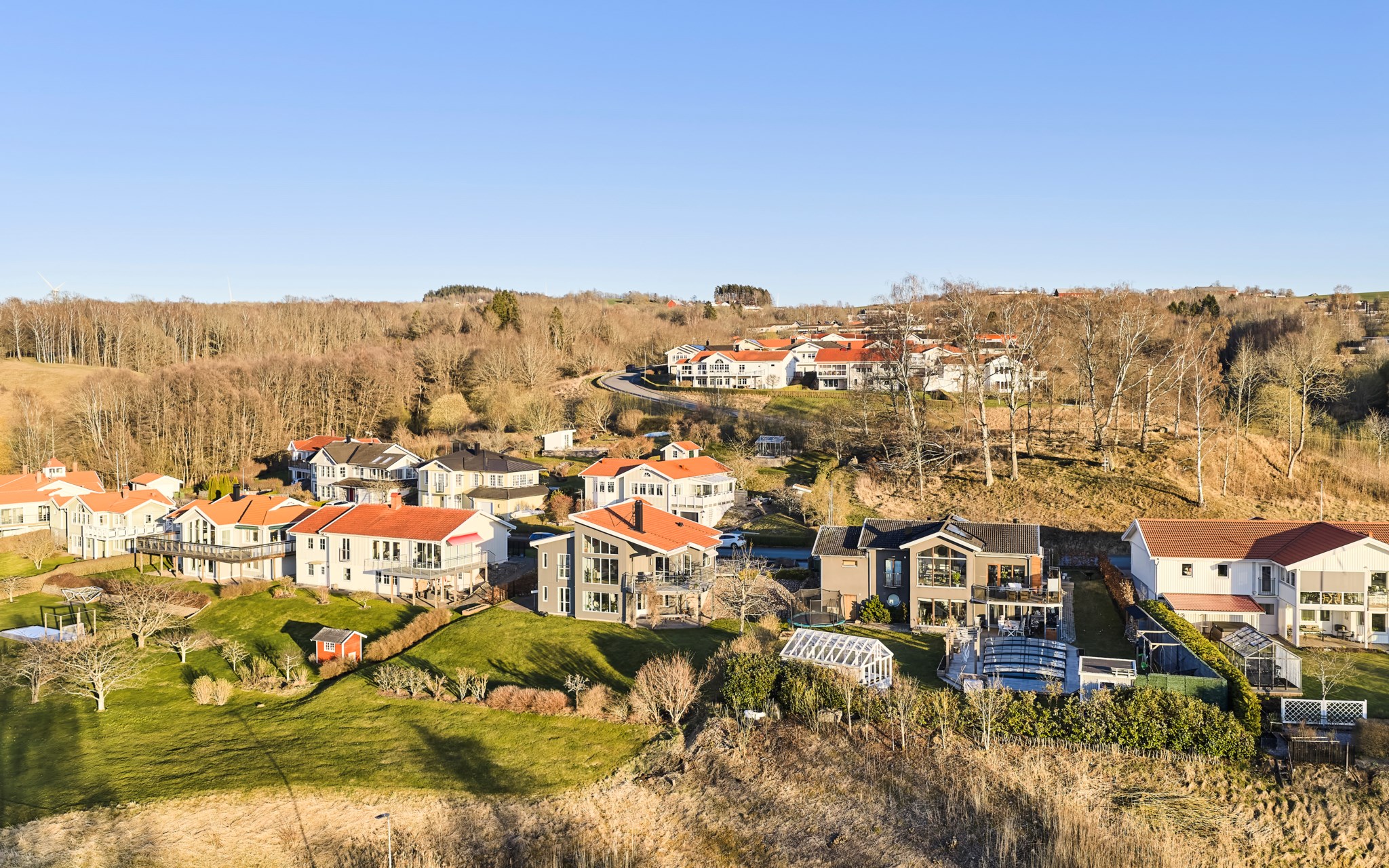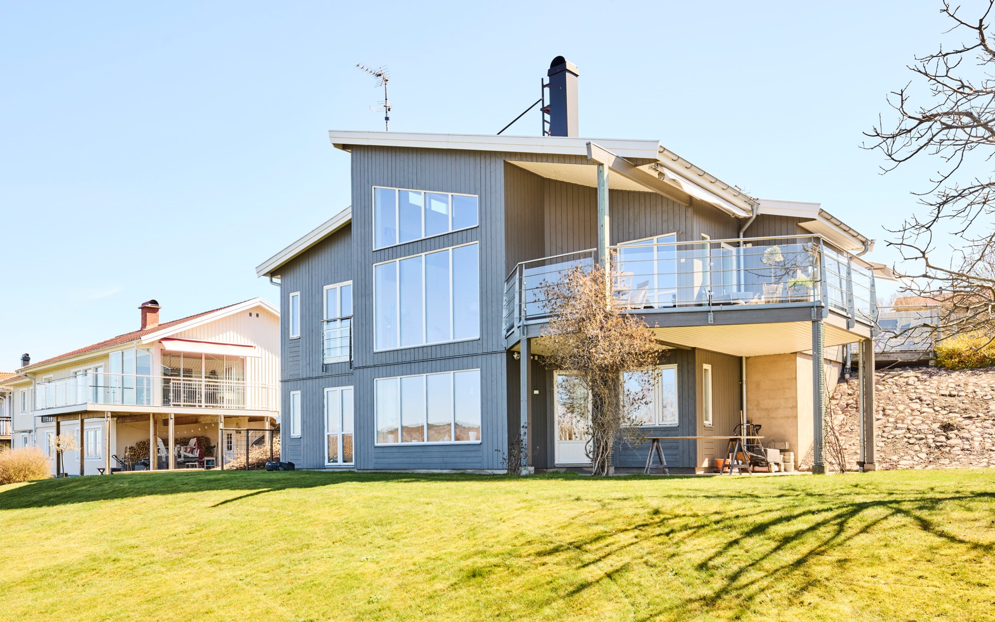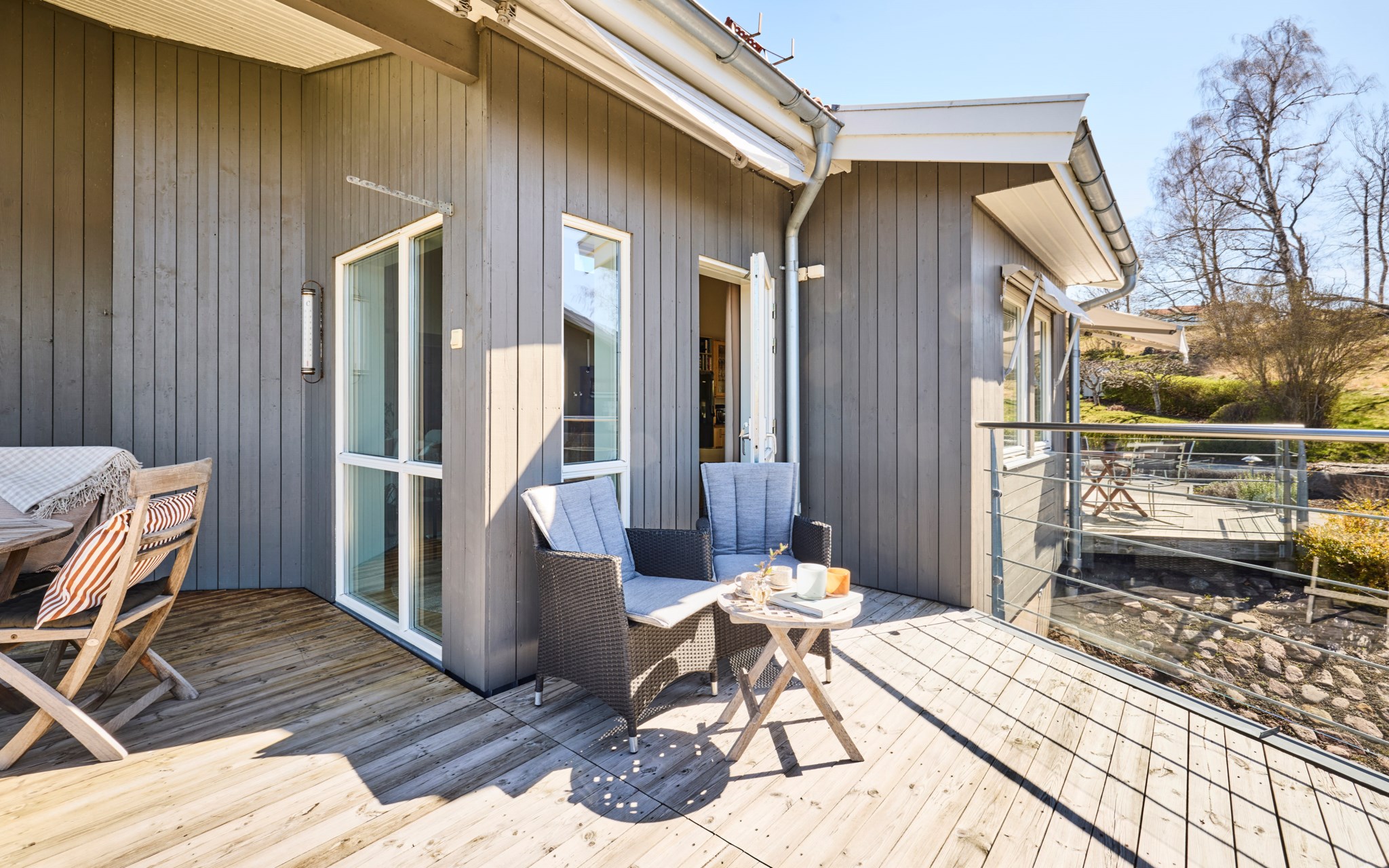 Här kan solen följa dig runt huset, eller om det möjligen är tvärt om. Från köket kommer du ut på terrassen på sidan av huset och kommer åt den tidigaste morgonsolen om du är arla uppe, men solen är kvar här en stor del av eftermiddagen. Därefter är det bara att flytta över till balkongen som har kvällssolen i sikte till hon släntrar ner långt borta i Västergötland. Nuvarande ägare har förberett för en inglasning på uteplatsen under balkongen, men har inte kommit till skott, och kanske är det inte helt nödvändigt när hela vardagsrummet är som en inglasning. Du får se hur dina tankar går.
