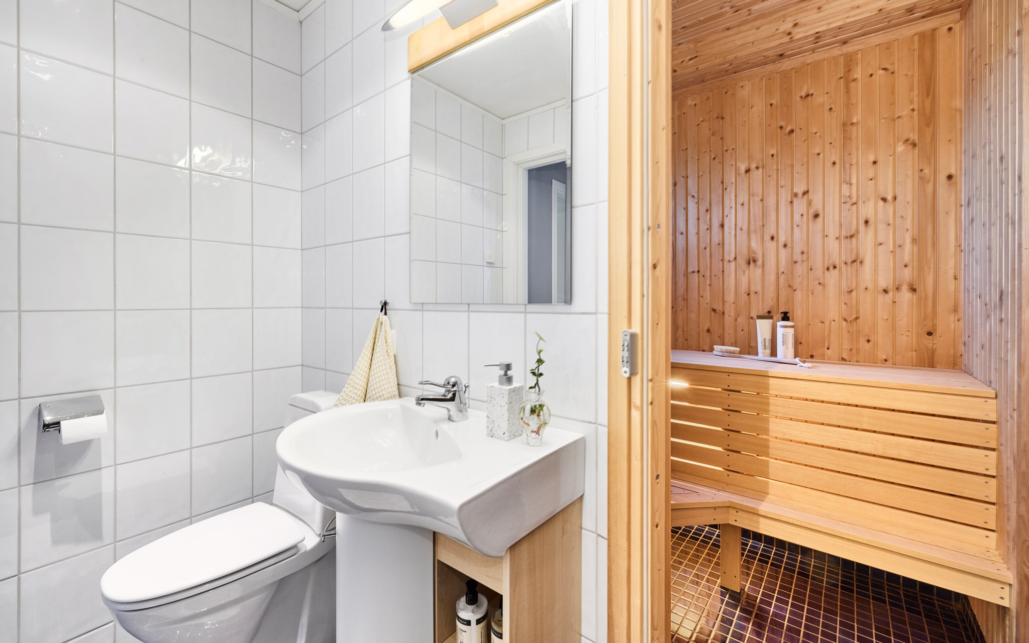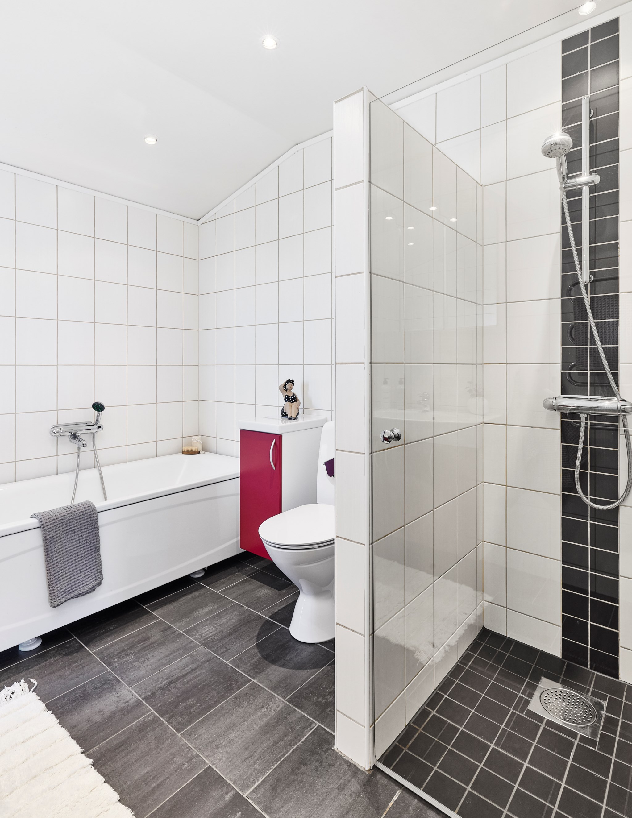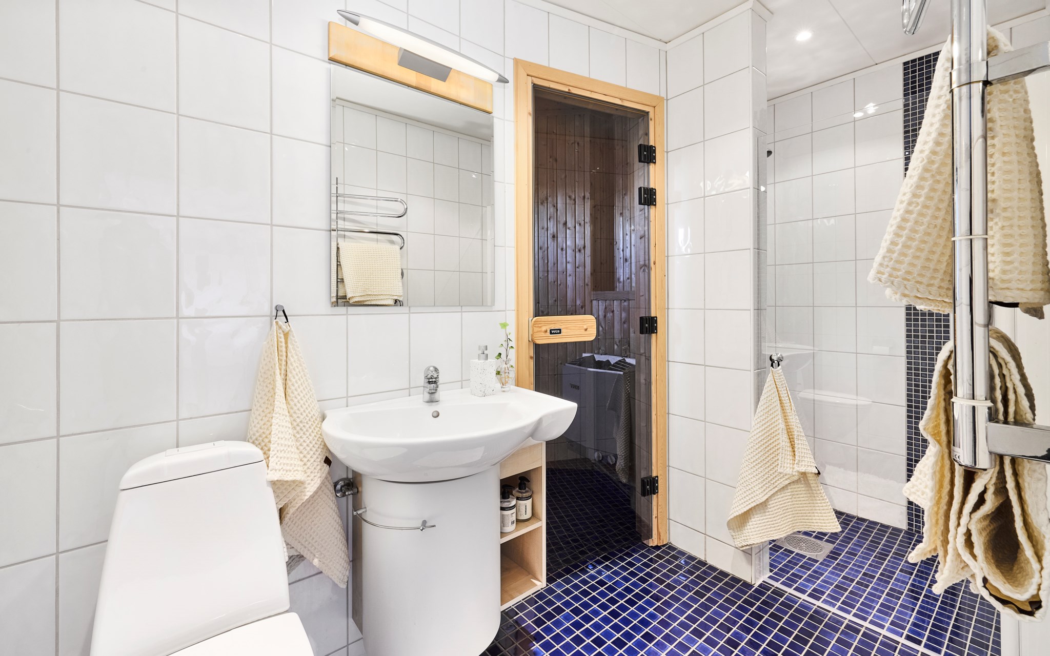 Badrummen uppe och nere är lite olika i karaktär och storlek. Uppe lite striktare med grafitgrått golv och vita väggar. Duschen så där snygg och stor att man kan gå in och göra det man ska utan att vara rädd att skvätta ut över golvet. Badrummet nere lite mer av en färgklick tack vare himmelsblå klinker på golvet, men vita väggar även här. Här har golvytan räckt till en fin bastu dessutom som har ett eget litet fönster som kräver att du klättrar upp på översta bänken för att se finessen med. Kolla själv får du se. Golvvärme i badrummen, precis som i resten av huset.