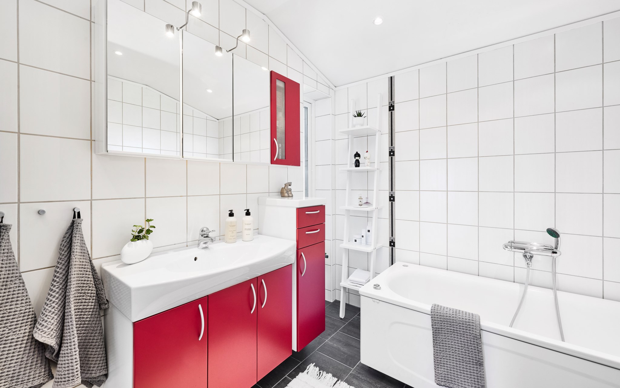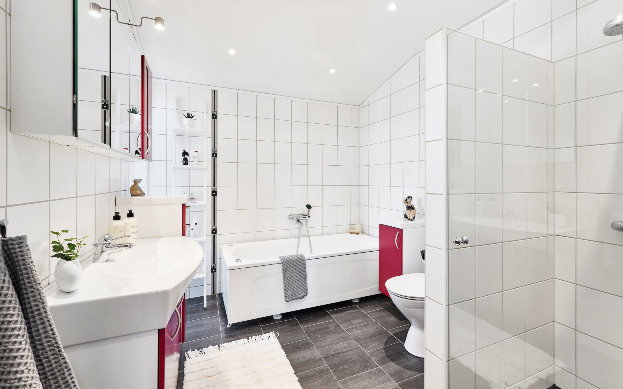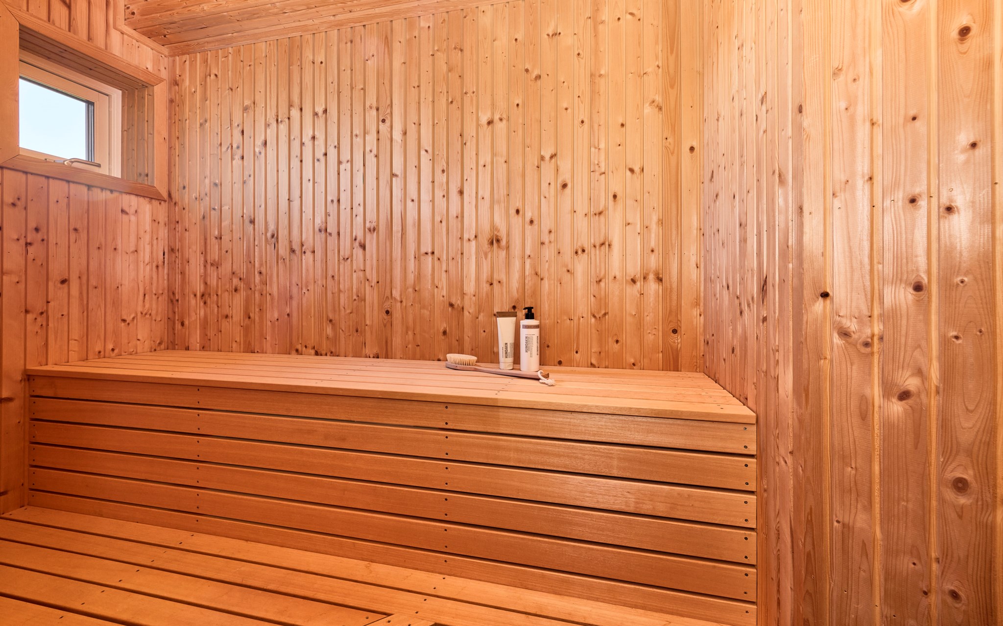 Badrummen uppe och nere är lite olika i karaktär och storlek. Uppe lite striktare med grafitgrått golv och vita väggar. Duschen så där snygg och stor att man kan gå in och göra det man ska utan att vara rädd att skvätta ut över golvet. Badrummet nere lite mer av en färgklick tack vare himmelsblå klinker på golvet, men vita väggar även här. Här har golvytan räckt till en fin bastu dessutom som har ett eget litet fönster som kräver att du klättrar upp på översta bänken för att se finessen med. Kolla själv får du se. Golvvärme i badrummen, precis som i resten av huset.