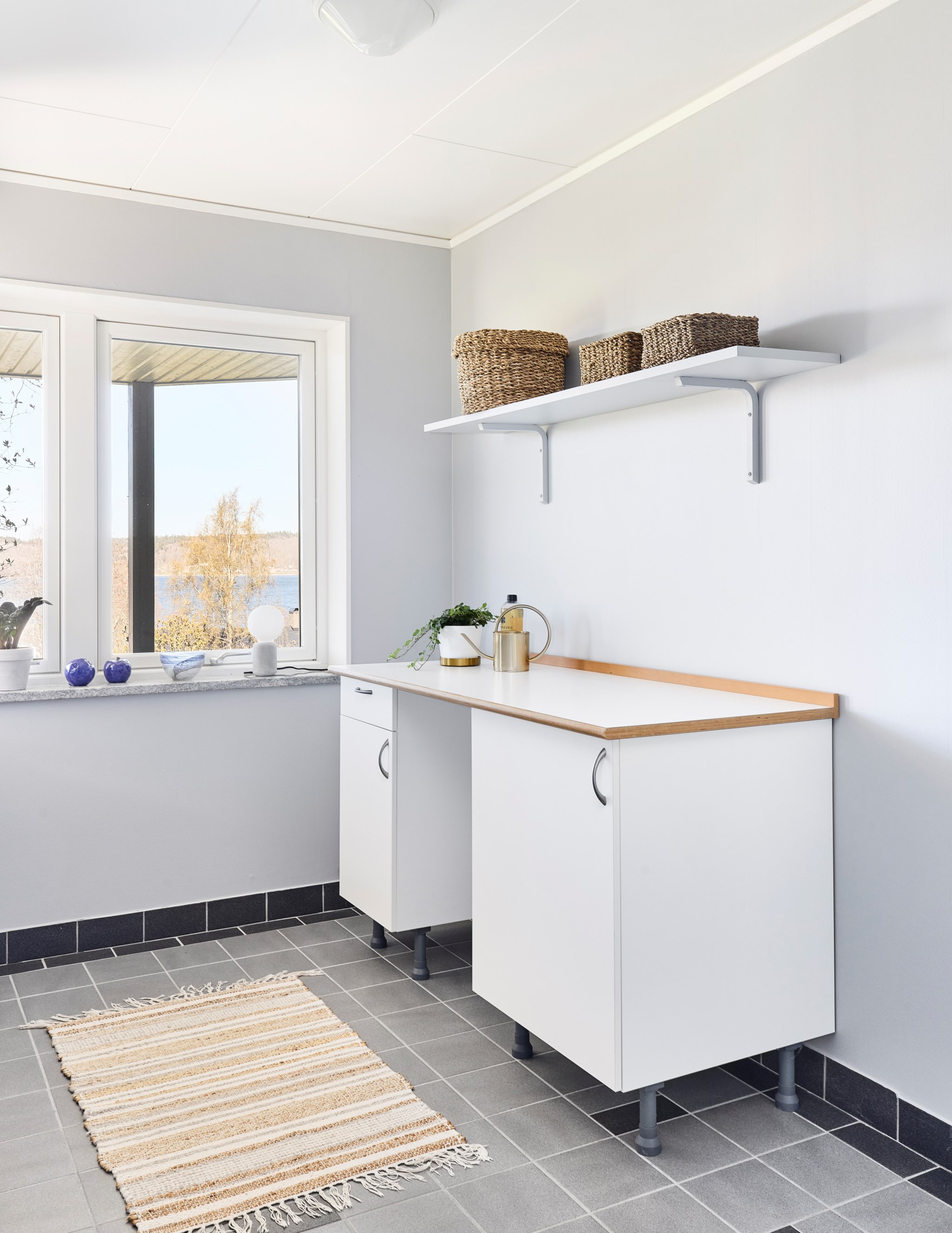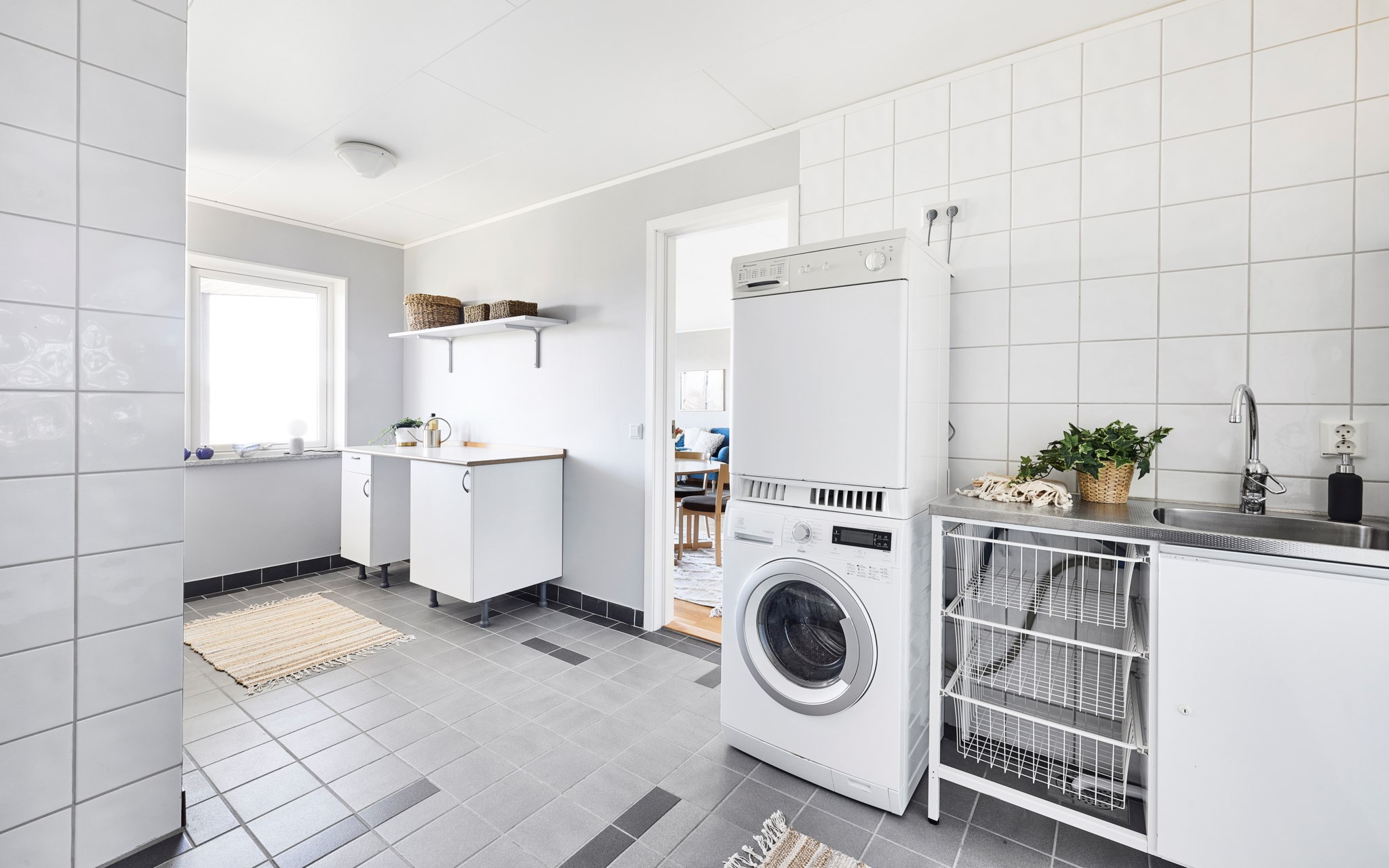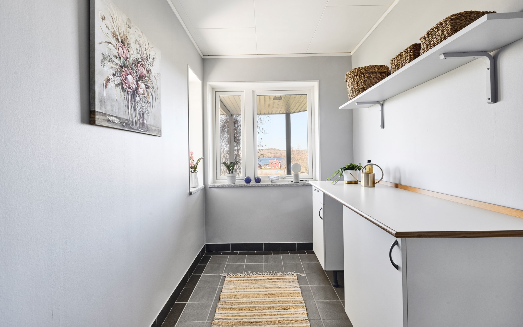 Nuvarande ägare har bott i huset sedan det byggdes 2003 och har således varit med och planerat allt, från golv till tak. En tvättstuga långt in i källarvalven var alltså helt otänkbart. Ljust och stort skulle det vara, och så blev det också med dubbla fönster mot uteplatsen under balkongen. Här står du och stryker och viker tvätten med utsikt ut över Landsjön – en svårslagen lyx kan man tänka. Lägg till fem torklinor i taket så förstår du att ägarna även har tänkt på effektivitet och logistik. Golvvärmen gör att tvätten torkar snabbt. Tvättstugan hade också kunnat bli ett ytterligare sovrum.