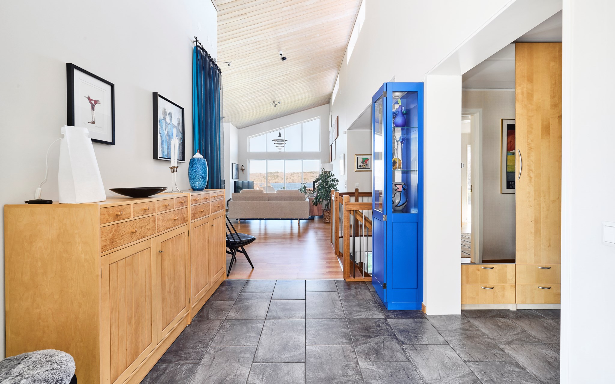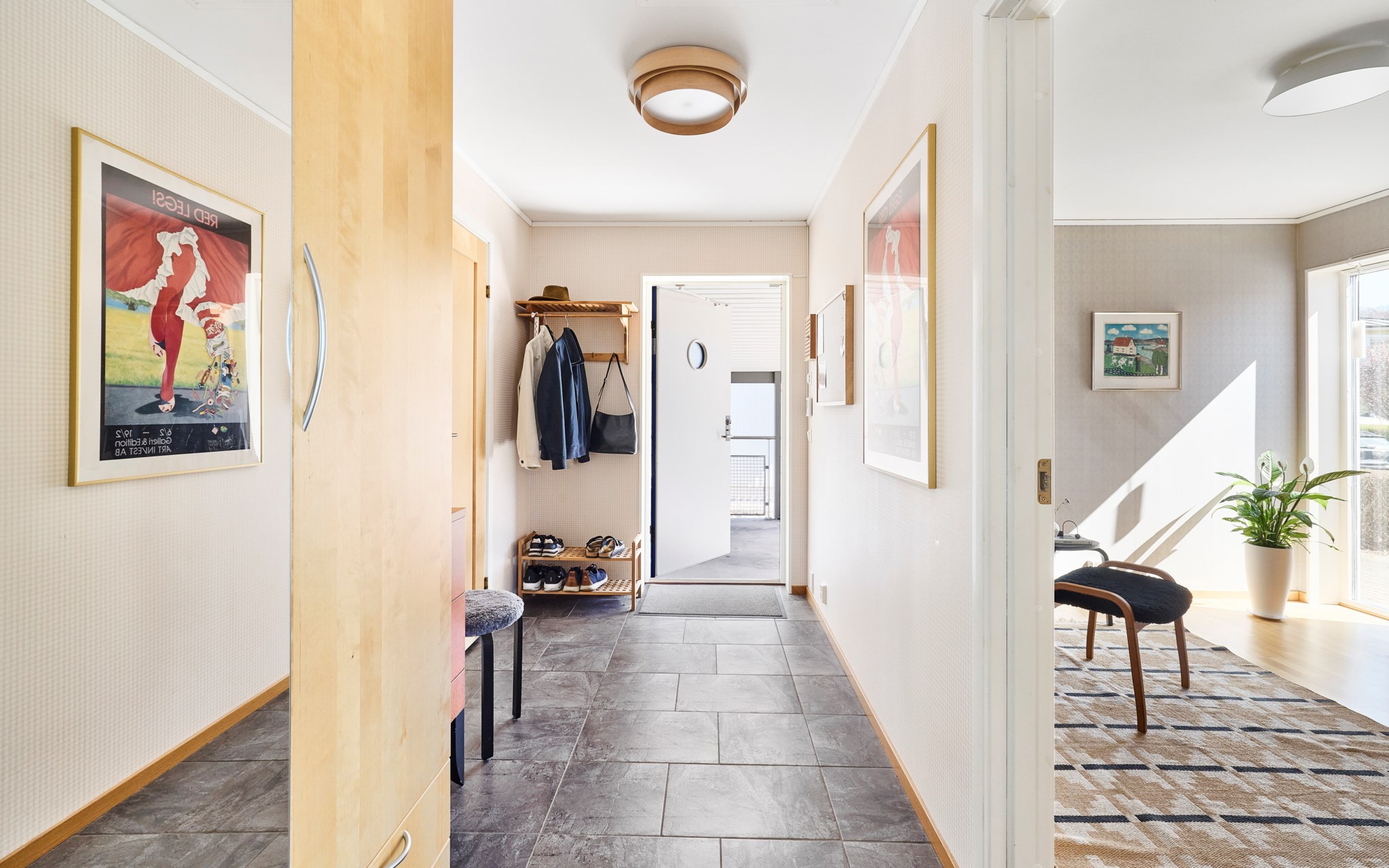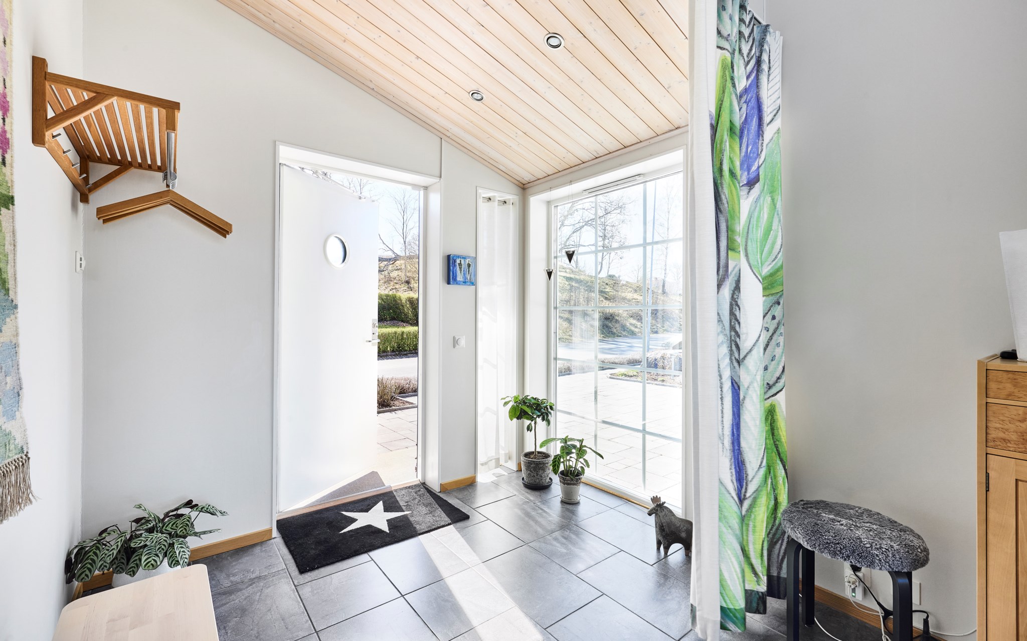 Klinker en lång bit in i hallen som är som ett litet hus i sig med eget snedtak inne och ute. Fint helfönster på sidan som släpper in mycket ljus men som inte drar blickarna till sig från gatan. Elburen golvvärme under klinkern och vattenburen golvvärme genomgående i övriga huset. Fin siktlinje direkt så att du blir varse ljuset, rumsvolymen och utsikten redan när du stiger in i hallen. Till höger hittar du groventrén och ett sovrum som i dagsläget används som hemmakontor. Klädkammaren inom räckhåll om det börjar bli för många jackor på hängaren i hallen.