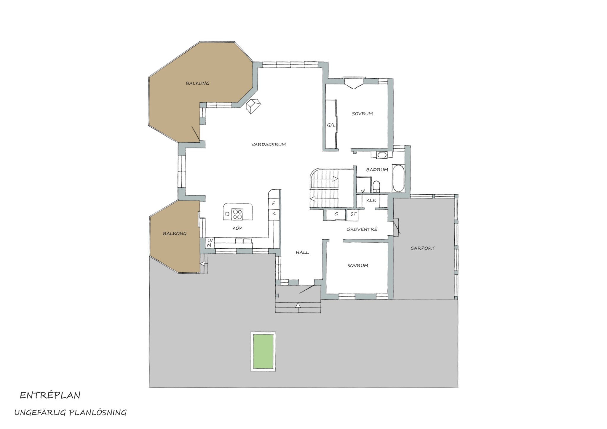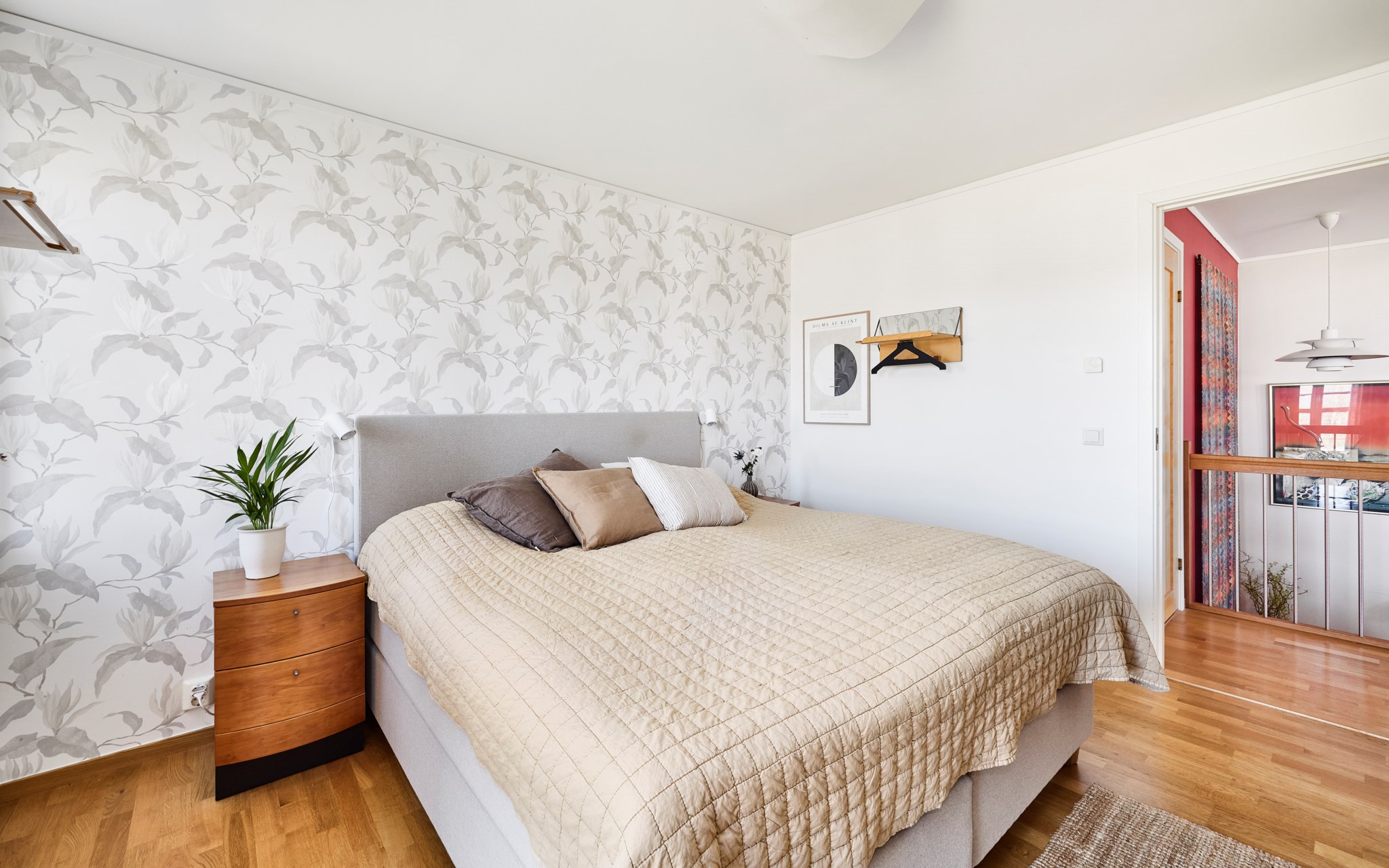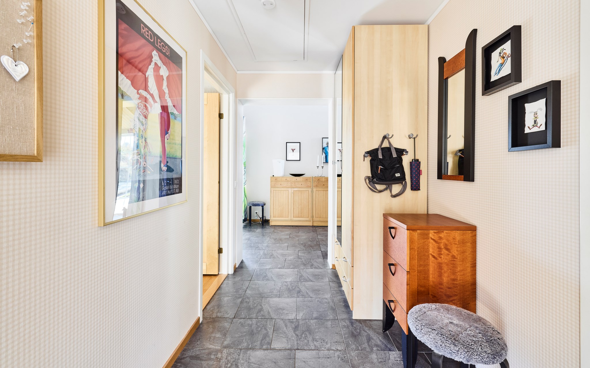 Klinker en lång bit in i hallen som är som ett litet hus i sig med eget snedtak inne och ute. Fint helfönster på sidan som släpper in mycket ljus men som inte drar blickarna till sig från gatan. Elburen golvvärme under klinkern och vattenburen golvvärme genomgående i övriga huset. Fin siktlinje direkt så att du blir varse ljuset, rumsvolymen och utsikten redan när du stiger in i hallen. Till höger hittar du groventrén och ett sovrum som i dagsläget används som hemmakontor. Klädkammaren inom räckhåll om det börjar bli för många jackor på hängaren i hallen.