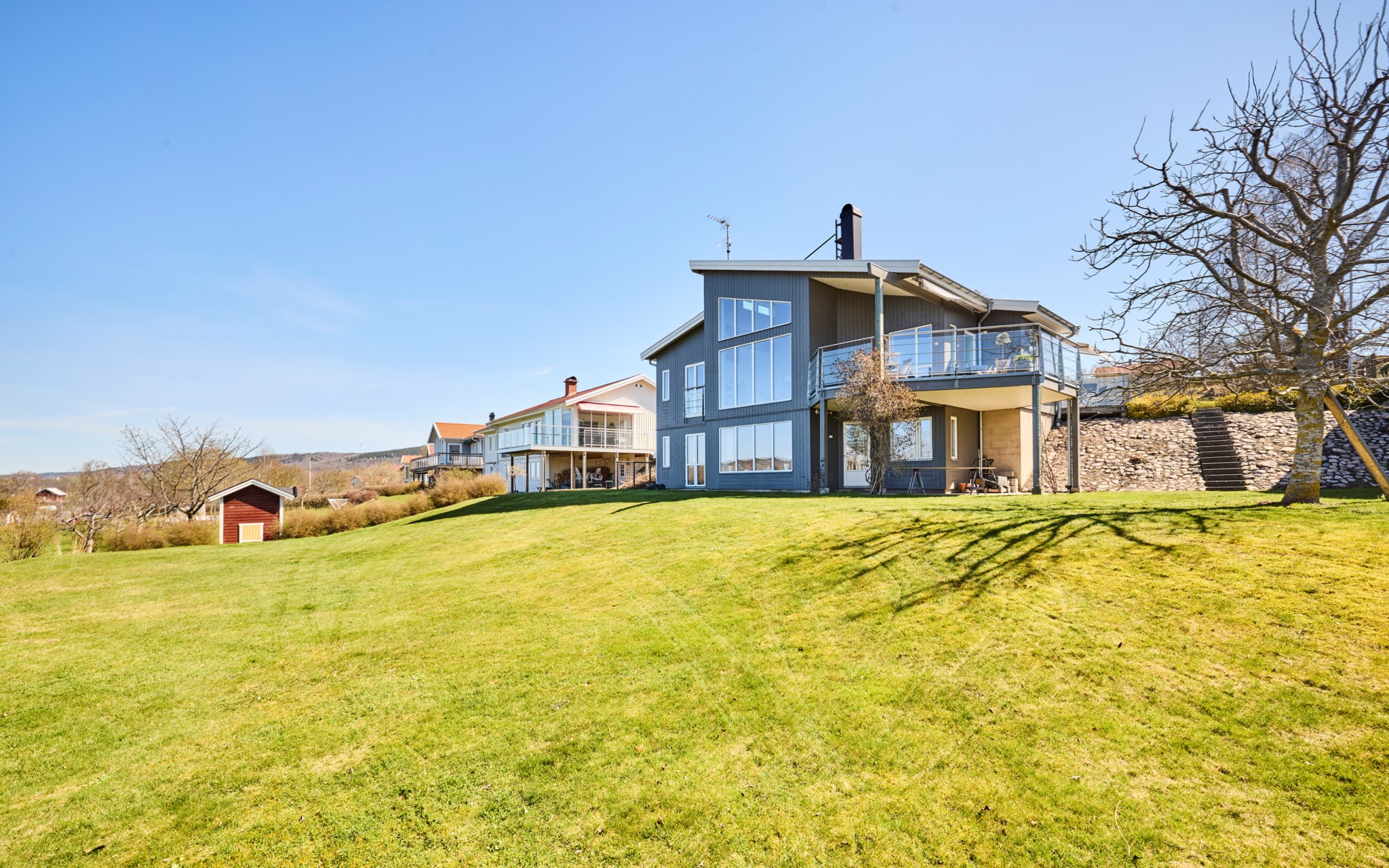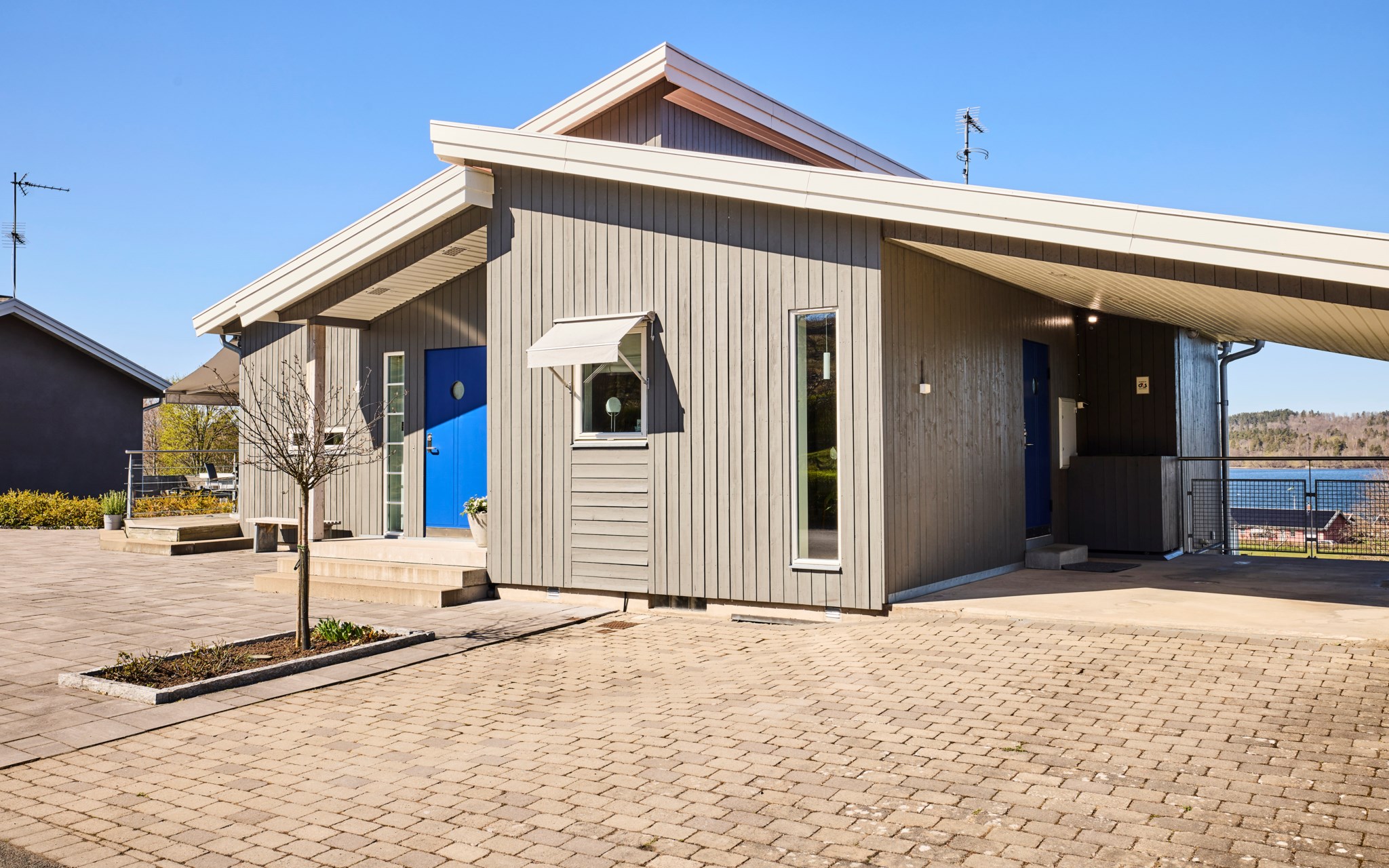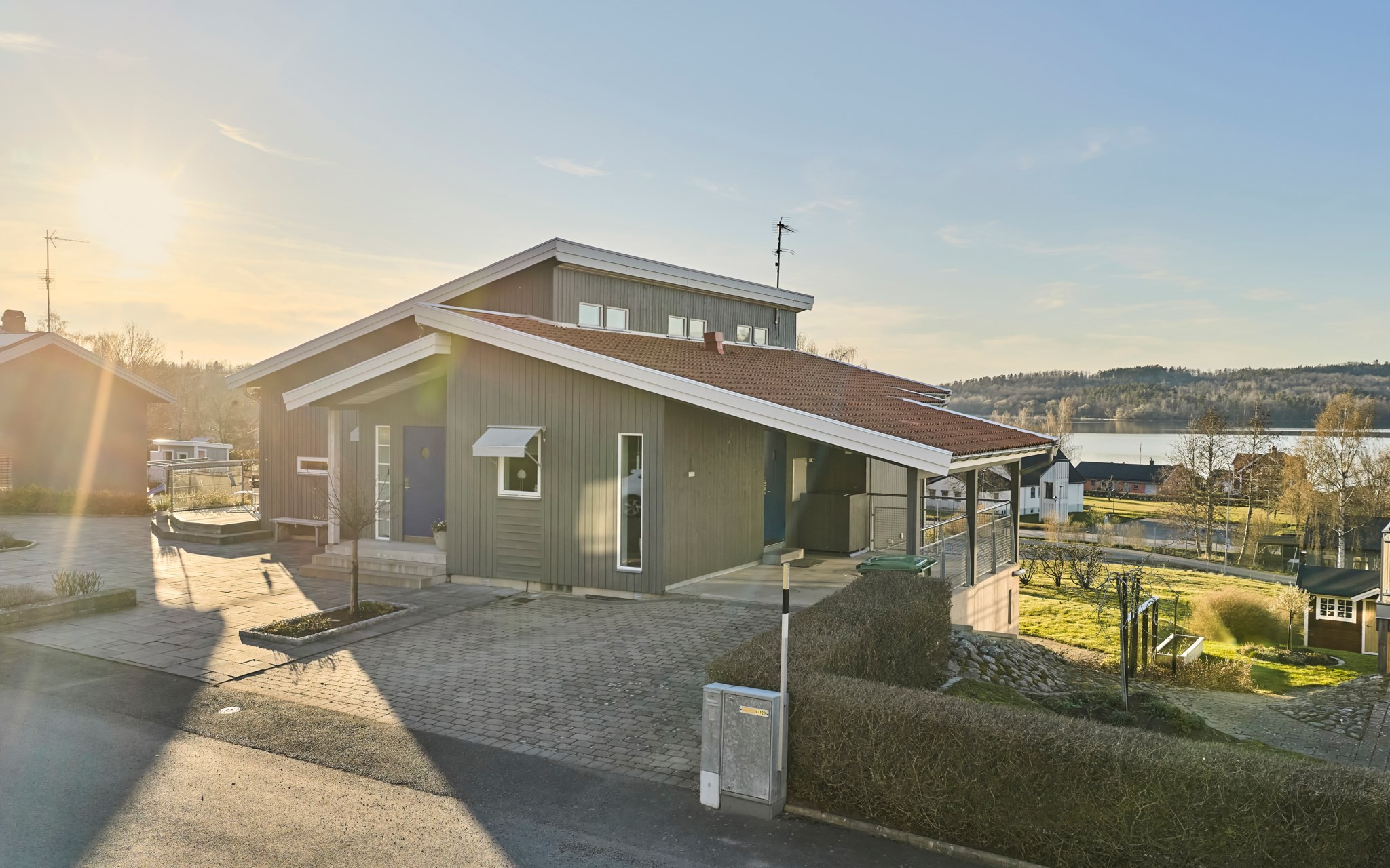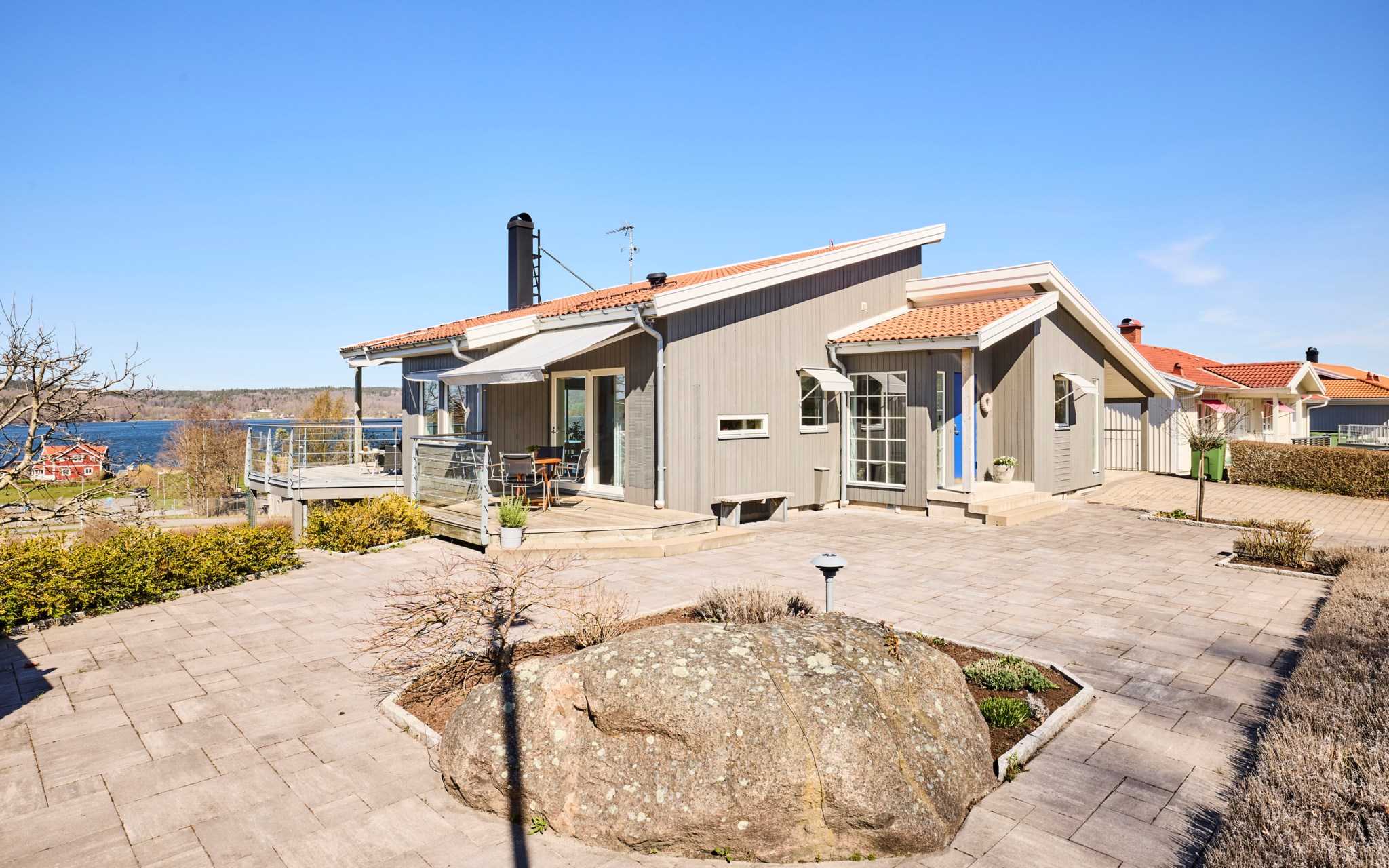 Framsidan bjuder på stora plattsatta ytor eftersom huset ligger med integritet långt indraget på tomten. Lavendeln utmed gatan är lika ymnig som i Italien. Även huset med integritet som du ser, eftersom de stora glaspartierna och fönstren vetter mot nedsidan. Där hittar du också de lite grönare ytorna. Något hus direkt nedanför finns inte, utan det är kommunal mark efter syrénhäcken som aldrig kommer att bebyggas. Nuvarande ägare brukar klippa gräset även där och har servitut på marken för sin jordvärmeanläggning. Det stora trädet på sydvästra gaveln, är ett egenplanterat valnötsträd. Ser du en skål med nötter framme på visningen är det fritt fram att smaka.
