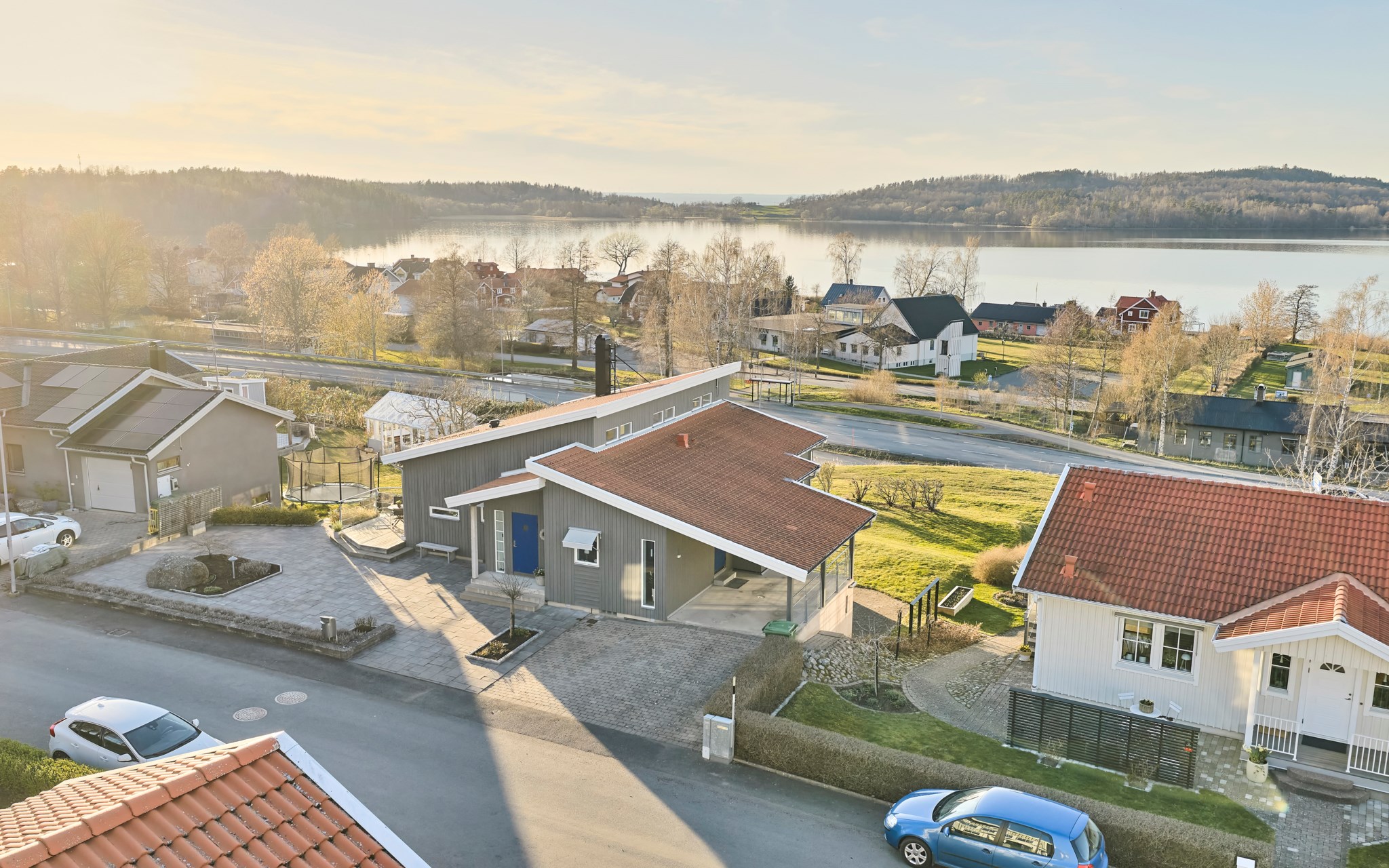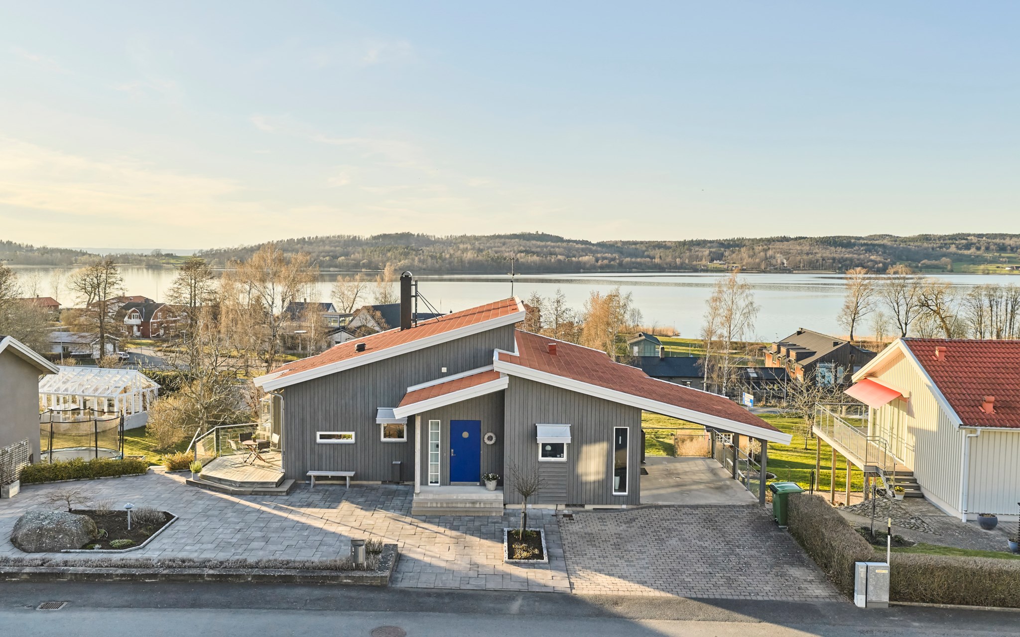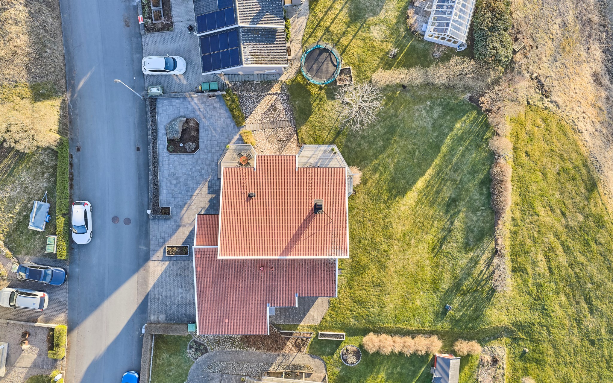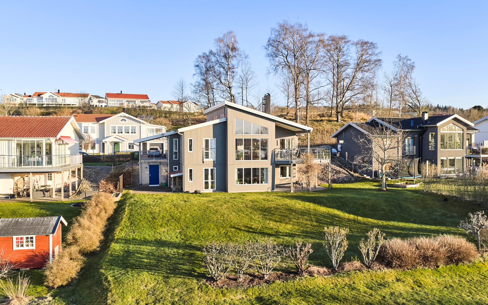 Framsidan bjuder på stora plattsatta ytor eftersom huset ligger med integritet långt indraget på tomten. Lavendeln utmed gatan är lika ymnig som i Italien. Även huset med integritet som du ser, eftersom de stora glaspartierna och fönstren vetter mot nedsidan. Där hittar du också de lite grönare ytorna. Något hus direkt nedanför finns inte, utan det är kommunal mark efter syrénhäcken som aldrig kommer att bebyggas. Nuvarande ägare brukar klippa gräset även där och har servitut på marken för sin jordvärmeanläggning. Det stora trädet på sydvästra gaveln, är ett egenplanterat valnötsträd. Ser du en skål med nötter framme på visningen är det fritt fram att smaka.