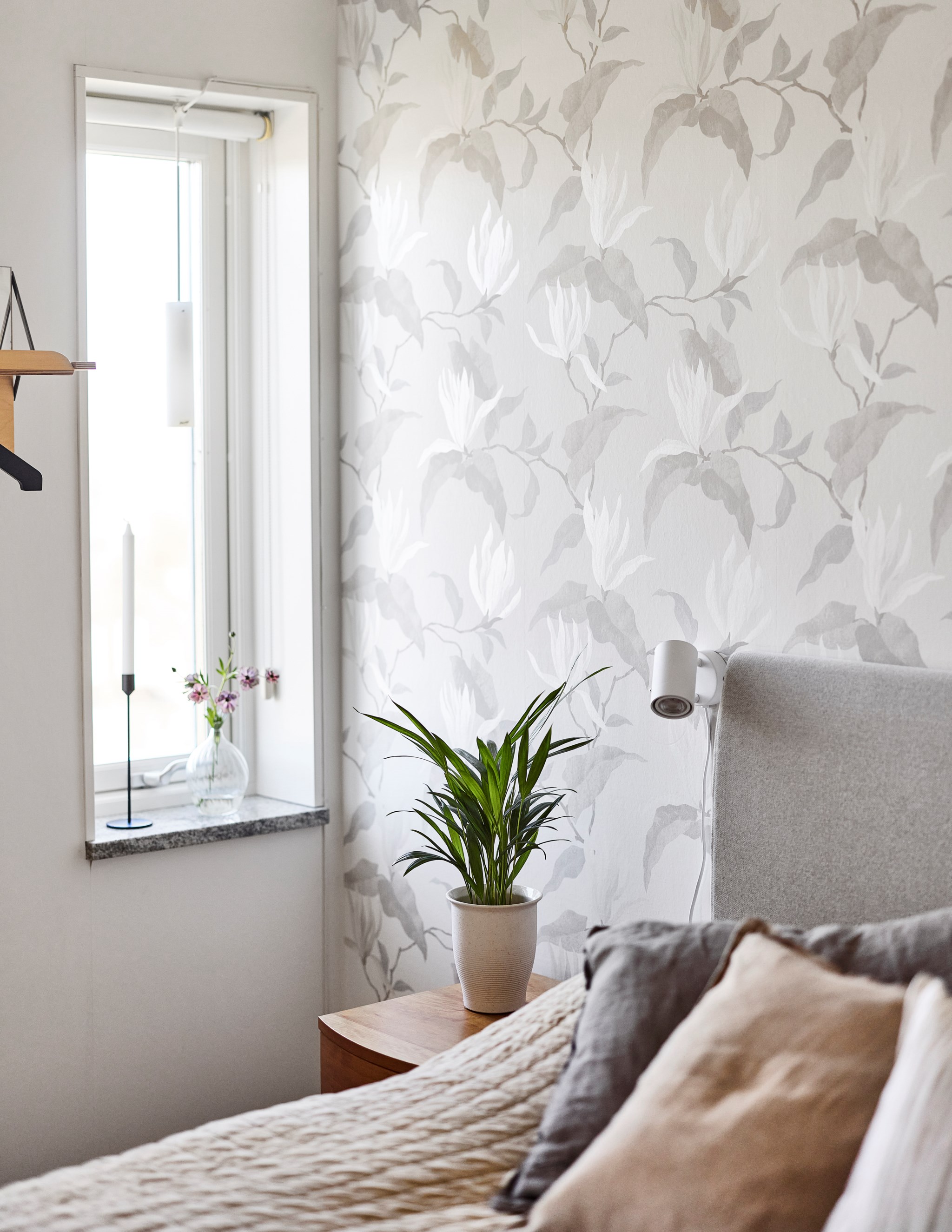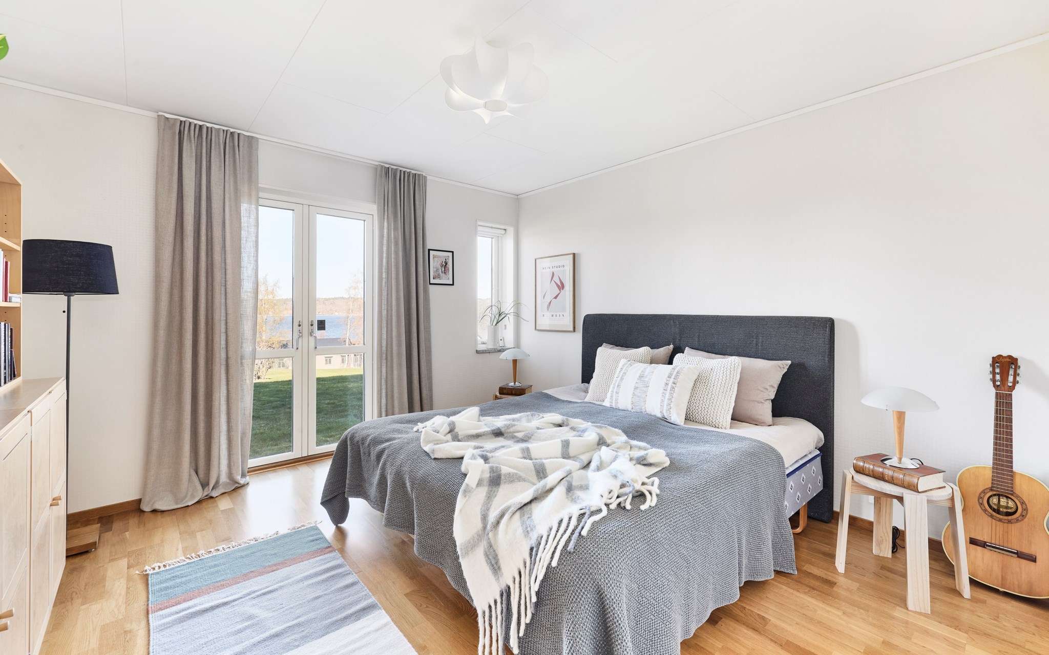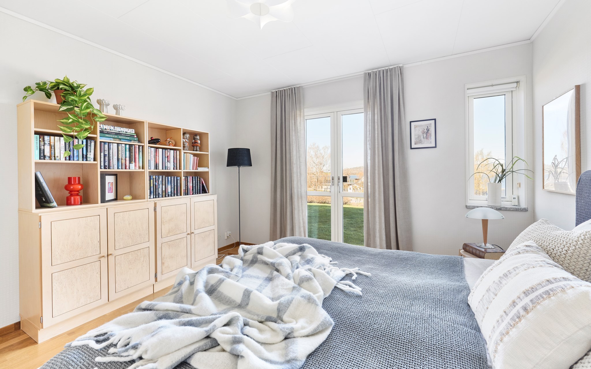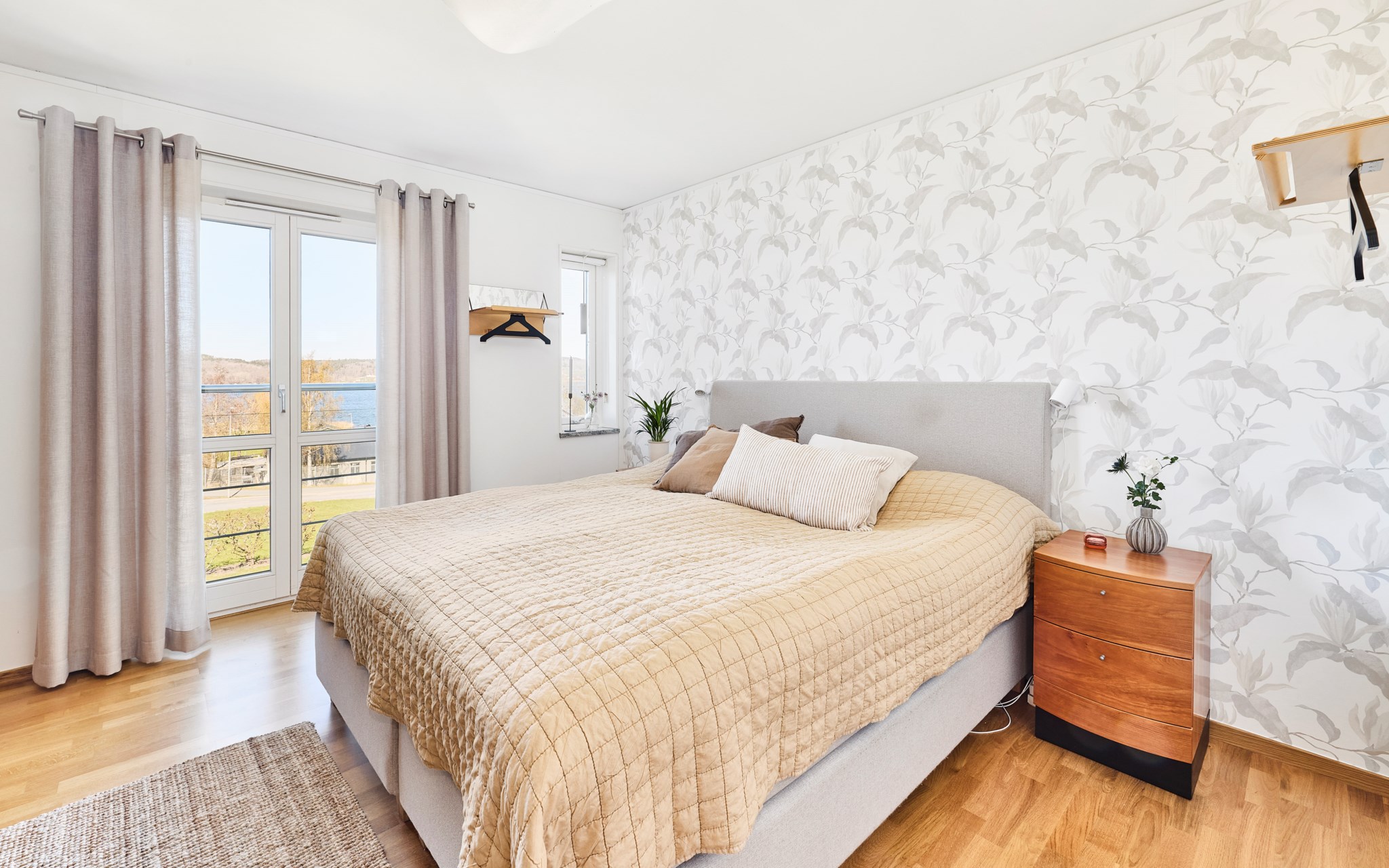 På entréplanet hittar du två sovrum, ett litet och ett stort. Alltså har huset två likvärdiga sängkammare som ligger ovanpå varandra, med samma fina fönstersättning i båda. Uppe har du bred pardörr till en fransk balkong – alltså med räcket direkt inpå fasaden, därnere en lika bred och luftig passage ut i trädgården. De lite mindre fönstren är också öppningsbara precis intill dörrarna om du vill sova svalt. Utsikten även i markplanet imponerar. Om du vill ha ytterligare sovrum så skulle allrummet nere gå att dela av vid behov. Även tvättstugan har potential som sovrum, men kräver större förändring i huset. Ljusa kalkstensbänkar i alla fönster.