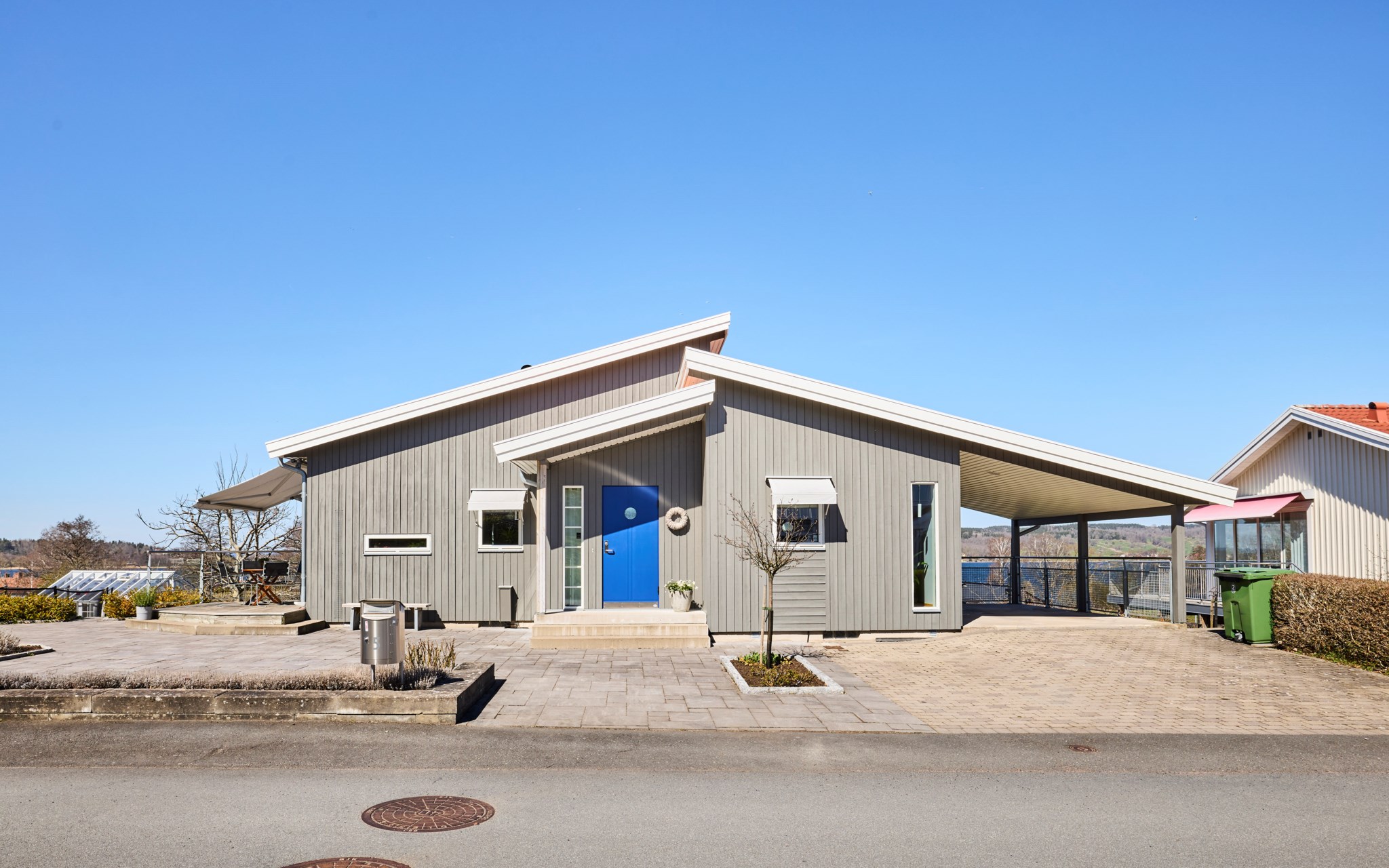 Taket fortsätter ut på norrsidan av huset och landar på tre fristående stöttor och skapar ett perfekt skydd för bilen, även om den inte står inne. Det ska mycket till innan det blåser in snö så det stör. Frosten håller sig alltid borta från rutorna bara med minsta tak. Smidigt att parkera och slinka in i huset med matkassar och barnstolar genom sidodörren till hallen, den dörren är också kornblå. Om du kollar planlösningen så inser du att källarens groventré ligger under carporten som ett kallförråd.