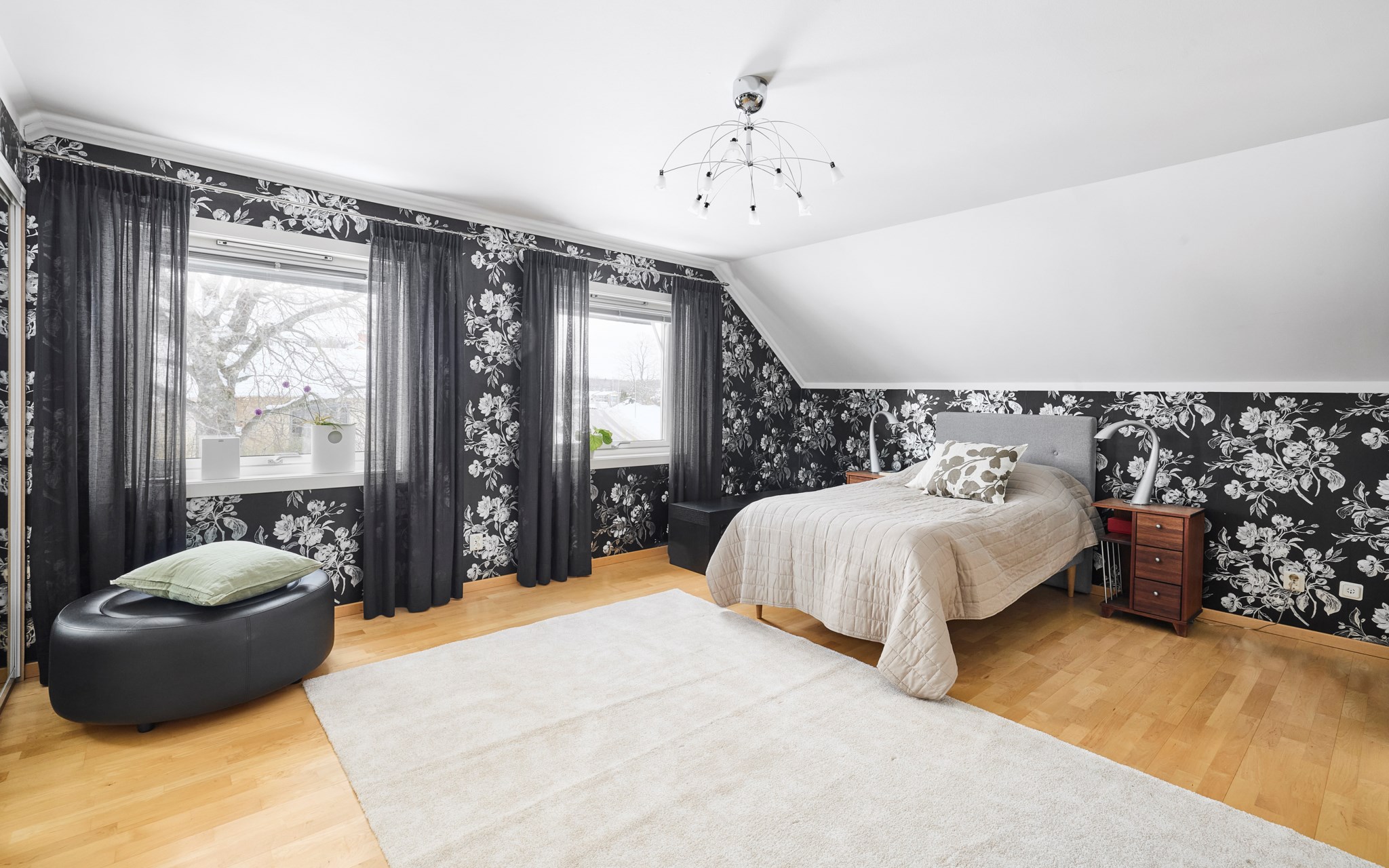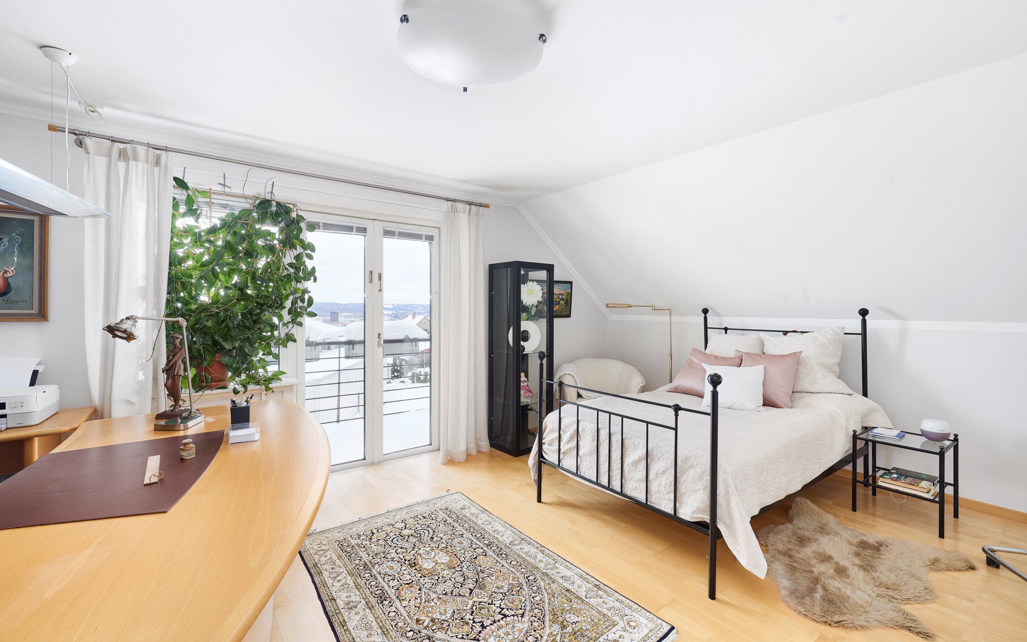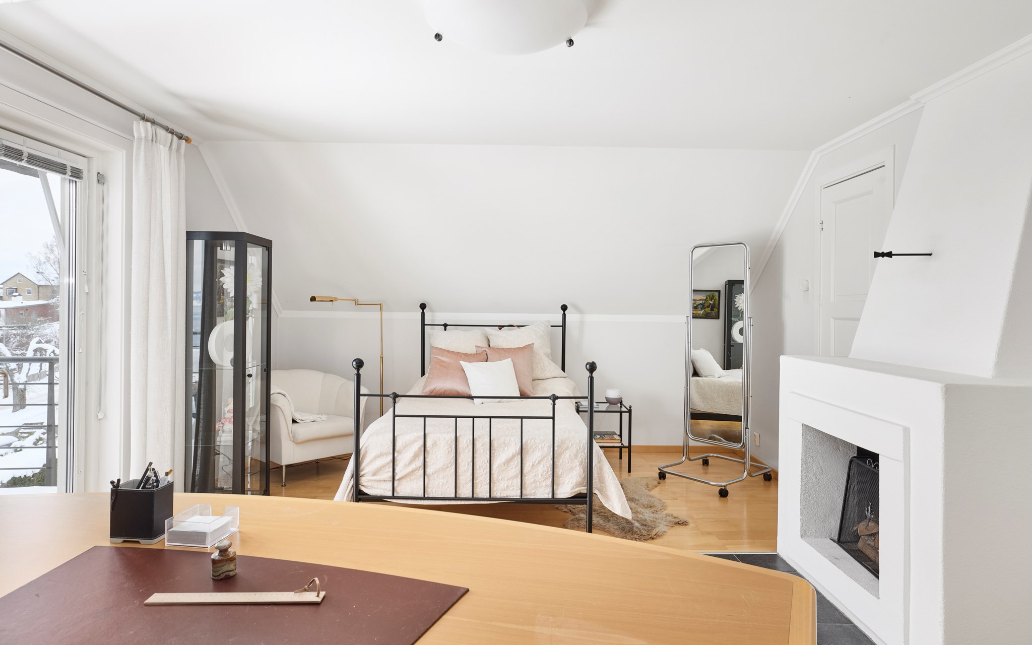 Som huset är disponerat finns det två stora sovrum en trappa upp, ett i vardera gavel av huset och med fint snedtak i båda som ramar in drömsömnen. Det ena skulle lätt gå att dela av i två barnrum mellan fönstren. Storslagen utsikt över Vättern och centrala Jönköping från det med fönster och balkong åt det hållet. Behöver du ytterligare sovplatser, finns två stora rum i suterrängplanet som också skulle kunna konvertera till gäst- eller sovrum, en idé som tonåringar lätt och snabbt skulle kunna sympatisera med.