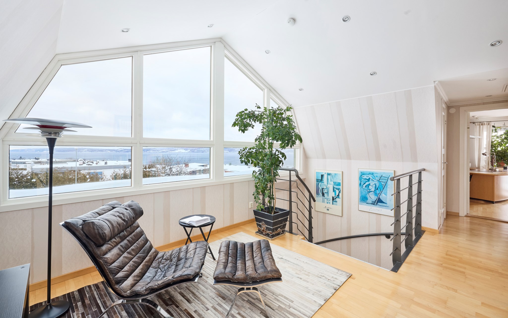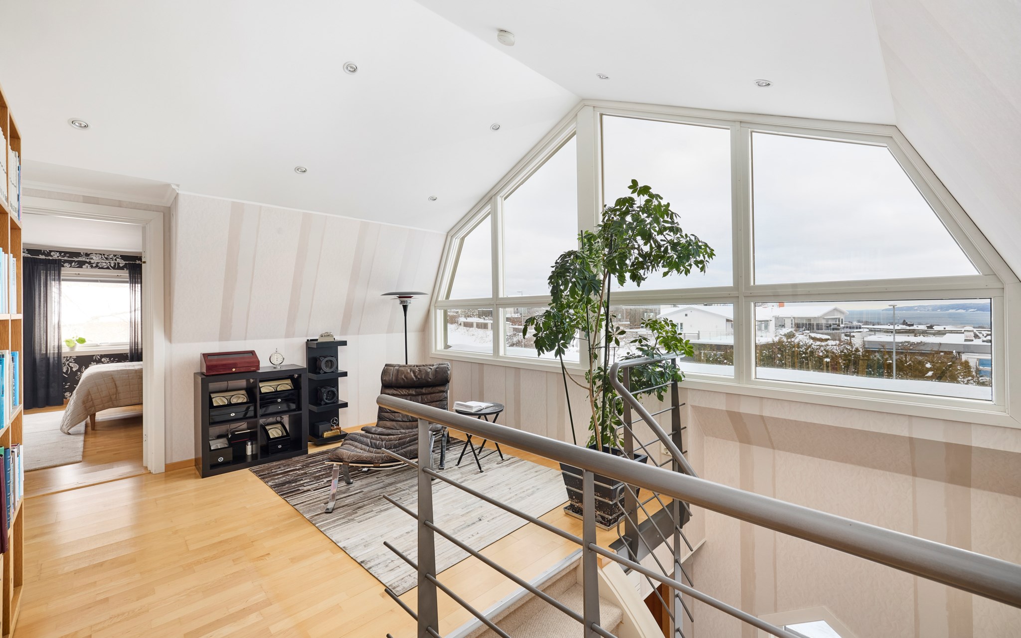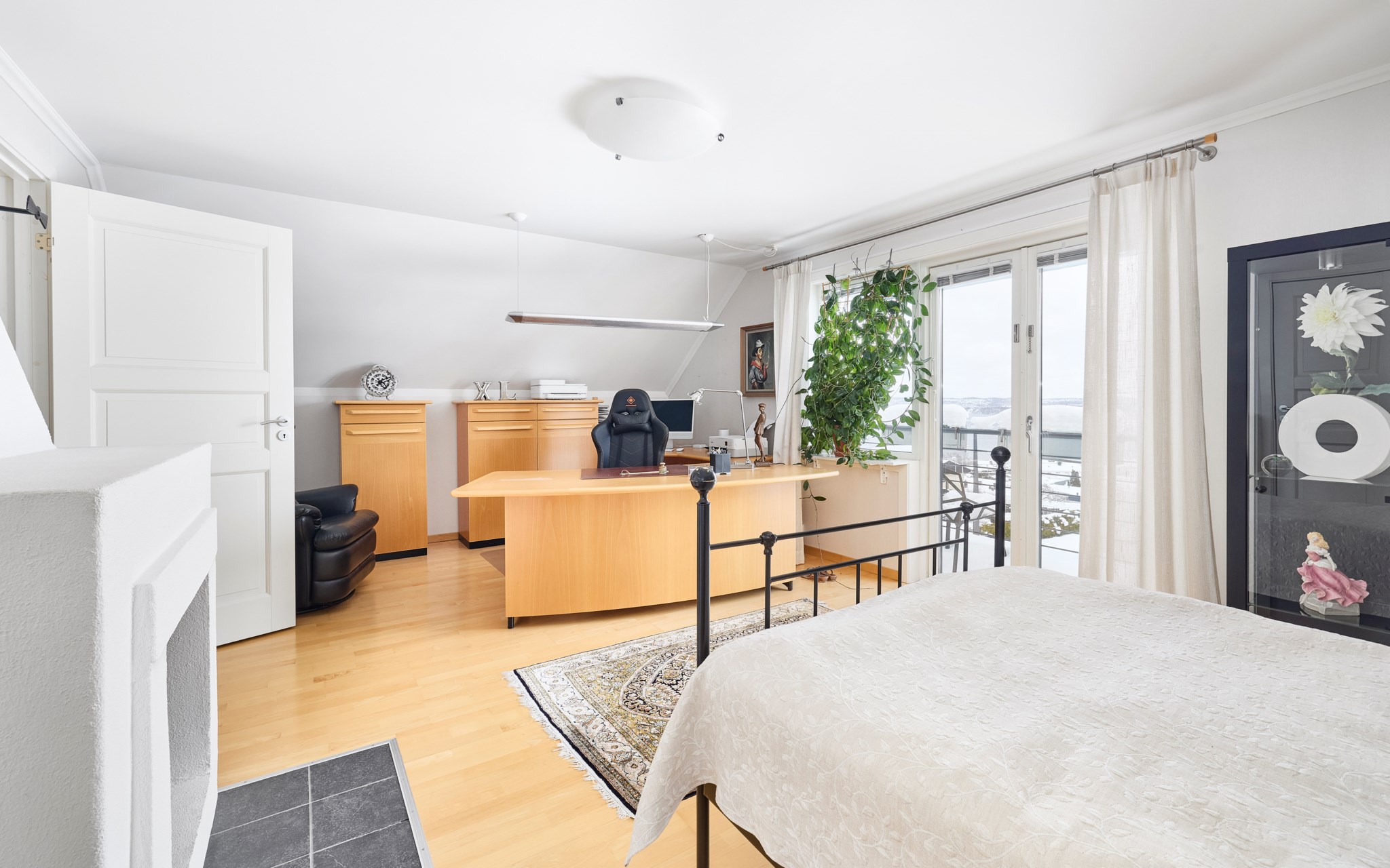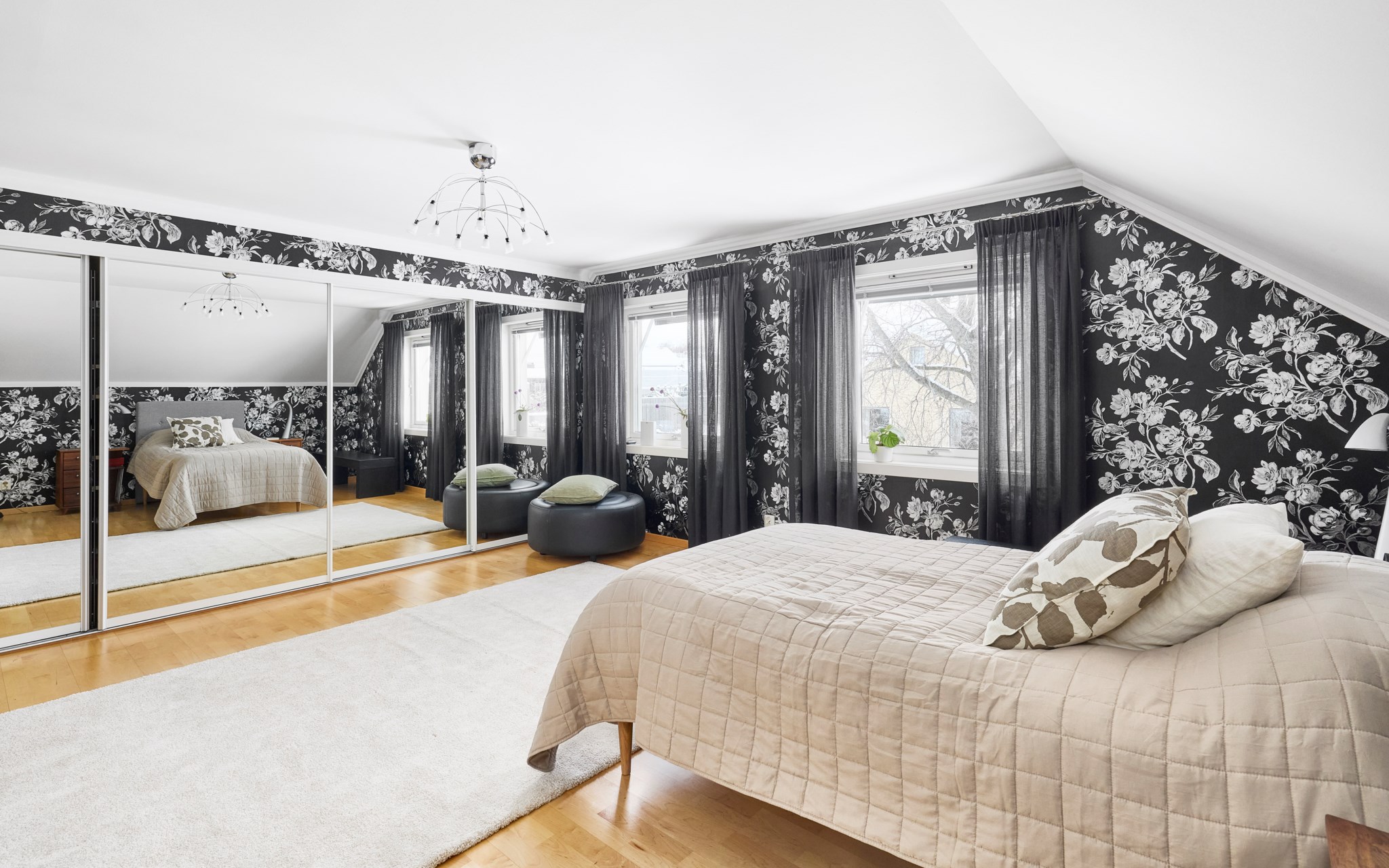 Som huset är disponerat finns det två stora sovrum en trappa upp, ett i vardera gavel av huset och med fint snedtak i båda som ramar in drömsömnen. Det ena skulle lätt gå att dela av i två barnrum mellan fönstren. Storslagen utsikt över Vättern och centrala Jönköping från det med fönster och balkong åt det hållet. Behöver du ytterligare sovplatser, finns två stora rum i suterrängplanet som också skulle kunna konvertera till gäst- eller sovrum, en idé som tonåringar lätt och snabbt skulle kunna sympatisera med.