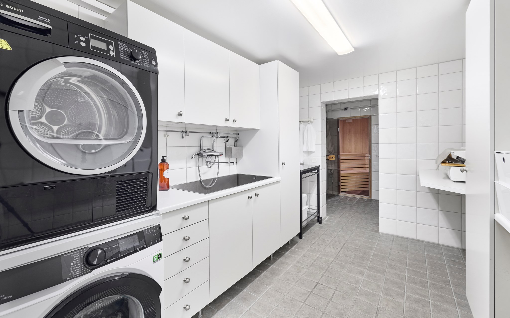 Det finns alltså två trappor ner i källaren, dels en nygjuten trappa från poolrummet och så den svängda originaltrappan som är gjuten i ett enda stort stycke, vilket indikerar att det är ett ovanligt välbyggt hus. I den övriga källaren hittar du, utöver redan nämnda dubbelgarage och de två stora rummen som skulle kunna fungera som sovrum, även en fullutrustad tvättstuga, matkällare och vinkällare. Men även ett teknikrum som sköter poolen och husets värme och ventilation.