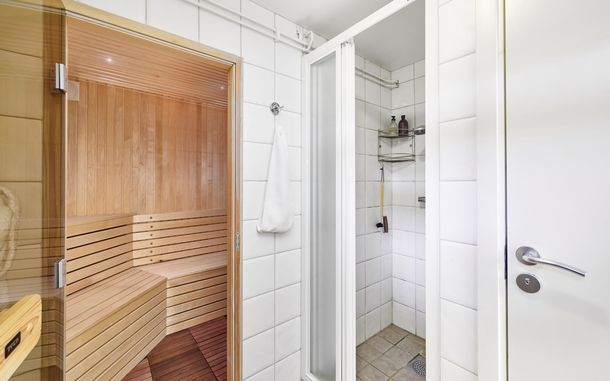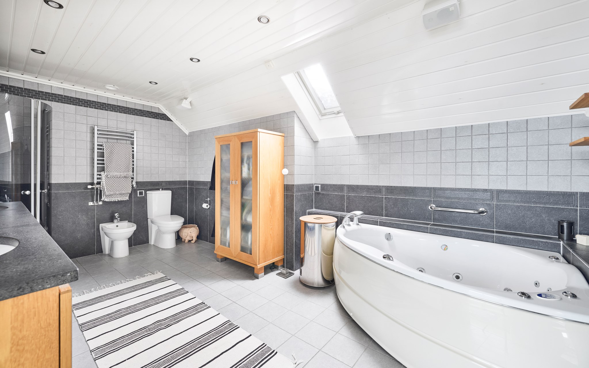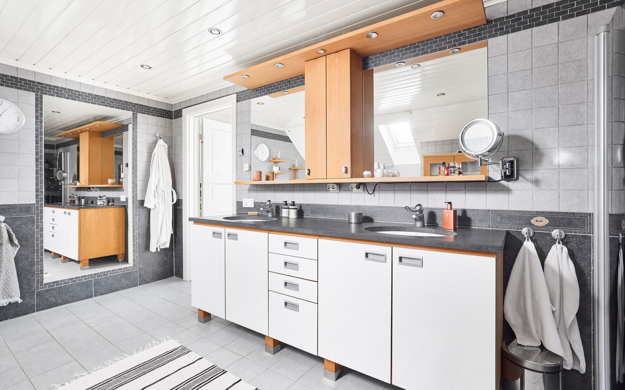 Gästtoaletten ligger i entréplanet vid hallen, och sen hittar du stora badrum både en trappa upp och en trappa ner. Badrummet nere – som har bastu, dusch och separat toalett – blir poolrummets bästa kompis med trappa ner direkt därifrån för att klä om, basta och duscha av sig efter en simtur i jetstrålen. Badrummet på övervåningen är lyxigt stort i takkupan. Både fritt badkar, dusch, bidé och dubbelt handfat. Och kommer du på något annat som borde få plats här uppe så är det nog inget problem.