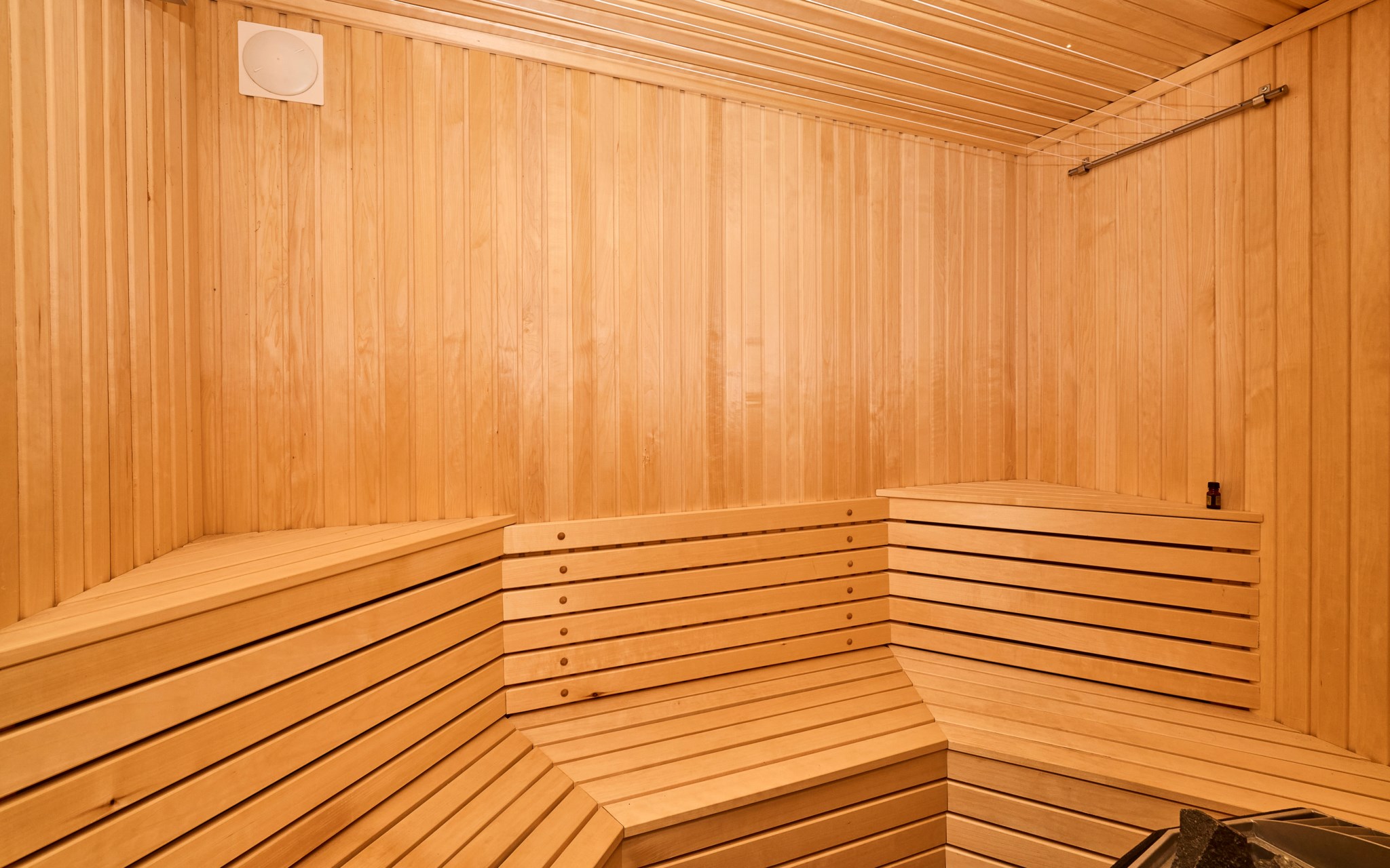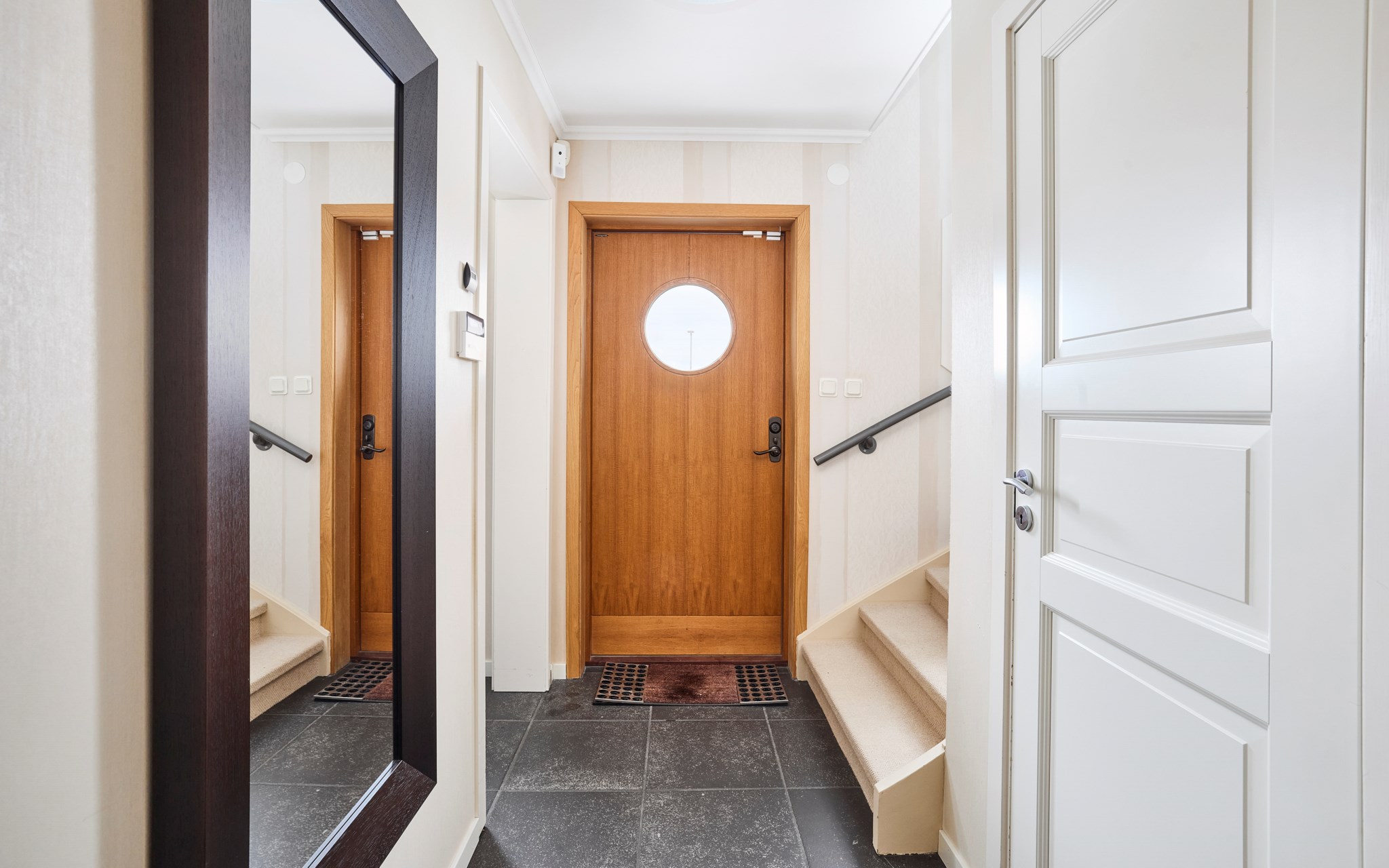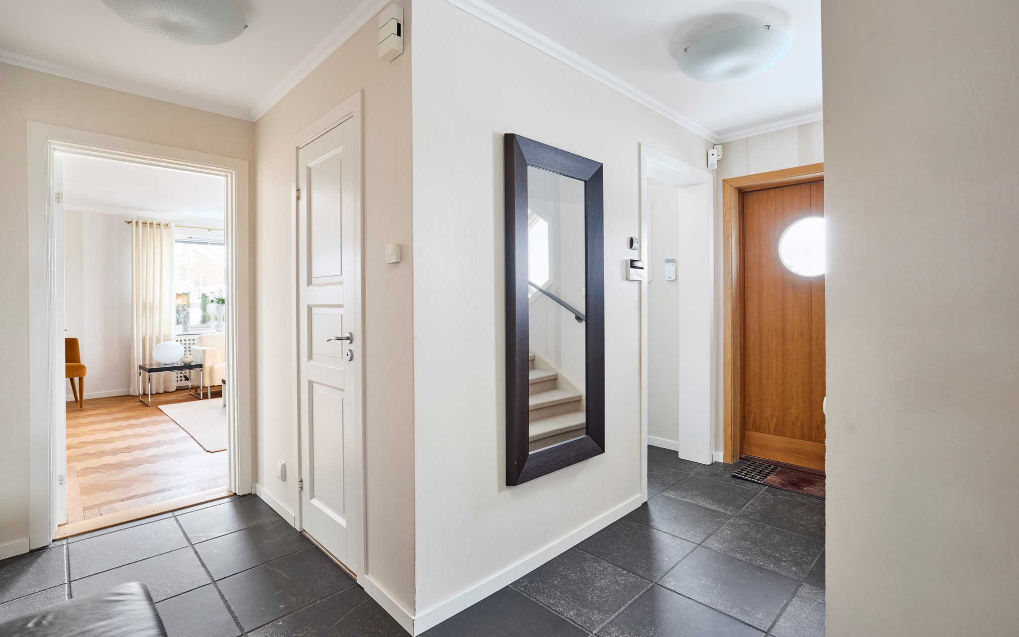Gästtoaletten ligger i entréplanet vid hallen, och sen hittar du stora badrum både en trappa upp och en trappa ner. Badrummet nere – som har bastu, dusch och separat toalett – blir poolrummets bästa kompis med trappa ner direkt därifrån för att klä om, basta och duscha av sig efter en simtur i jetstrålen. Badrummet på övervåningen är lyxigt stort i takkupan. Både fritt badkar, dusch, bidé och dubbelt handfat. Och kommer du på något annat som borde få plats här uppe så är det nog inget problem.