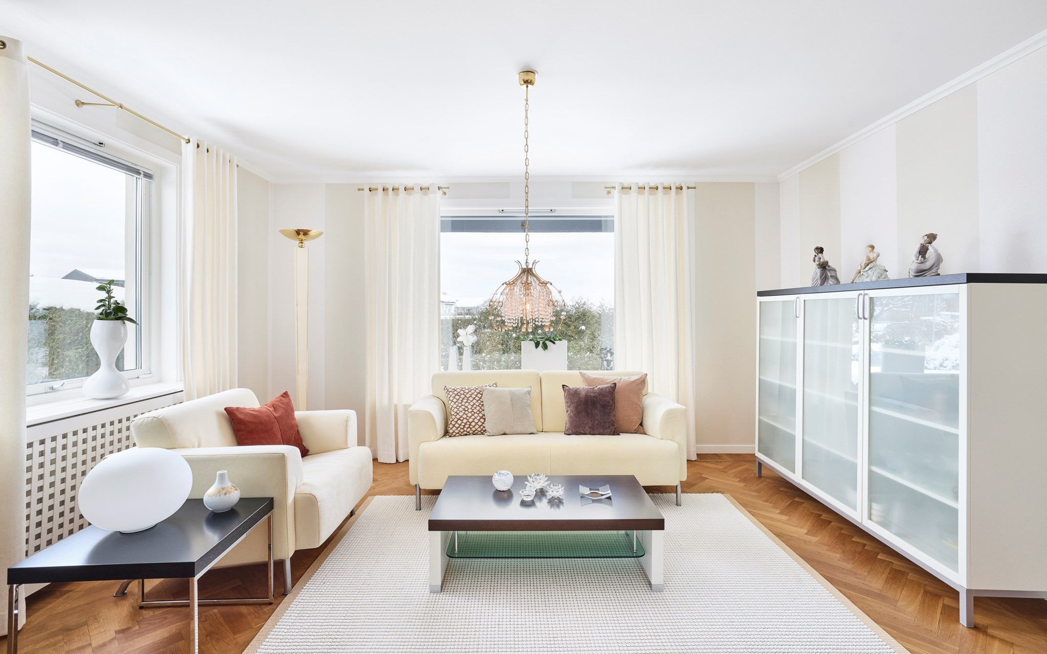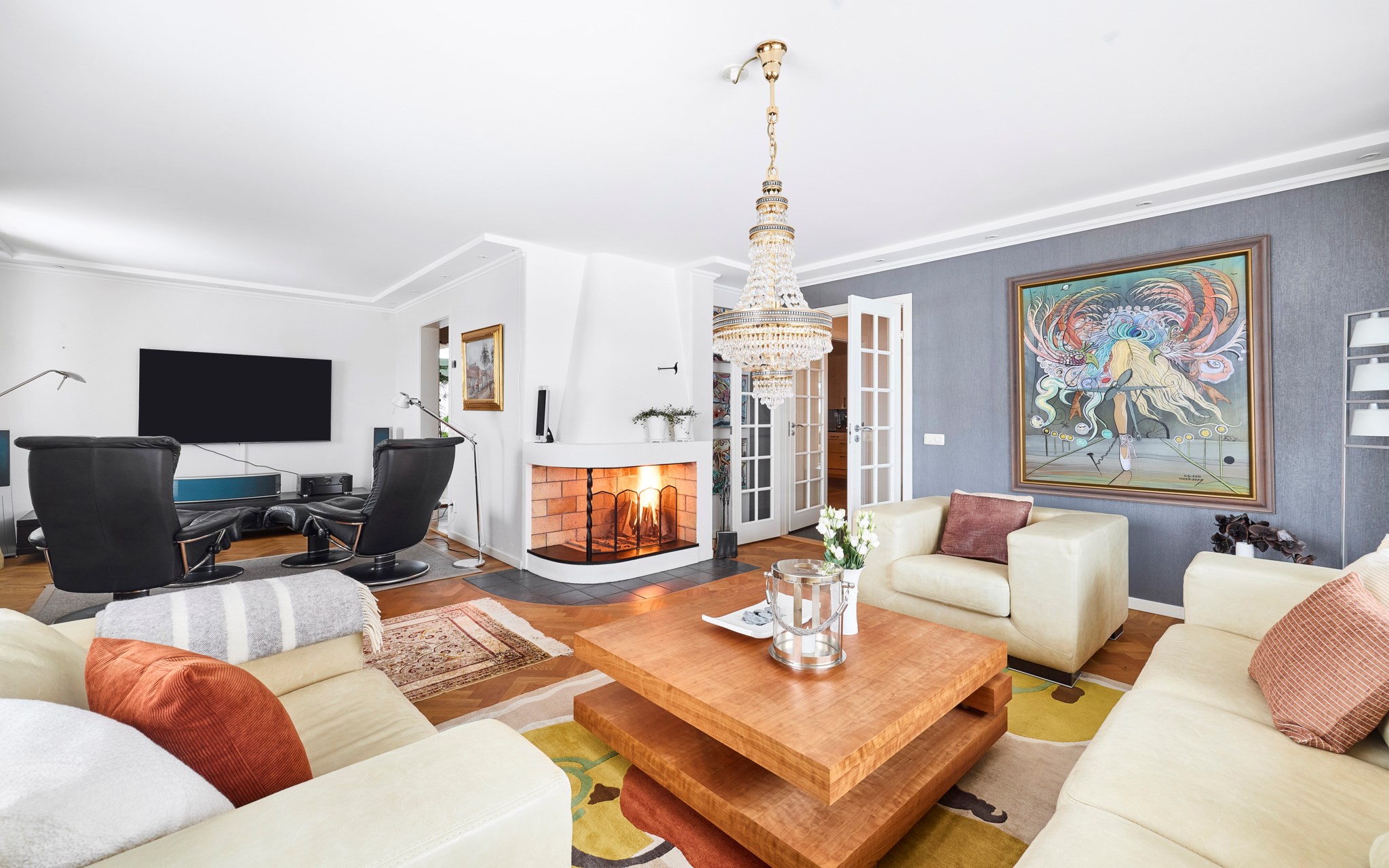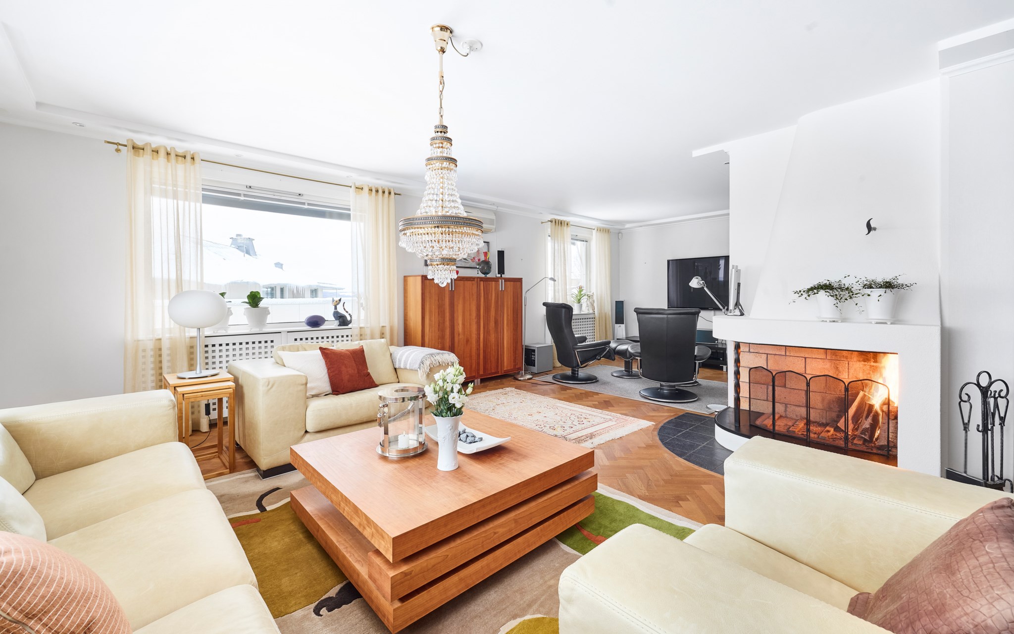 När du tar vänster in från hallen hamnar du i ursprungliga vardagsrummet som är delat i två delar kan man säga, med sällskapliga soffor i ena delen och tv-rum i den andra. Öppna spisen snyggt murad och med fin orörd 50-talsform från när huset byggdes. Det känns onödigt att äventyra den formen med en kamin-insats. Parketten magisk och bevarades tack och lov när huset renoverades och fick golvvärme i hall, badrum och kök etcetera. Istället begåvades detta rum med fina elementgaller.