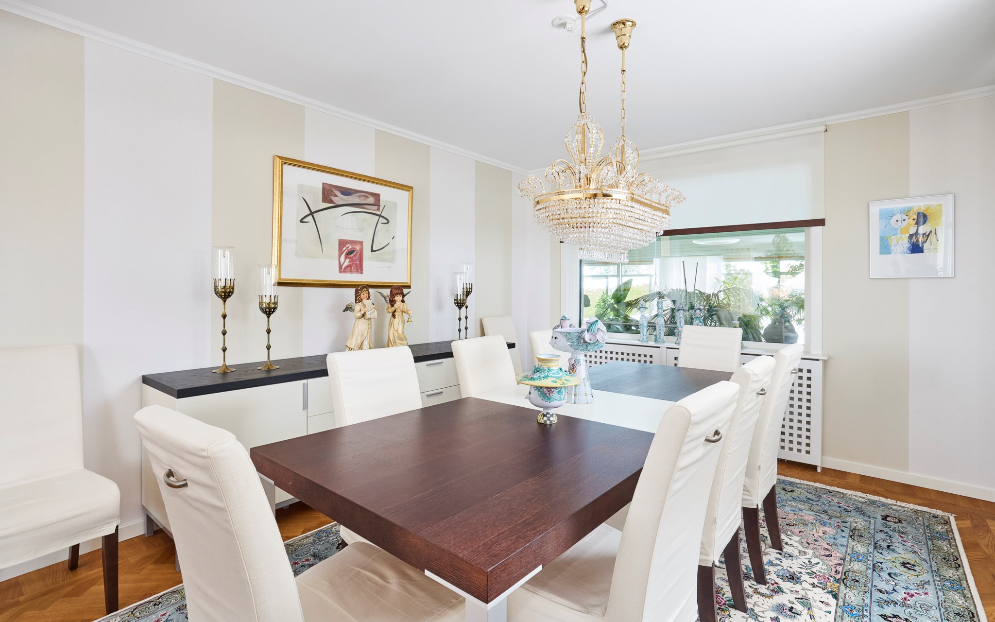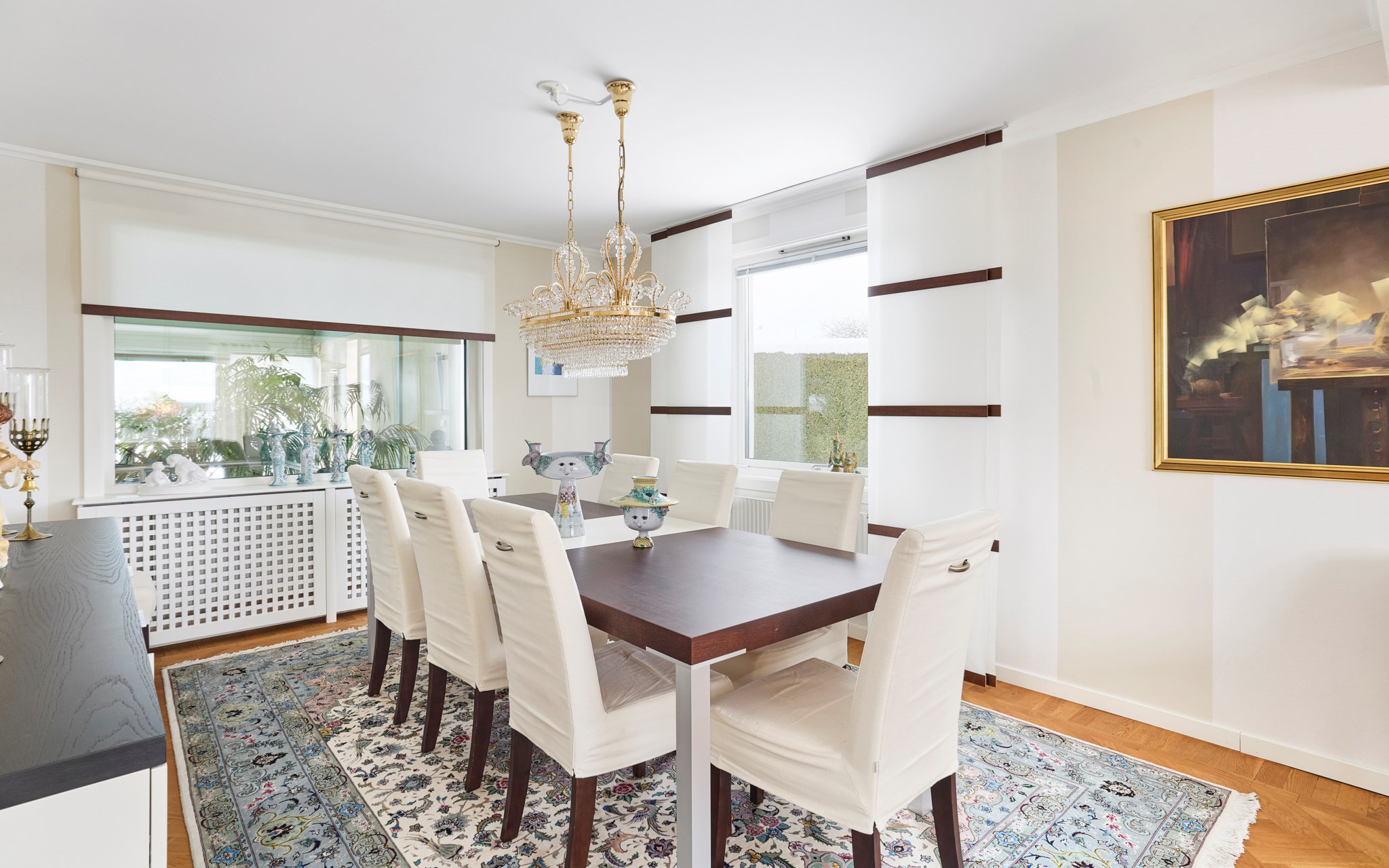 Husets fina fiskbensparkett är bevarad även här i matsalen som tar för sig i storlek och ljus precis som huset i övrigt. Från början var detta tydligen två sovrum på den ursprungliga planritningen. Utsikten norrut över Vättern högst påtaglig redan här på entréplanet alltså, och du behöver inte dra upp gästerna till stora fönsterkupan. Är det jämna år som firas så kan du nog ledigt duka för dubbla dussinet här inne, om du har finbestick till så många. Till vardags kan du möblera friare och vi rekommenderar att du låter golvet visa upp sig i så stora ytor det går. Fina elementgaller, eller hur?