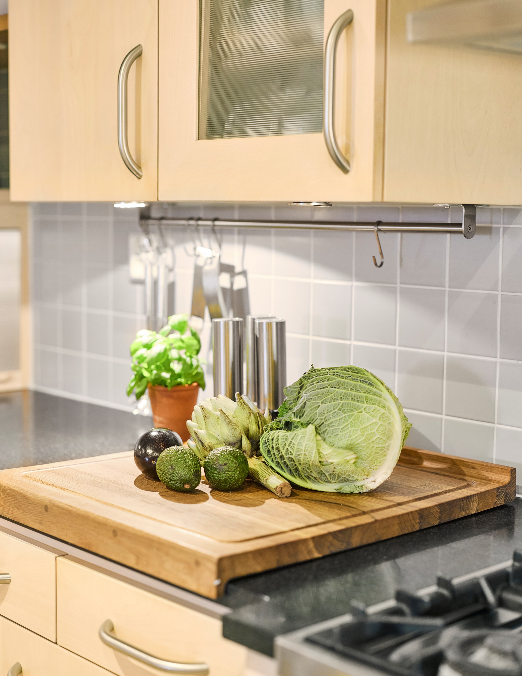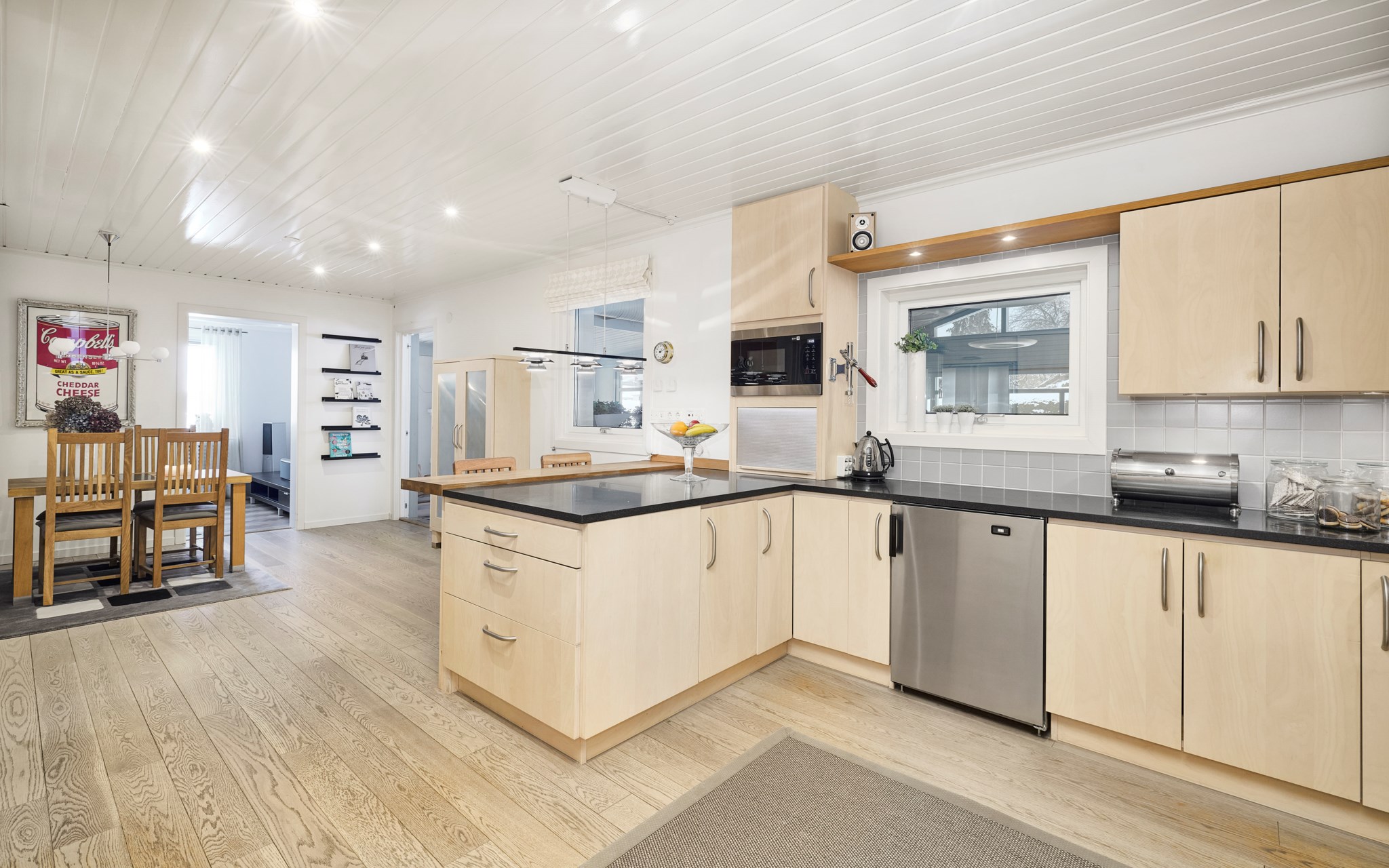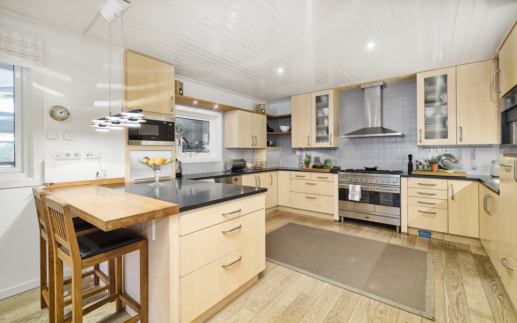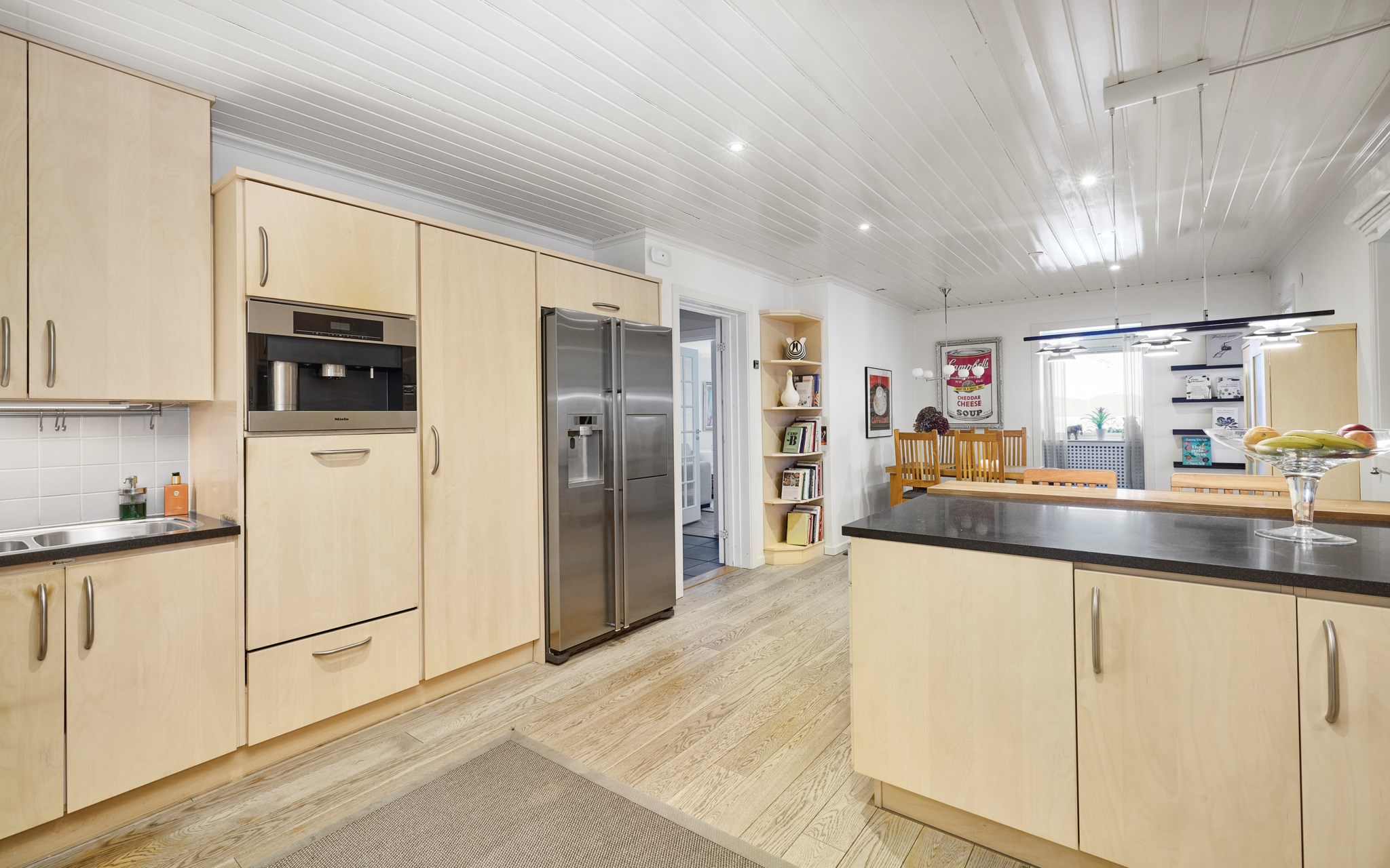Köket ståtar mitt i huset, vilket gör det smidigt att ta sig både hit och dit i resten av huset. Passage till hallen, vardagsrummet och ut i poolrummet där du kan sitta och äta året runt om du vill. Köket levererat och platsbyggt av Kvänum. Det innebär gedigen och solid känsla så fort du tar i luckor och lådor. De snyggt snickrade insatserna till lådorna ska inte glömmas bort, liksom de två jalusiskåpen över bänkskivan i granit. Du som är gas-spis-freak ser ju direkt att här kommer den från Ilva och har dubbla ugnar – en liten och stor – och sen grillplats mitt på. Den inbyggda espressomaskinen kommer från Miele. Vattenburen golvvärme i köket.