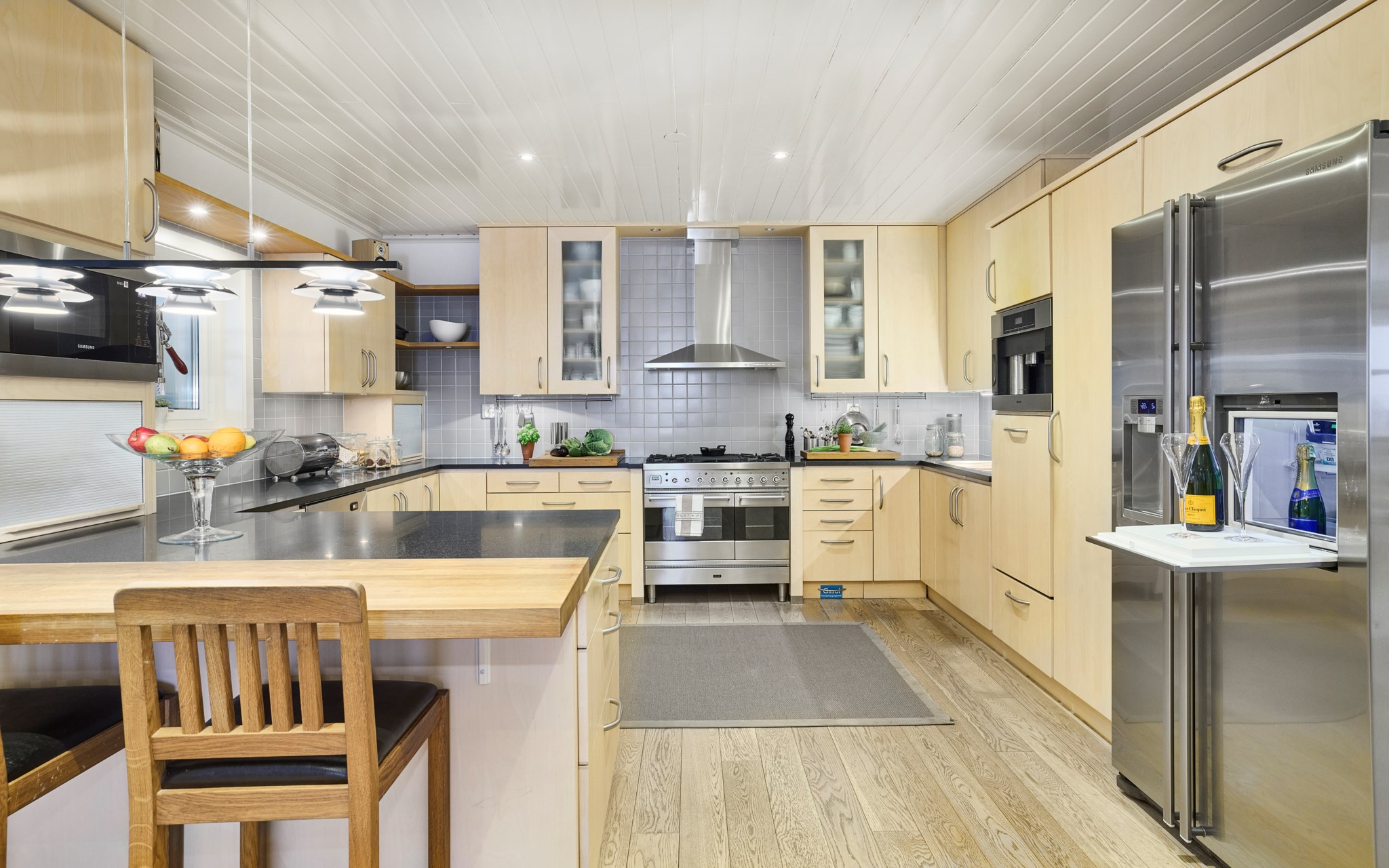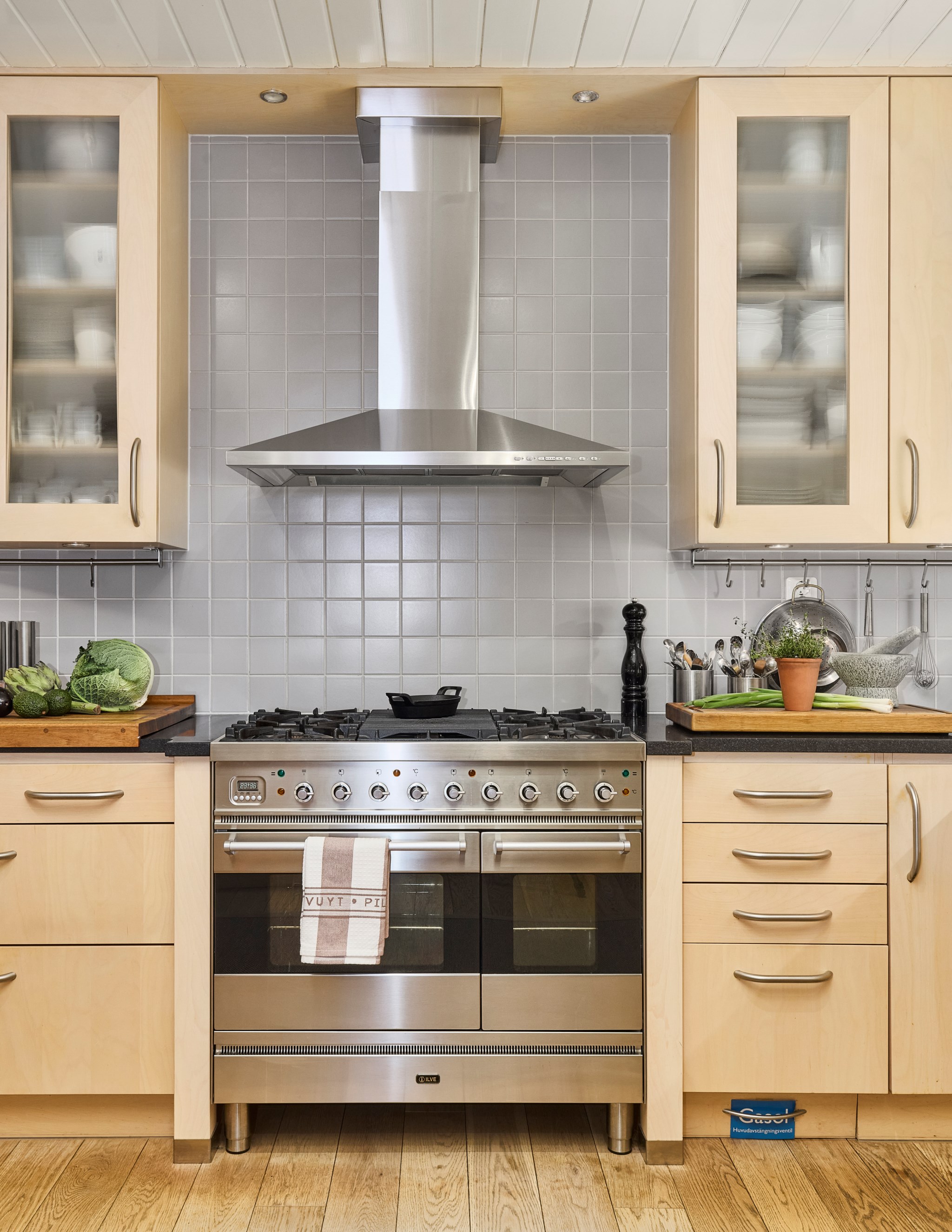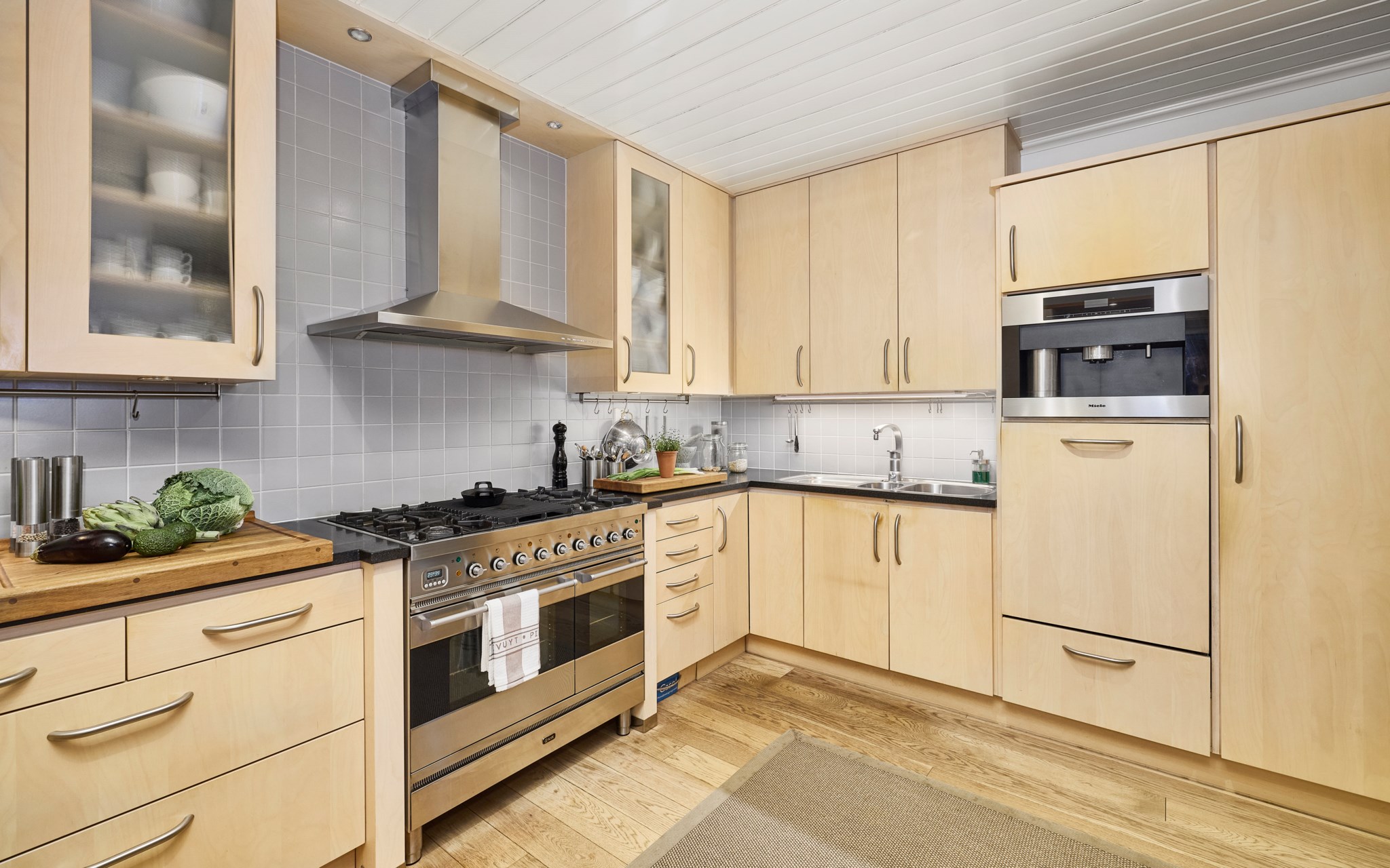 Köket kommer från Kvänum och här finns en bred gasspis från ILVE, köksfläkt från Miele, diskmaskin från Miele (2022), samt kyl/frys från Samsung (2019).