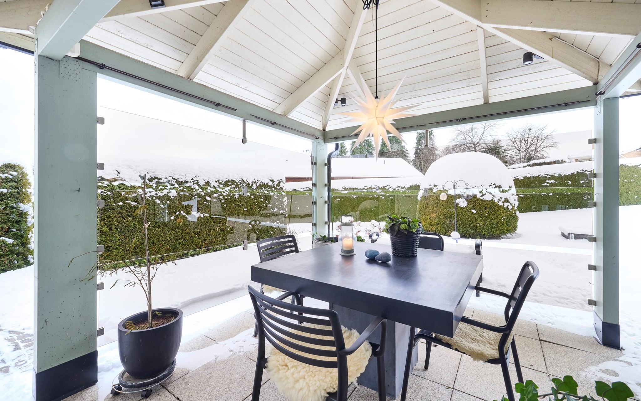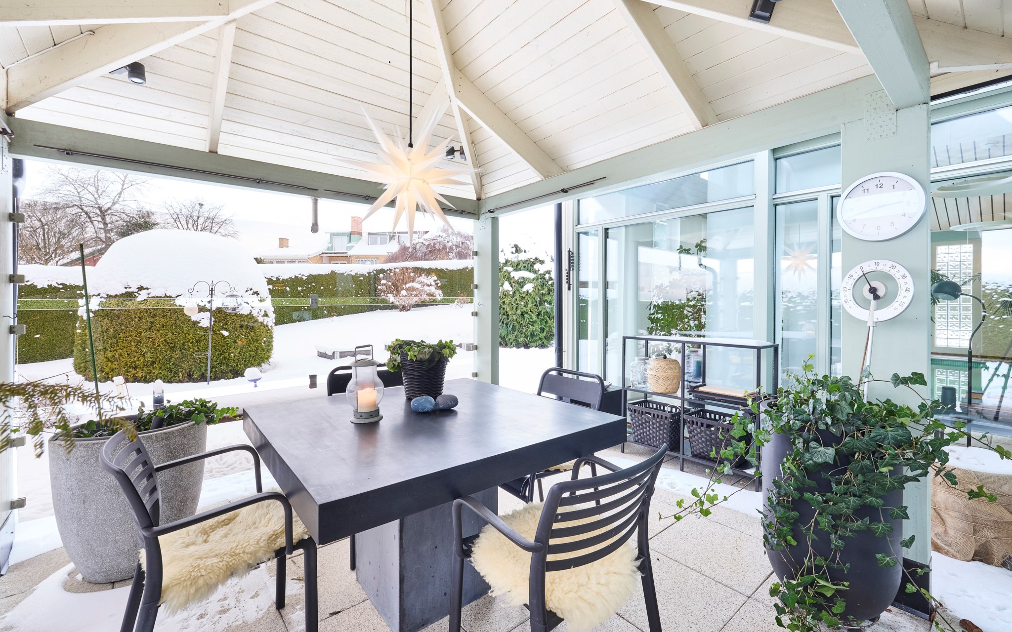 Sett nere från Björnebergsvägen är det inget som direkt avslöjar husets soliga medelhavsambitioner. En gammal sanning är att en tillbyggnad inte ska vara större än huset i sig. Men här är det gjort med luftig lätthet och glaspartier i alla riktningar med öppet upp i nock. Från köket stiger du rätt ut i semesterparadiset, snyggt helkaklad pool, sittgrupp och den öppna eldstaden är som ett hus i sig. Även mitt i vintern är detta både Cypern och Antibes på samma gång. Till sommaren drar du ett antal stora skjutdörrar från Hajom åt sidan så kan vinden få fatt i gardinerna.