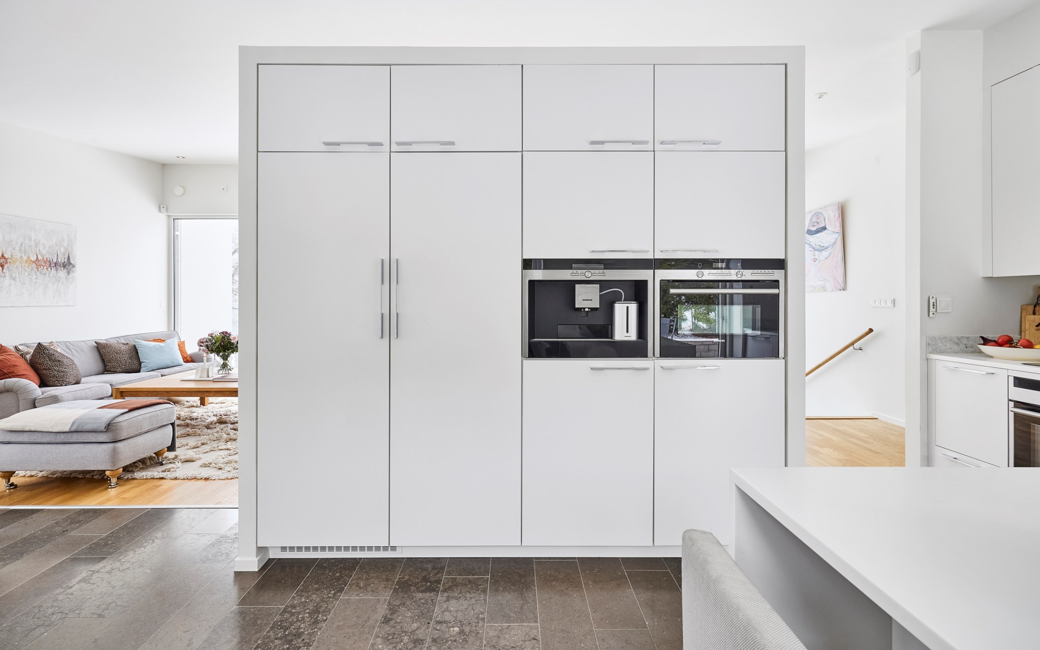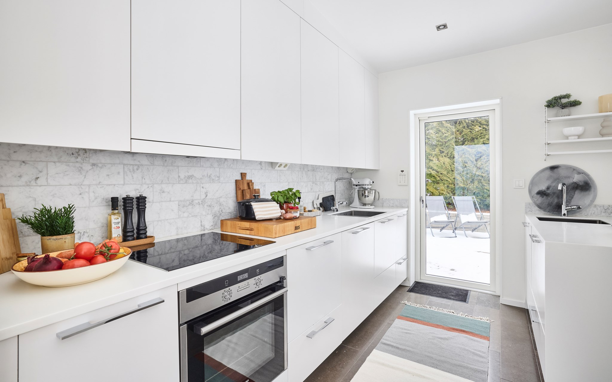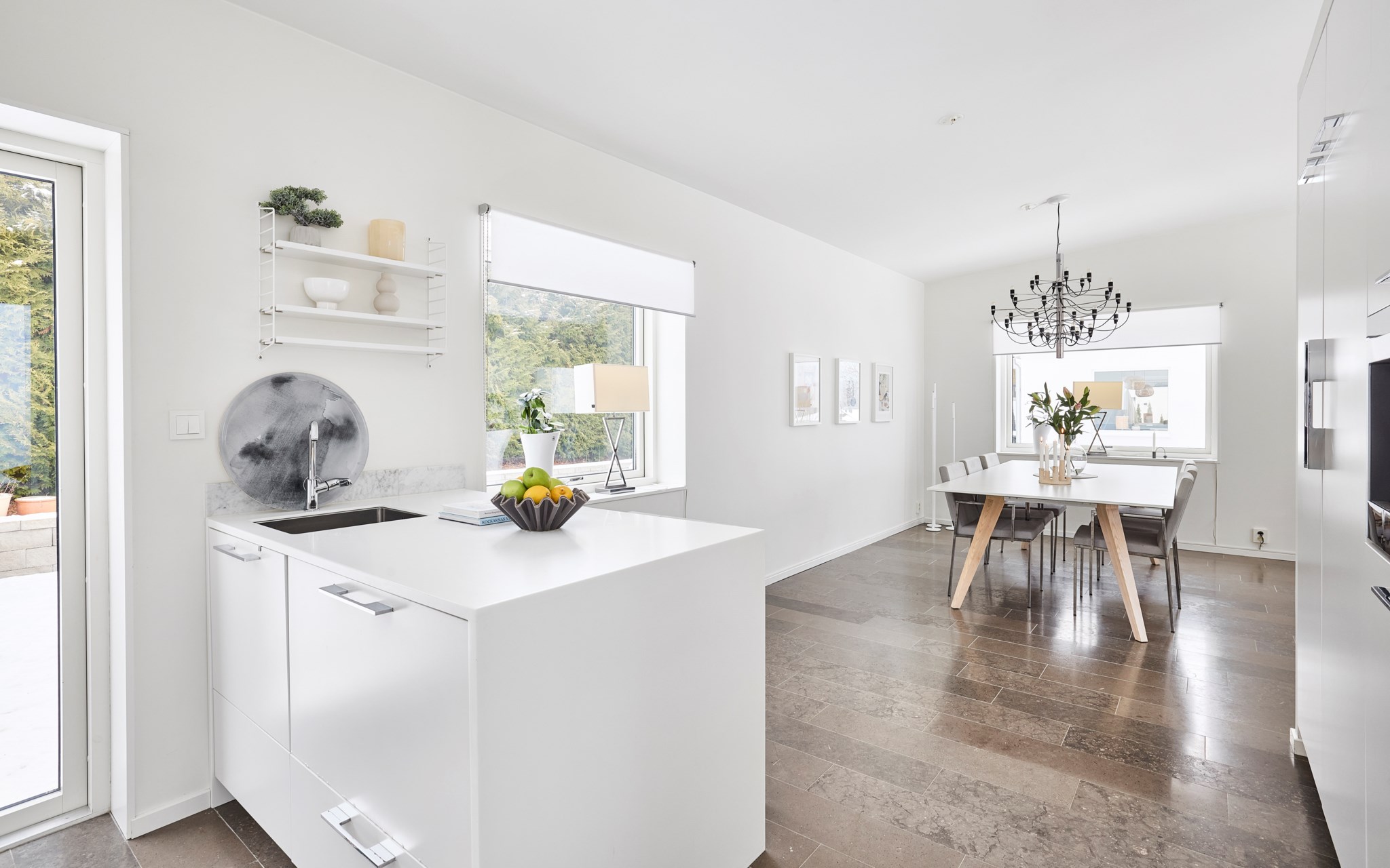 Köket är platsbyggt och arbetsbänken är tillverkad av Corian och samtliga vitvaror kommer från Siemens. På golvet i kök och matrum ligger kalksten och under denna finns vattenburen golvvärme.