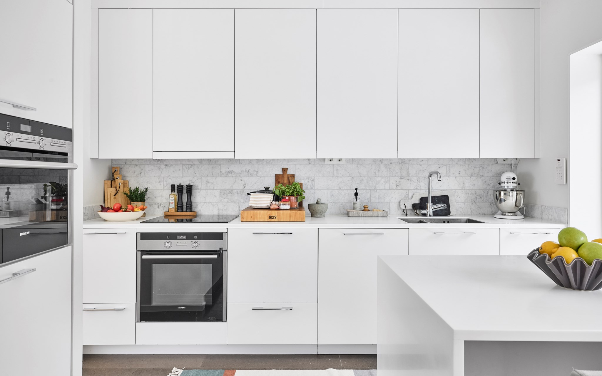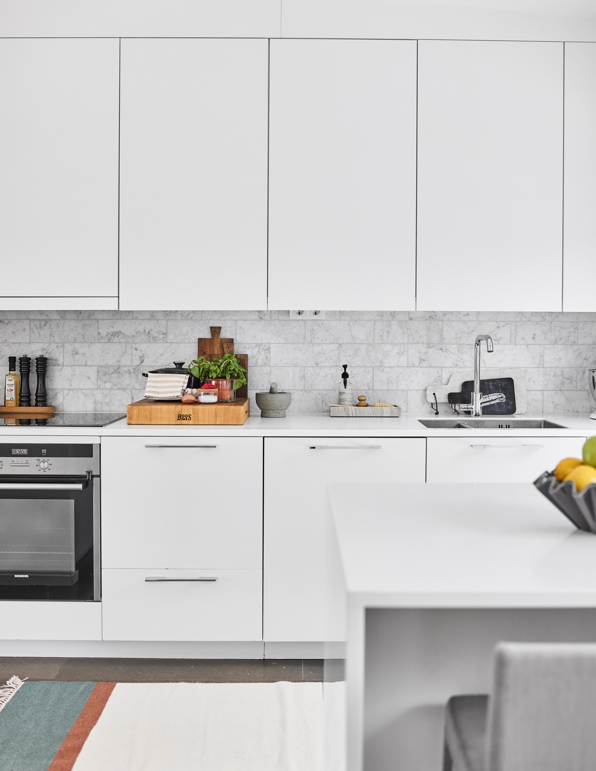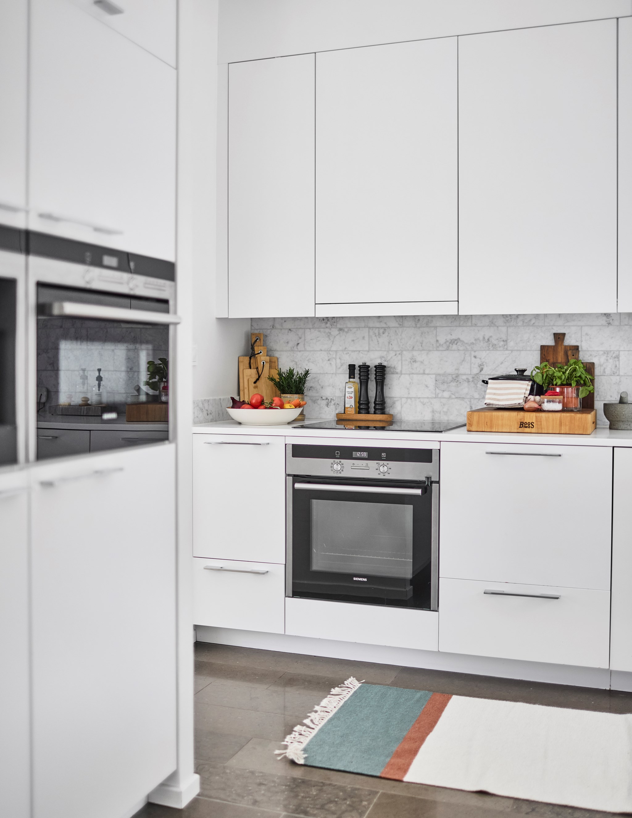 Köket är platsbyggt och arbetsbänken är tillverkad av Corian och samtliga vitvaror kommer från Siemens. På golvet i kök och matrum ligger kalksten och under denna finns vattenburen golvvärme.