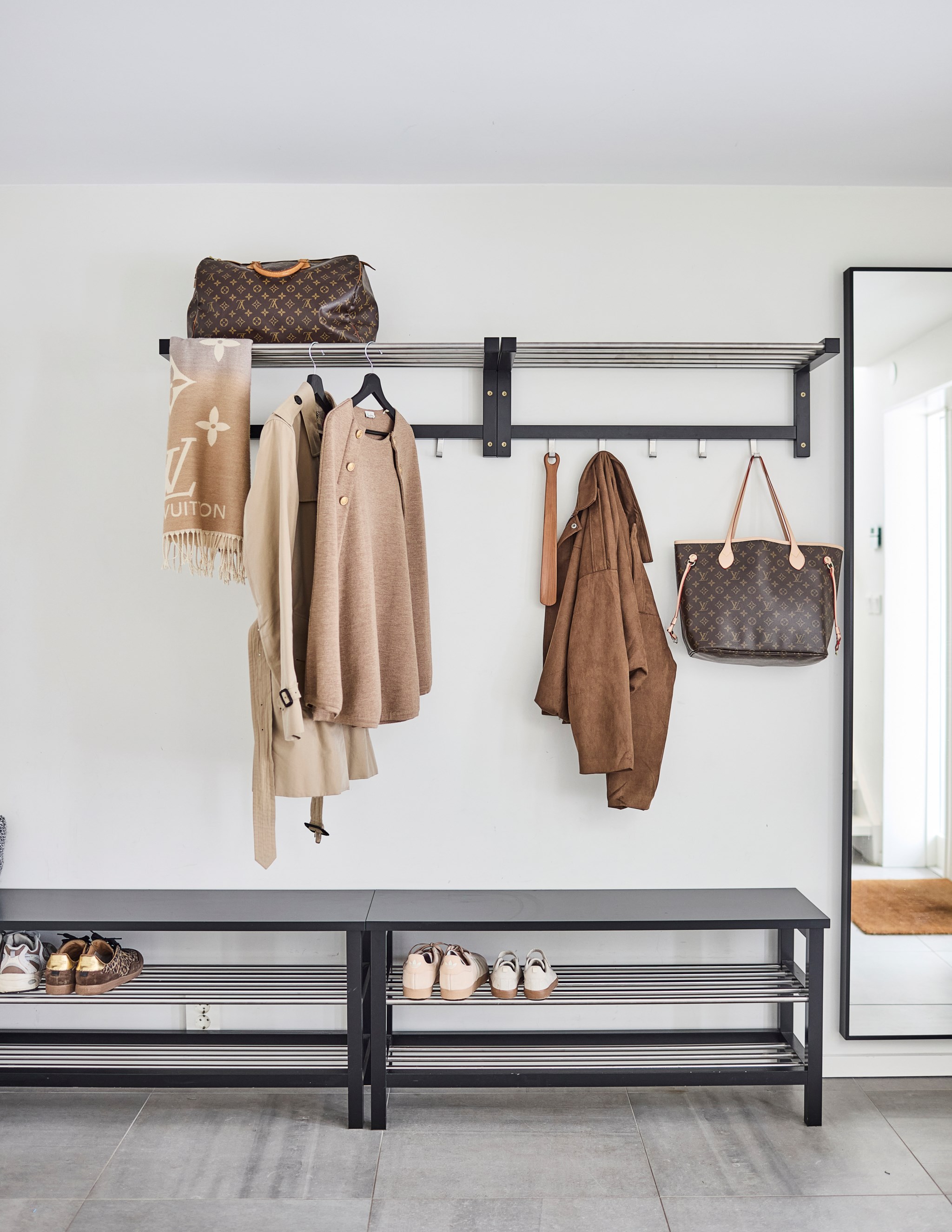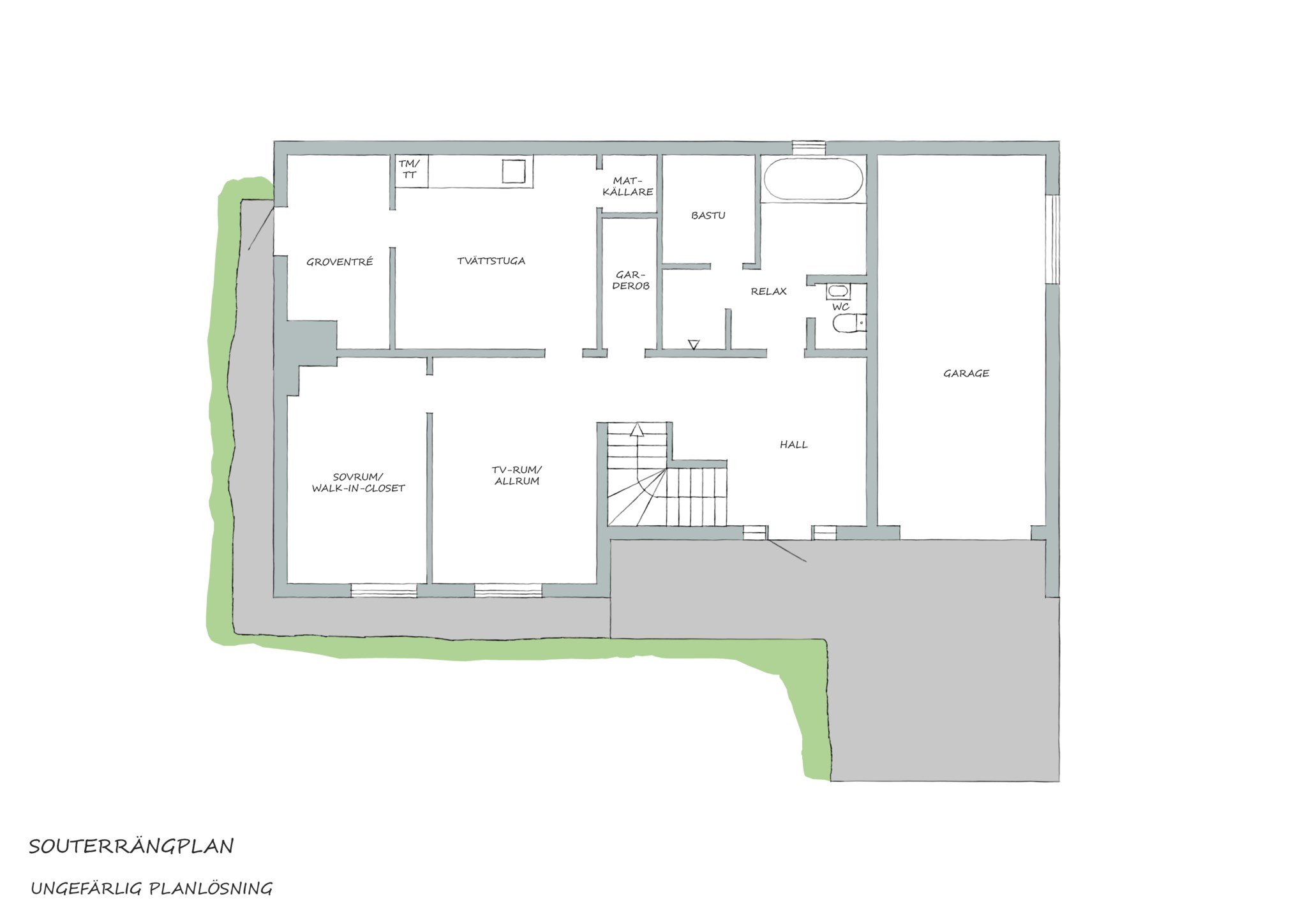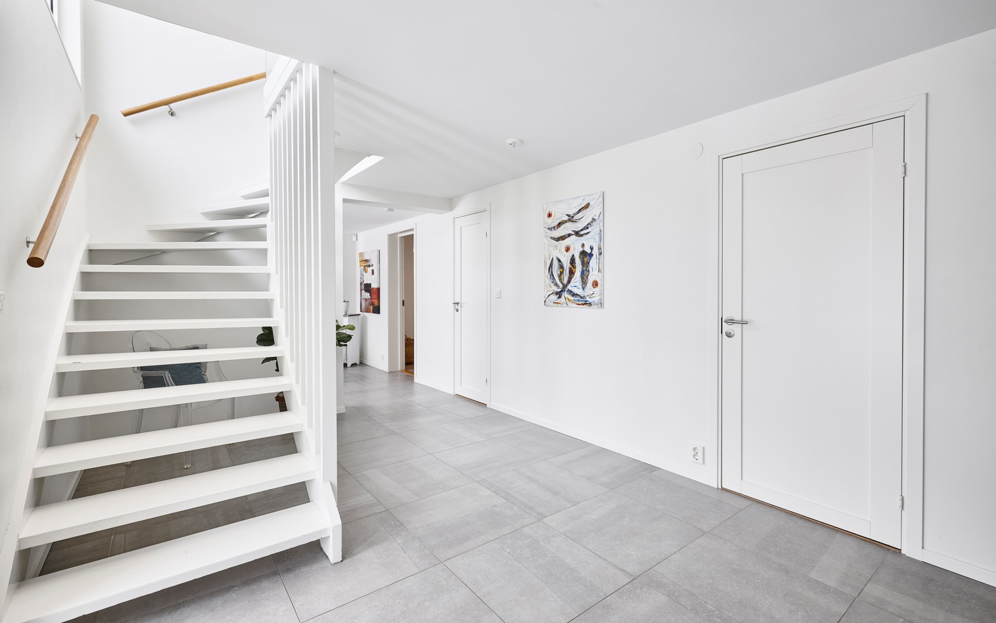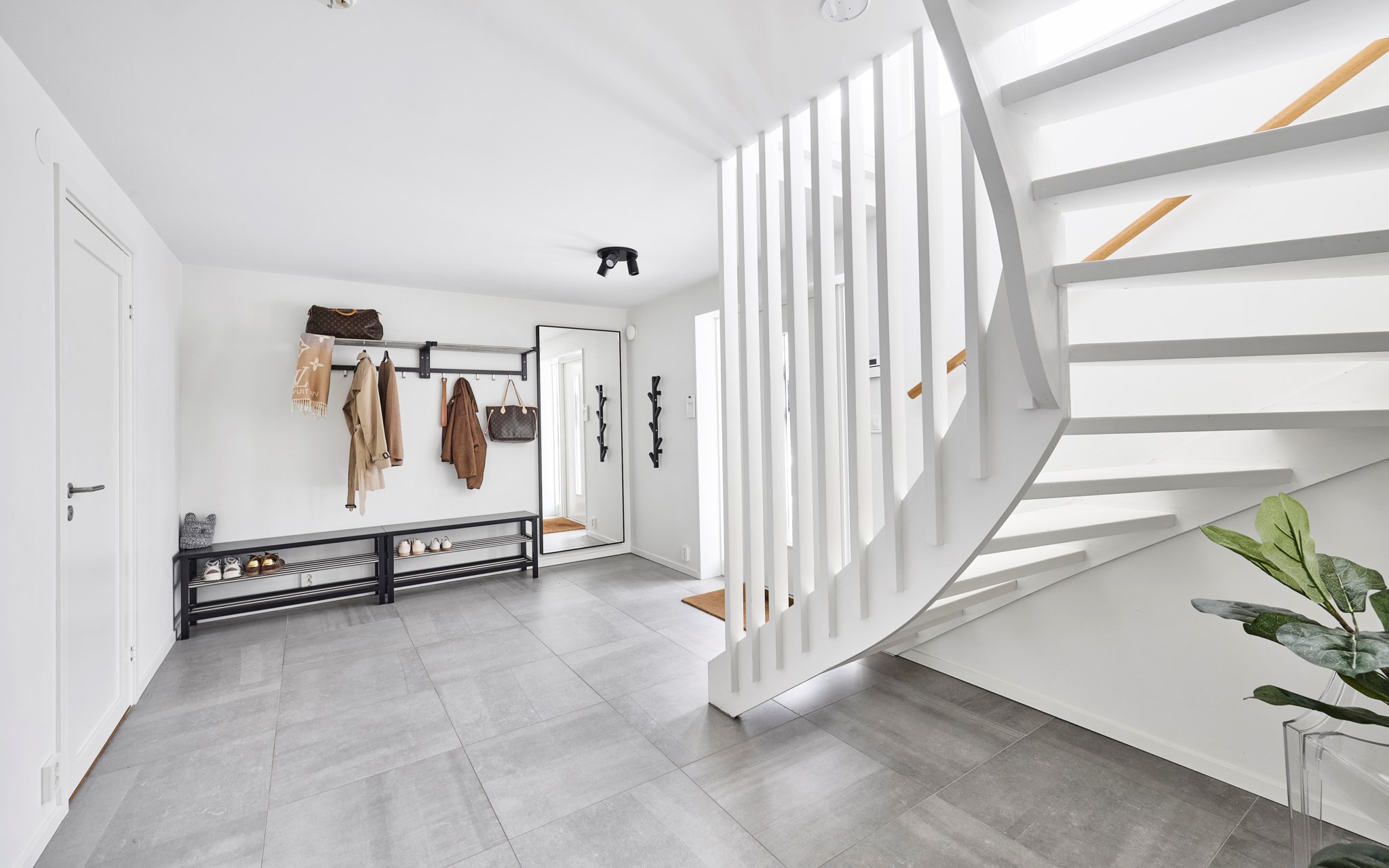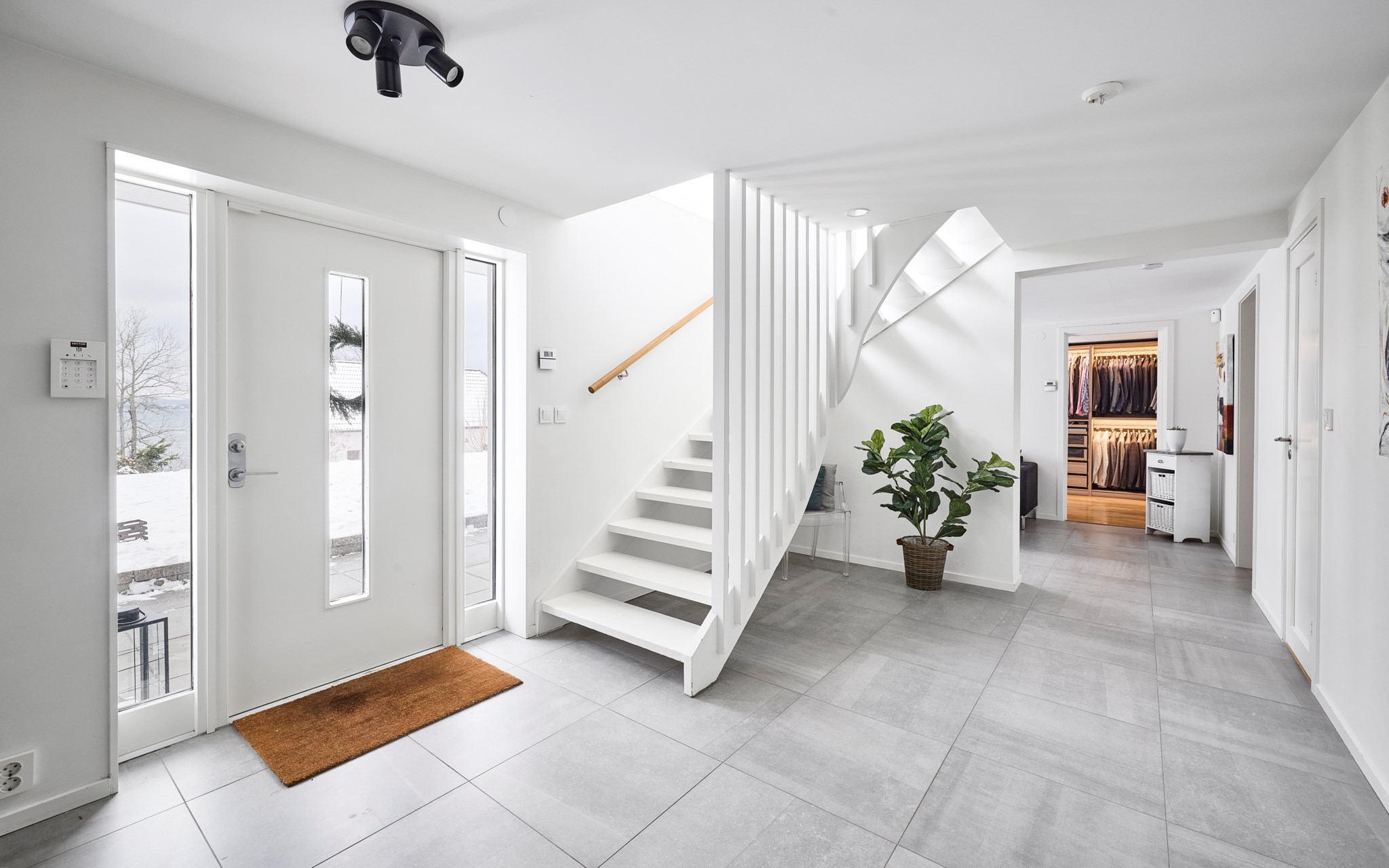 Huset byggt i suterräng med hallen, två rum och garaget mot nedsidan. Hallen med grå betongklinker innanför dörren och under den ny vattenburen golvvärme som fortsätter över hela entréplanet, förutom i mat- och vinkällaren. En ljus och rymlig hall där trappan öppnar stort mot ovanvåningen som lockar med ljuset in från stora glaspartiet. Den här betongklinkern fortsätter sen in både i tvättstugan och i badrummet. Och det är faktiskt samma platta som klär husgrunden ute dessutom.