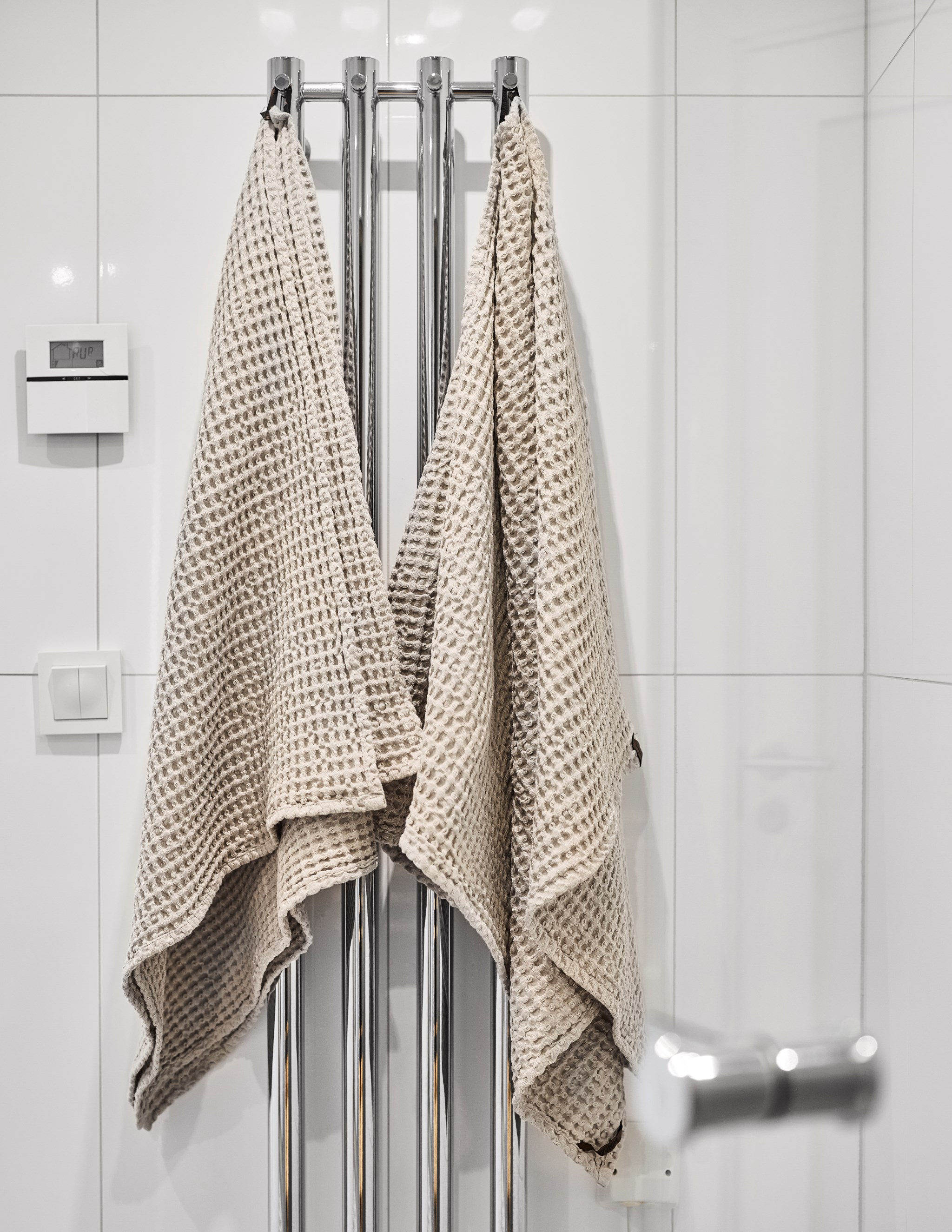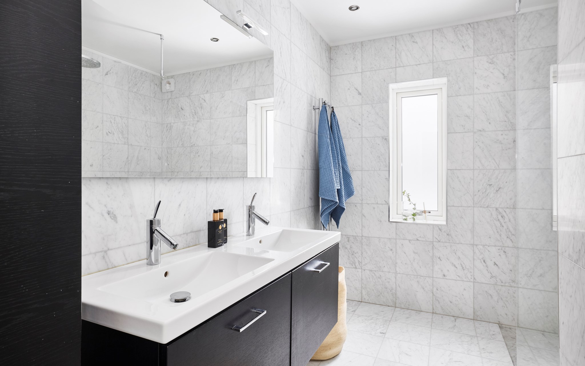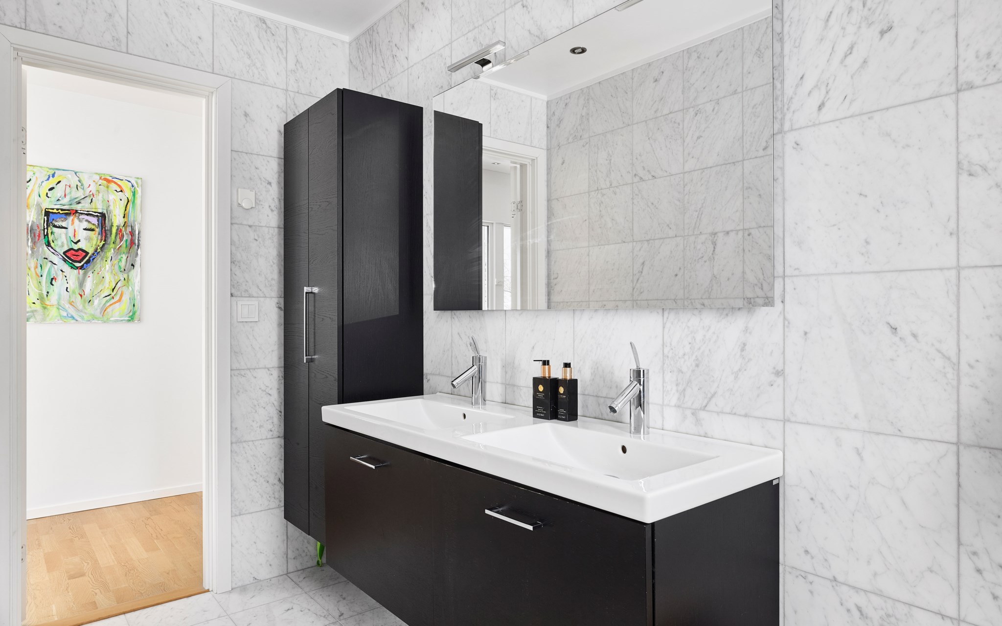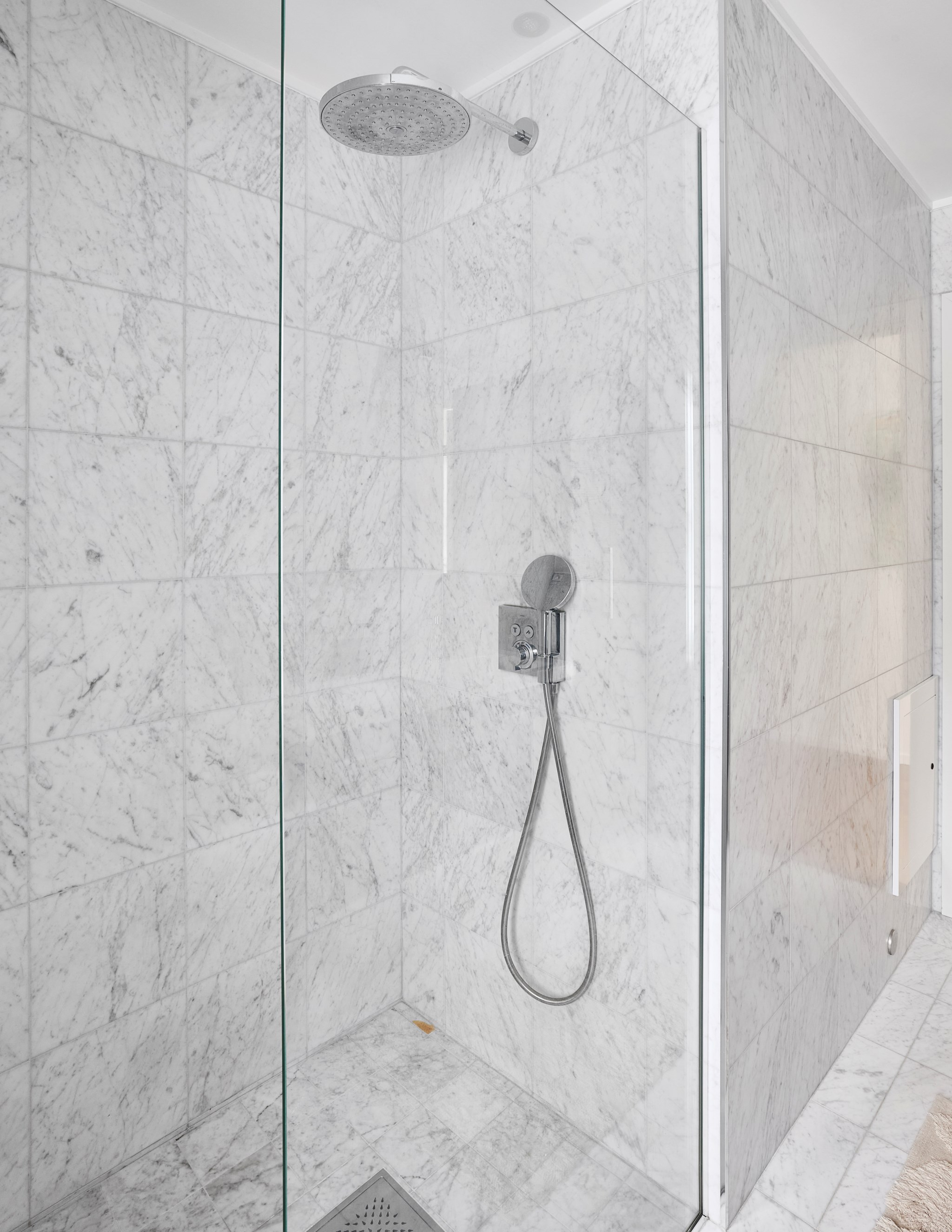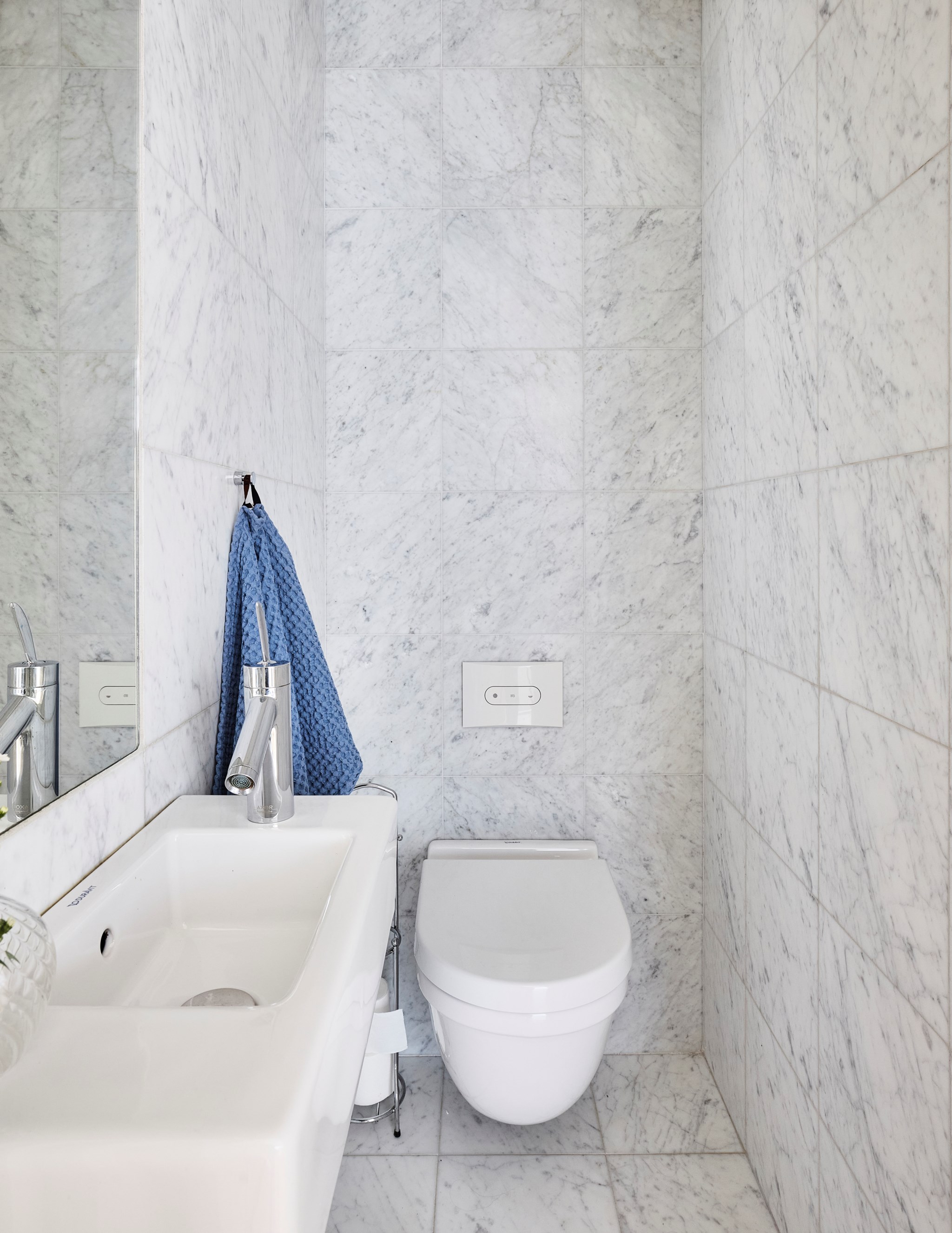 Minns du den lilla frisen med vit marmor i köket? Kolla in på gästtoaletten och stora badrummet så hittar du mer av denna italienska stensort, som använts i tusentals år när människor velat bygga och smycka det vackraste. Stora badrummet med Carrara-marmor från golv till tak, med snygg nedsänkning in till den stora duschen där du definitivt inte behöver vara rädd för att skvätta ut på den som står och borstar tänderna vid det dubbla handfatet. Handdukstorkarna är också valda med omsorg, liksom blandare och andra accessoarer. Gästtoaletten ligger vägg i vägg och är helt uppfylld i samma steniga stämning. Tidlöst vackert.