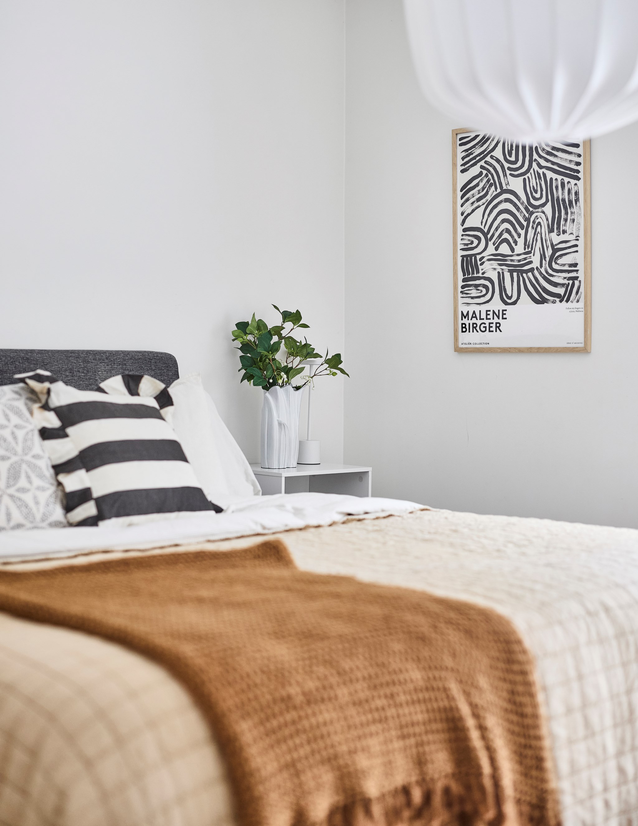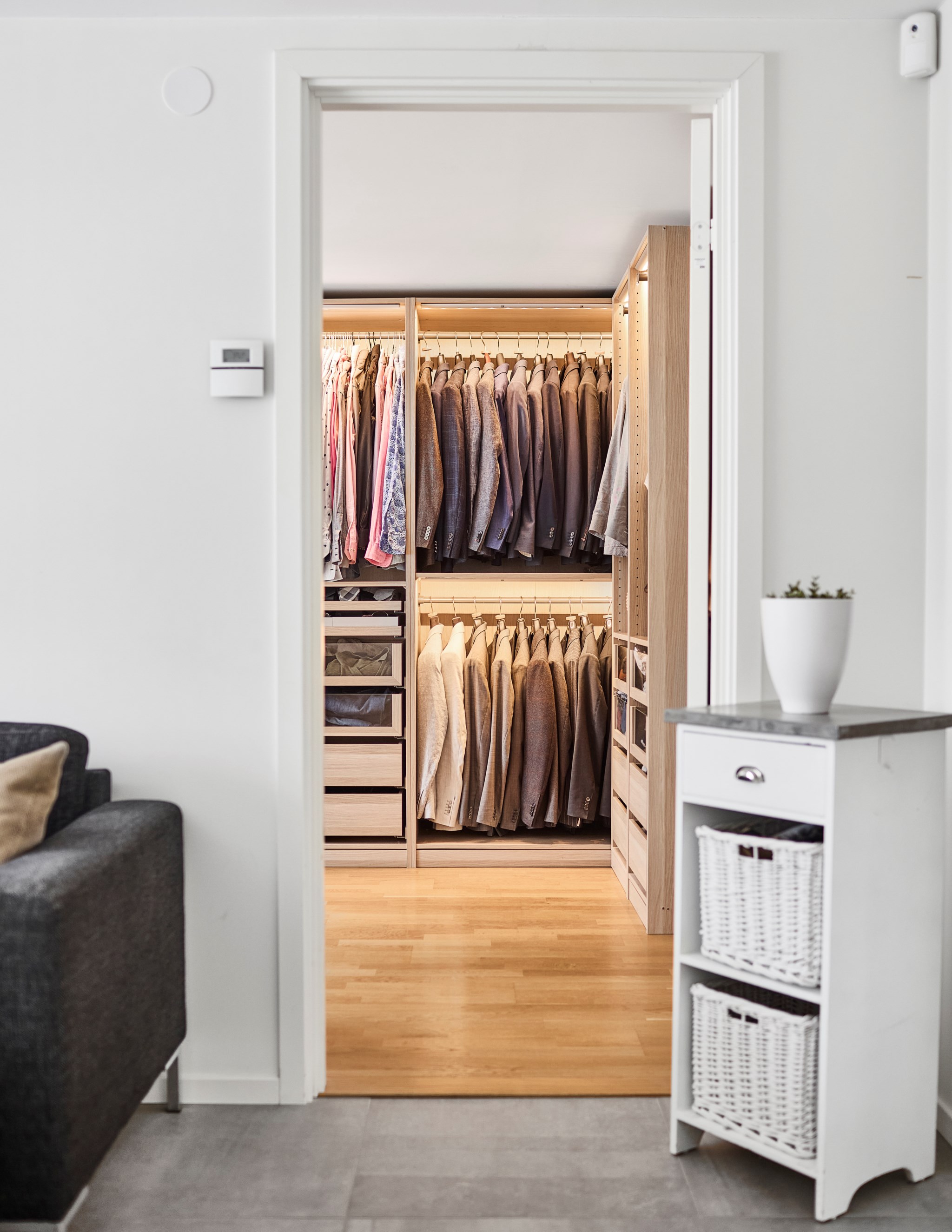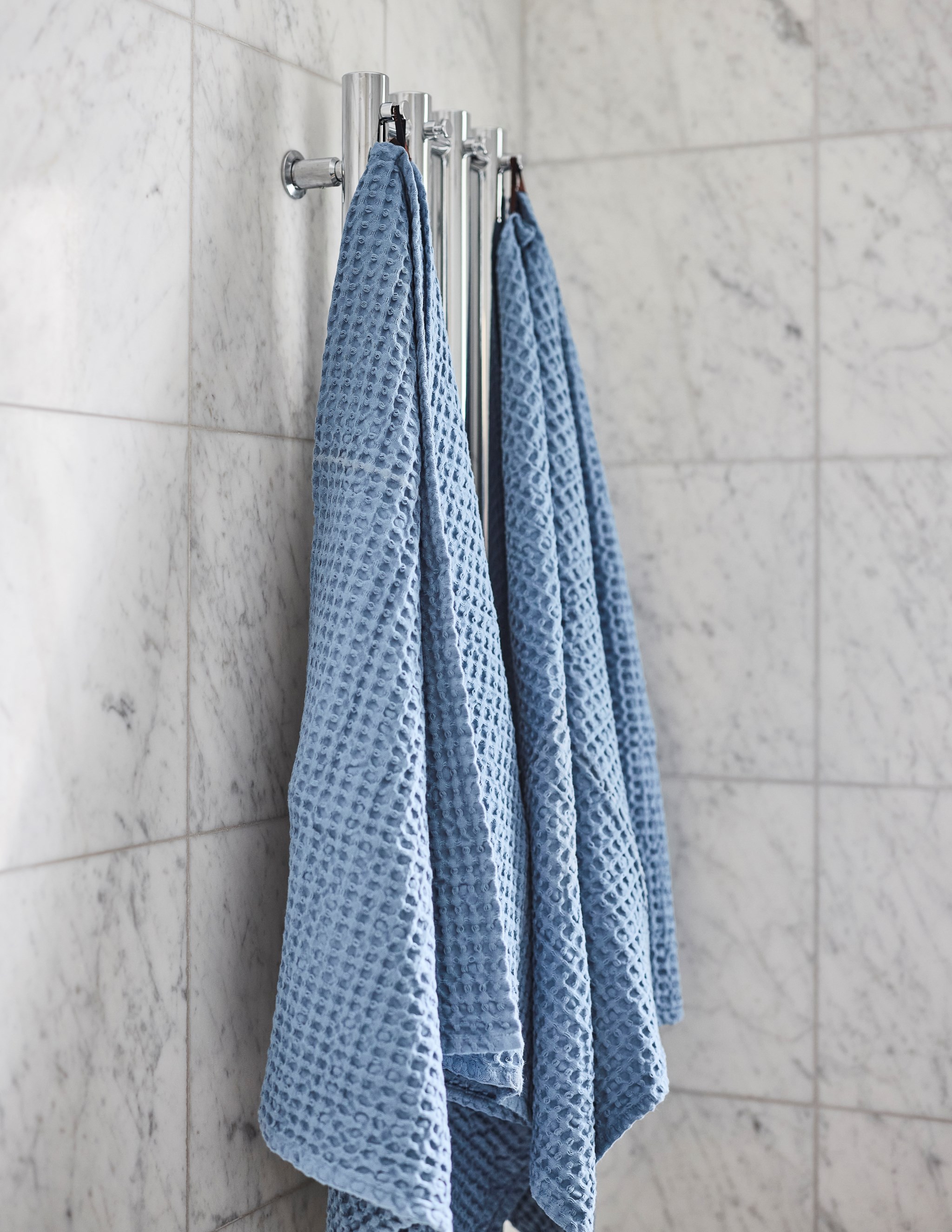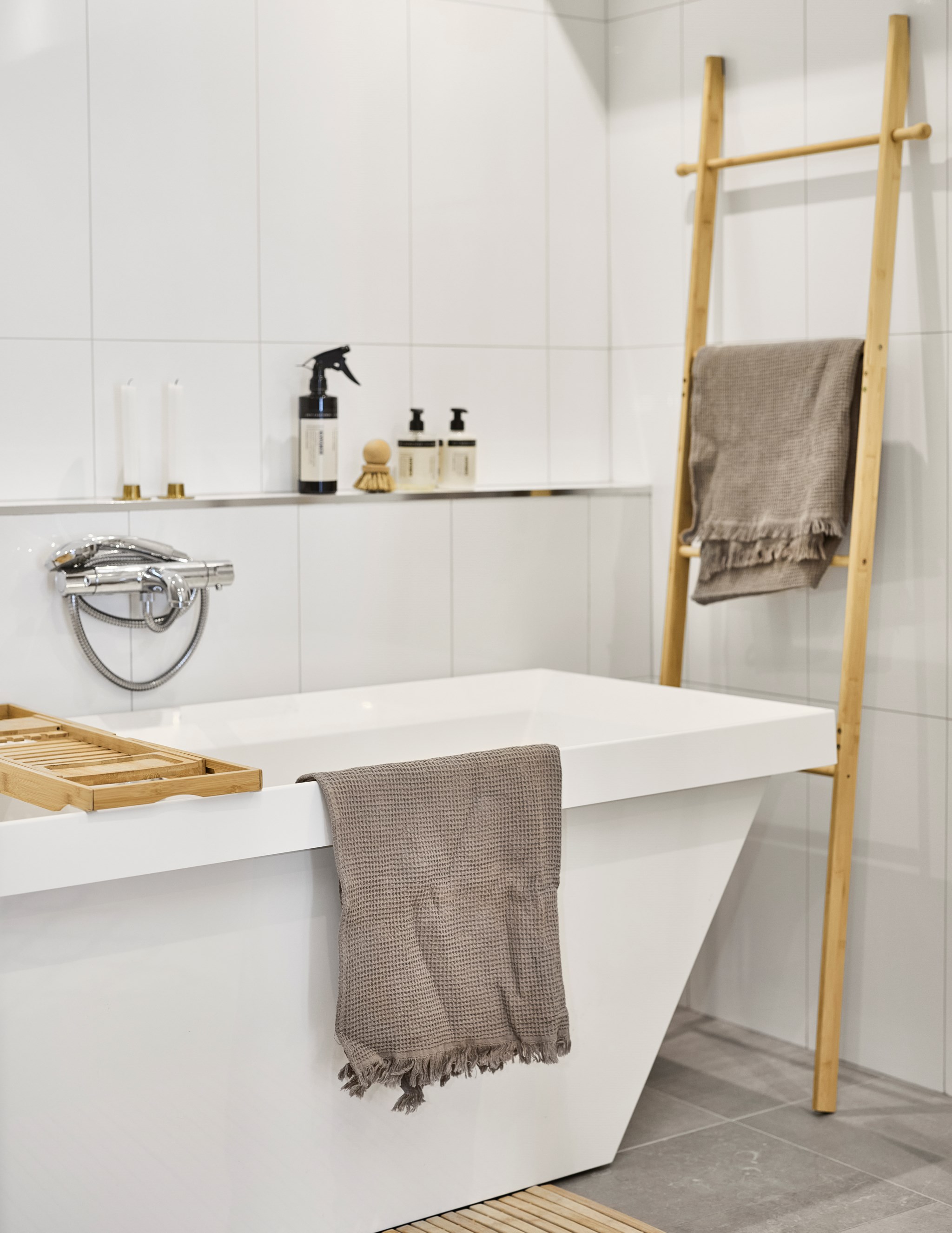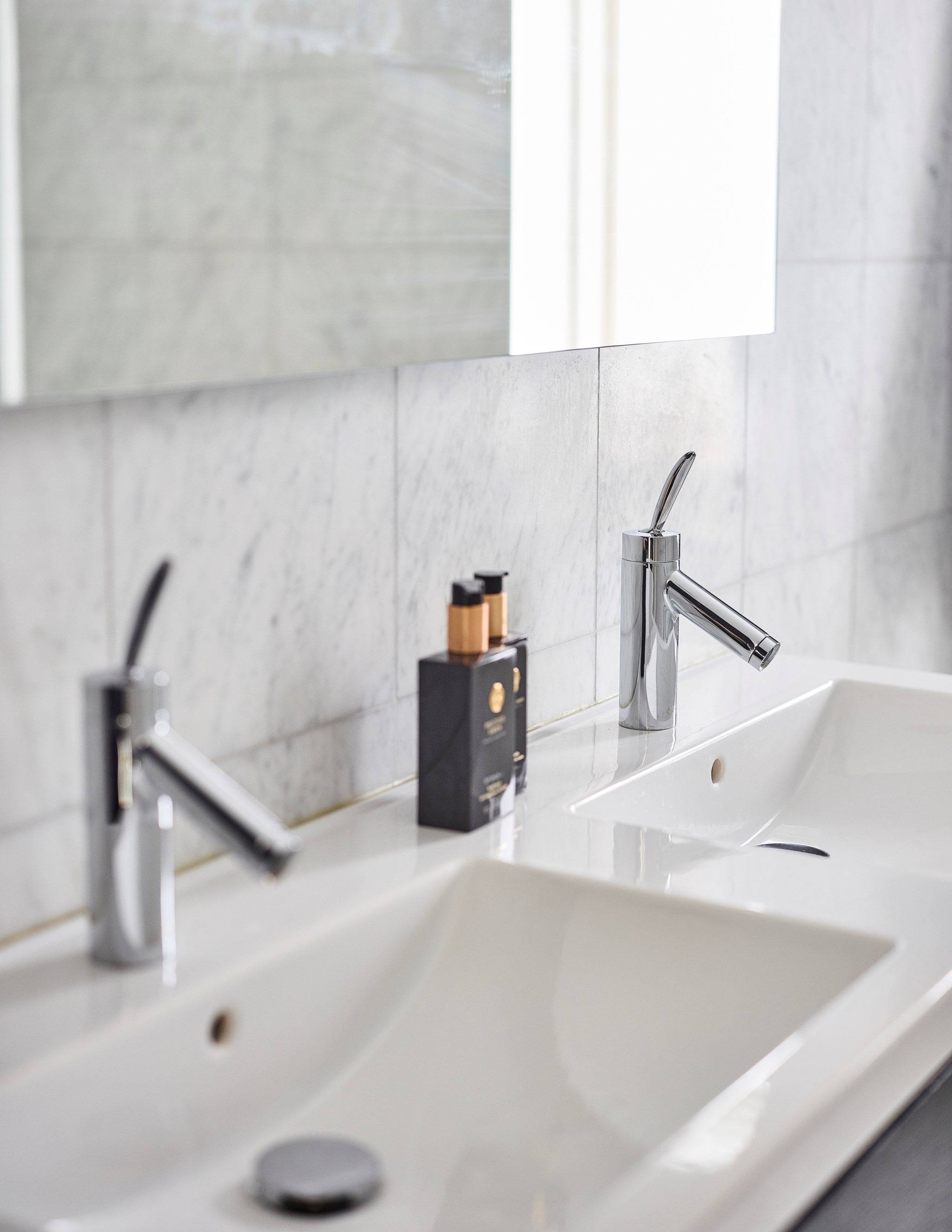 Minns du den lilla frisen med vit marmor i köket? Kolla in på gästtoaletten och stora badrummet så hittar du mer av denna italienska stensort, som använts i tusentals år när människor velat bygga och smycka det vackraste. Stora badrummet med Carrara-marmor från golv till tak, med snygg nedsänkning in till den stora duschen där du definitivt inte behöver vara rädd för att skvätta ut på den som står och borstar tänderna vid det dubbla handfatet. Handdukstorkarna är också valda med omsorg, liksom blandare och andra accessoarer. Gästtoaletten ligger vägg i vägg och är helt uppfylld i samma steniga stämning. Tidlöst vackert.