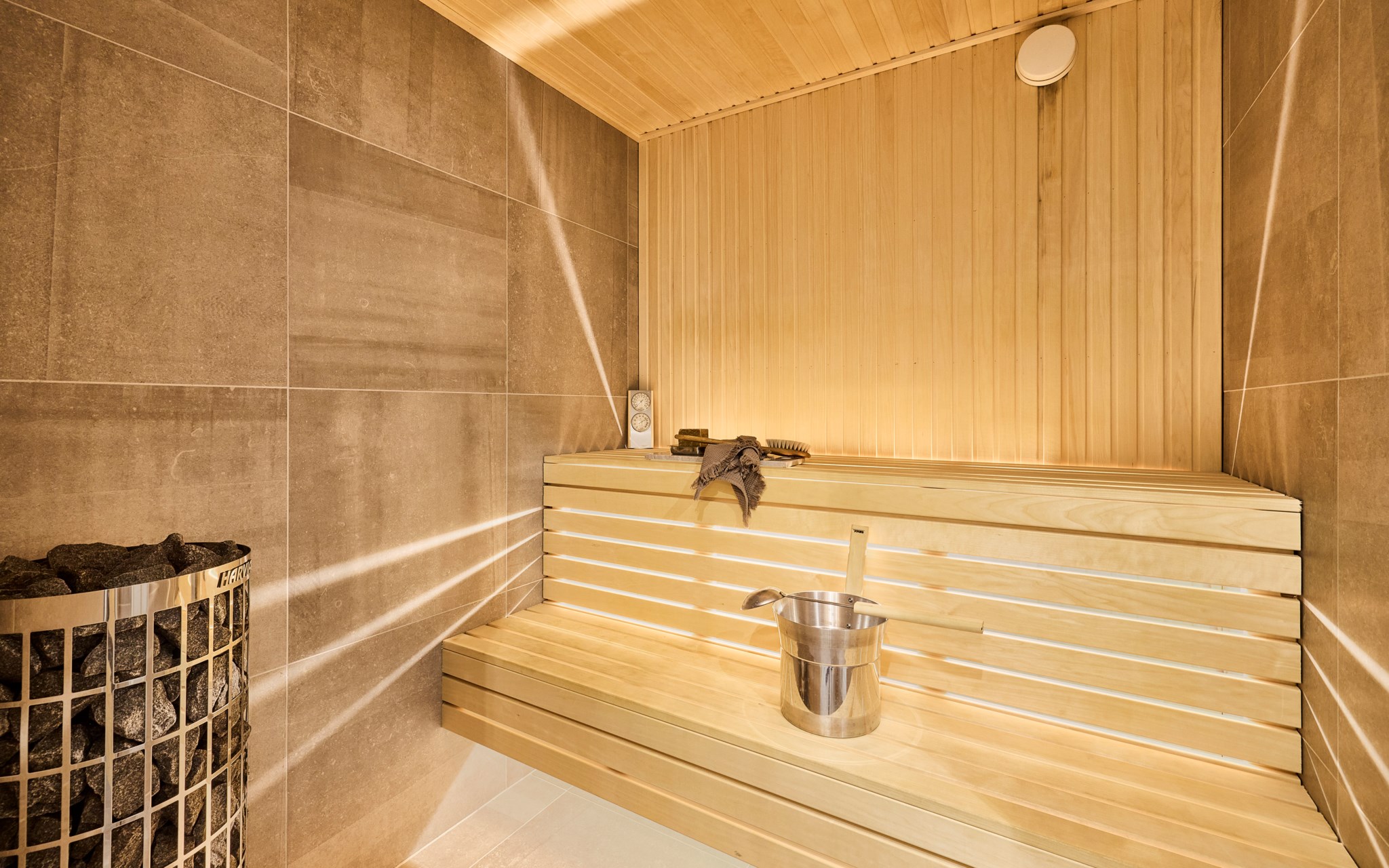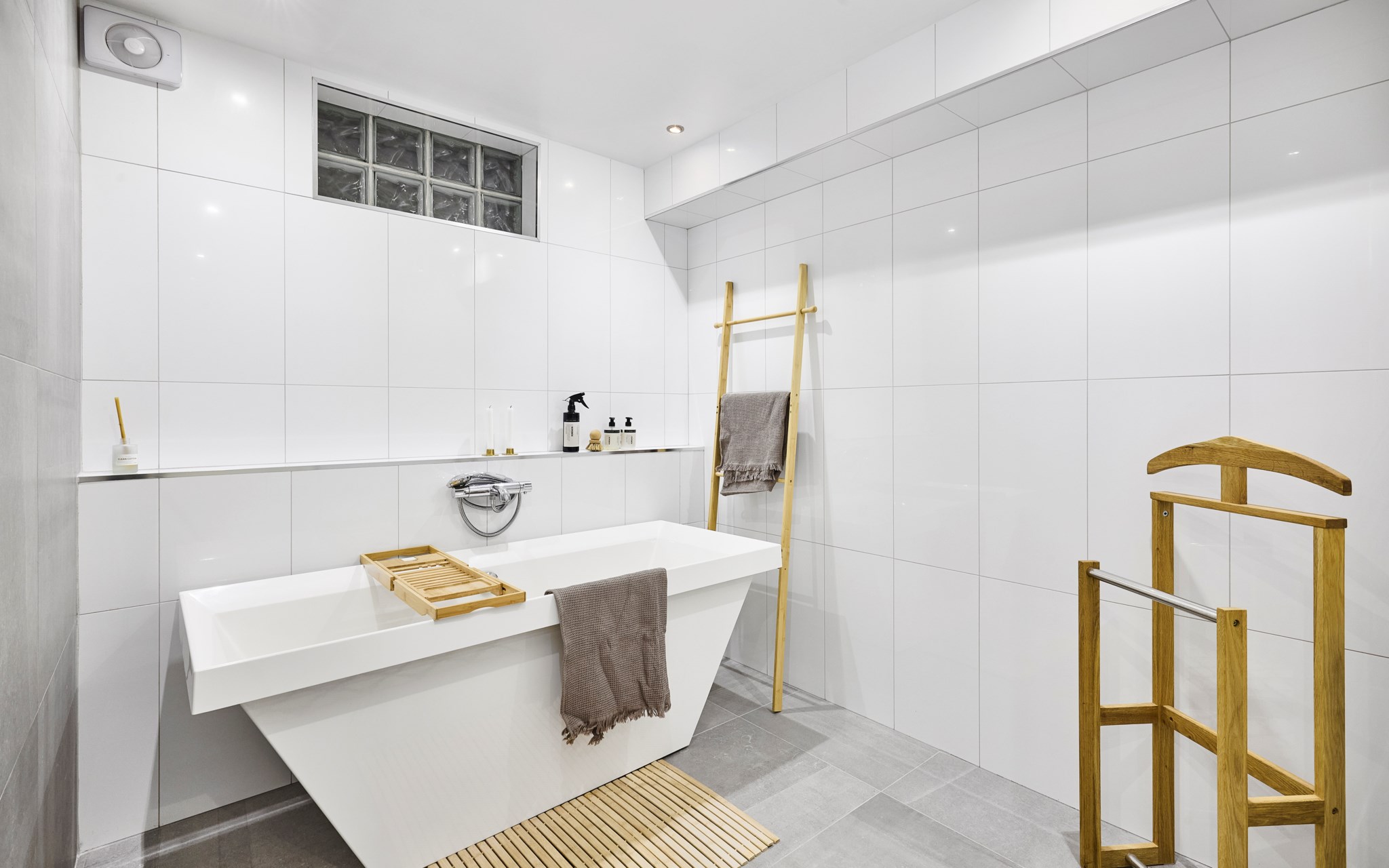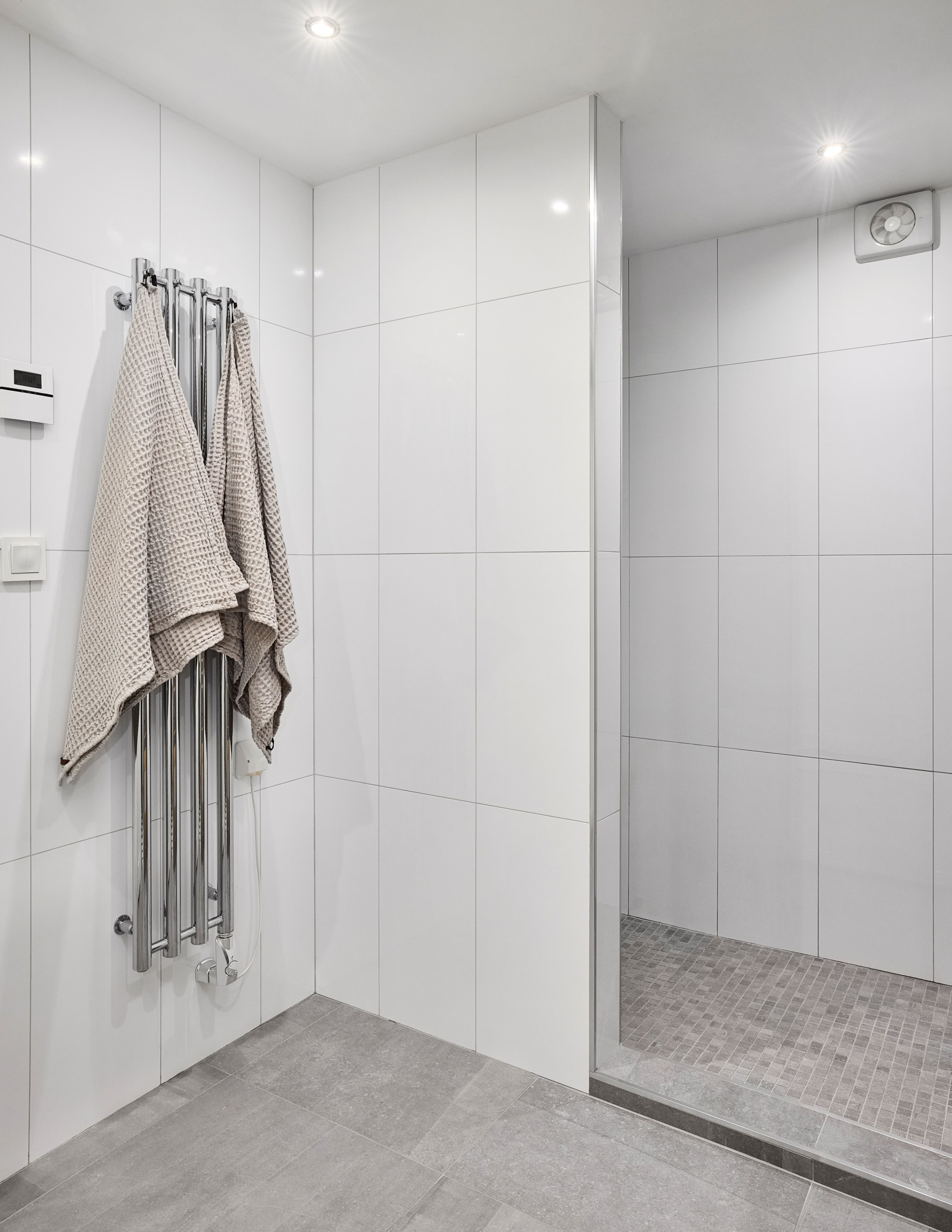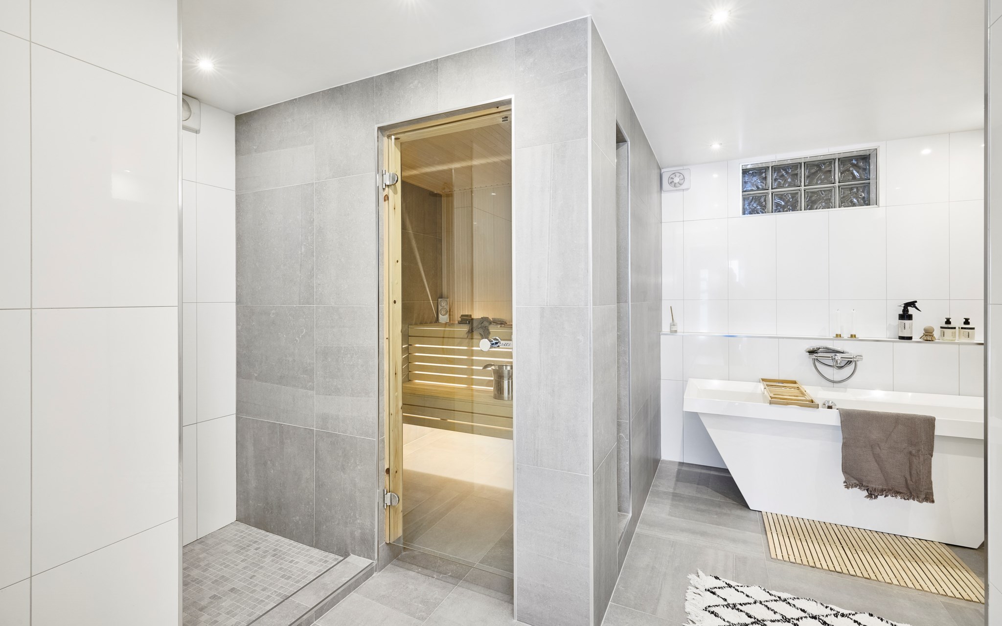 Som sagt, huset helt genomgripande renoverat 2015 och alltjämt i väldigt fint skick, dels tack vare en pedantisk ägare sedan dess, men också tack vare gedigna neutrala materialval som åldras med finess. Badrummet har självklart fått samma klinker som ute i hallen. Ett varmt tonfall i det grå, som också är varmt tack vare golvvärmen. Klinkern har hittat hela vägen in i bastun dessutom. Fint att toalettstolen hamnar lite i en vrå för sig. Blandarna är enhetliga i hela huset och från tyska Grohe.