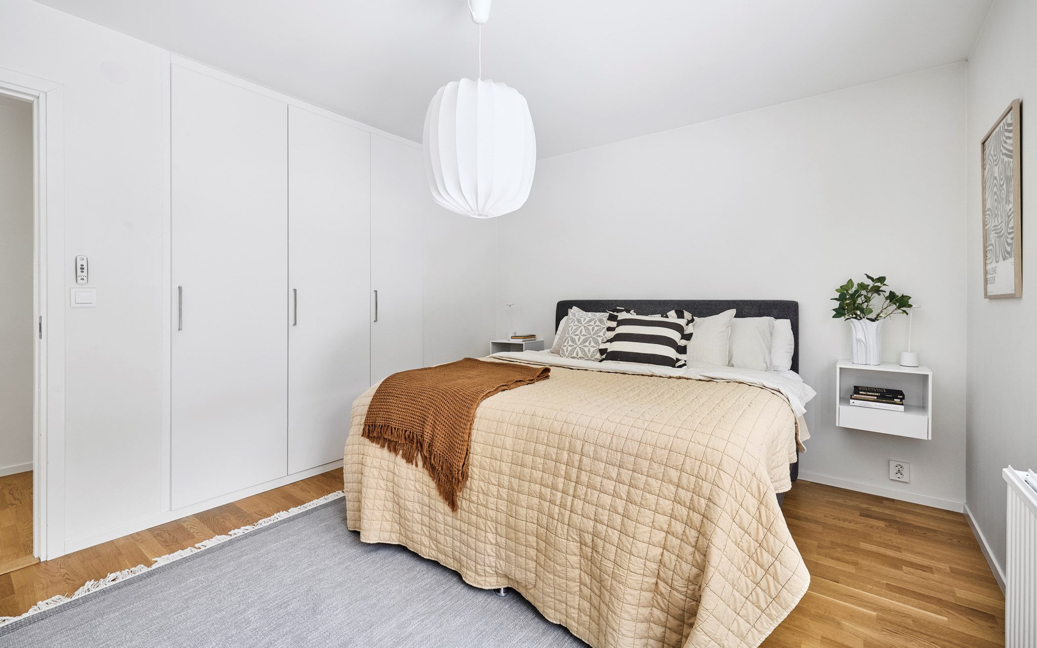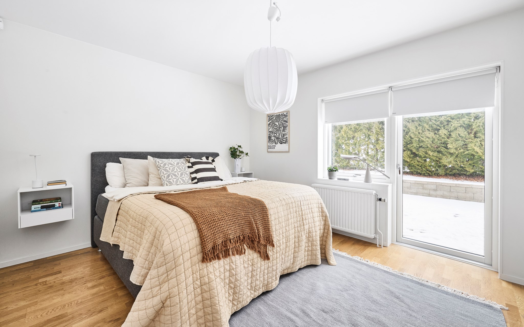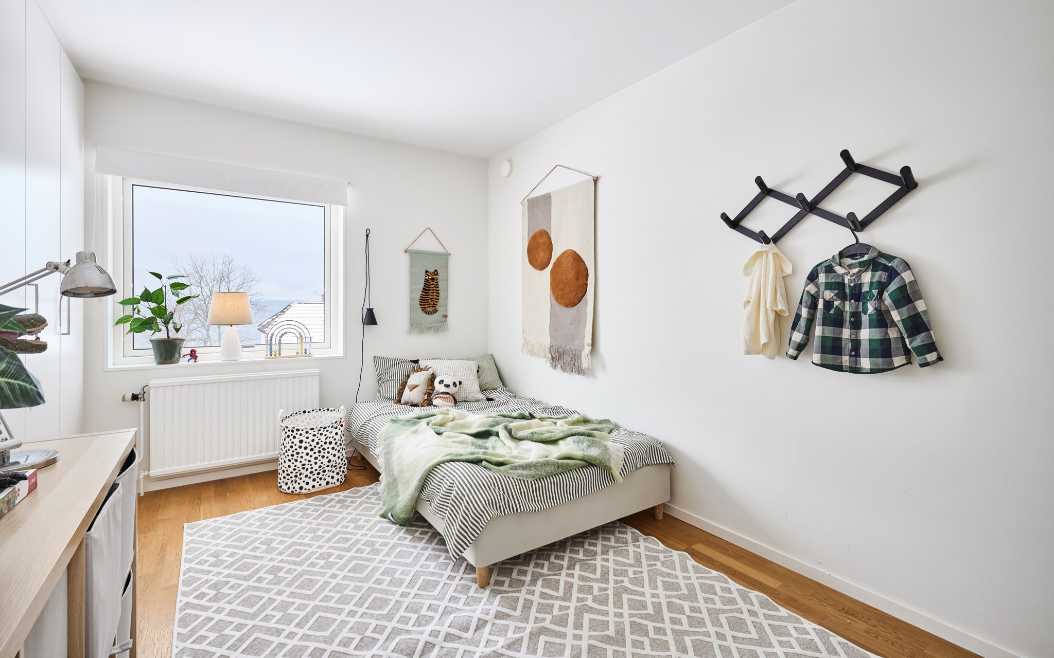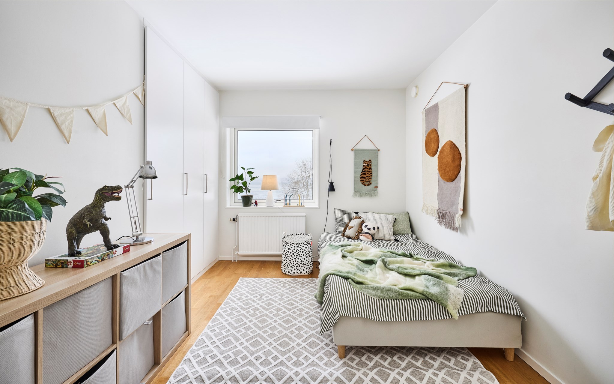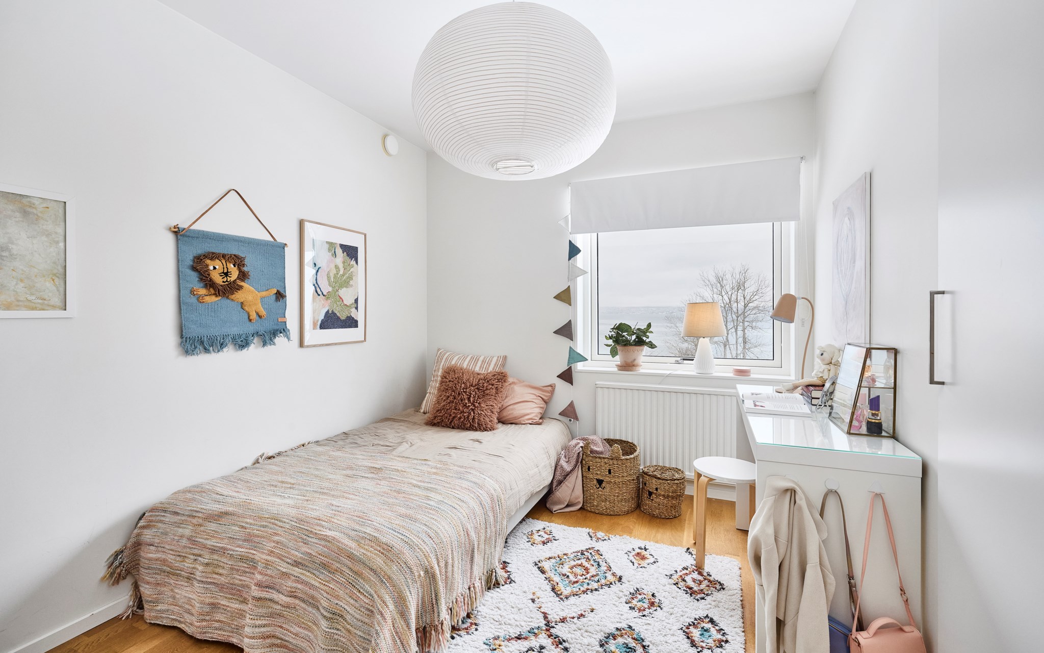 Uppe hittar du husets tre övriga sovrum, två barnrum i samma storlek mot utsikten, och en fin sängkammare mot baksidan med egen dörr ut på trädäcket. Barnrummen smart planerade med varsina tre garderober, kvistfria ekgolv, nya ramdörrar och nya fönster mot utsikten. Här somnar man vackert i solnedgången vår-sommar-höst. Även vintern kan bjuda på vacker sol över himlen, men det blir redan på eftermiddagen. Sängkammaren har mycket ostört läge mot baksidan, morgonsolen tar sig inte igenom tujahäcken i första taget. Samma ekparkett som på resten av våningsplanet.