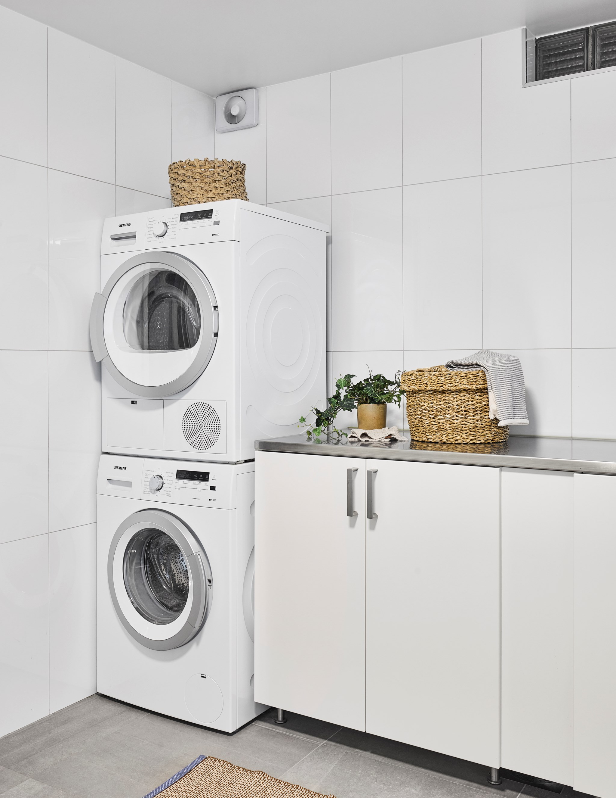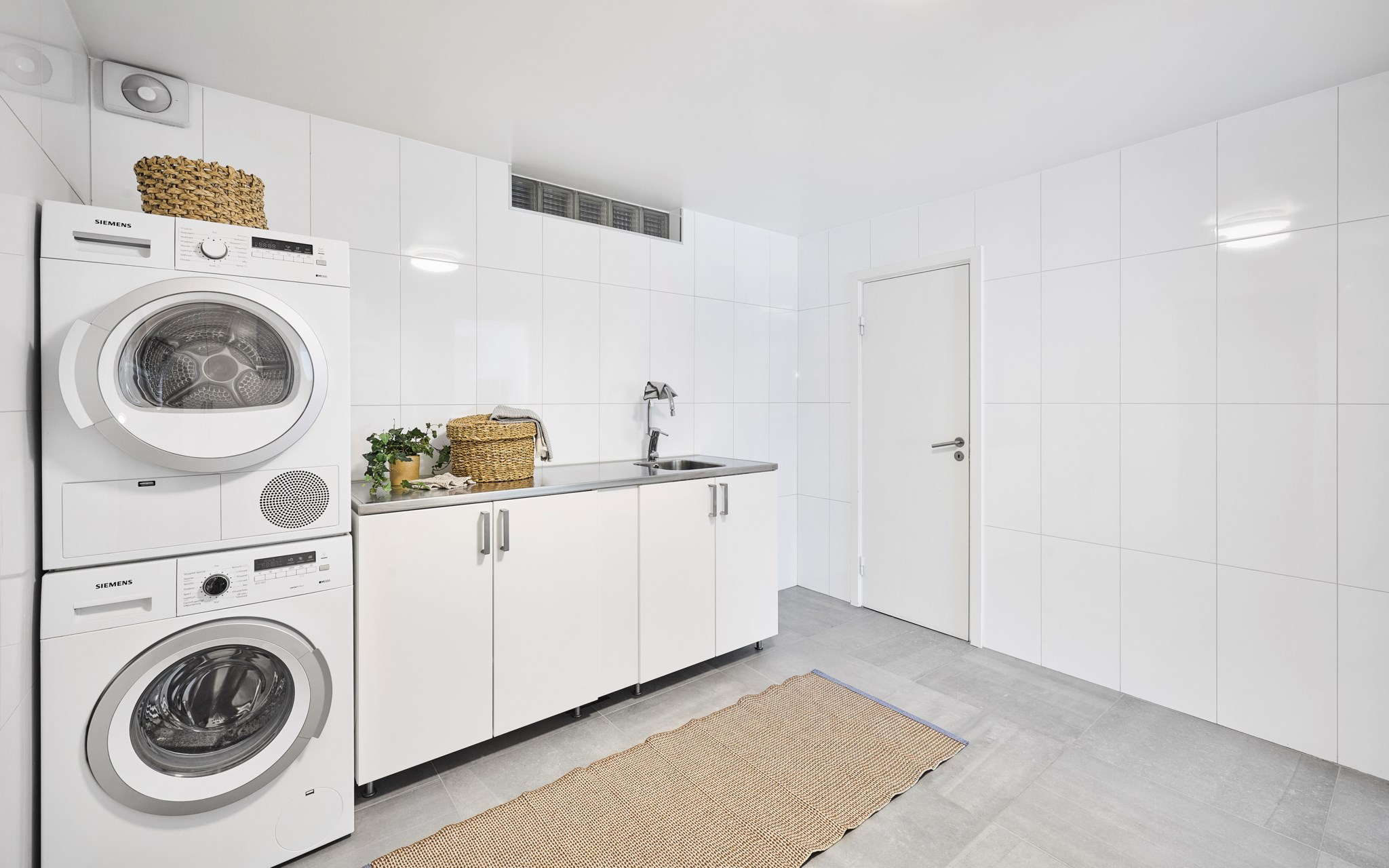 Den grå granitklinkern i hallen fortsätter såklart in även i tvättstugan, som är exemplariskt praktisk och snyggt renoverad, precis som resten av huset. Här finns arbetsytor och möjlighet att anpassa förvaring efter personliga önskemål. Golvvärmen ser till att kläderna torkar även om du hängtorkar och låter tumlaren vila. Enda stället i entréplanet där det inte är golvvärme är i mat- och vinkällaren, vilket såklart är helt avsiktligt för att hålla svalt året runt. Via tvättstugan kommer sedan du ut på husets norra gavel, och på vägen ut passerar du värmepumpen som är av luft-vatten-modell.