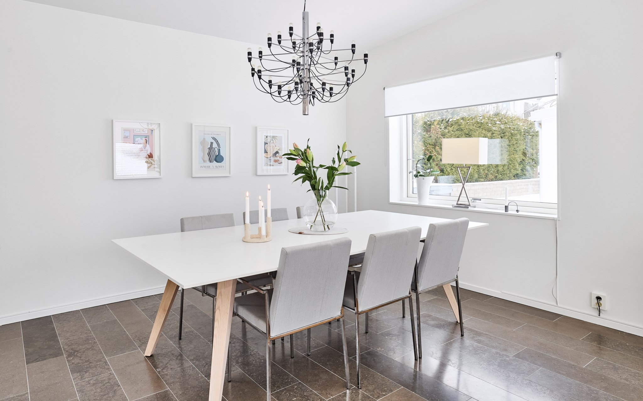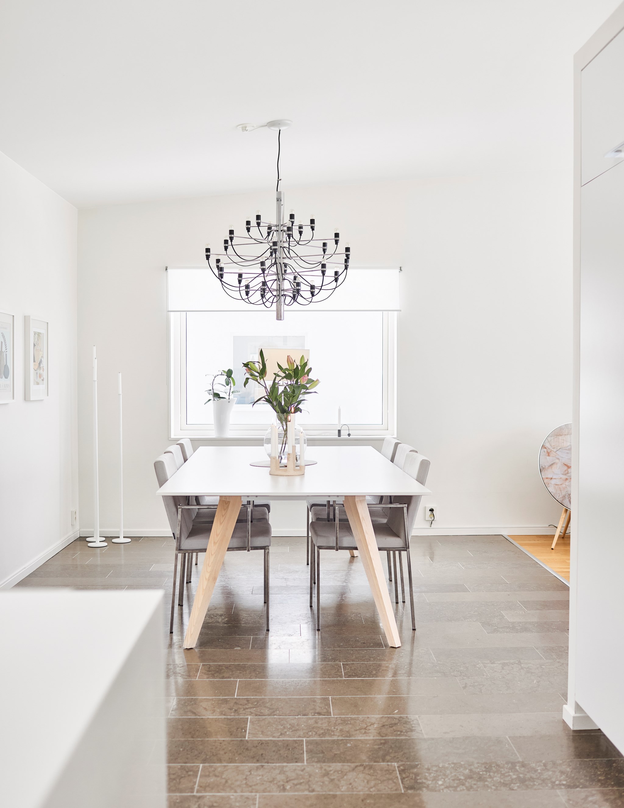 Snyggt avdelat mot vardagsrummet, men lägg märke till att väggen inte går ända upp i snedtaket utan lämnar lite passage för ljuset att klättra över. Kök och matplats har kalkstensgolv med golvvärme under. Själva köket med platsbyggda stommar och bänkskivor i vit så kallad Corian. Den ljusa marmorn på väggen kommer från Carrara på Italiens västkust. Denna klassiska sten får sen fortsätta visa upp sig på större ytor inne i både badrummet och på gästtoaletten. Matplatsen är både lång och bred, och du kan lätt ställa dit två bord på längden och duka upp för 20 personer eller mer.