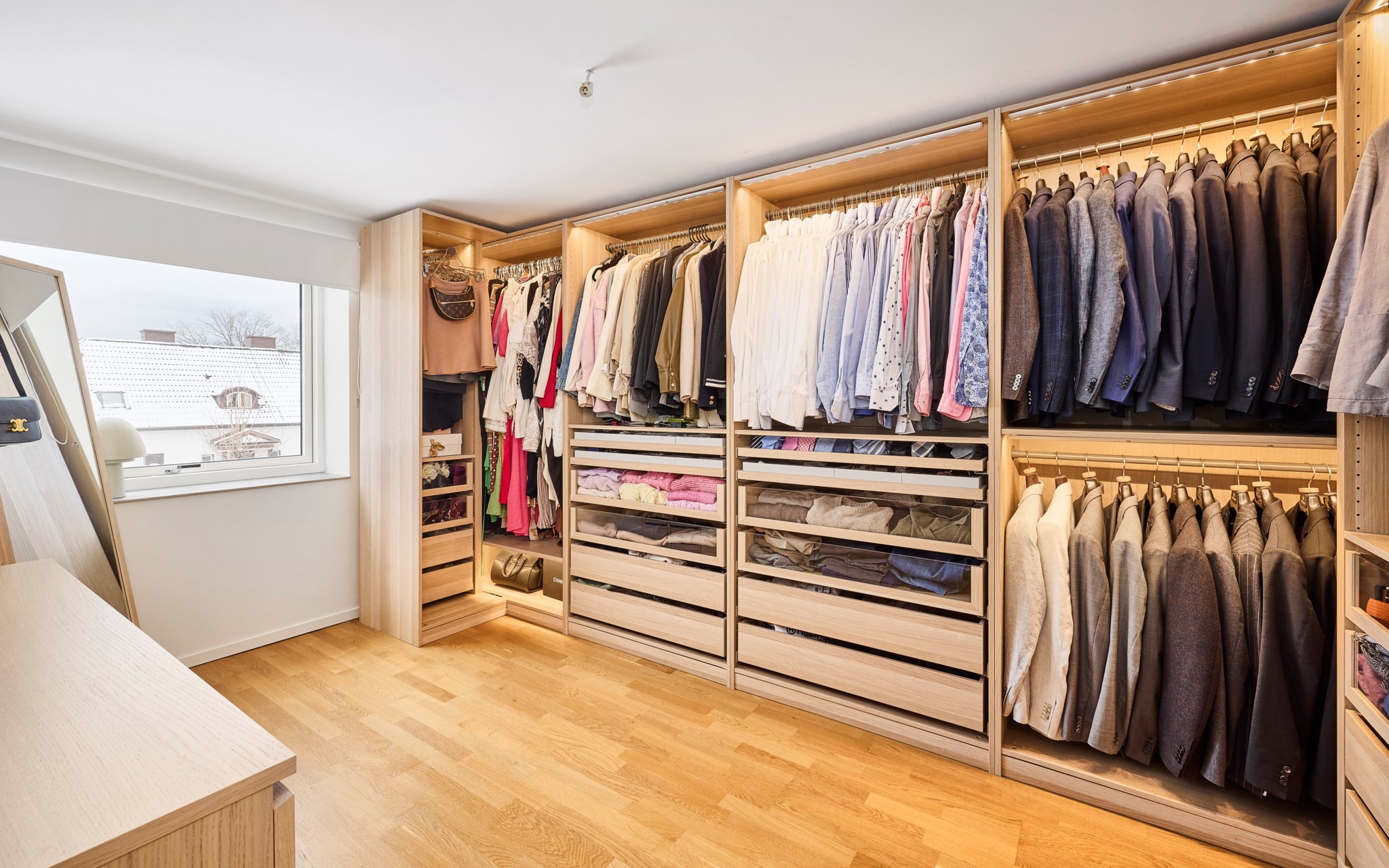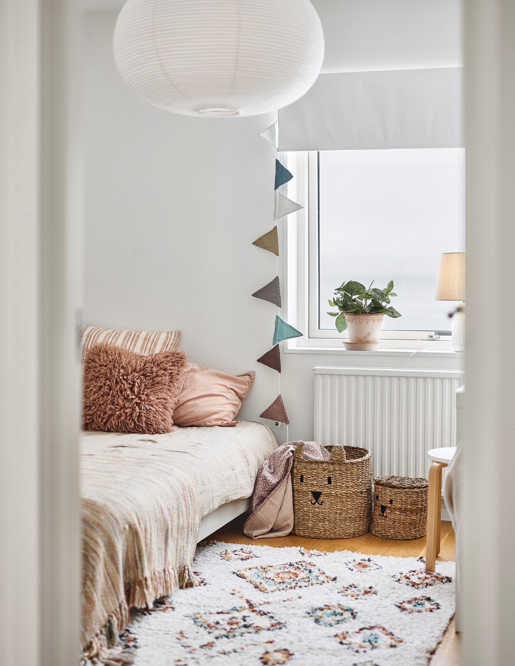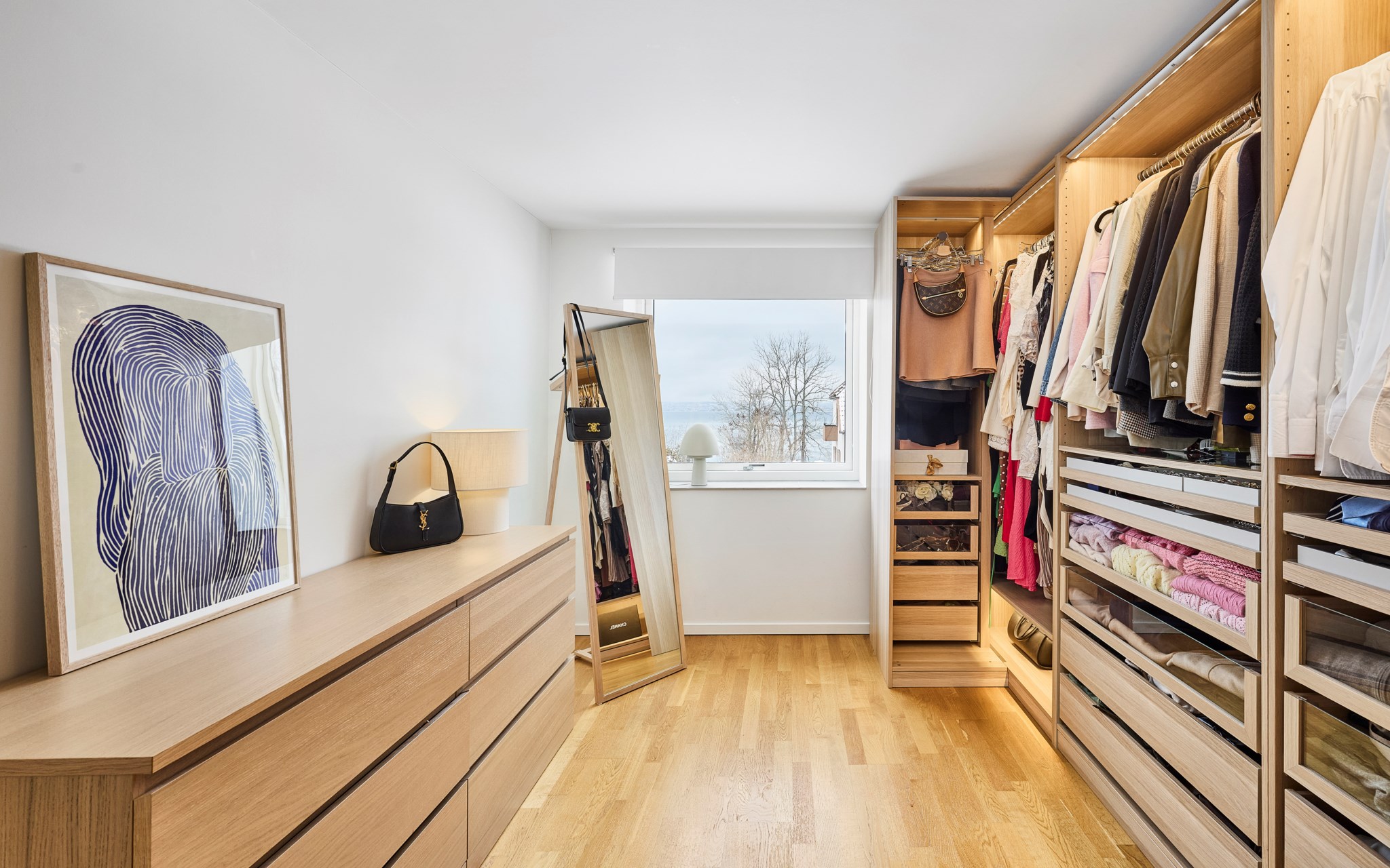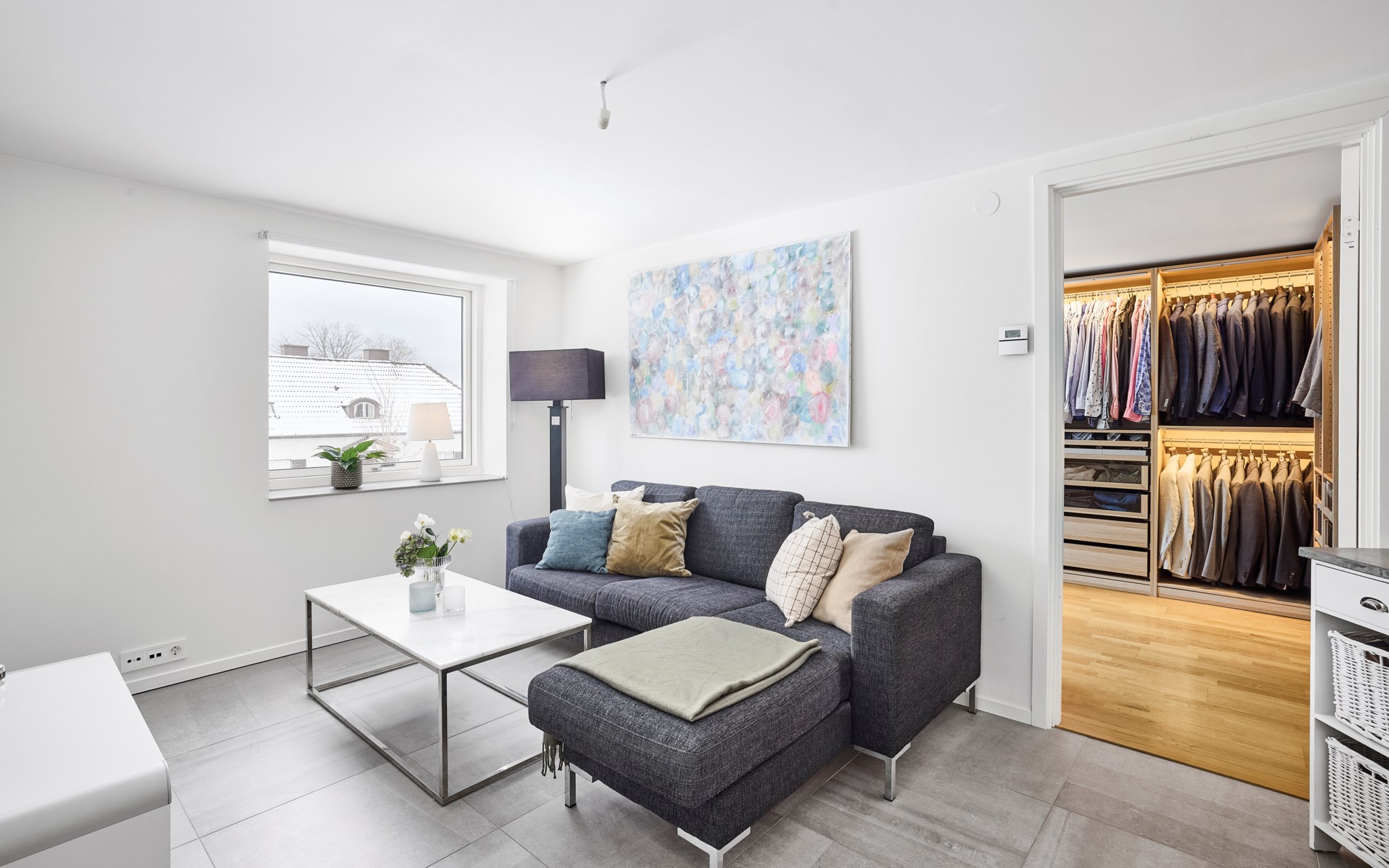På entréplanet har du två rum med fönster mot gatan och mot Vättern. Inte så pjåkig utsikt redan här från markplanet kommer du märka. Nuvarande ägare har använt det innersta rummet som stor walk-in-closet, men rummet är såklart tänkt som sovrum och låter ledigt en dubbelsäng ta plats, så att du som förälder kan vara flexibel om du vill sova uppe eller nere. Rummet utanför är ett öppet allrum som funkat som familjens tv-rum, men du ser också på planskissen att det vore enkelt att skapa ytterligare ett sovrum här. Med någon form av glasvägg och glasdörr får du fortsatt ljuset in i hallen. Golvvärme även i dessa rum.