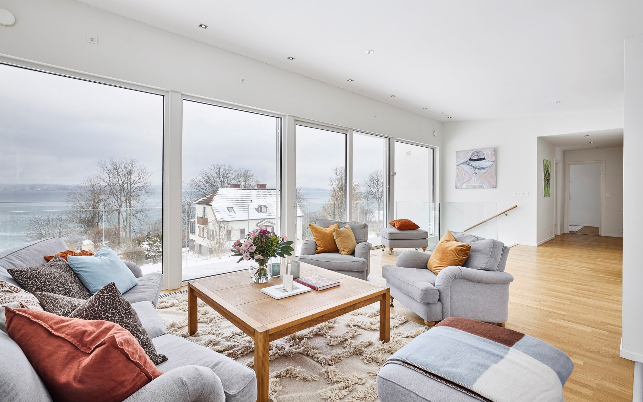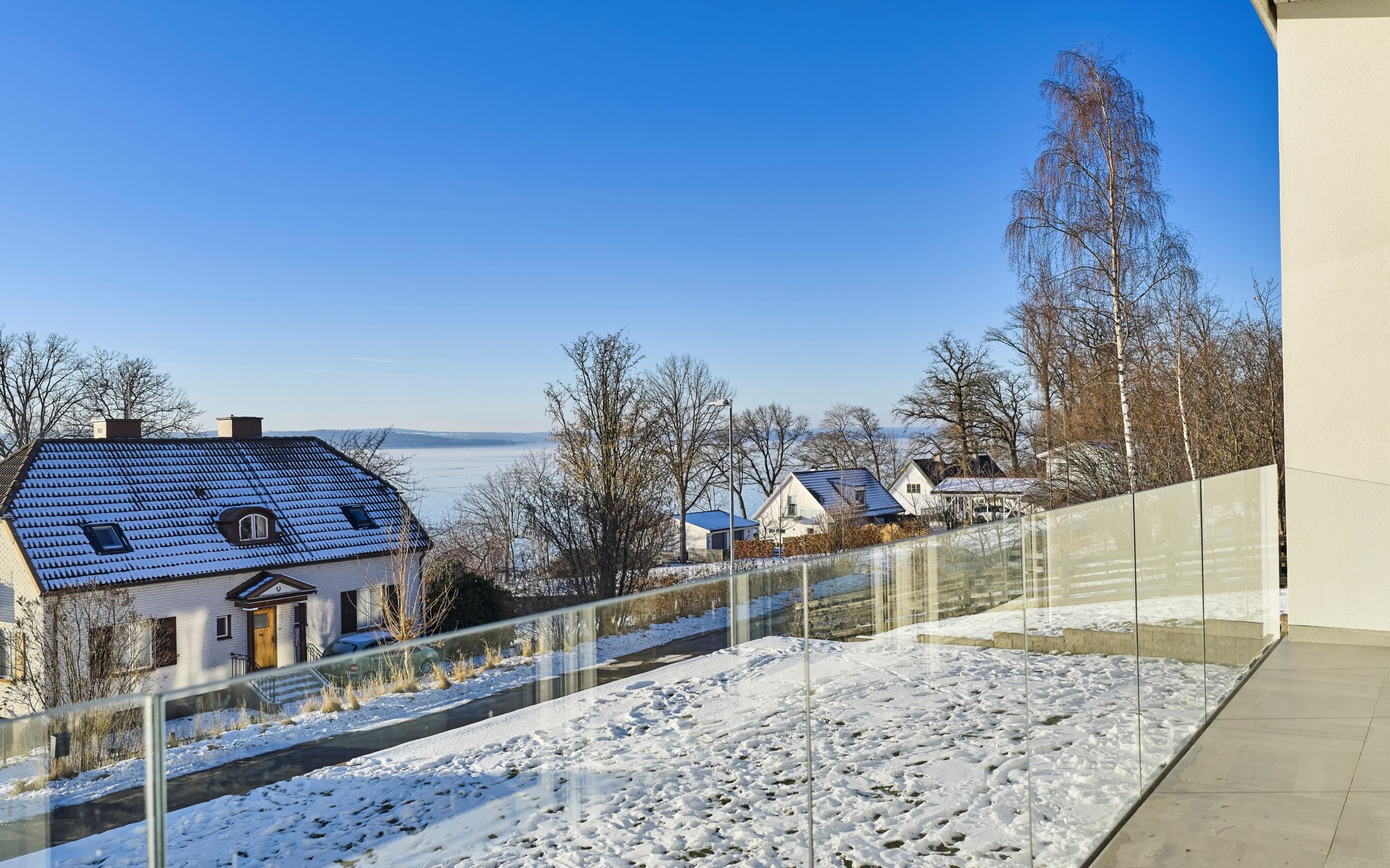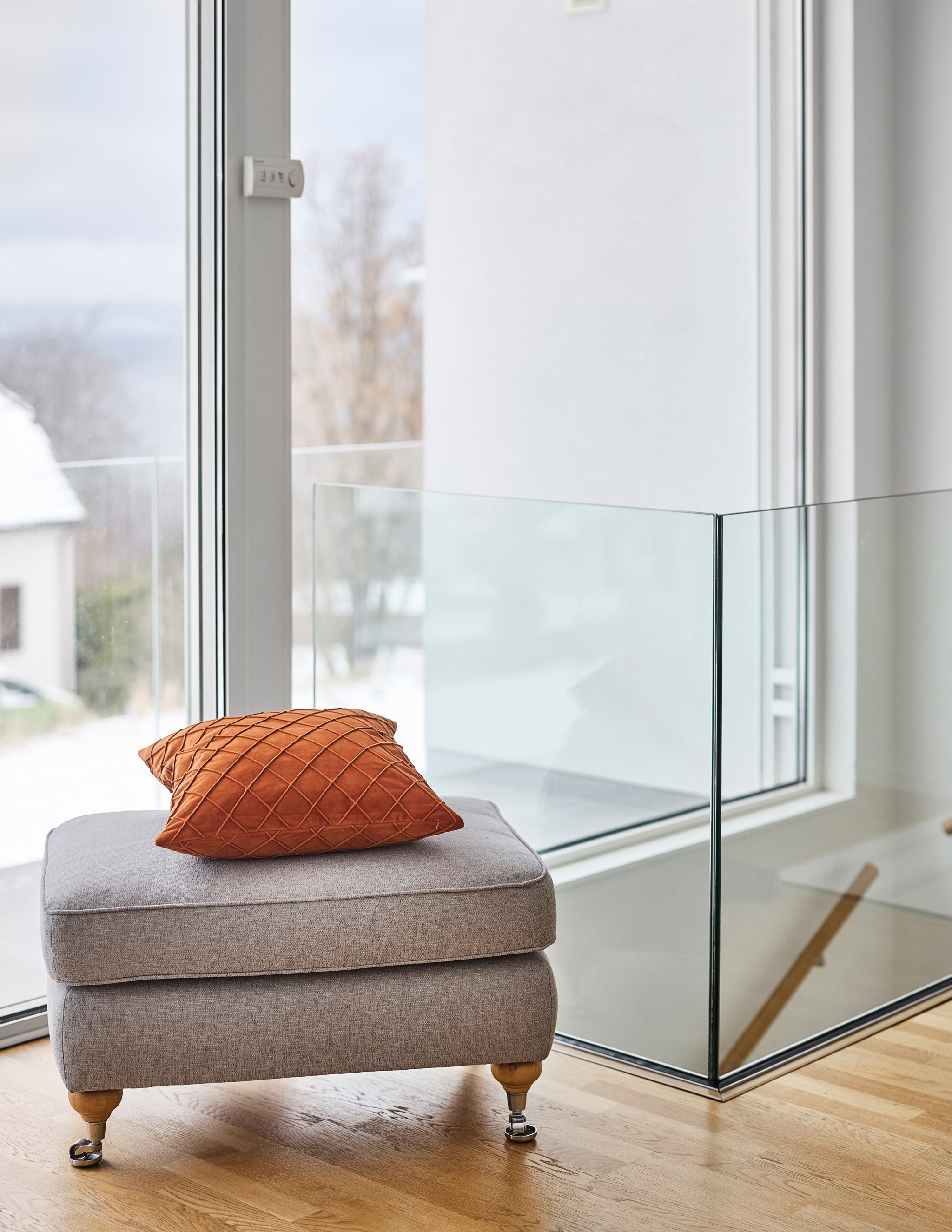 Allt känns väldigt sömlöst här, vita väggar och dörrar, kalkstensgolvet som möter ekgolvet i perfekt nivellering, och glaset runt trappan som står som stöpt rätt ur golvet. Vi ska inte glömma takhöjden som får resa sig högre och högre ut mot glaspartiet och utsikten. Högsta punkten inne torde vara lite över tre meter, sen strävar takstolarna och taket över balkongen uppåt ytterligare. Balkongen är definitivt en del av vardagsrummet, inte bara sommartid, utan även mitt i vintern. Allt glas gör att lägesenergin flödar fritt in och ut.