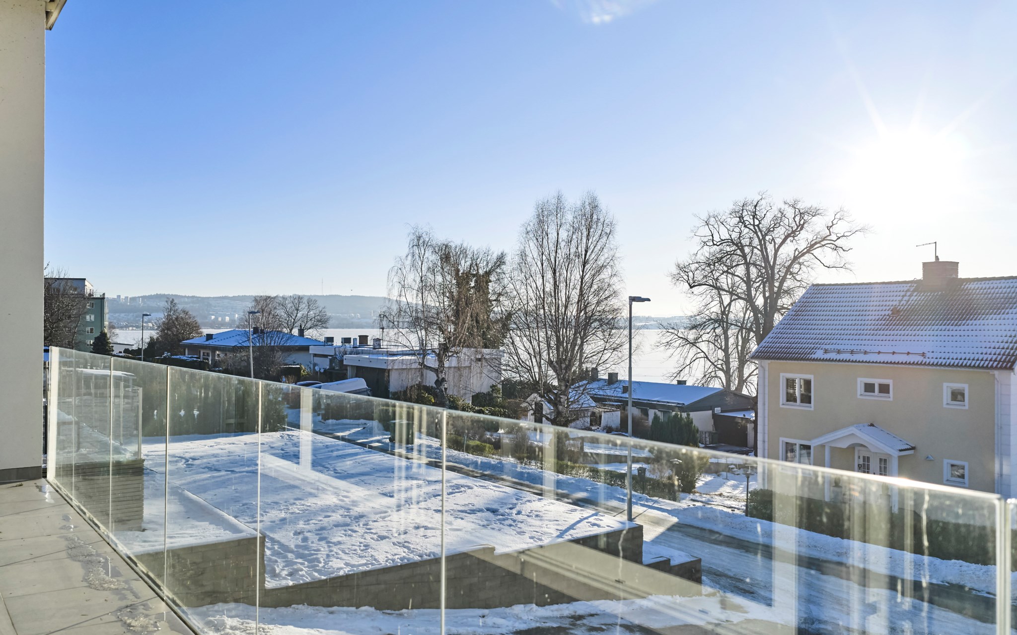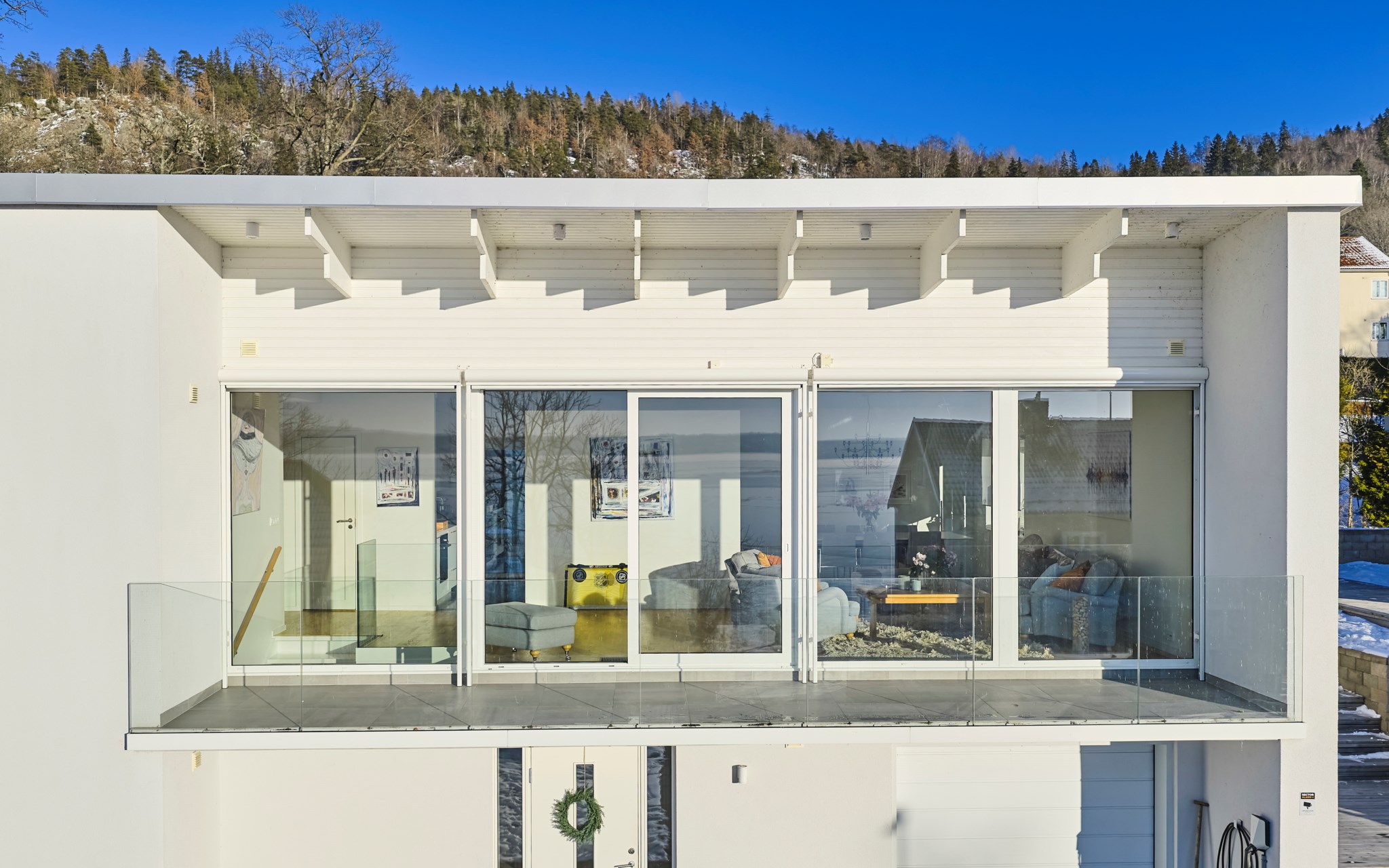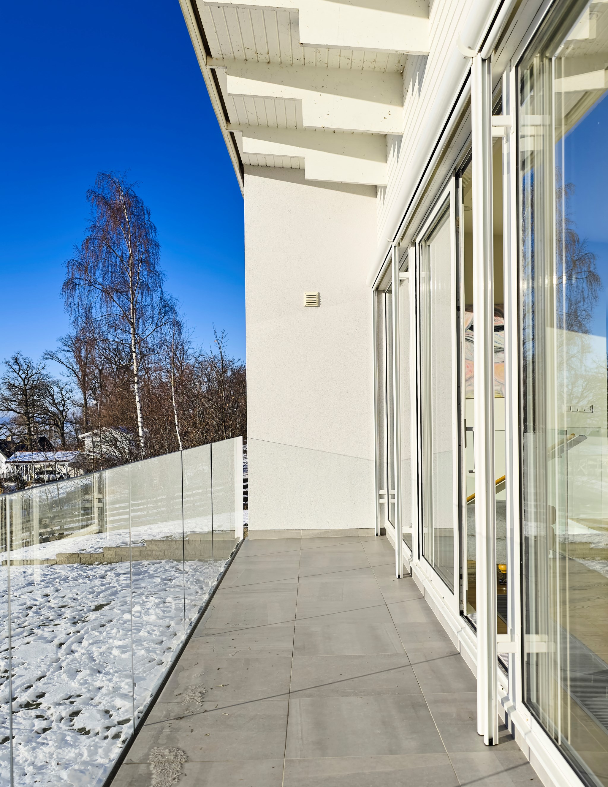Balkongen är på något sätt husets symboliska statusmarkör. Den sätter huset i en internationell klass, med stil och stuk lite bortom småländskt lagom. Husets vita puts, den breda balkongen, glasräcket och takutsprånget som öppnar sig djärvt upp mot himlen och mot utsikten. En stor bred Schüco-dörr gör balkongen väldigt tillgänglig och öppen. Klinkern på golvet är såklart samma som i hall och våtutrymmena nere, och på fasaden. Utsikten svår att beskriva men du ser både in mot stan och rätt ut mot Trånghalla och Bankeryd. När du har kvällssol i leendet, lever de i skugga på andra sidan Vättern. Blir solen för stark finns jalusier som smyger ner diskret i liv med väggen.